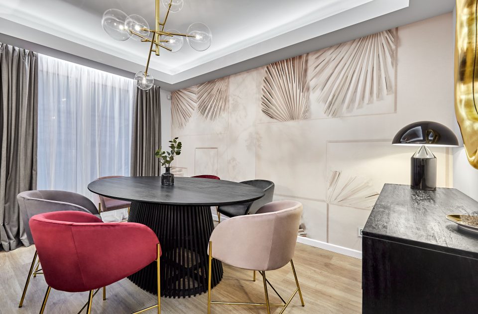Amenajarea întregului apartament este unitară, deoarece cromatica și stilul se mențin în fiecare cameră. Decorul ales e unul modern, cu tușe glam: deși pe suprafețe mari s-a mers pe nuanțe neutre (alburi, griuri și negru), corpurile de iluminat și detaliile anumitor piese de mobilier au culori puternice sau inserții metalice aurii, funcționând ca accente importante în amenajare. Livingul se impune prin canapeaua de catifea albastru-intens, completată de un fotoliu roșu-burgund. Șemineul și marmura neagră imprimă o notă elegantă și o atmosferă relaxantă. Diningul vine în completarea livingului, la nivel cromatic, prin scaunele de catifea colorate, iar tapetul creează peretele de accent.