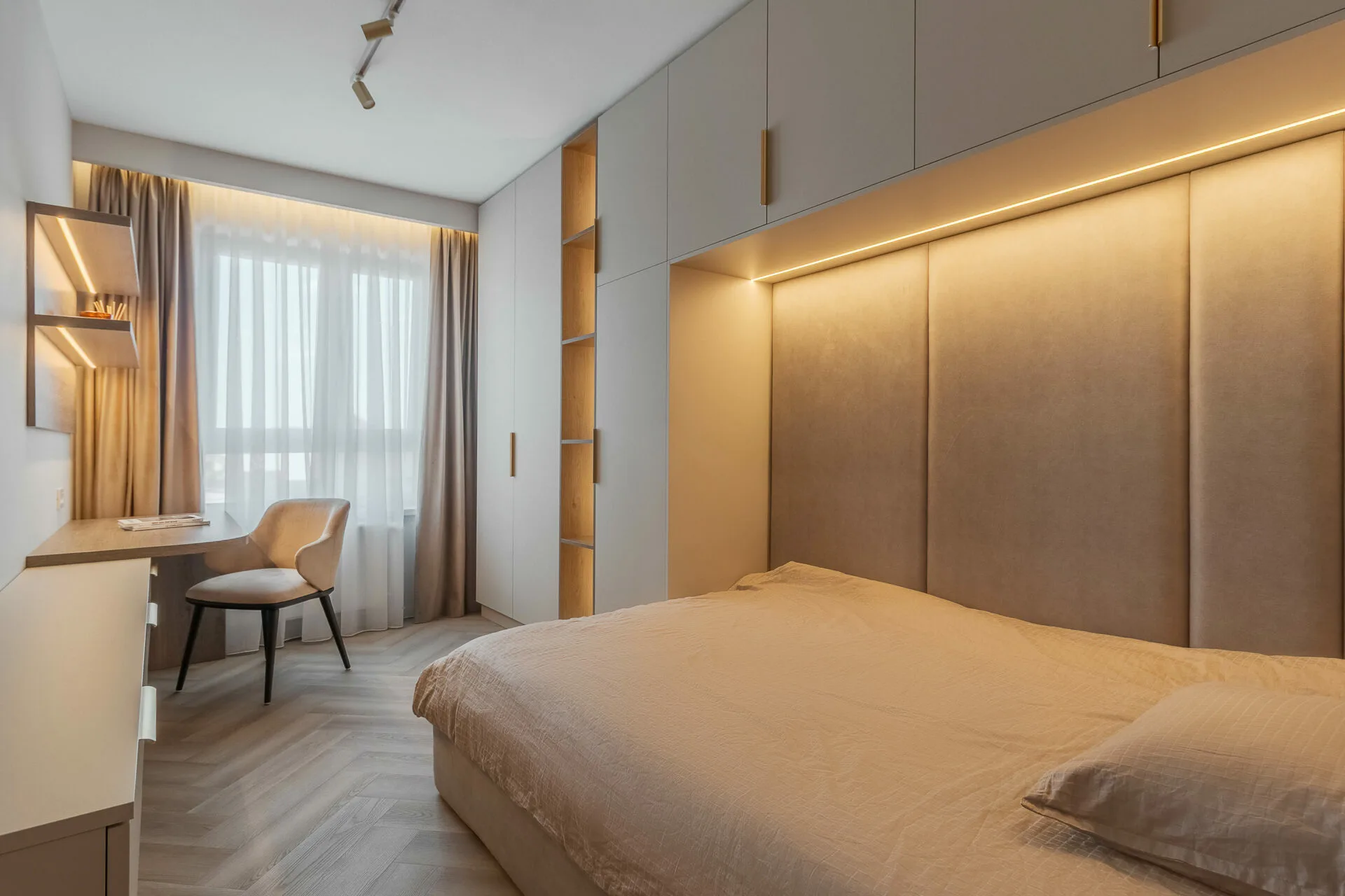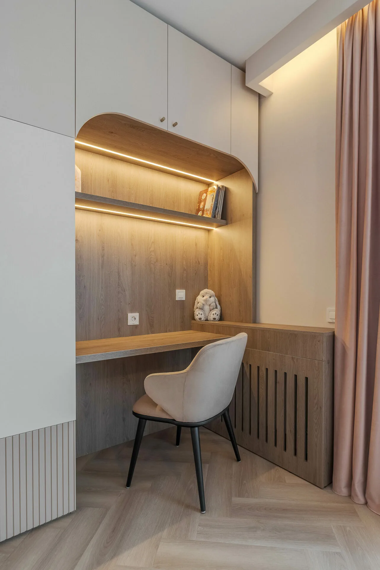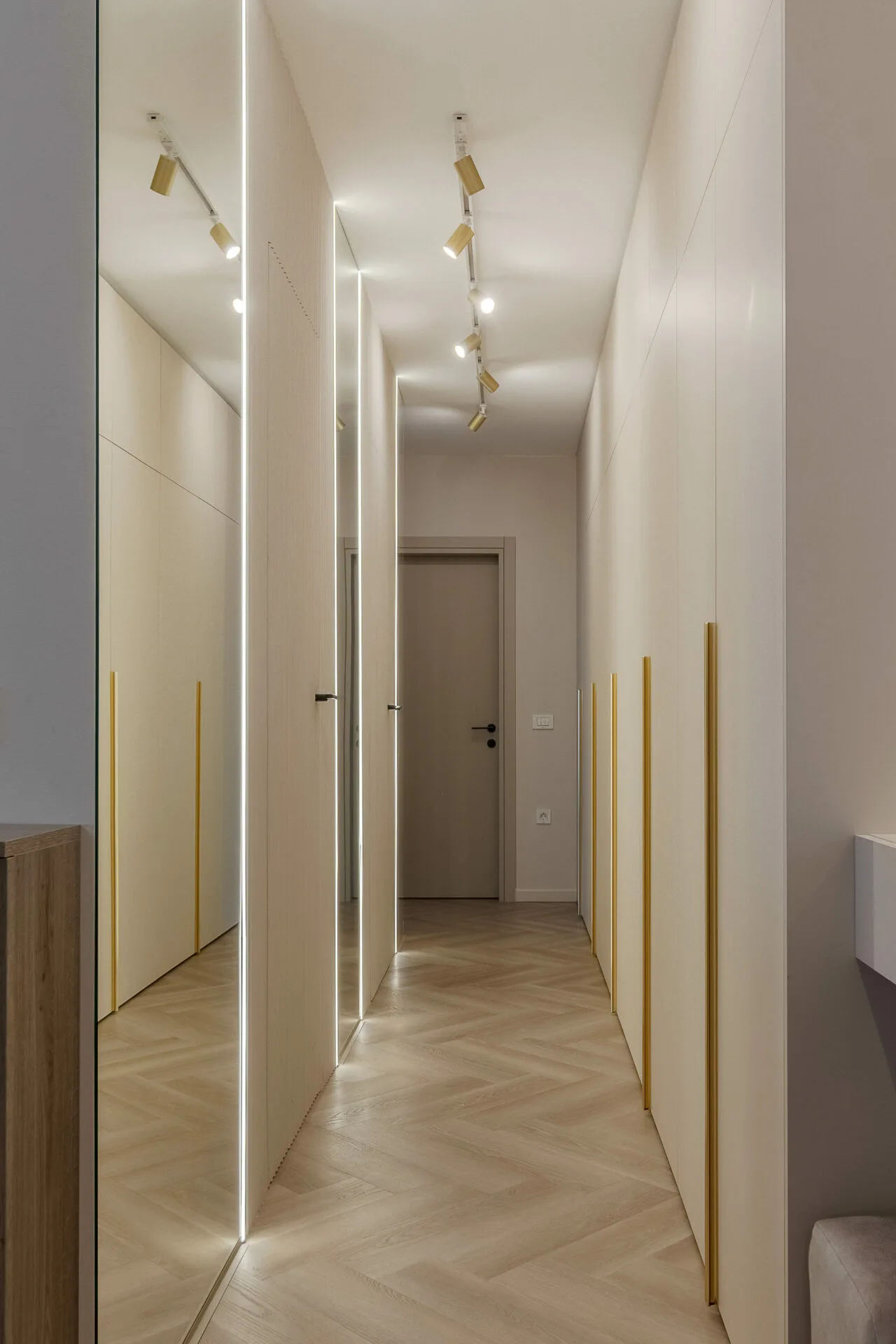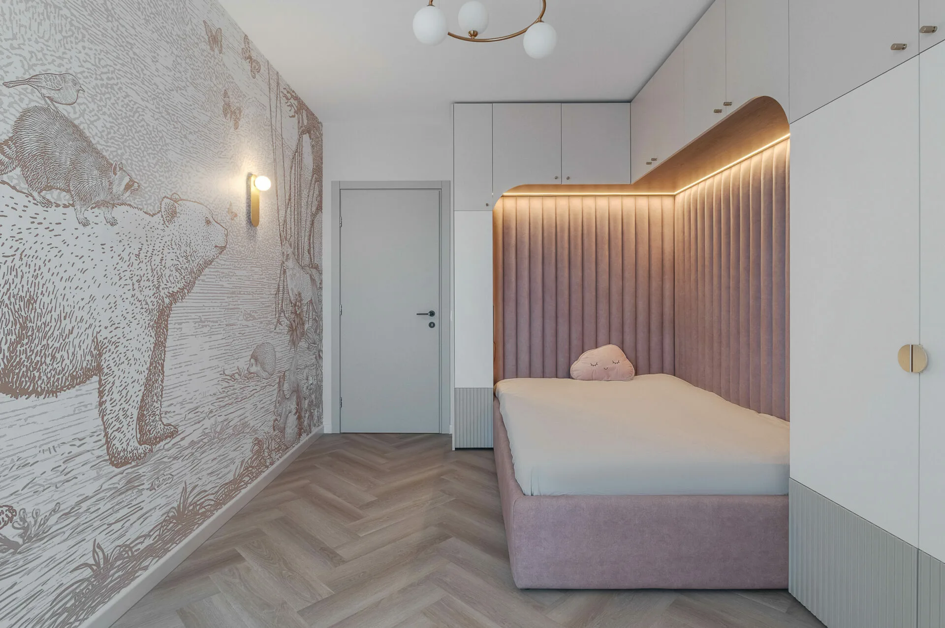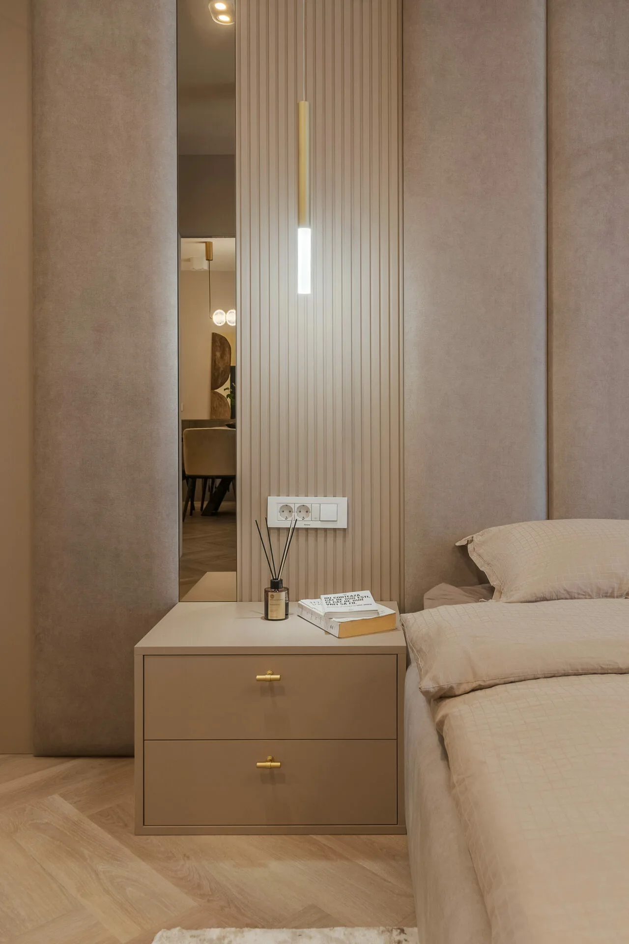 Unul dintre principalele aspecte exprimate în brief de către ei, a fost crearea cât mai multor spații de depozitare, așadar în zona de intrare am integrat dulapuri, unele placate cu oglinzi pentru a fi mascate, iar în dormitor intrarea în dressing se face prin dulap, astfel am mărit zona de depozitare a hainelor, păstrând un aspect aerisit și minimalist al camerei. Celelalte două camere ale apartamentului sunt dedicate celor doi copii, unde am integrat în mobilier biroul și patul tapițat pentru o atmosfera cât mai cozy și pentru a salva spațiu.
