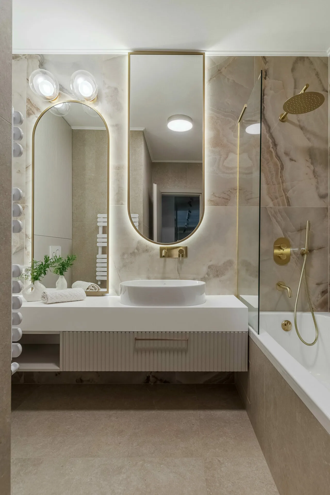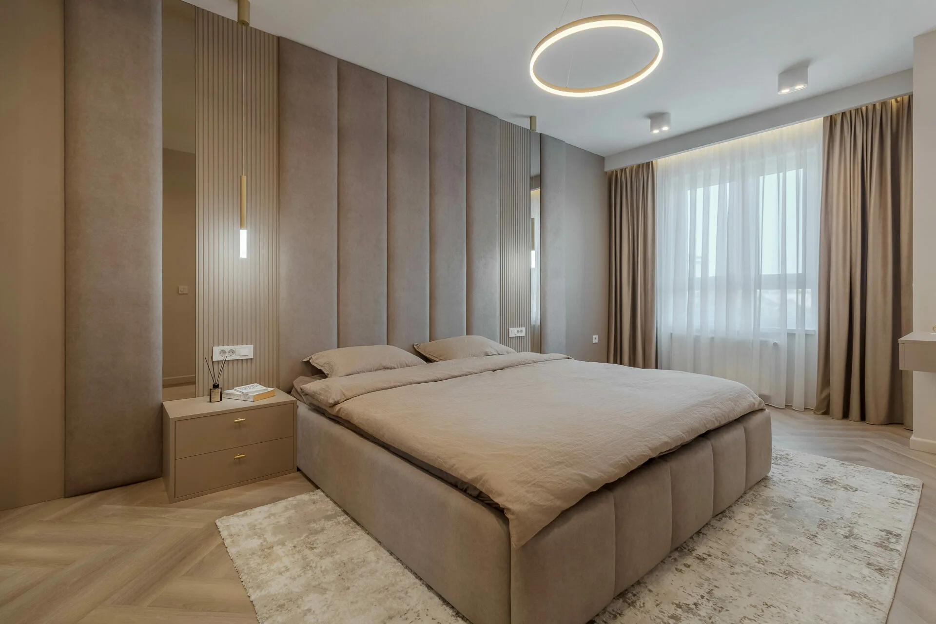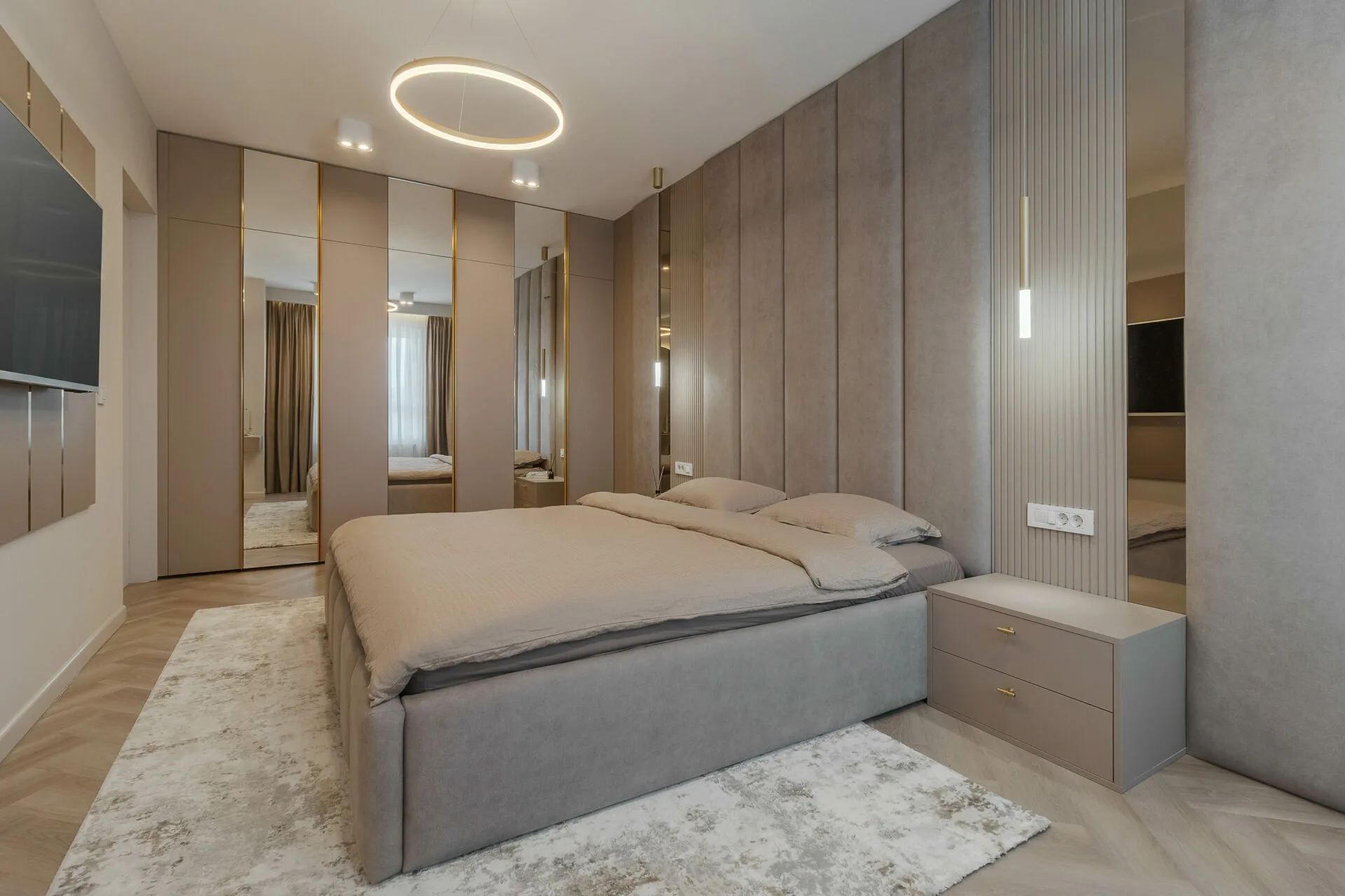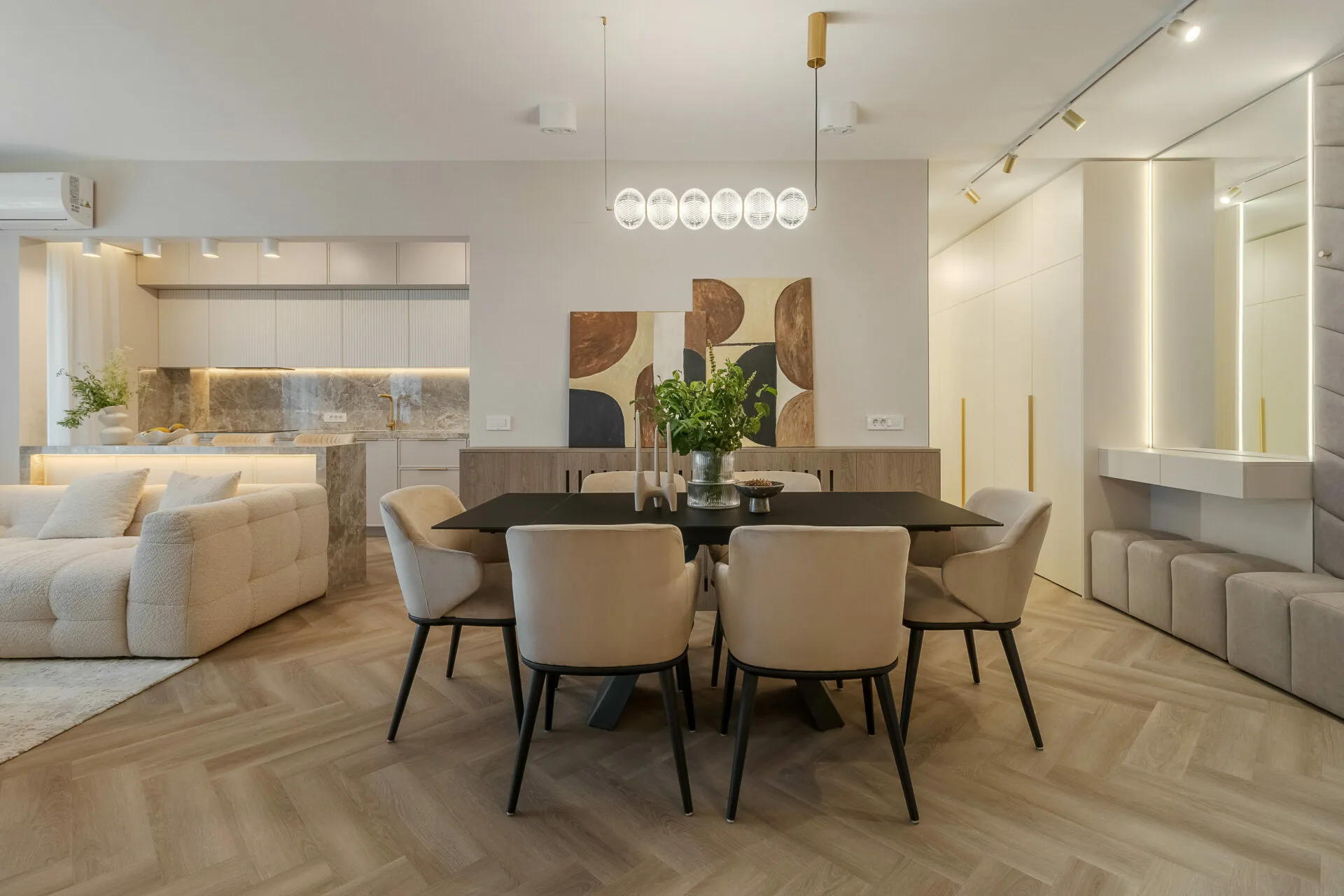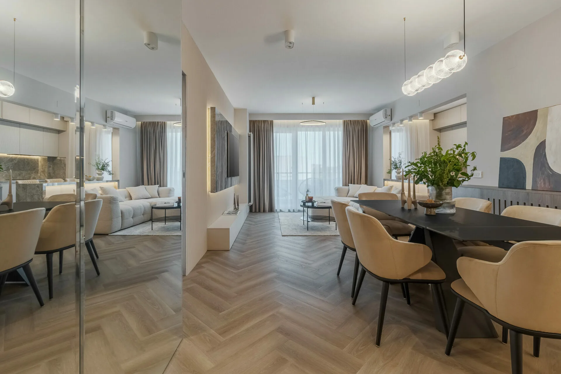 Unul dintre principalele aspecte exprimate în brief de către ei, a fost crearea cât mai multor spații de depozitare, așadar în zona de intrare am integrat dulapuri, unele placate cu oglinzi pentru a fi mascate, iar în dormitor intrarea în dressing se face prin dulap, astfel am mărit zona de depozitare a hainelor, păstrând un aspect aerisit și minimalist al camerei. Celelalte două camere ale apartamentului sunt dedicate celor doi copii, unde am integrat în mobilier biroul și patul tapițat pentru o atmosfera cât mai cozy și pentru a salva spațiu.