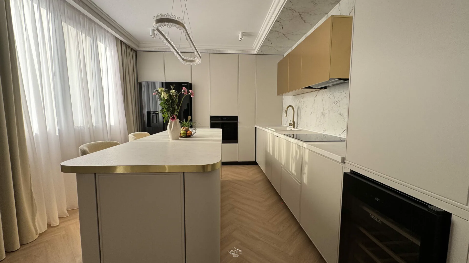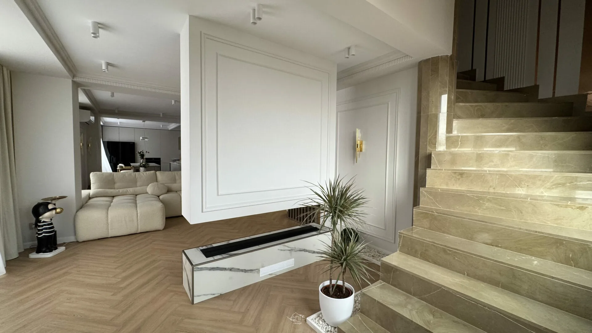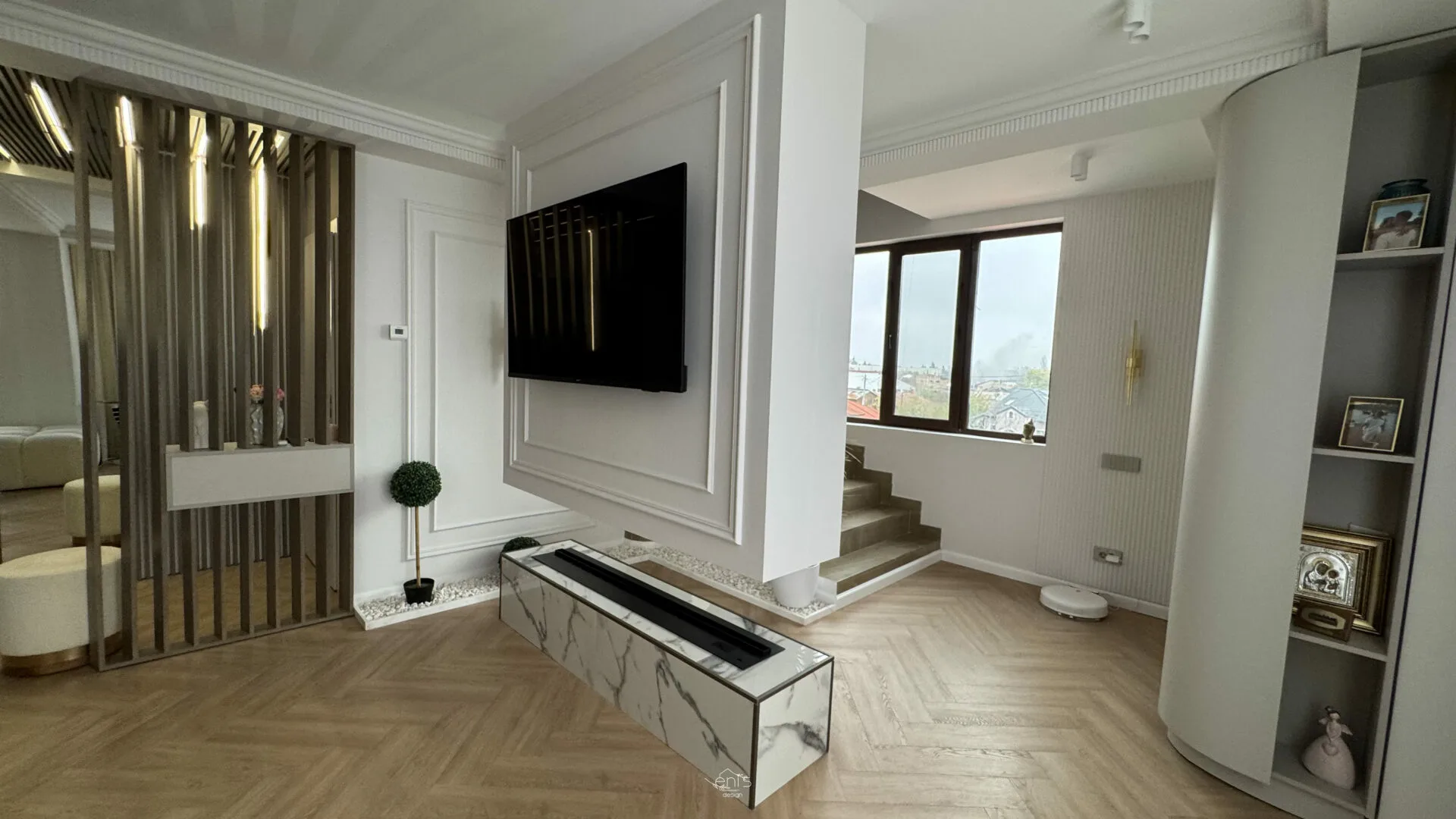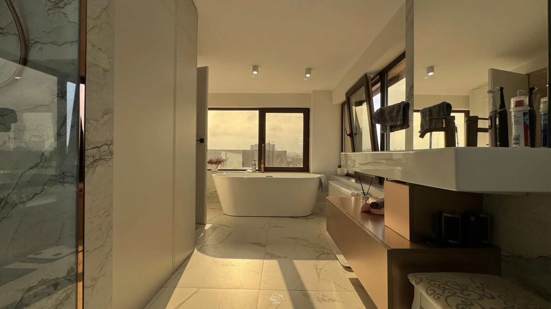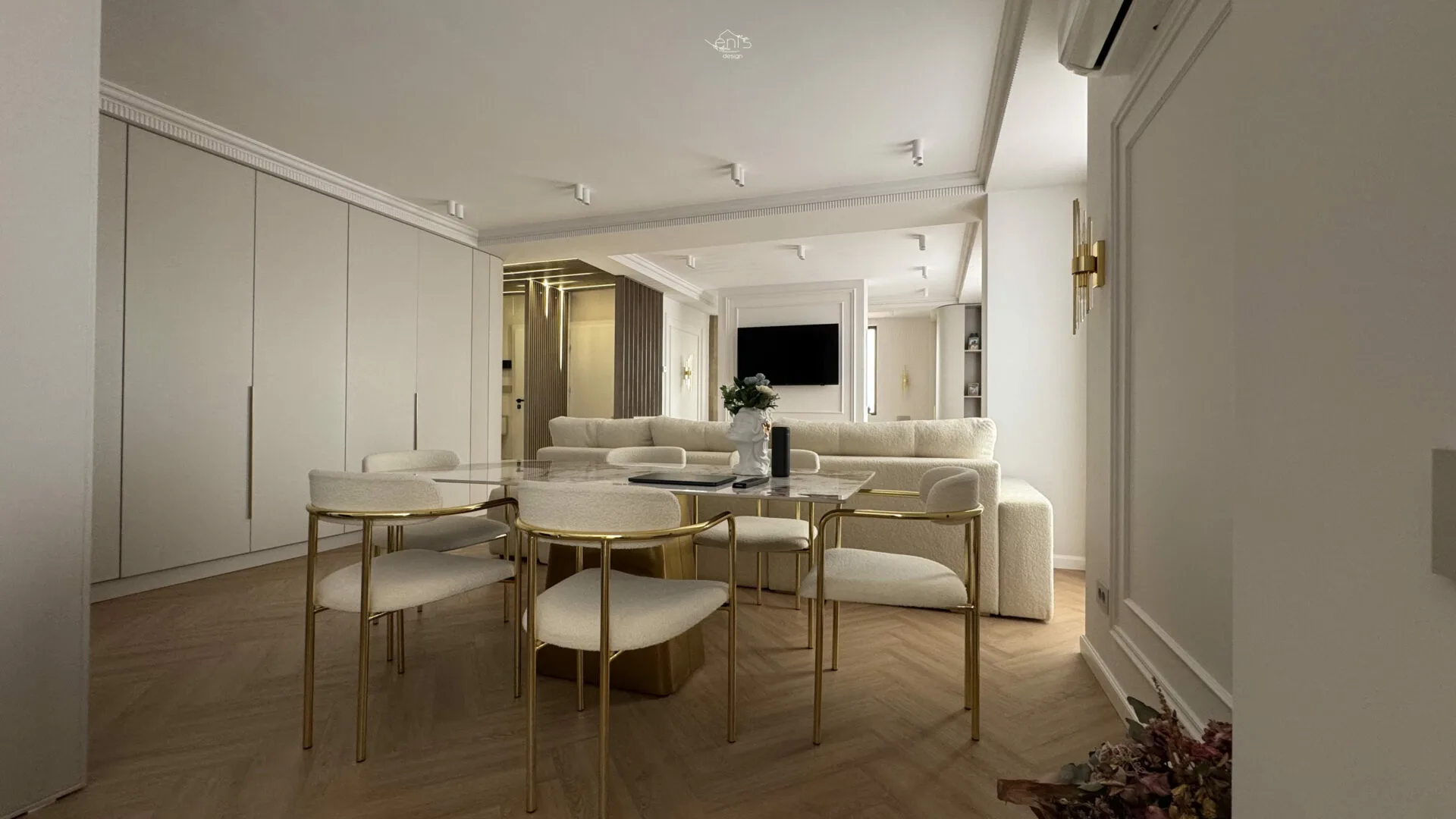 Conceptul general urmărește un echilibru precis între funcționalitate și expresie estetică, utilizând finisaje premium, texturi coerente și detalii executate cu acuratețe. Nivelul inferior integrează zona de zi într-un flux spațial continuu – living, dining, bucătărie, hol și baie – optimizat prin circulații clare și perspective vizuale curate. Inițial, acest nivel era organizat într-o structură fragmentată, cu un open-space, o baie și un dormitor, fără o zonă dedicată bucătăriei, aceasta fiind localizată la etajul superior. Prin reducerea adâncimii băii, a fost posibilă integrarea unei bucătării generoase, articulată în jurul unei insule ovale, devenind pivotul central al zonei de zi. Etajul 2, inițial configurat ca un open-space amplu și un dormitor cu o baie redusă ca dimensiuni, a fost reproiectat într-o zonă de noapte clar structurată și funcțional echilibrată. Noua organizare include un hol de distribuție, un dormitor pentru oaspeți și o suită matrimonială complet redefinită. Aceasta integrează un dressing dedicat, un dormitor generos și o baie premium concepută ca spațiu de relaxare, cu cadă freestanding, zonă cu două dușuri și o compoziție sanitară modelată în jurul luminii naturale și al texturilor sofisticate. Reconfigurarea a permis valorificarea optimă a suprafeței și crearea unei tranziții fluide, conferind zonei de noapte o identitate distinctă și un nivel ridicat de confort. Proiectul în ansamblu evidențiază o eleganță structurală și materială obținută prin coerența compoziției, disciplina detaliului și utilizarea unei palete rafinate, consolidând identitatea apartamentului în zona premium a designului interior.
