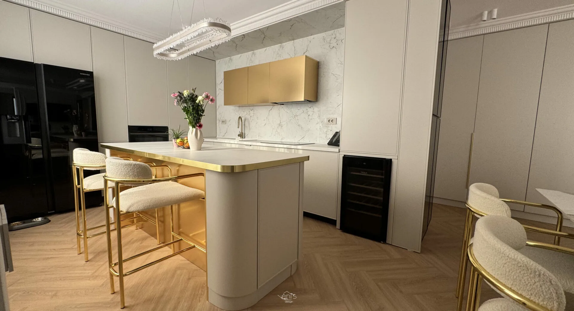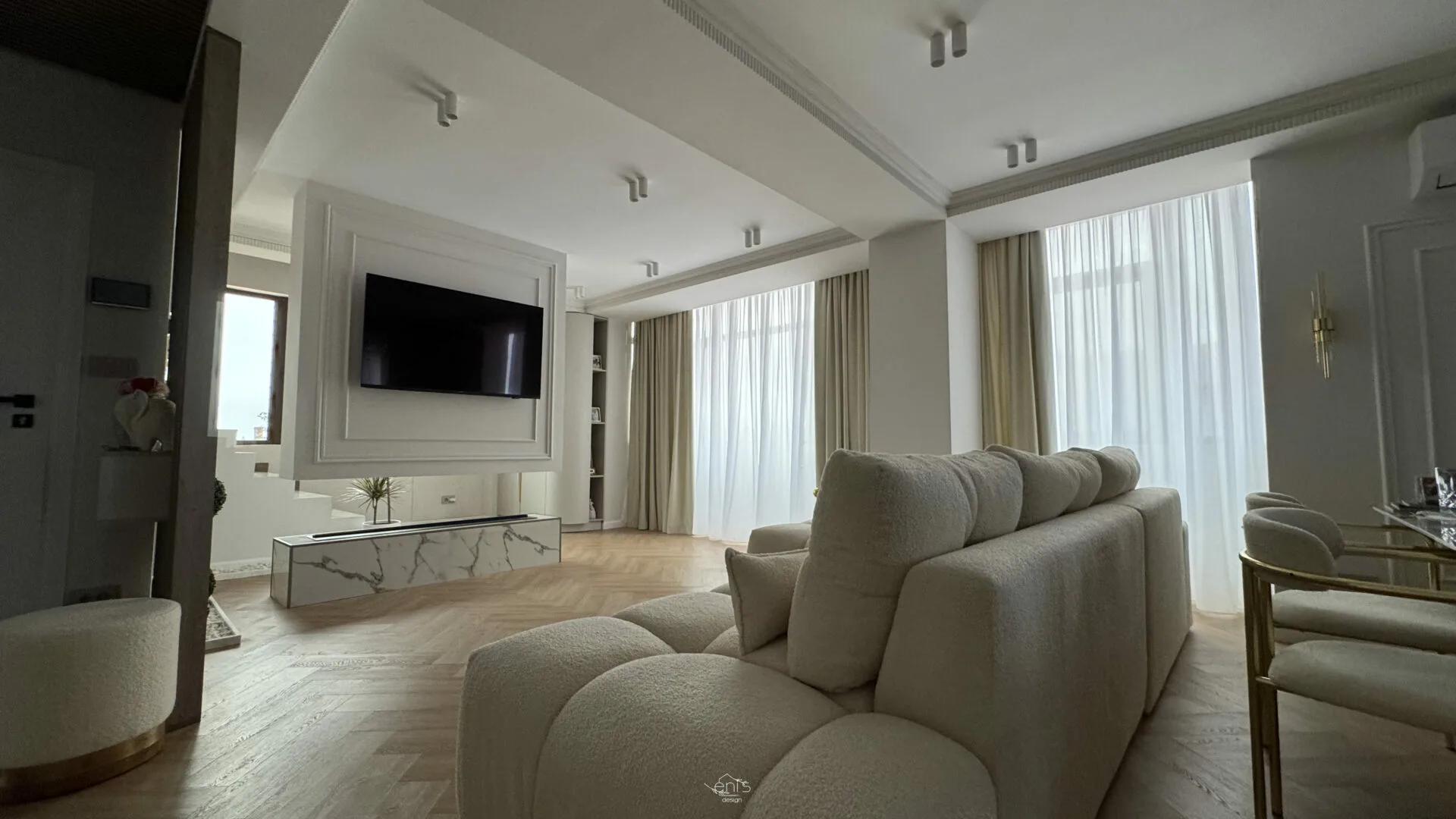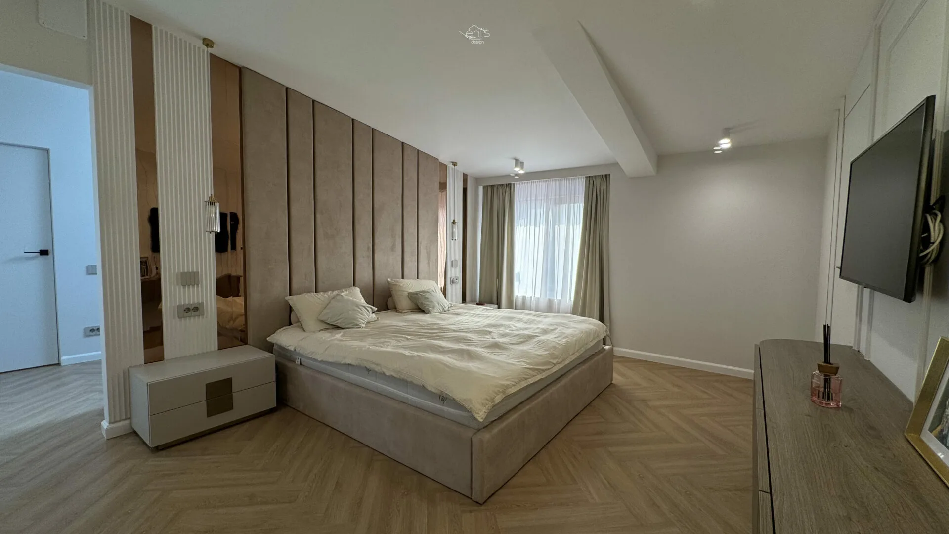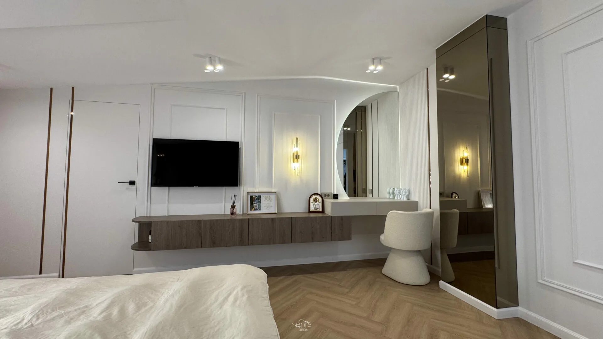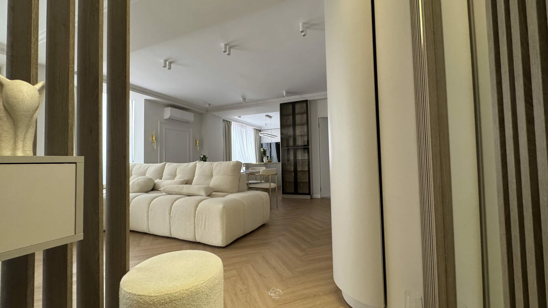 Conceptul general urmărește un echilibru precis între funcționalitate și expresie estetică, utilizând finisaje premium, texturi coerente și detalii executate cu acuratețe. Nivelul inferior integrează zona de zi într-un flux spațial continuu – living, dining, bucătărie, hol și baie – optimizat prin circulații clare și perspective vizuale curate. Inițial, acest nivel era organizat într-o structură fragmentată, cu un open-space, o baie și un dormitor, fără o zonă dedicată bucătăriei, aceasta fiind localizată la etajul superior. Prin reducerea adâncimii băii, a fost posibilă integrarea unei bucătării generoase, articulată în jurul unei insule ovale, devenind pivotul central al zonei de zi. Etajul 2, inițial configurat ca un open-space amplu și un dormitor cu o baie redusă ca dimensiuni, a fost reproiectat într-o zonă de noapte clar structurată și funcțional echilibrată. Noua organizare include un hol de distribuție, un dormitor pentru oaspeți și o suită matrimonială complet redefinită. Aceasta integrează un dressing dedicat, un dormitor generos și o baie premium concepută ca spațiu de relaxare, cu cadă freestanding, zonă cu două dușuri și o compoziție sanitară modelată în jurul luminii naturale și al texturilor sofisticate. Reconfigurarea a permis valorificarea optimă a suprafeței și crearea unei tranziții fluide, conferind zonei de noapte o identitate distinctă și un nivel ridicat de confort. Proiectul în ansamblu evidențiază o eleganță structurală și materială obținută prin coerența compoziției, disciplina detaliului și utilizarea unei palete rafinate, consolidând identitatea apartamentului în zona premium a designului interior.