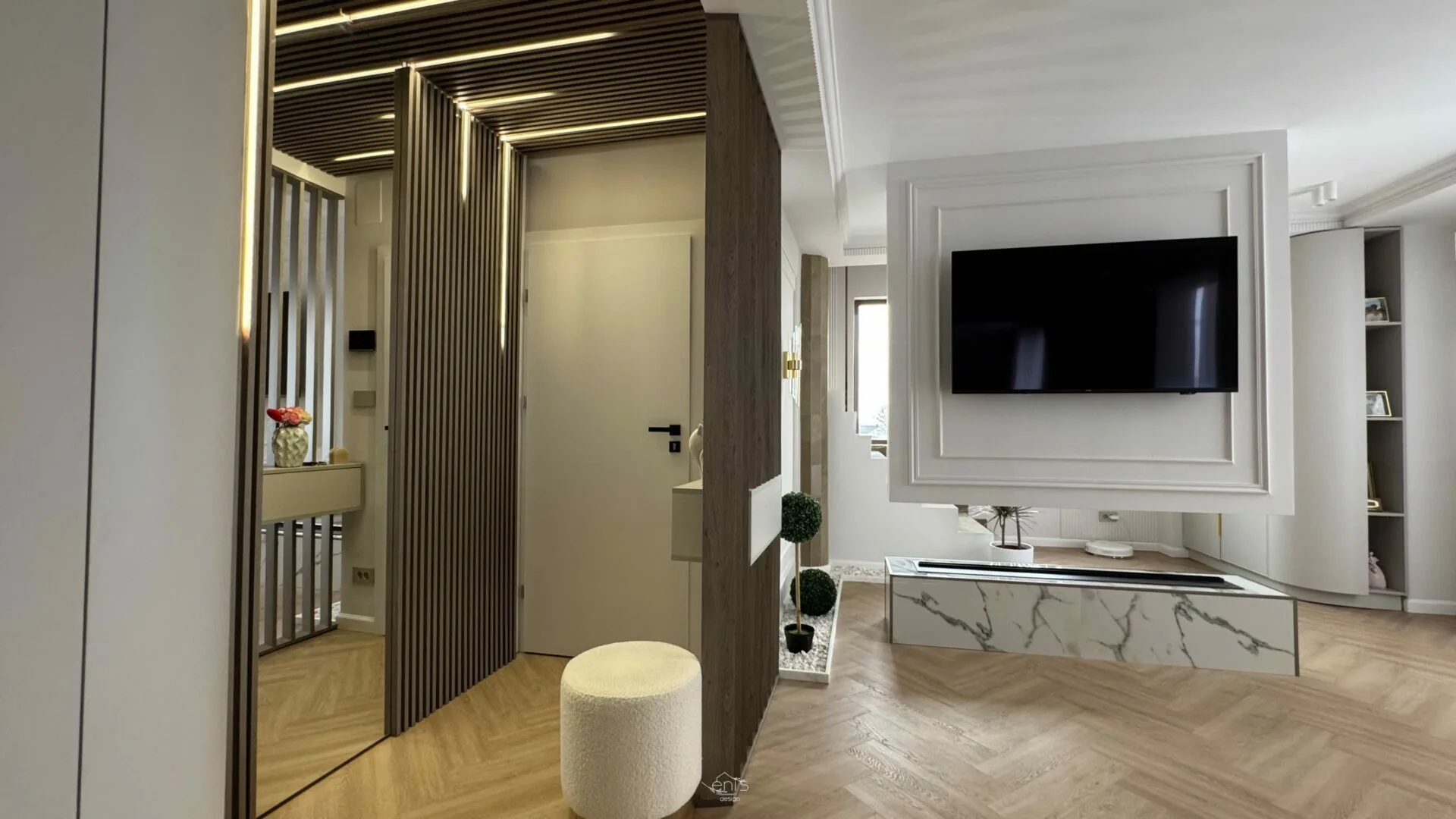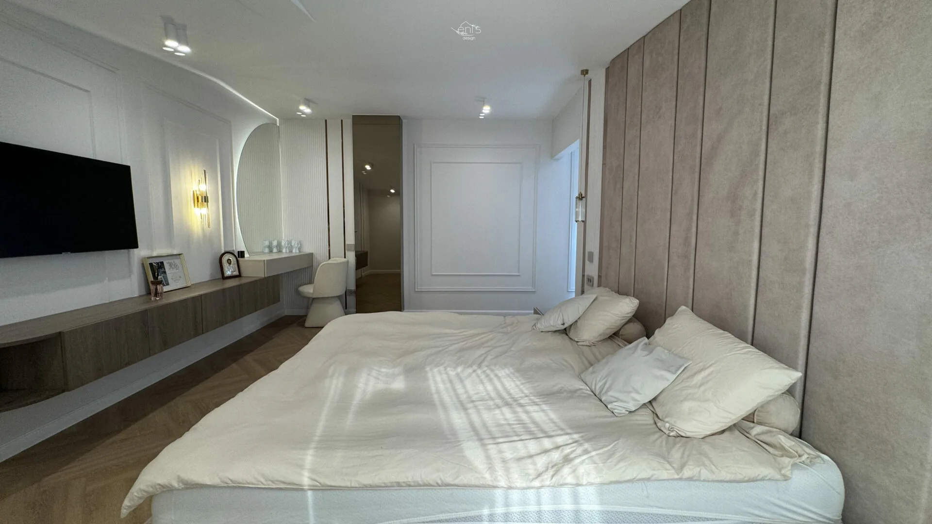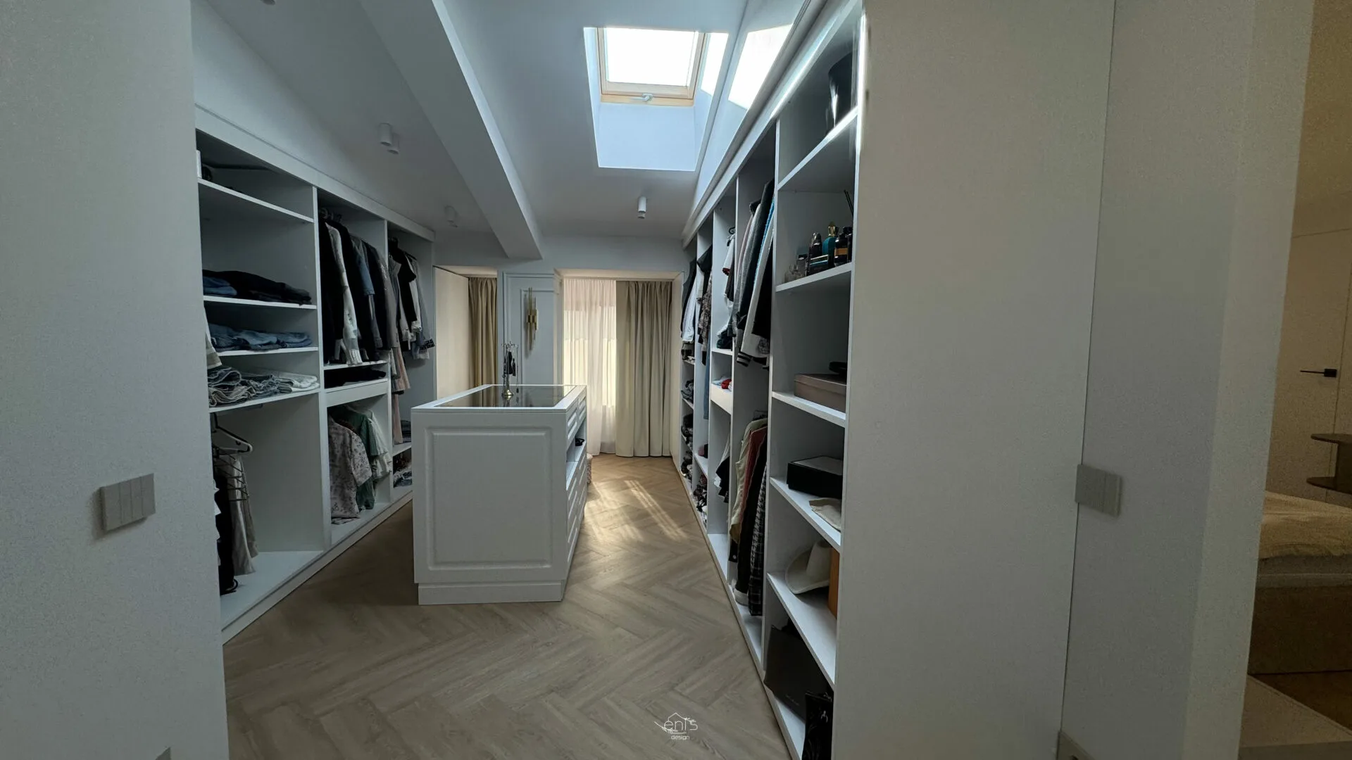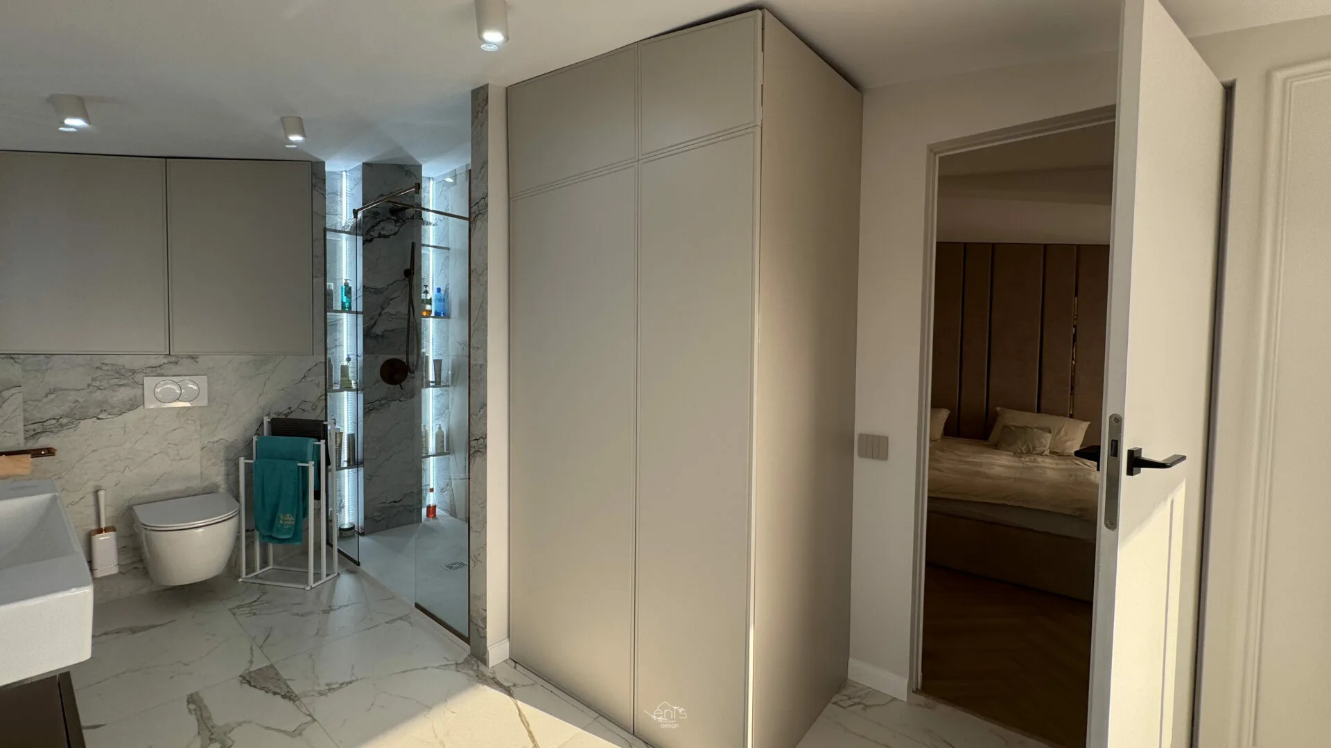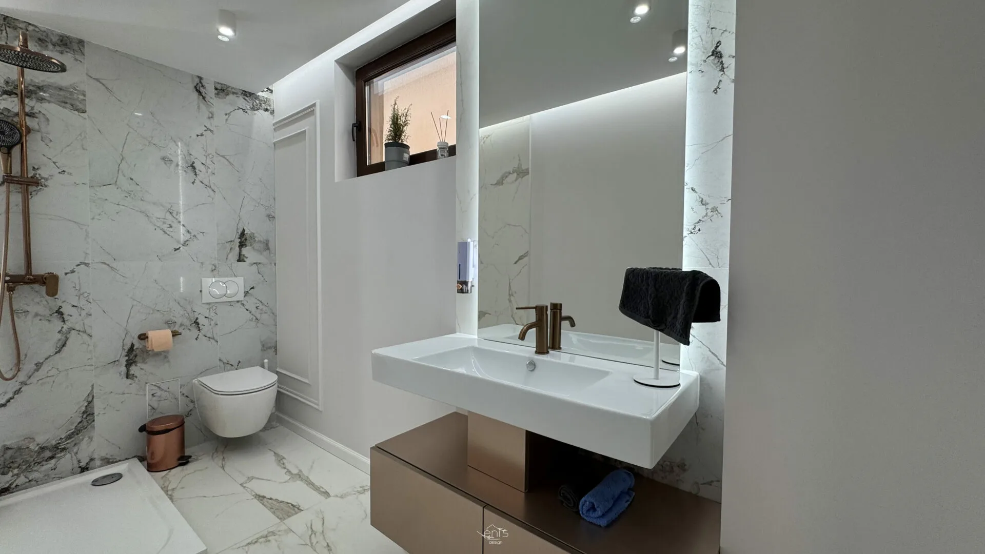 Conceptul general urmărește un echilibru precis între funcționalitate și expresie estetică, utilizând finisaje premium, texturi coerente și detalii executate cu acuratețe. Nivelul inferior integrează zona de zi într-un flux spațial continuu – living, dining, bucătărie, hol și baie – optimizat prin circulații clare și perspective vizuale curate. Inițial, acest nivel era organizat într-o structură fragmentată, cu un open-space, o baie și un dormitor, fără o zonă dedicată bucătăriei, aceasta fiind localizată la etajul superior. Prin reducerea adâncimii băii, a fost posibilă integrarea unei bucătării generoase, articulată în jurul unei insule ovale, devenind pivotul central al zonei de zi. Etajul 2, inițial configurat ca un open-space amplu și un dormitor cu o baie redusă ca dimensiuni, a fost reproiectat într-o zonă de noapte clar structurată și funcțional echilibrată. Noua organizare include un hol de distribuție, un dormitor pentru oaspeți și o suită matrimonială complet redefinită. Aceasta integrează un dressing dedicat, un dormitor generos și o baie premium concepută ca spațiu de relaxare, cu cadă freestanding, zonă cu două dușuri și o compoziție sanitară modelată în jurul luminii naturale și al texturilor sofisticate. Reconfigurarea a permis valorificarea optimă a suprafeței și crearea unei tranziții fluide, conferind zonei de noapte o identitate distinctă și un nivel ridicat de confort. Proiectul în ansamblu evidențiază o eleganță structurală și materială obținută prin coerența compoziției, disciplina detaliului și utilizarea unei palete rafinate, consolidând identitatea apartamentului în zona premium a designului interior.
