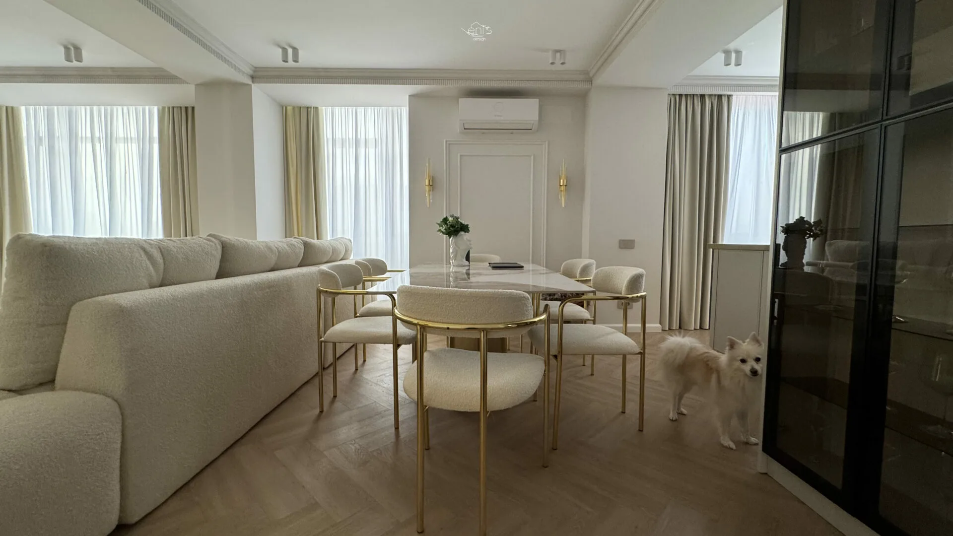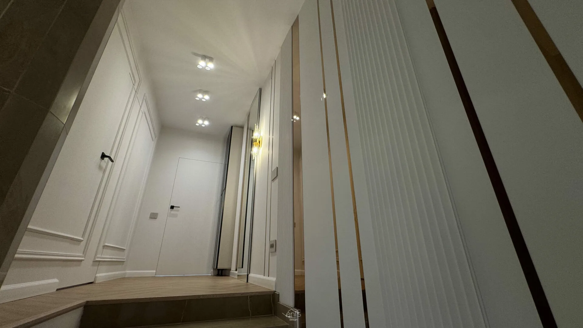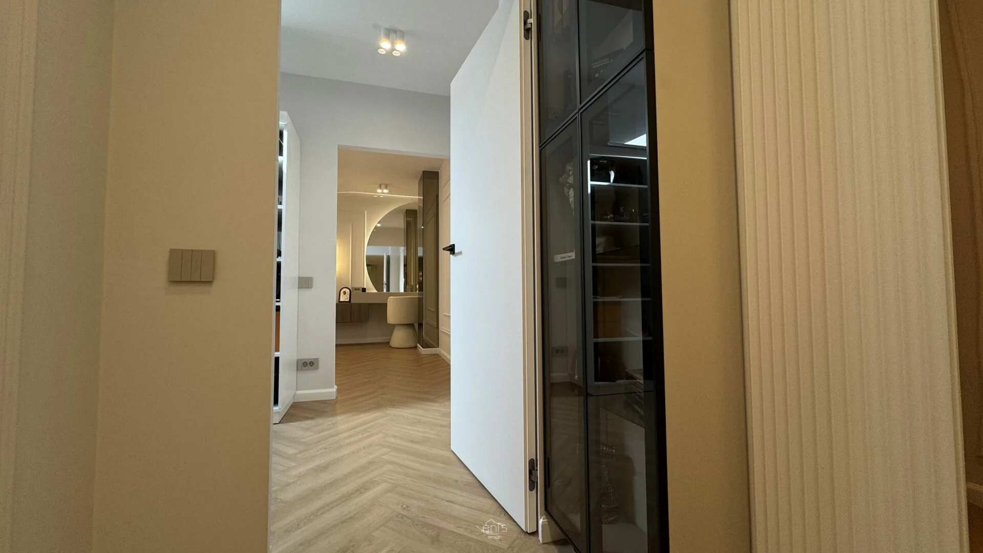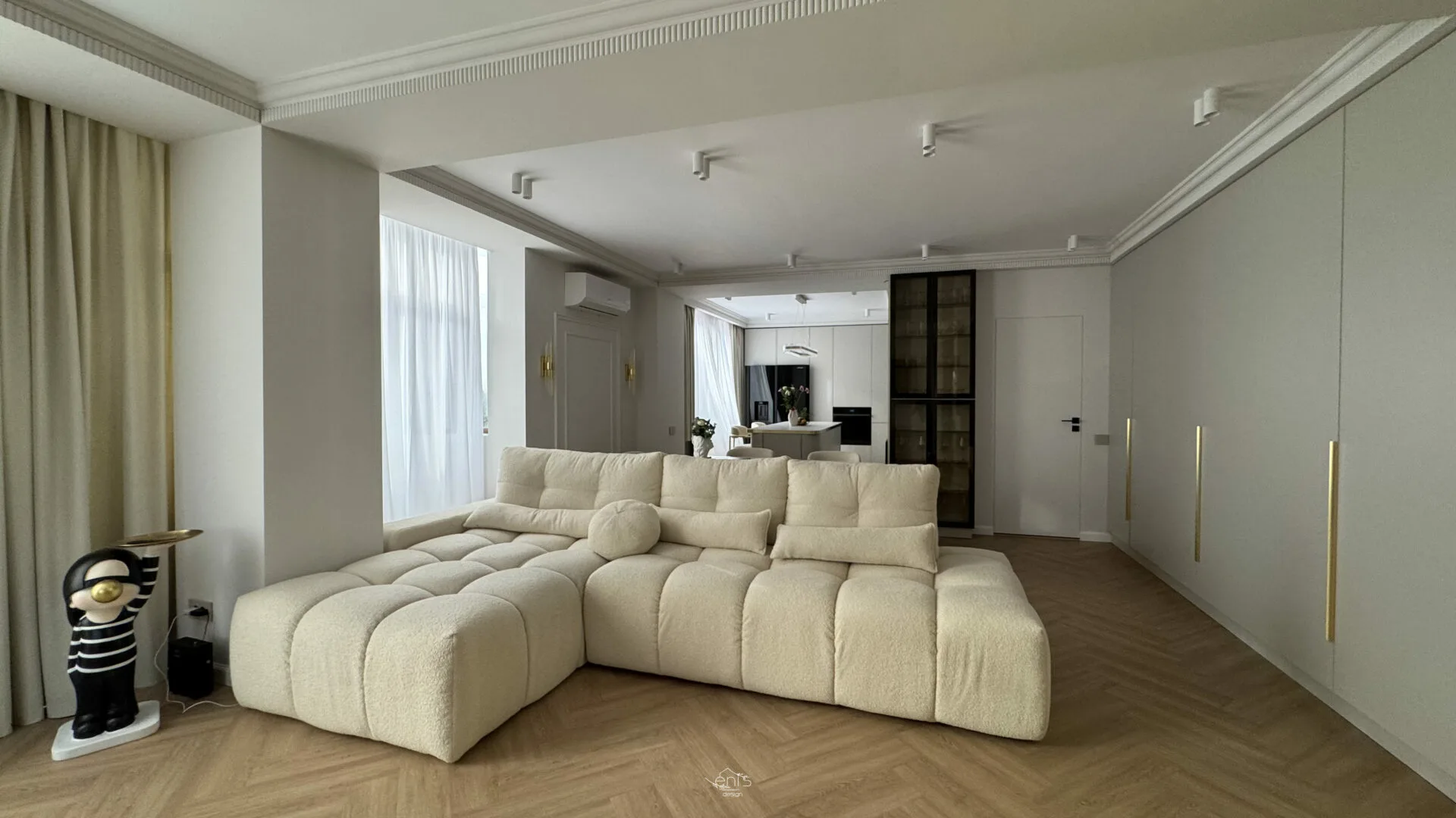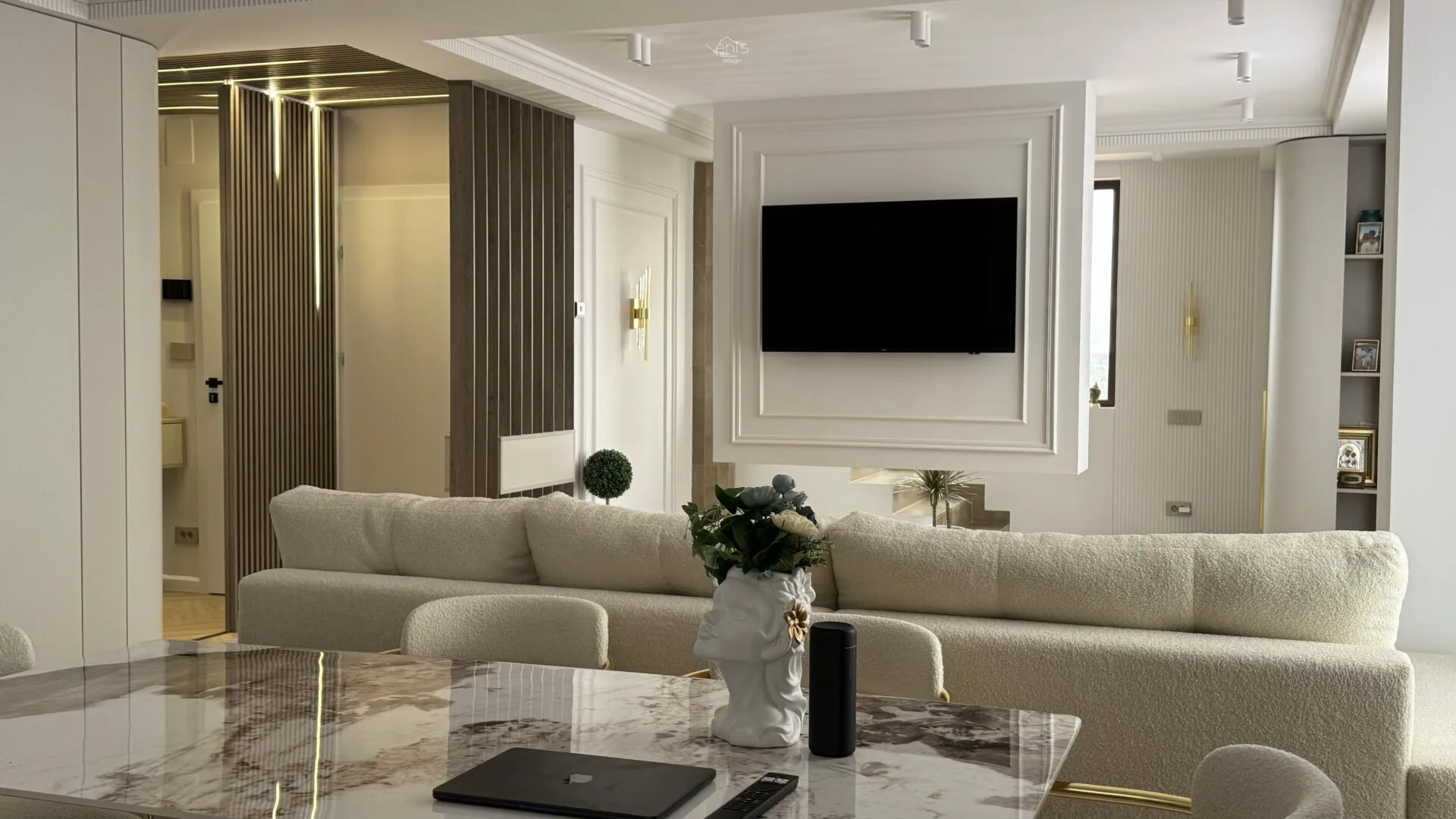 Conceptul general urmărește un echilibru precis între funcționalitate și expresie estetică, utilizând finisaje premium, texturi coerente și detalii executate cu acuratețe. Nivelul inferior integrează zona de zi într-un flux spațial continuu – living, dining, bucătărie, hol și baie – optimizat prin circulații clare și perspective vizuale curate. Inițial, acest nivel era organizat într-o structură fragmentată, cu un open-space, o baie și un dormitor, fără o zonă dedicată bucătăriei, aceasta fiind localizată la etajul superior. Prin reducerea adâncimii băii, a fost posibilă integrarea unei bucătării generoase, articulată în jurul unei insule ovale, devenind pivotul central al zonei de zi. Etajul 2, inițial configurat ca un open-space amplu și un dormitor cu o baie redusă ca dimensiuni, a fost reproiectat într-o zonă de noapte clar structurată și funcțional echilibrată. Noua organizare include un hol de distribuție, un dormitor pentru oaspeți și o suită matrimonială complet redefinită. Aceasta integrează un dressing dedicat, un dormitor generos și o baie premium concepută ca spațiu de relaxare, cu cadă freestanding, zonă cu două dușuri și o compoziție sanitară modelată în jurul luminii naturale și al texturilor sofisticate. Reconfigurarea a permis valorificarea optimă a suprafeței și crearea unei tranziții fluide, conferind zonei de noapte o identitate distinctă și un nivel ridicat de confort. Proiectul în ansamblu evidențiază o eleganță structurală și materială obținută prin coerența compoziției, disciplina detaliului și utilizarea unei palete rafinate, consolidând identitatea apartamentului în zona premium a designului interior.