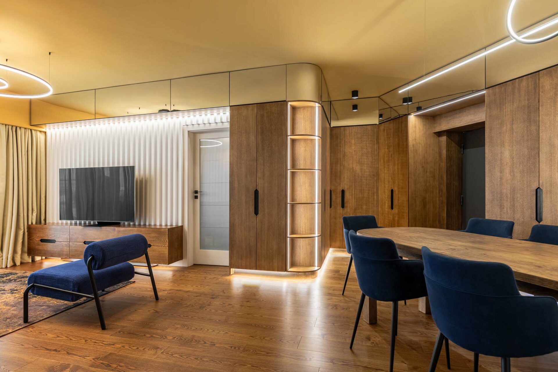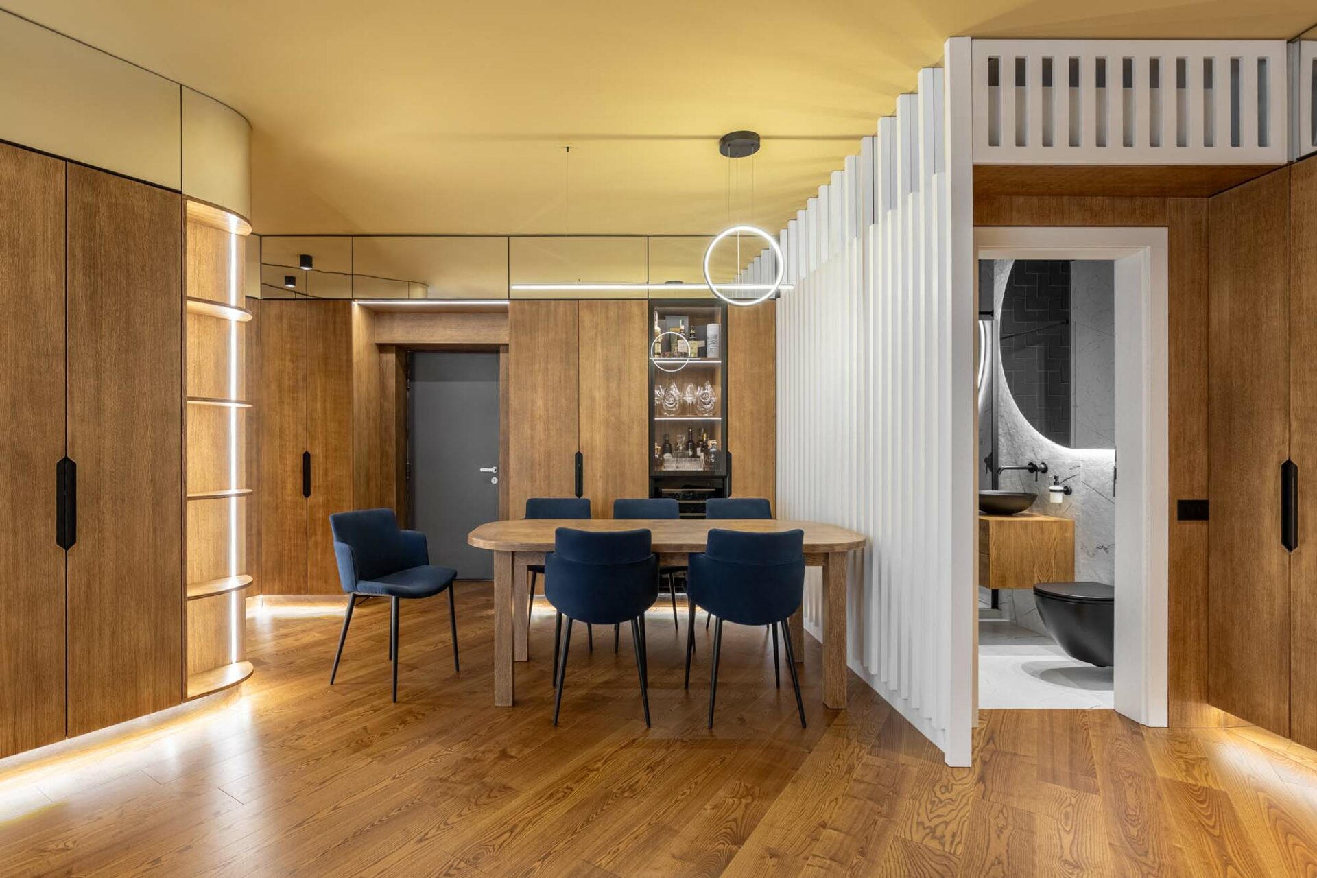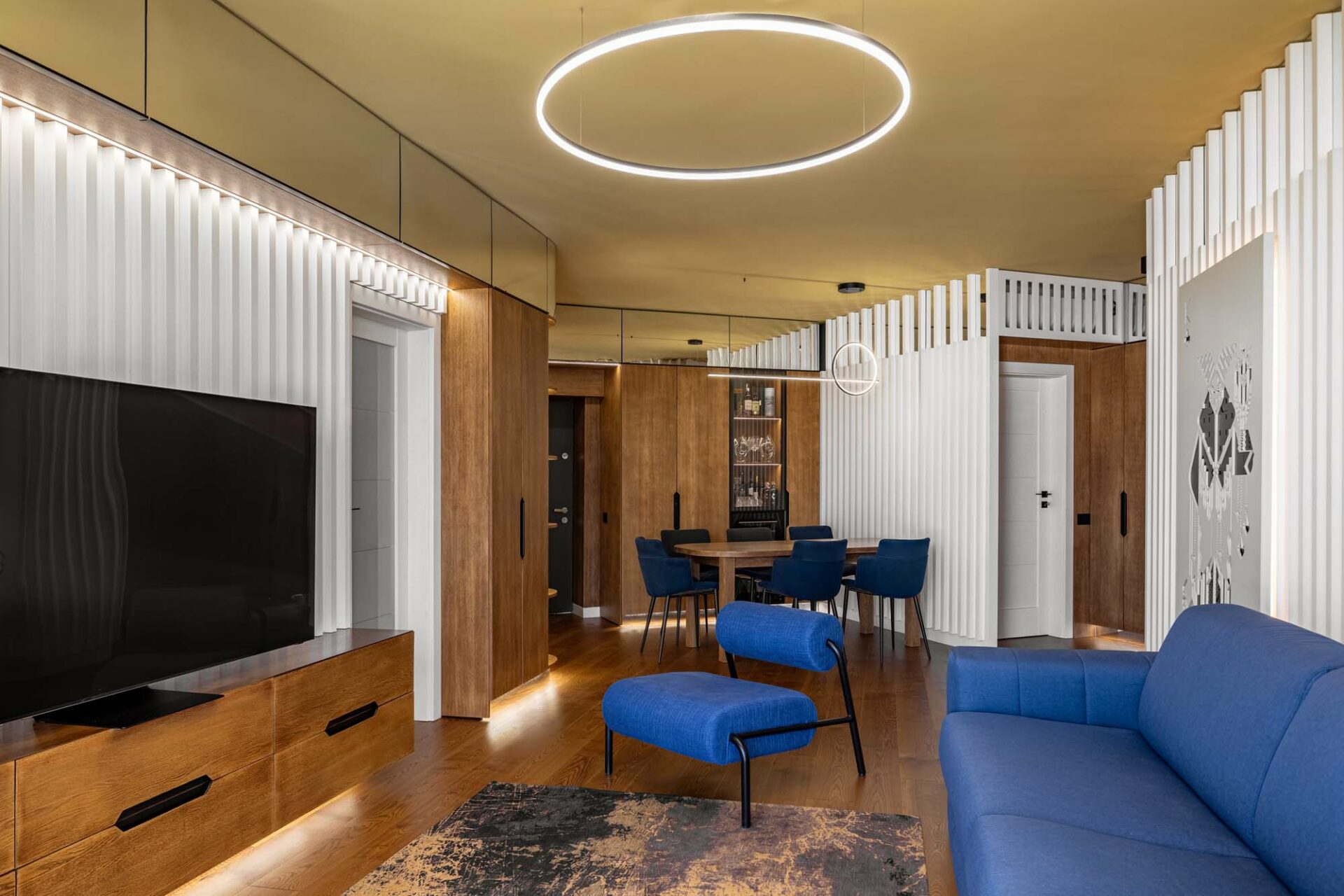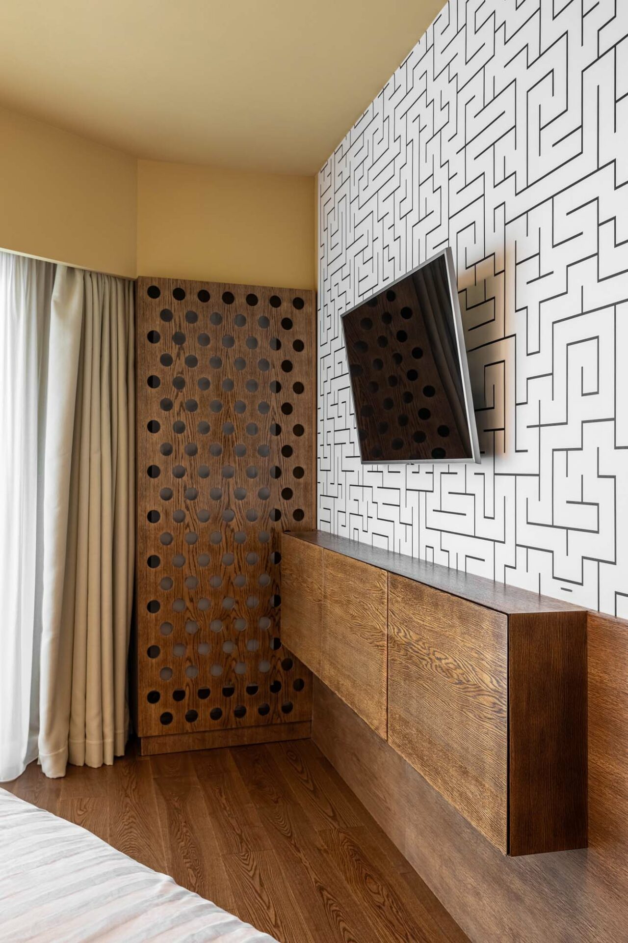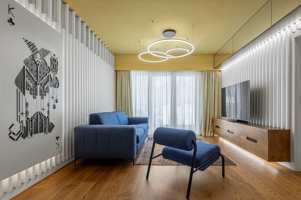 Forma fragmentară a spațiului contribuie deasemenea la aparența sculpturală a acestuia, prin jocul de unghiuri obtuze. Forma neregulată cu multe laturi a zonei de dining a fost camuflată prin ritmul continuu a intervenției perimetrale. Livingul întrerupe continuitatea lemnului printr-un tratatament monocrom al pereteților cu riflaje. Acestea se dematerializează în partea superioară, dând impresia că pereții devin paravane. Baia și bucătăria au ca stindard eleganța, prin folosirea unor tonuri închise și texturi puternic evidențiate. Dormitorul oferă un spațiu contrastant ce se remarcă prin piesele de mobilier furniruit și motivul labirintului ce acoperă pereții.