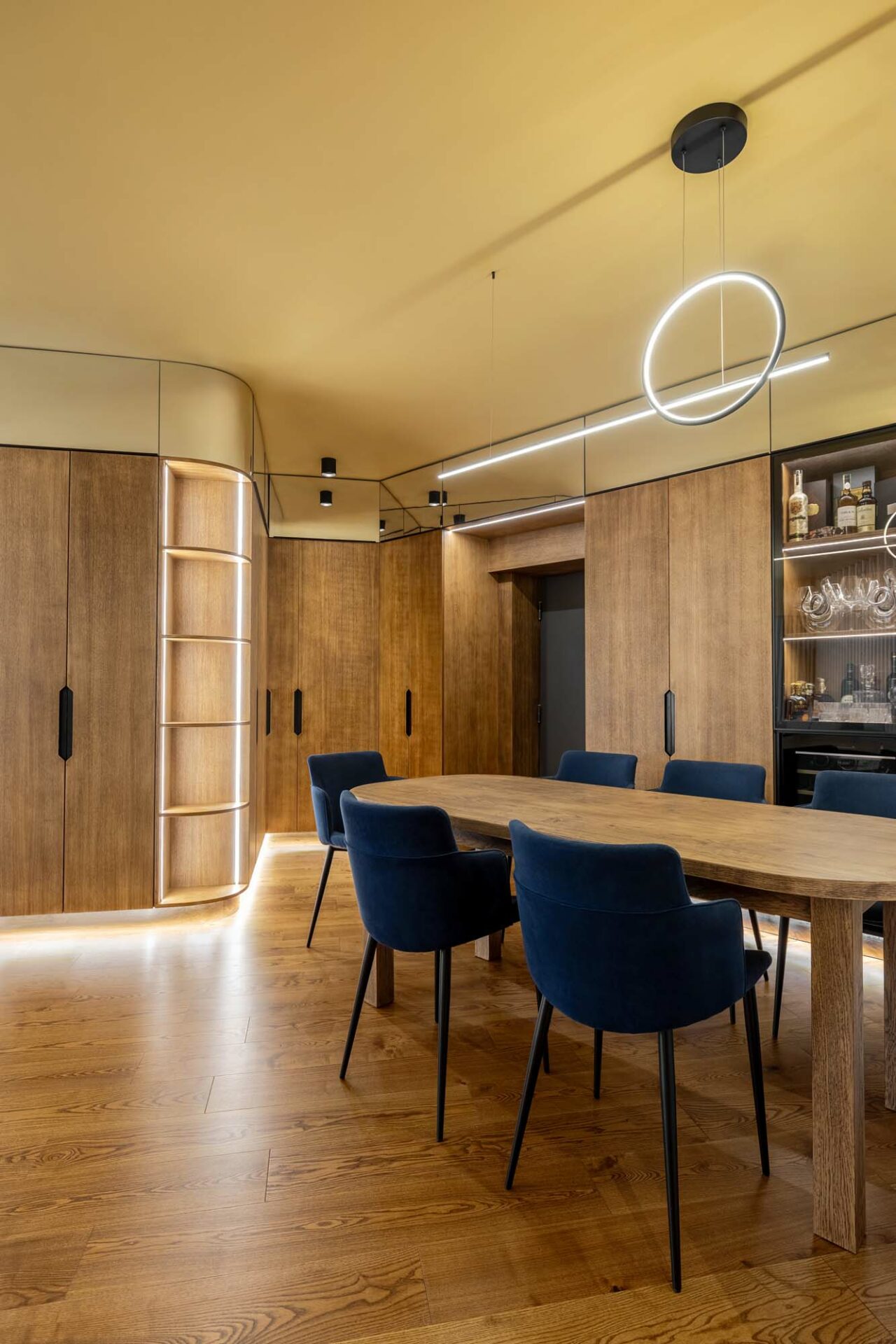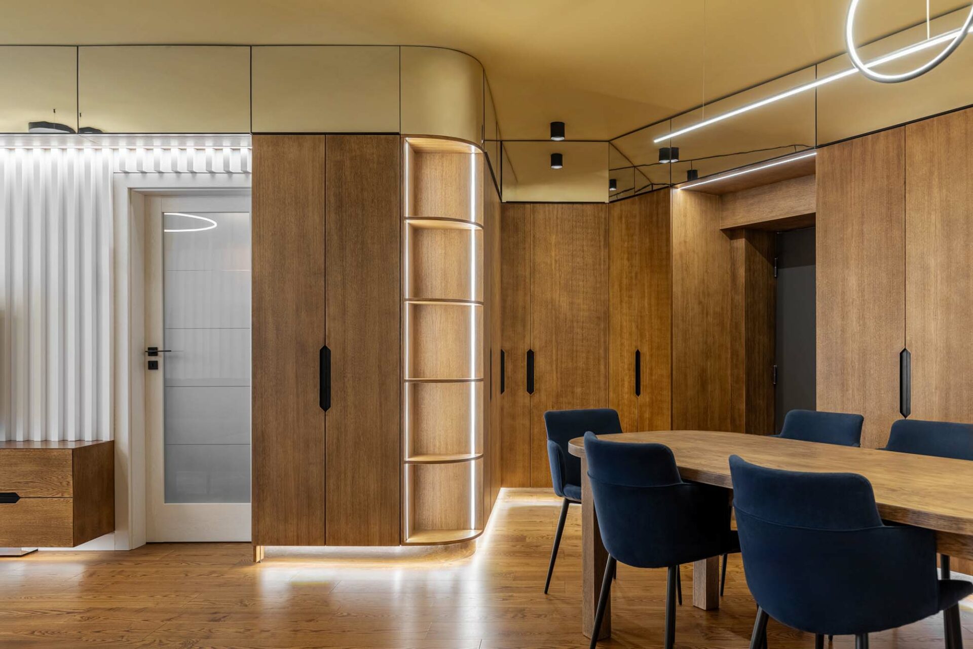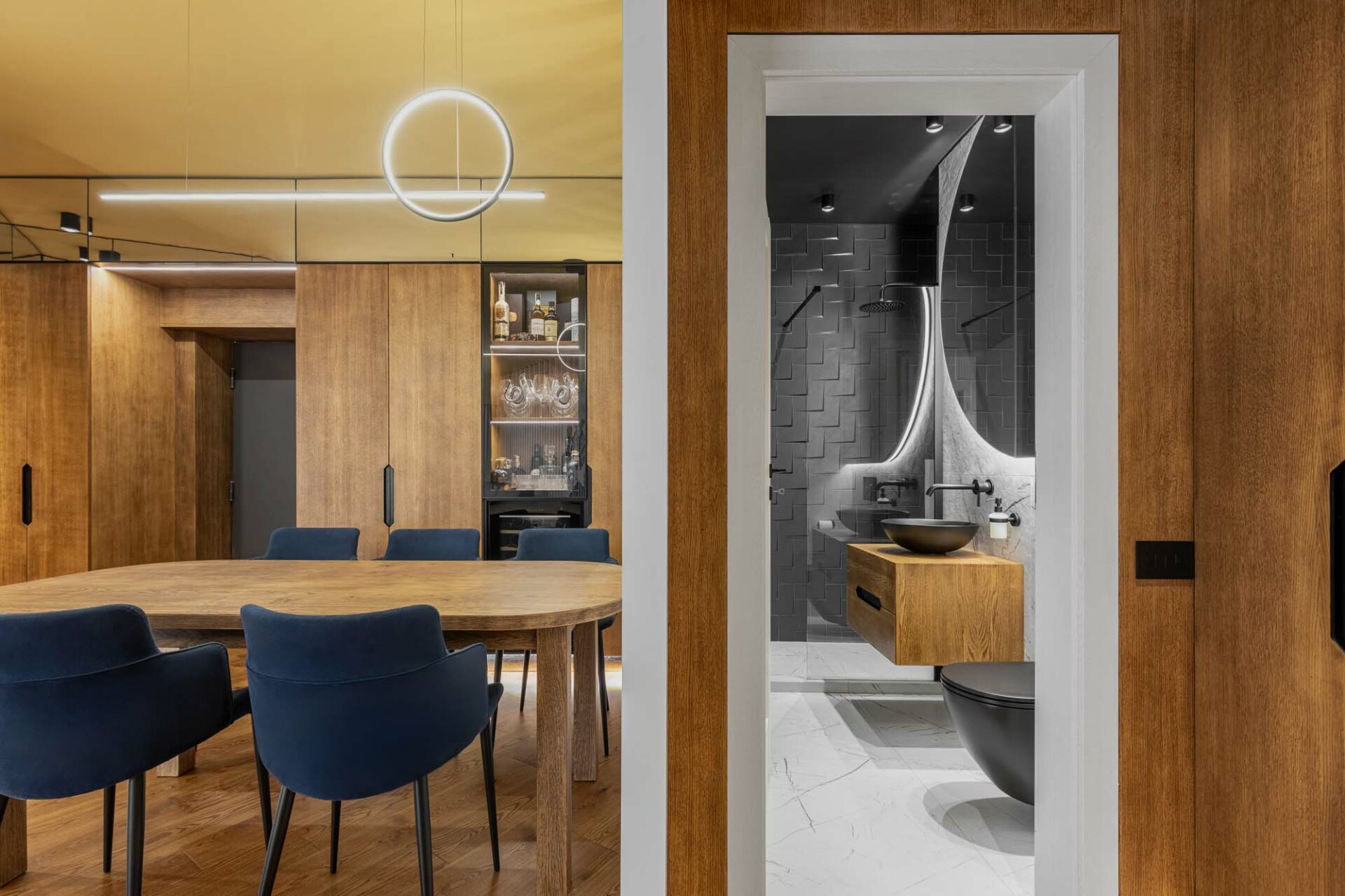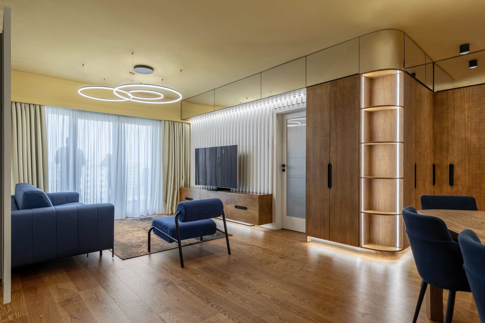 Forma fragmentară a spațiului contribuie deasemenea la aparența sculpturală a acestuia, prin jocul de unghiuri obtuze. Forma neregulată cu multe laturi a zonei de dining a fost camuflată prin ritmul continuu a intervenției perimetrale. Livingul întrerupe continuitatea lemnului printr-un tratatament monocrom al pereteților cu riflaje. Acestea se dematerializează în partea superioară, dând impresia că pereții devin paravane. Baia și bucătăria au ca stindard eleganța, prin folosirea unor tonuri închise și texturi puternic evidențiate. Dormitorul oferă un spațiu contrastant ce se remarcă prin piesele de mobilier furniruit și motivul labirintului ce acoperă pereții.