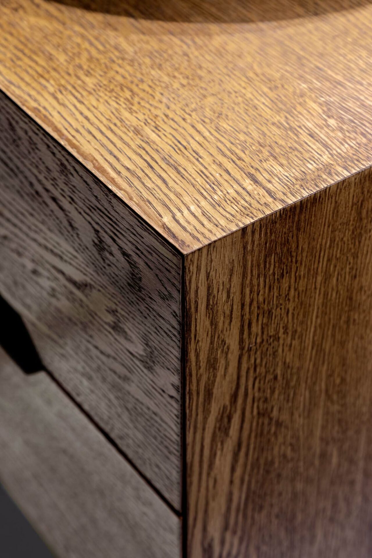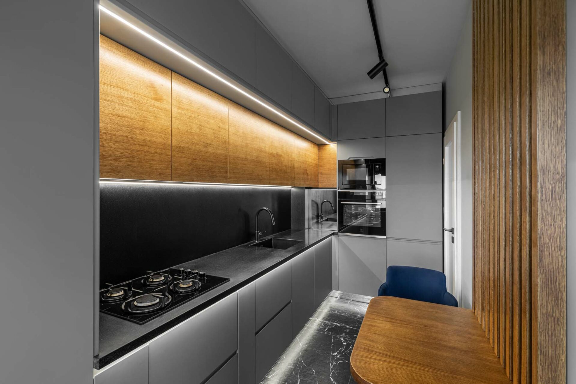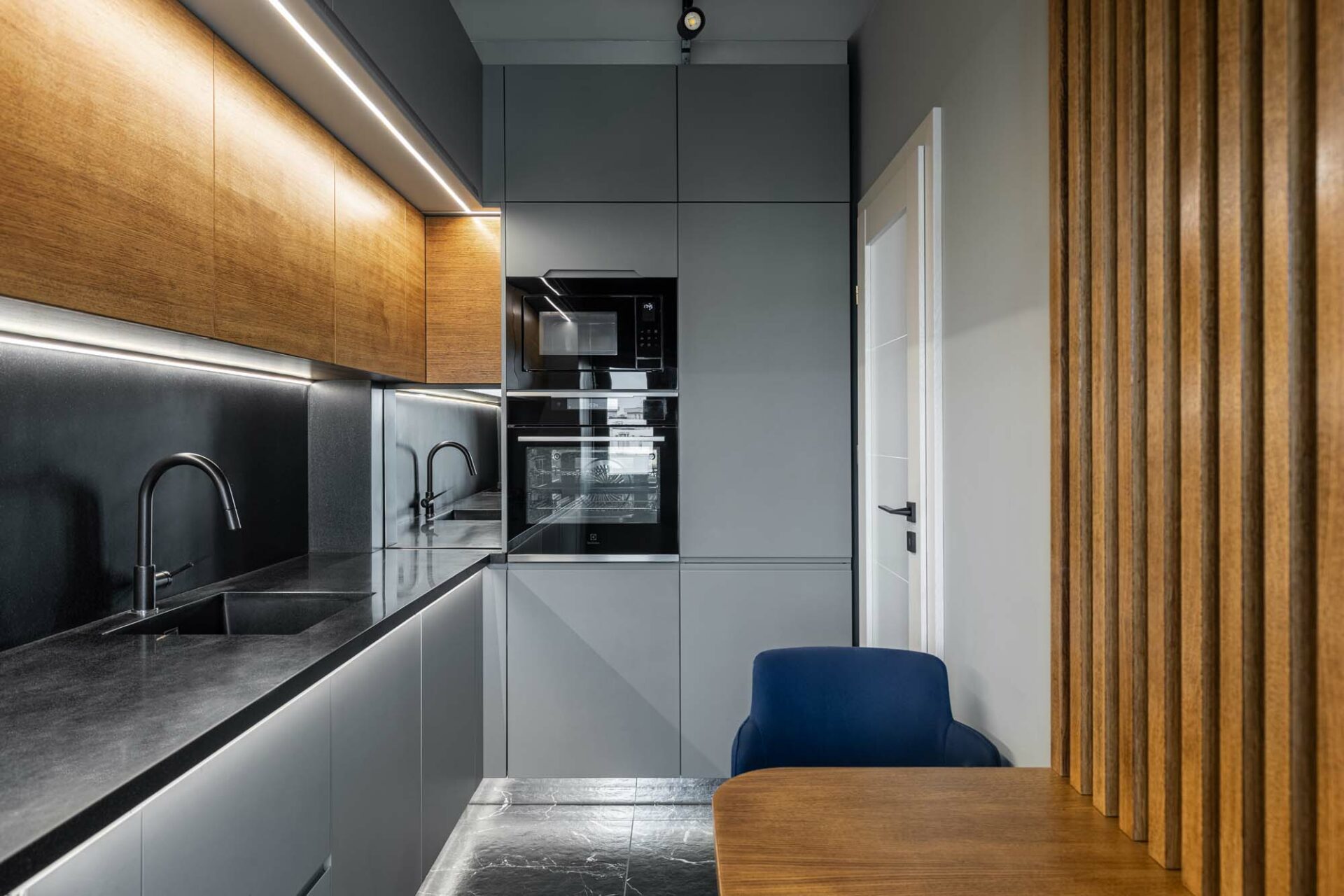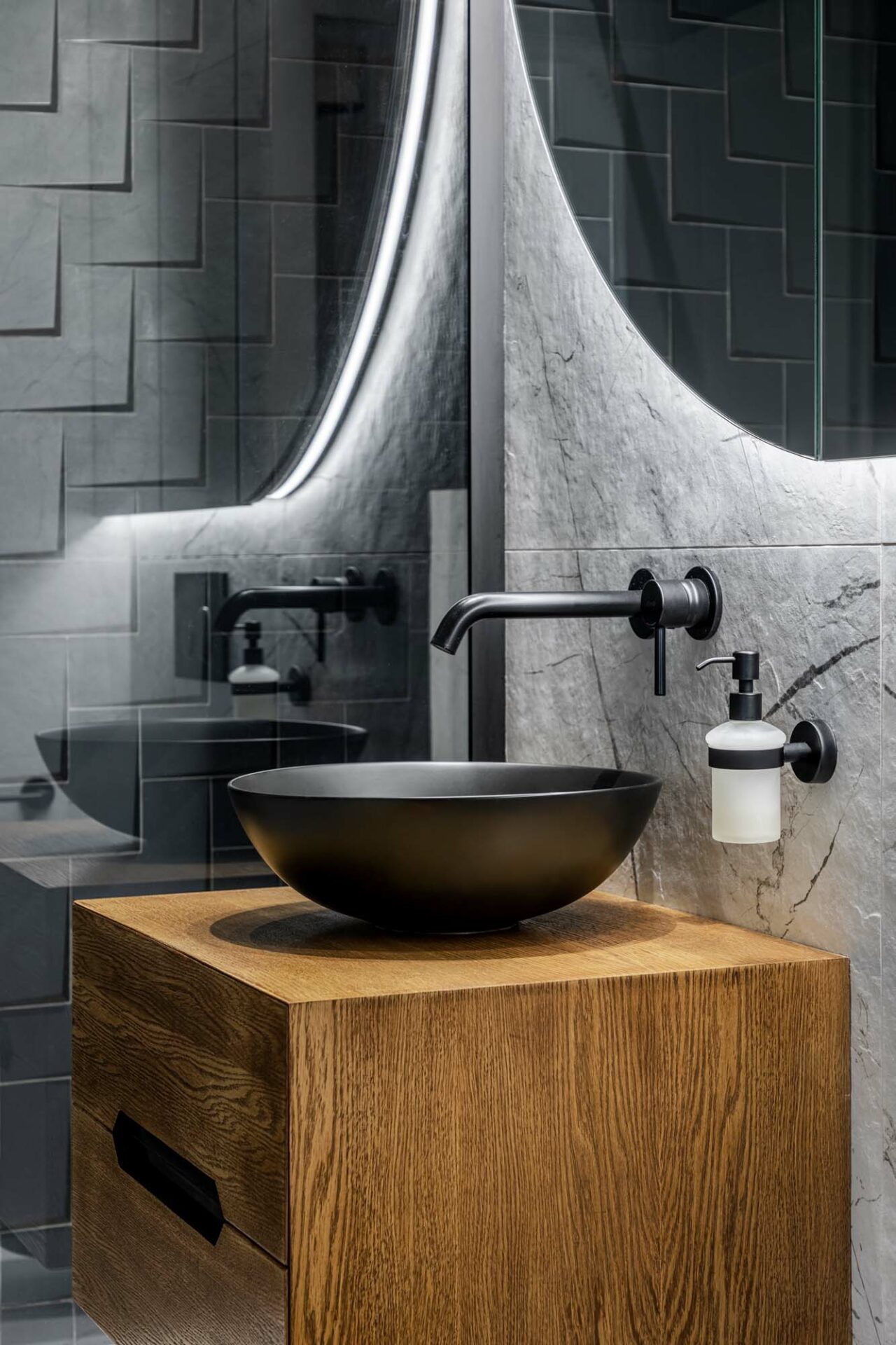 Forma fragmentară a spațiului contribuie deasemenea la aparența sculpturală a acestuia, prin jocul de unghiuri obtuze. Forma neregulată cu multe laturi a zonei de dining a fost camuflată prin ritmul continuu a intervenției perimetrale. Livingul întrerupe continuitatea lemnului printr-un tratatament monocrom al pereteților cu riflaje. Acestea se dematerializează în partea superioară, dând impresia că pereții devin paravane. Baia și bucătăria au ca stindard eleganța, prin folosirea unor tonuri închise și texturi puternic evidențiate. Dormitorul oferă un spațiu contrastant ce se remarcă prin piesele de mobilier furniruit și motivul labirintului ce acoperă pereții.