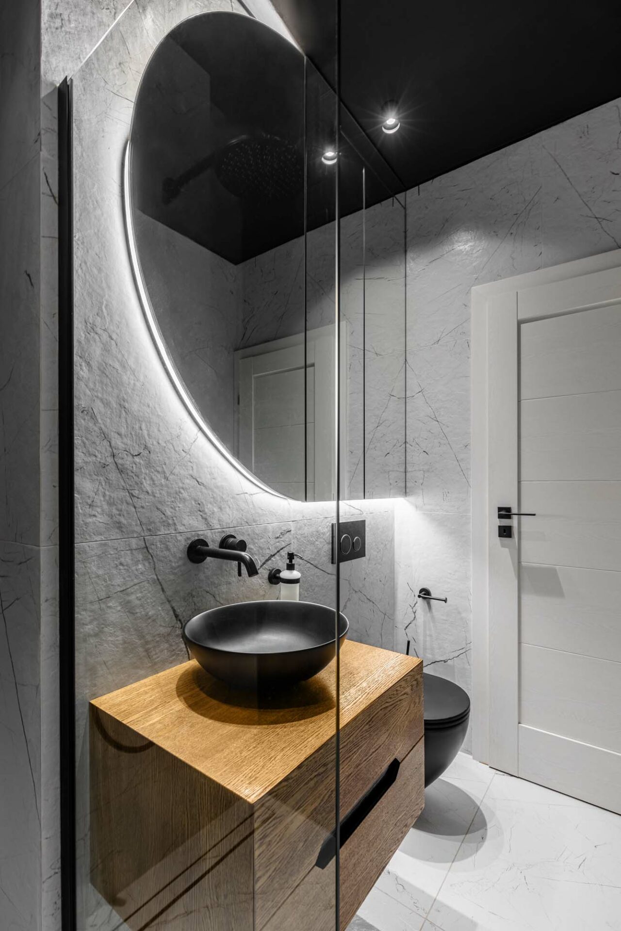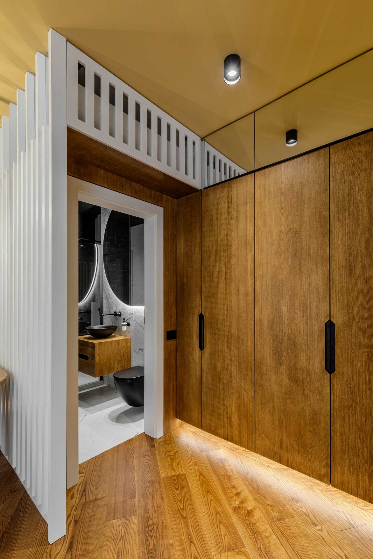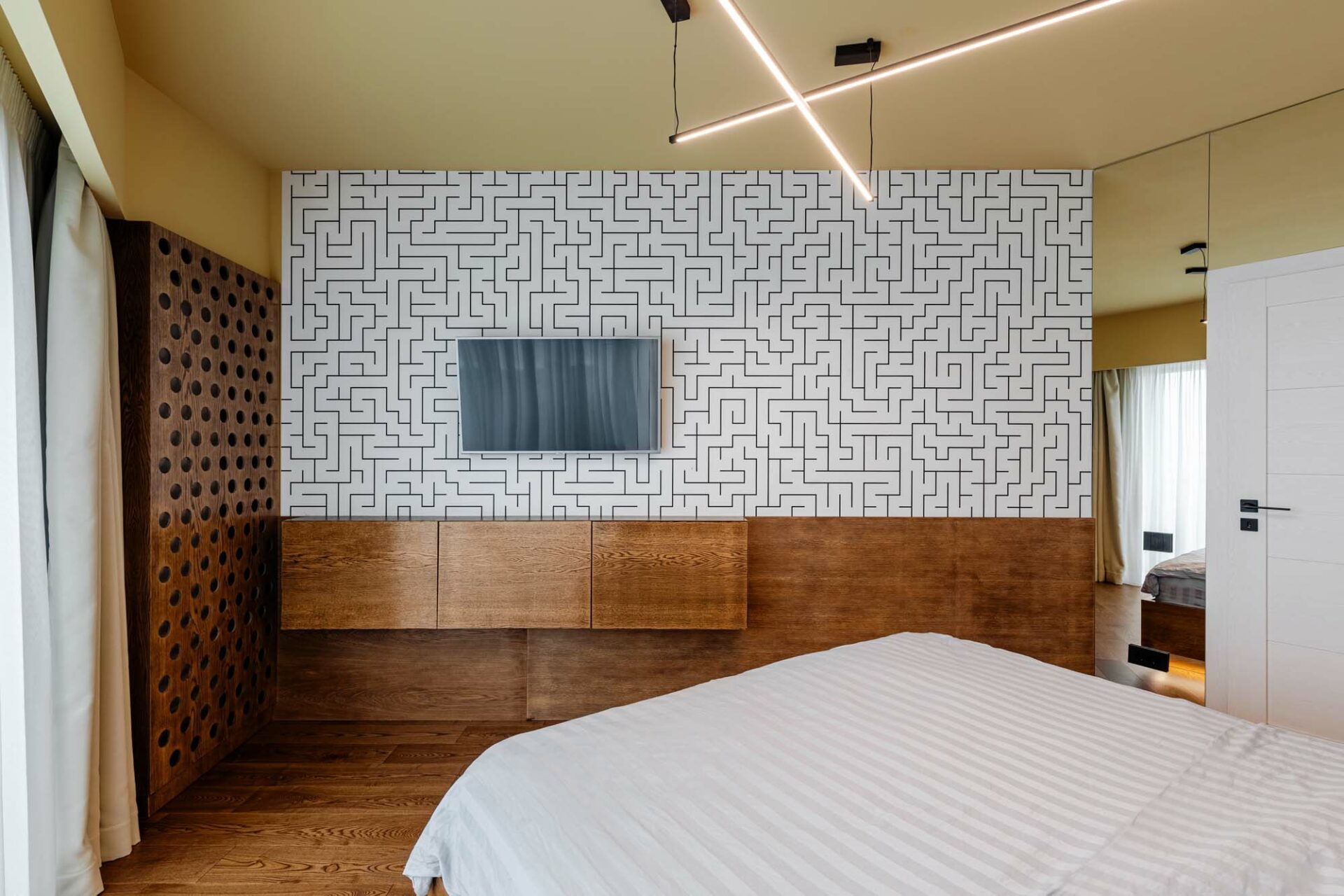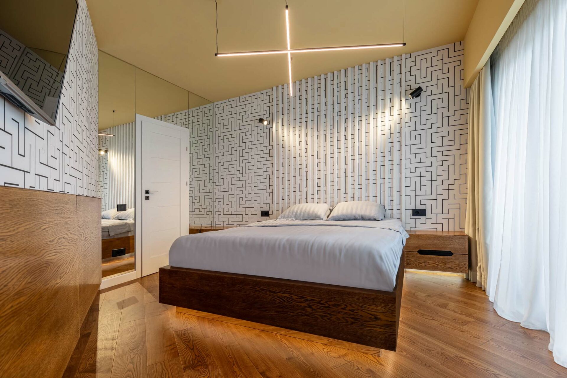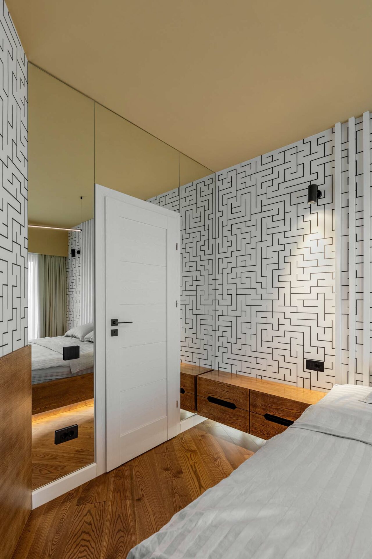 Placarea cu oglindă întâlnită la nivelul peretelui lateral creează impresia de extindere a spațiului, potențată și prin situarea acesteia opusă față de latura vitrată a camerei, o generoasă zonă de lumină. Placarea cu oglindă se regăsește și la baza patului, oferind de data aceasta iluzia de plutire a obiectului, în ciuda consistenței sale solide. Prezența sa este dublată subtil și prin intermediul riflajelor albe, ce fac trecerea cu planul vertical al peretelui.