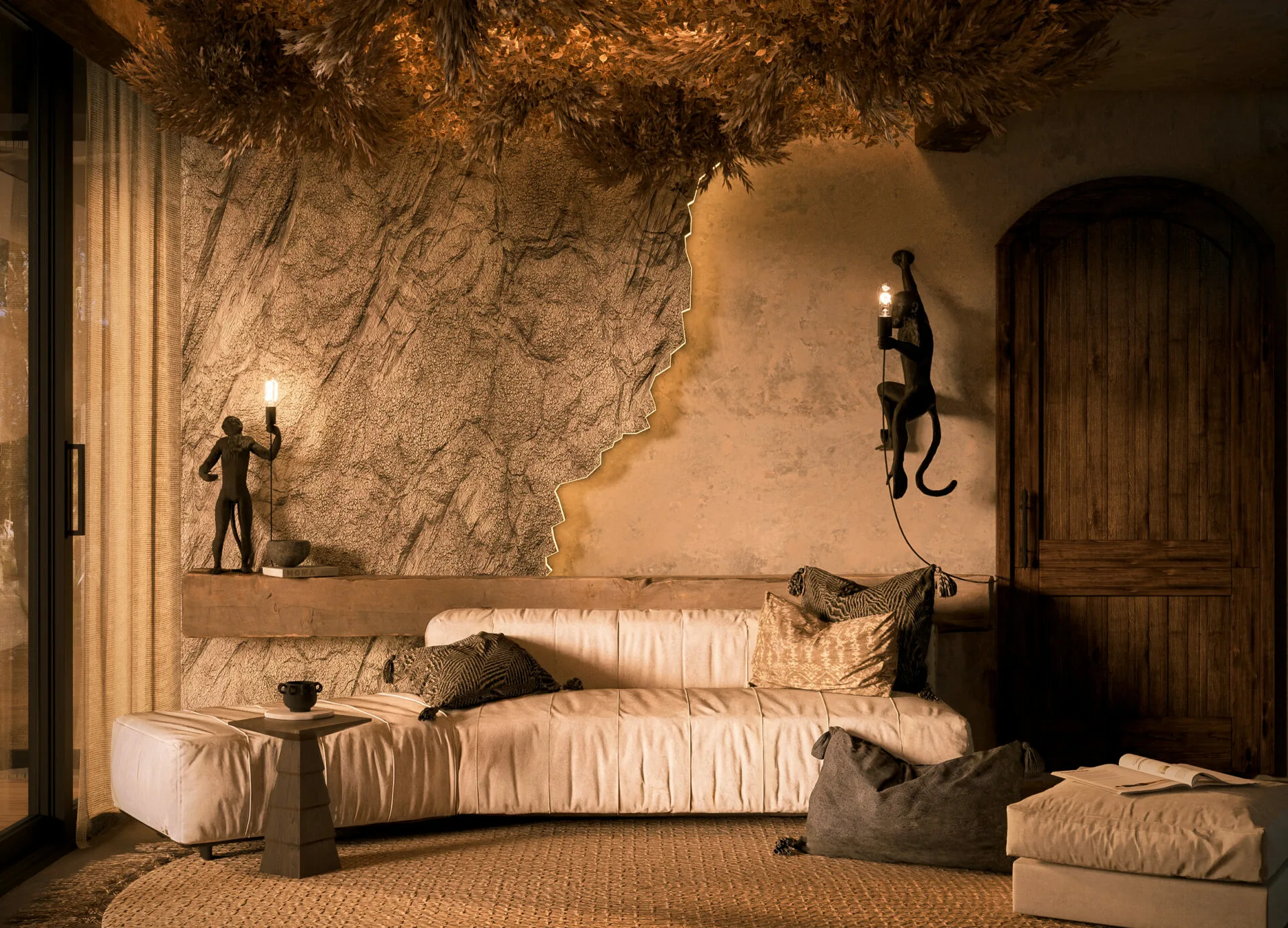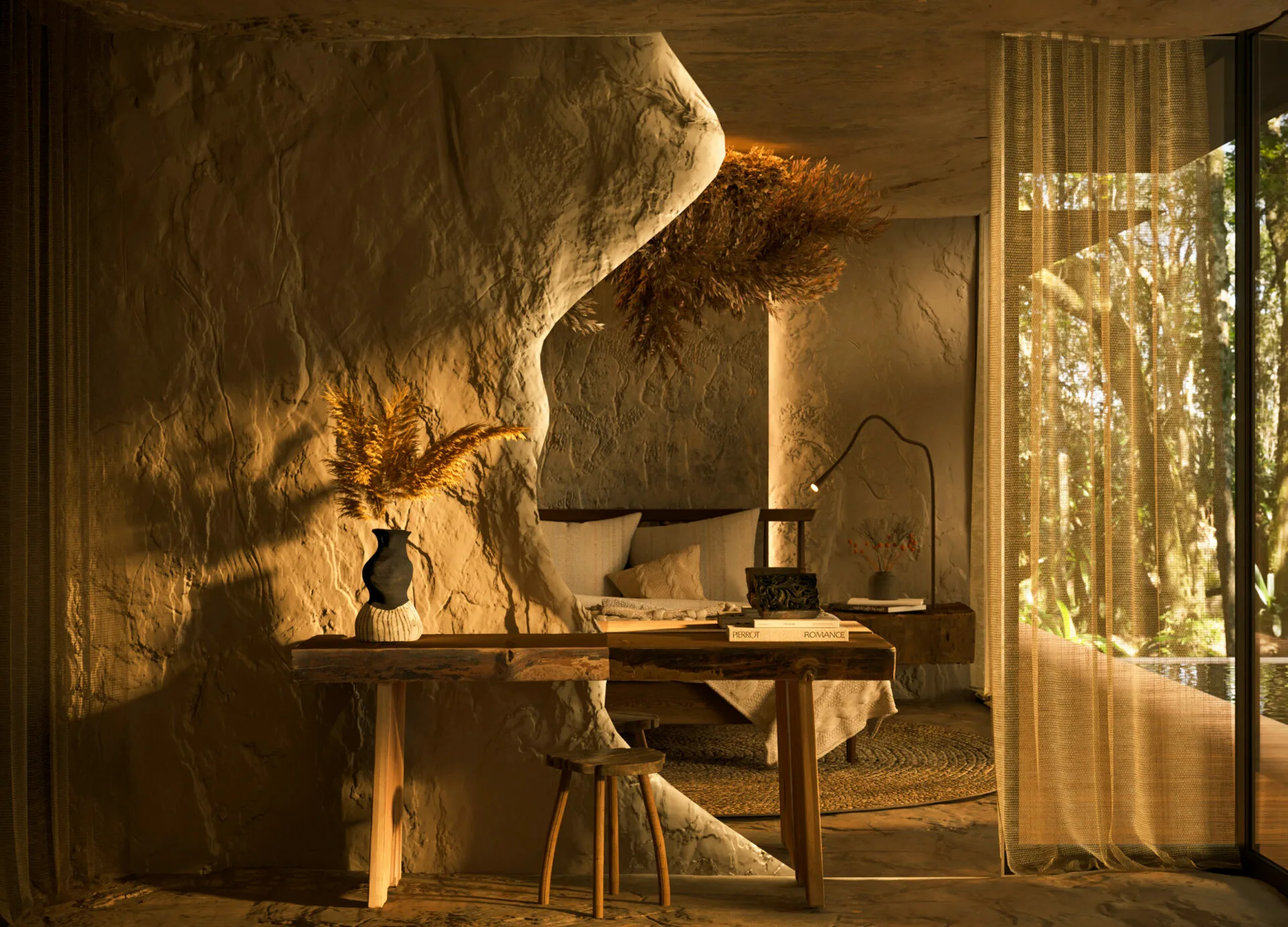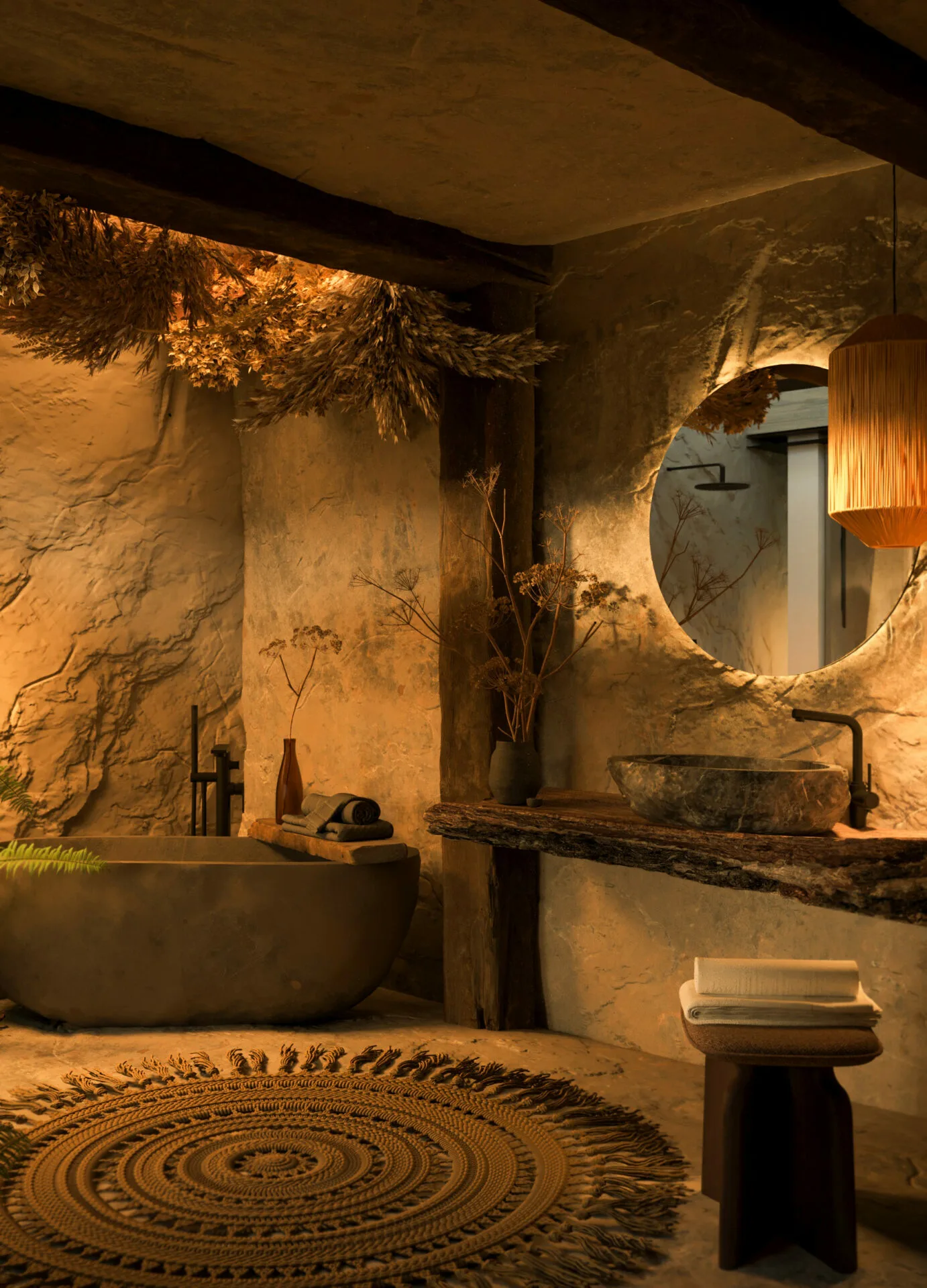 Amara Resort se definește printr-un concept în care natura și arhitectura se completează firesc. Piatra naturală, prezentă din abundență, oferă textură și autenticitate, în timp ce paleta cromatică dominată de tonuri pământii creează o atmosferă caldă și echilibrată. Spațiile ample vitrate deschid interioarele către peisaj, aducând lumina naturală și frumusețea naturii direct în sufletul resortului. Vegetația suspendată și accentele de lemn sculptural dau un caracter organic și sofisticat, transformând fiecare încăpere într-un refugiu contemporan unde designul minimalist întâlnește confortul și rafinamentul.