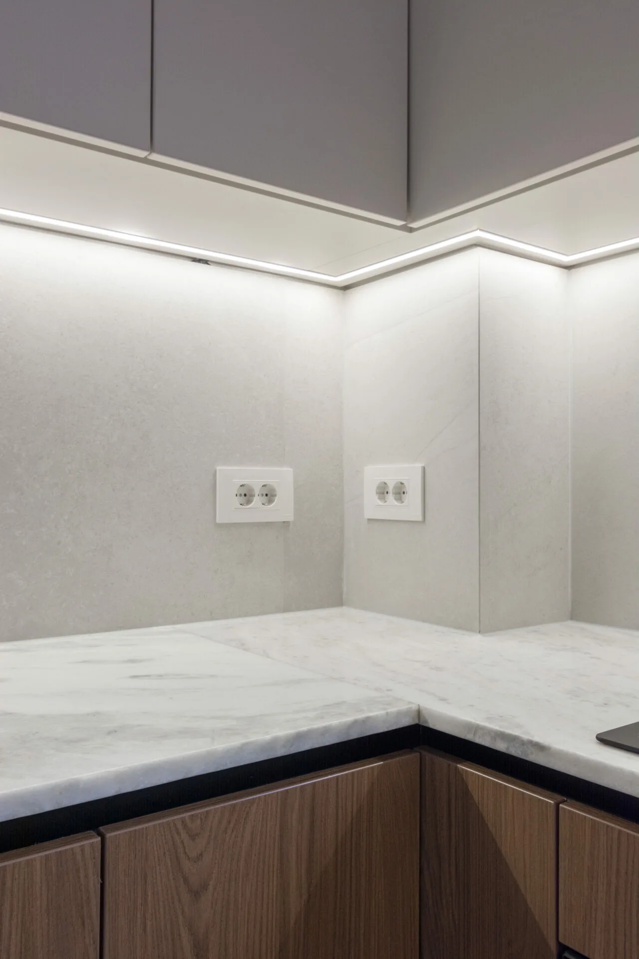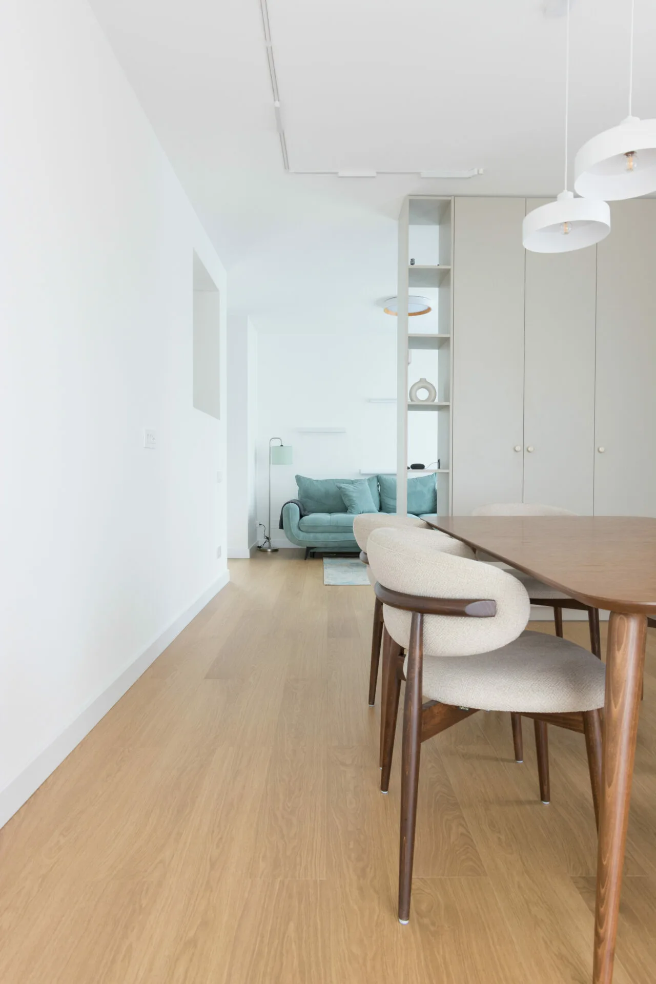 Bucătăria este separată din punct de vedere funcțional, dar delimitată prin uși de sticlă care mențin relația vizuală cu holul și zona de luat masa. Zona de zi și locul de luat masa sunt tratate ca spații distincte, articulate printr-un corp de mobilier multifuncțional ce permite delimitarea celor două funcțiuni fără a fragmenta percepția spațială.