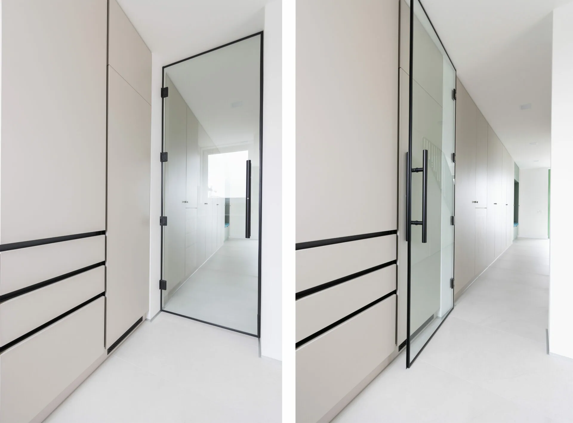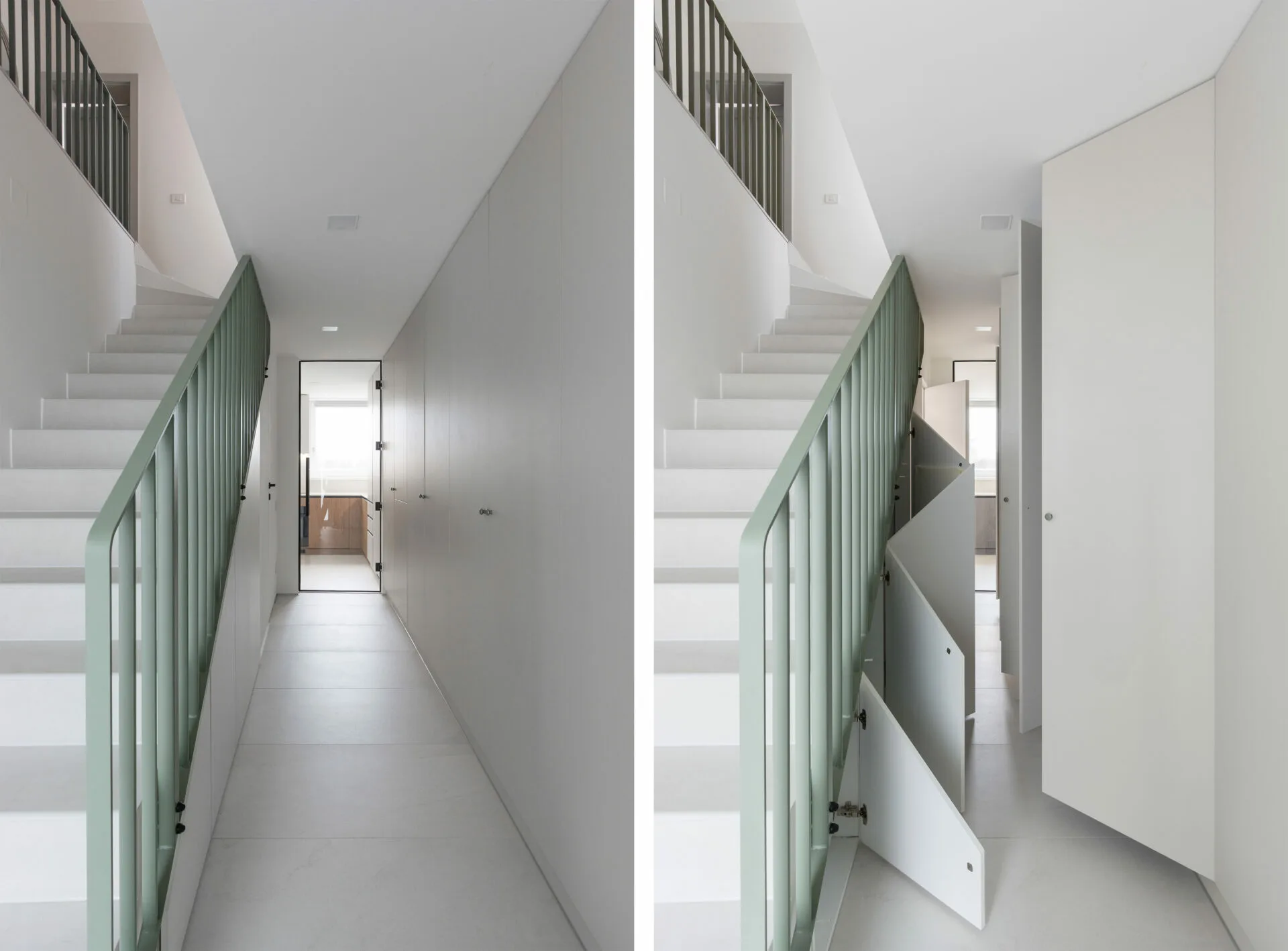 Holul de acces este delimitat de un dulap multifuncțional care structurează zona de intrare și concentrează depozitarea și spațiile tehnice într-un element unitar. Scara de acces la etaj funcționează ca element de tranziție materială și spațială, iar spațiul de sub aceasta este valorificat ca zonă compactă de depozitare, spațiu tehnic și grup sanitar minimal, contribuind la o utilizare eficientă a suprafeței.