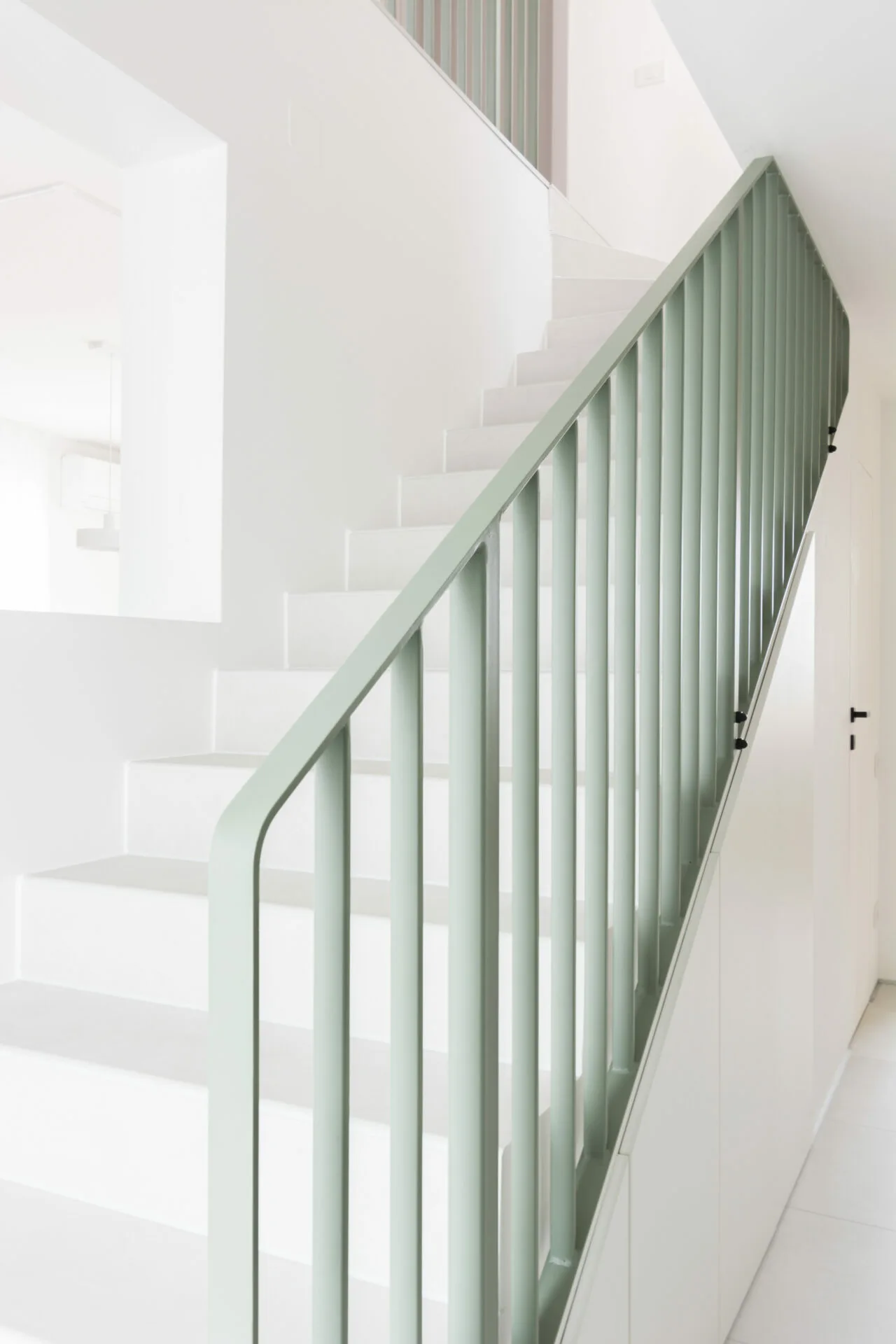 Balustrada metalică verde devine un accent cromatic, nuanță reluată subtil în detalii și accente integrate în întreaga amenajare.