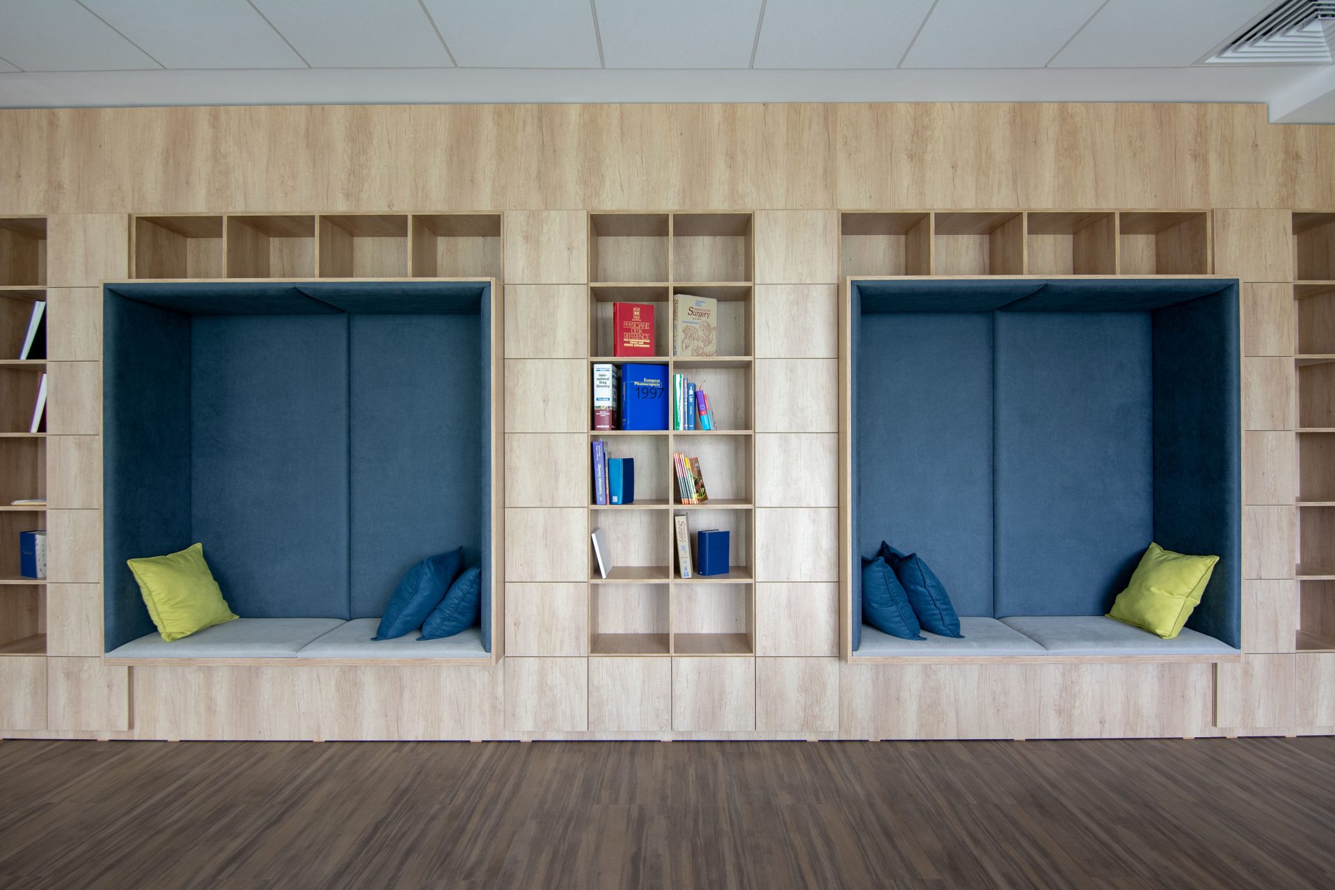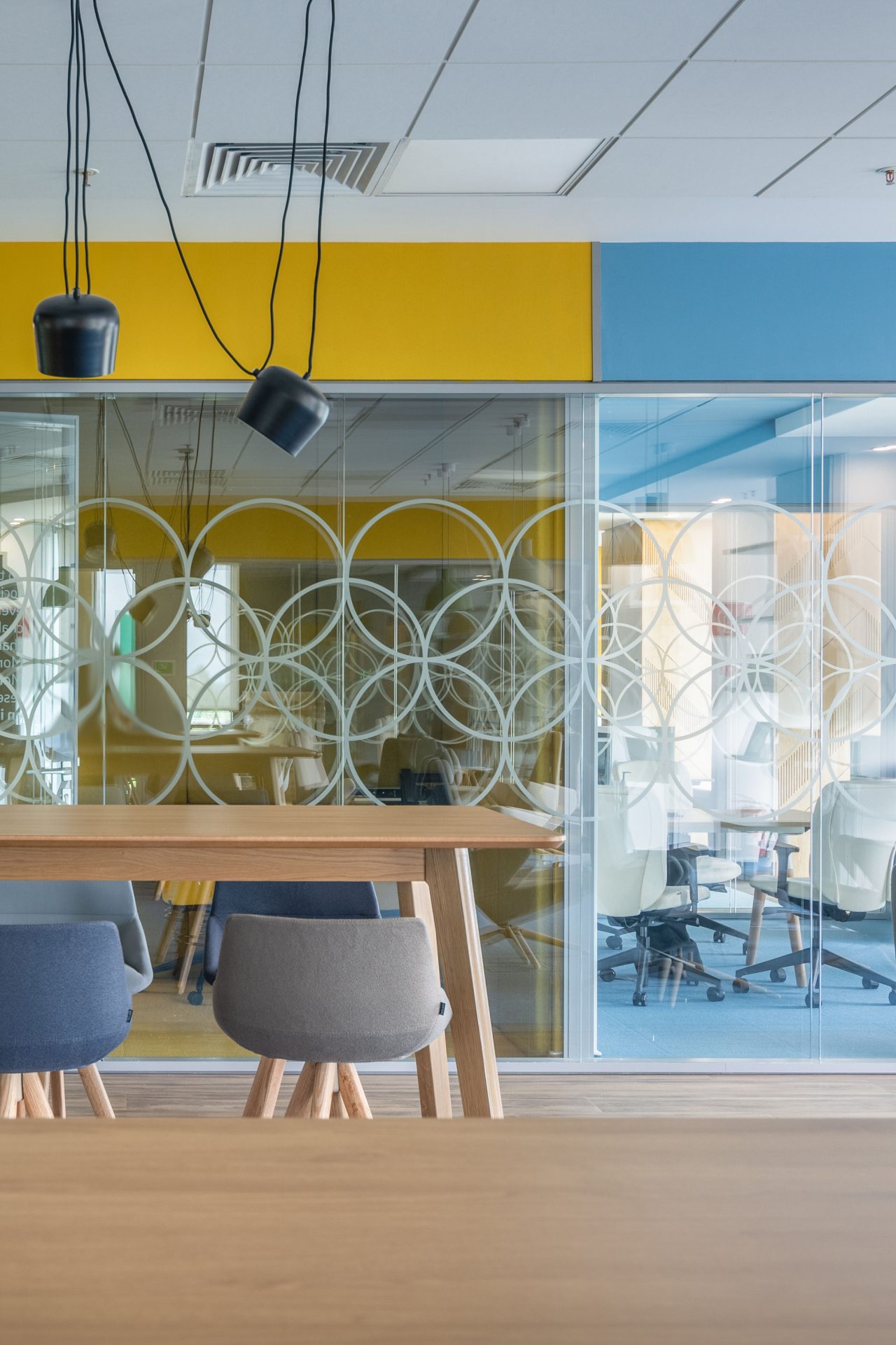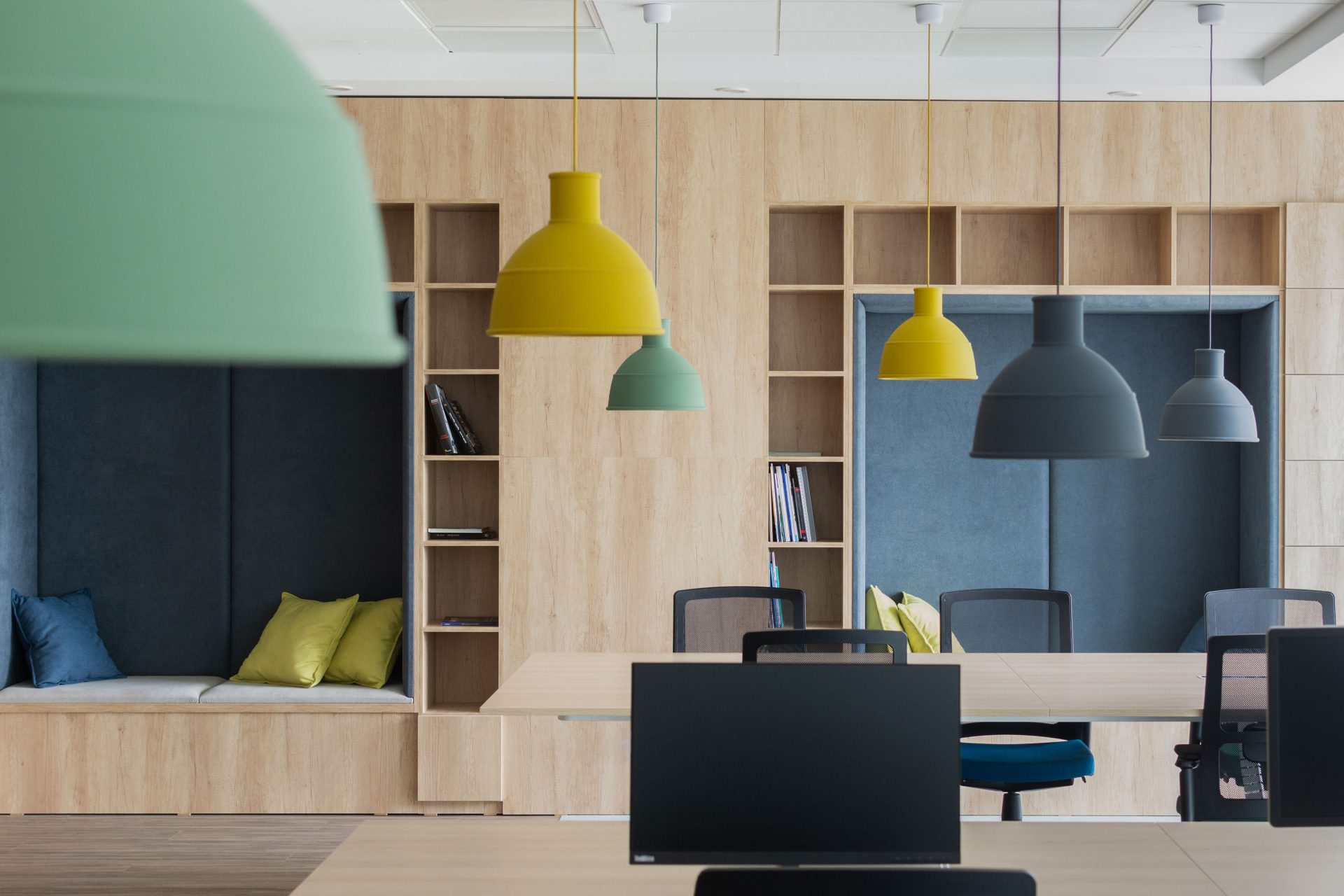 Culori îndrăznețe și strălucitoare în combinație cu materiale calde precum lemnul, au fost utilizate pentru a crea un spațiu primitor.