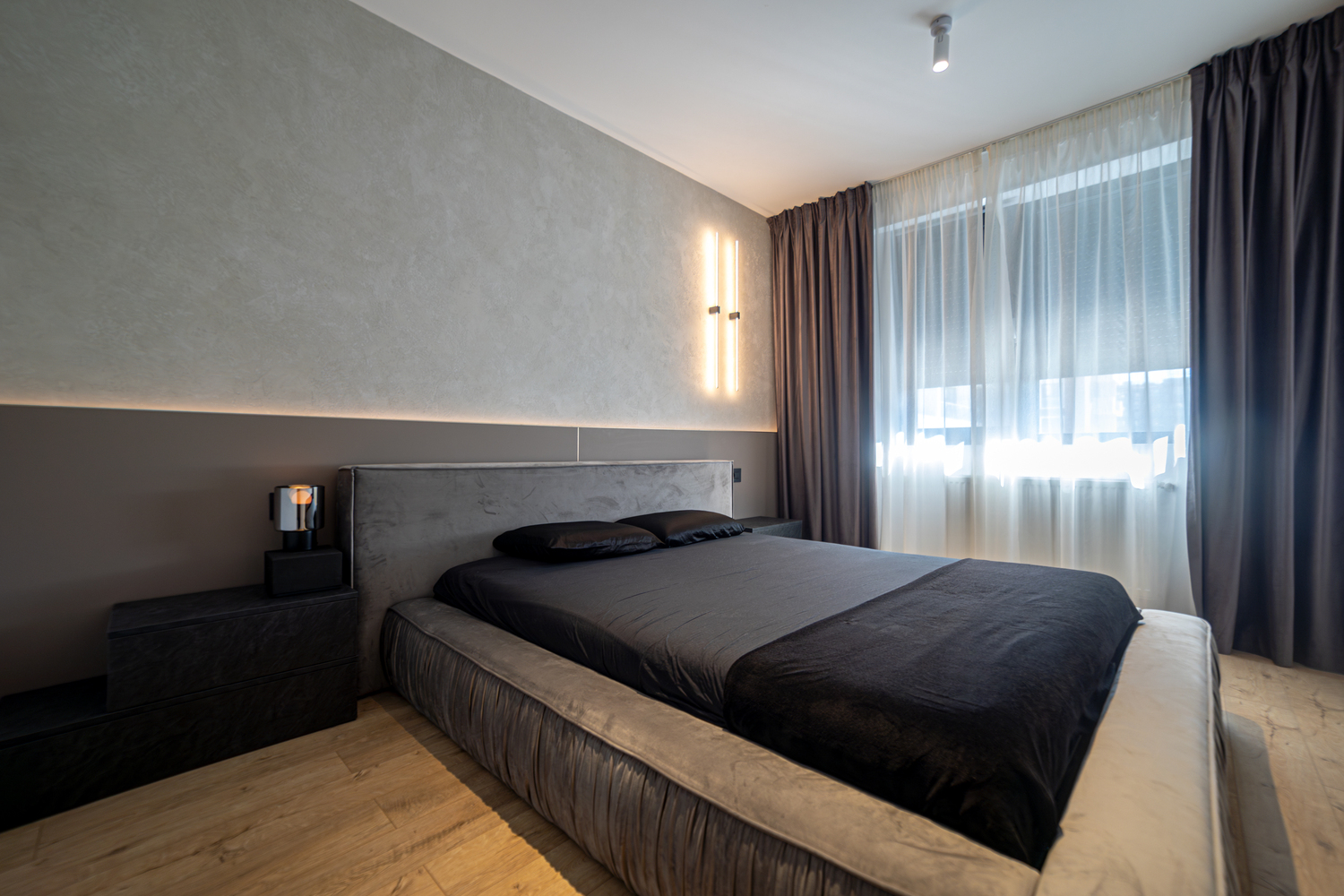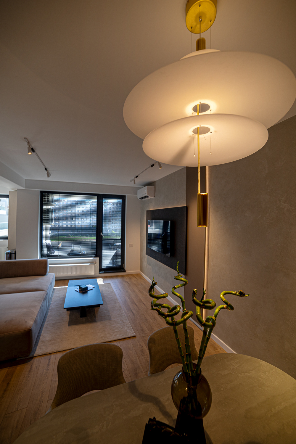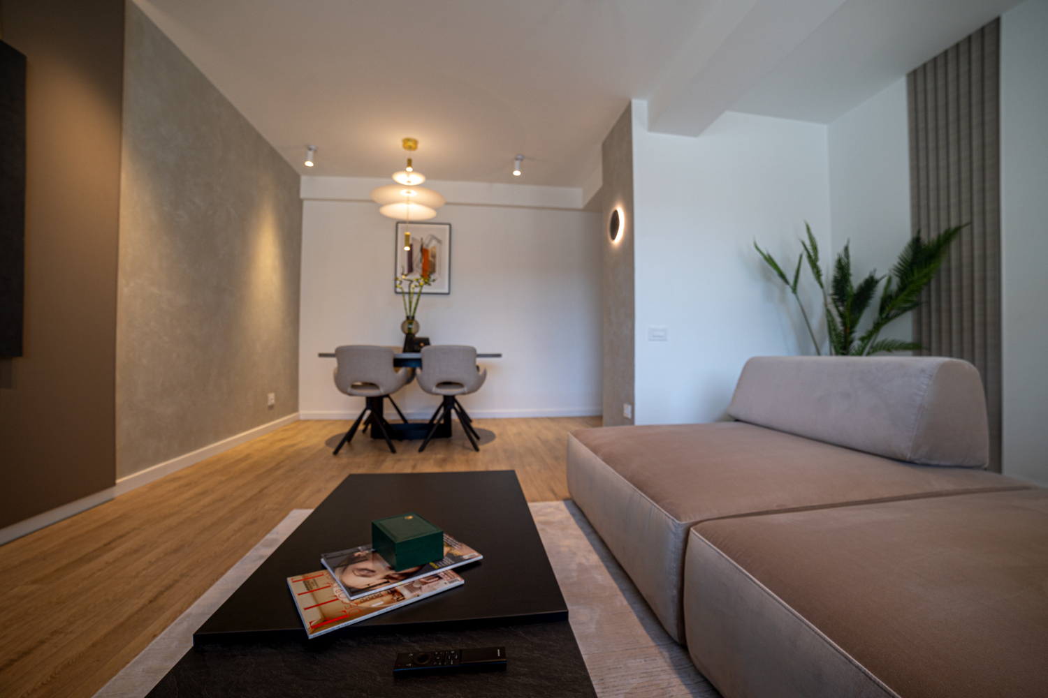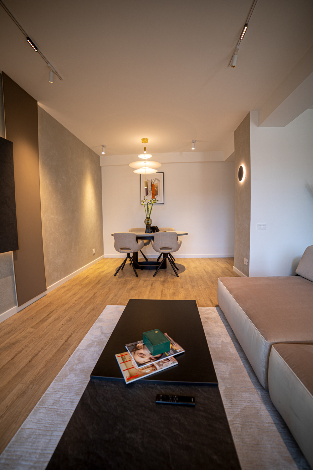 S-a dorit un look modern, elegant și minimalist, cu culori deschise și o atmosferă cât mai caldă. Pentru a îndeplini aceste cerințe, am optat pentru alternarea a cât mai multe texturi, precum textura de piele cu textura de marmorino antico, texturi de catifea cu texturi de stofă. Am ales o canapea minimalistă cu spătar mobil, jaluzele interioare din lemn, în nuanțe de bej, crem, gri sidef și lemn deschis, adăugând un strop de negru pentru a evita monotonia. Designul și producția mobilei au fost realizate la comandă în atelierul nostru (bucătărie, masă, măsuță de cafea, noptiere).