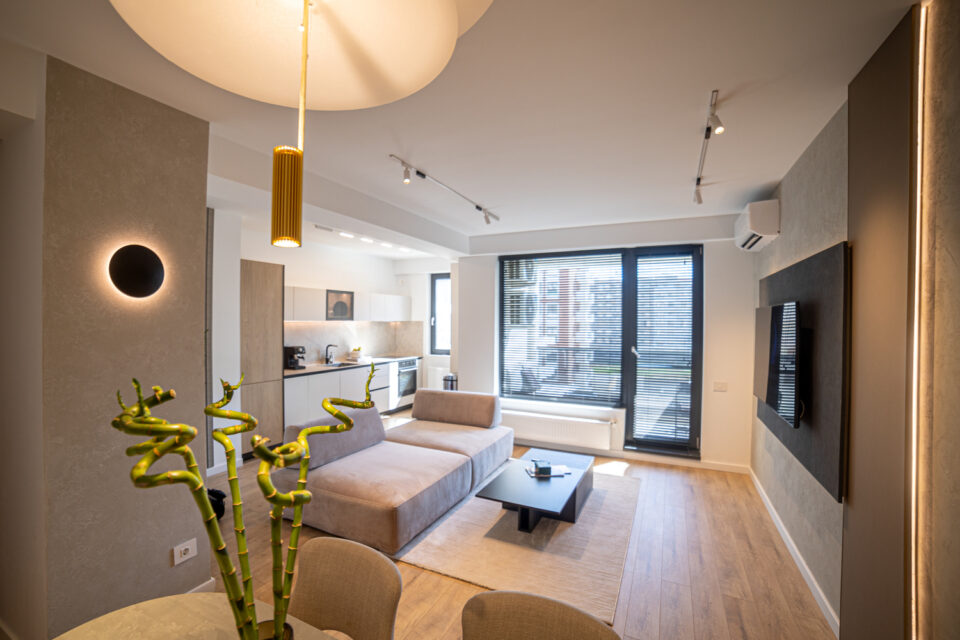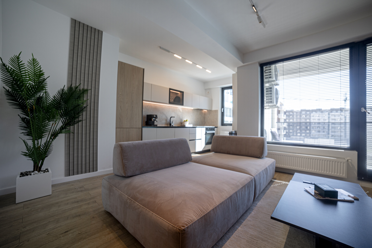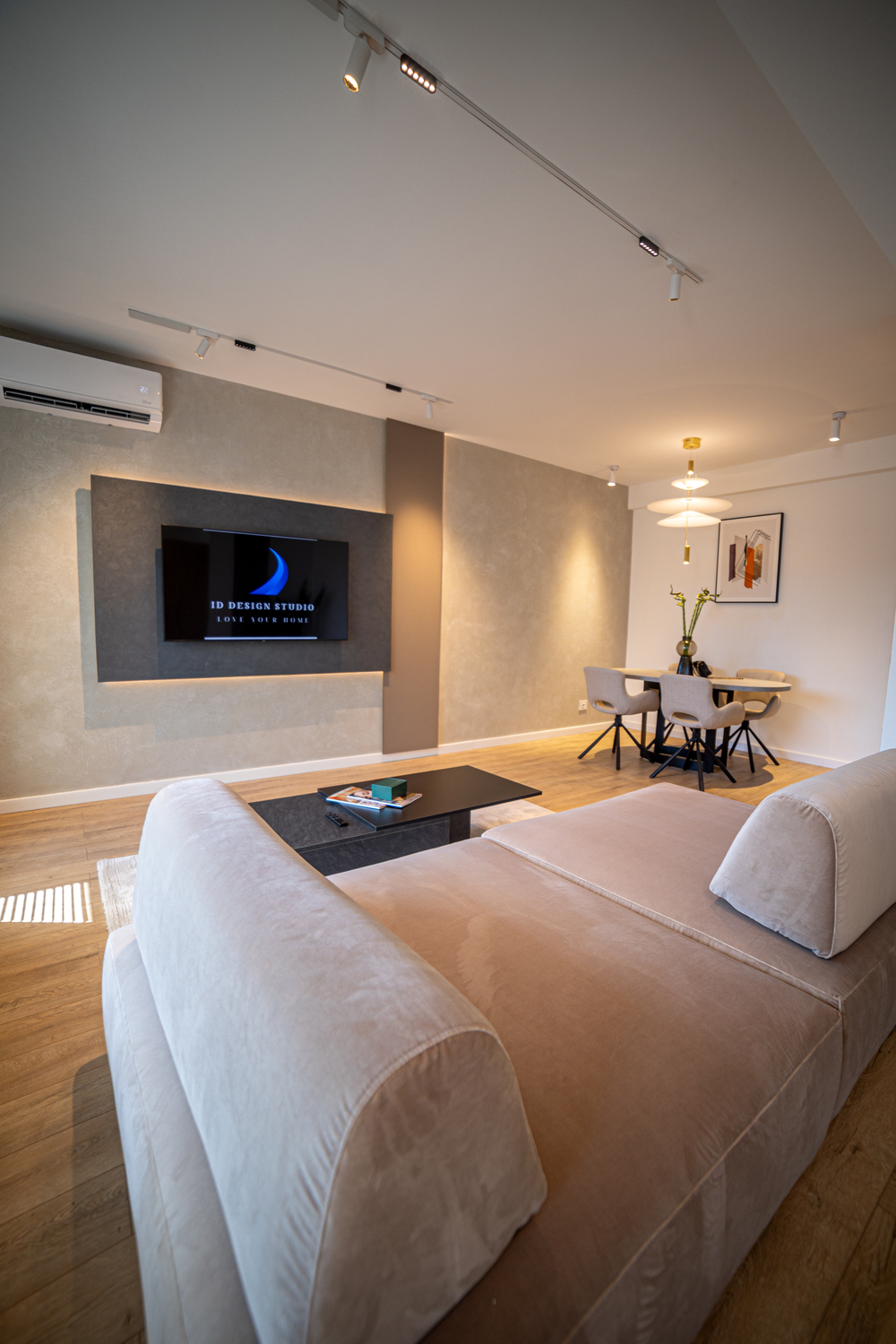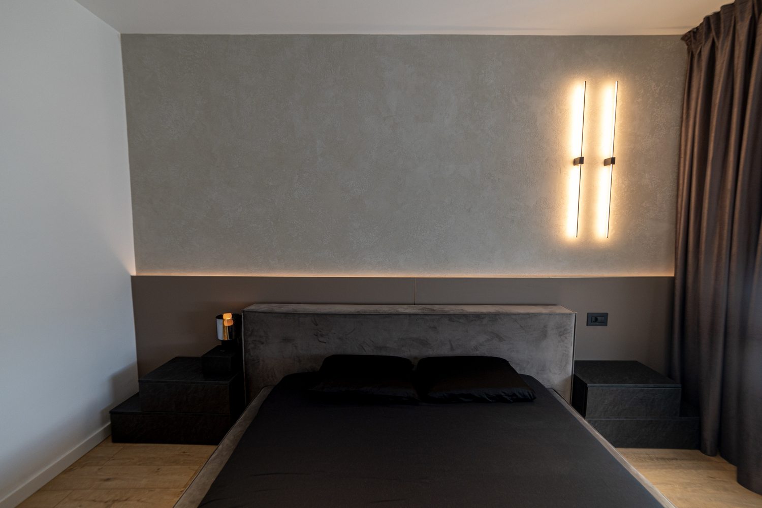 S-a dorit un look modern, elegant și minimalist, cu culori deschise și o atmosferă cât mai caldă. Pentru a îndeplini aceste cerințe, am optat pentru alternarea a cât mai multe texturi, precum textura de piele cu textura de marmorino antico, texturi de catifea cu texturi de stofă. Am ales o canapea minimalistă cu spătar mobil, jaluzele interioare din lemn, în nuanțe de bej, crem, gri sidef și lemn deschis, adăugând un strop de negru pentru a evita monotonia. Designul și producția mobilei au fost realizate la comandă în atelierul nostru (bucătărie, masă, măsuță de cafea, noptiere).