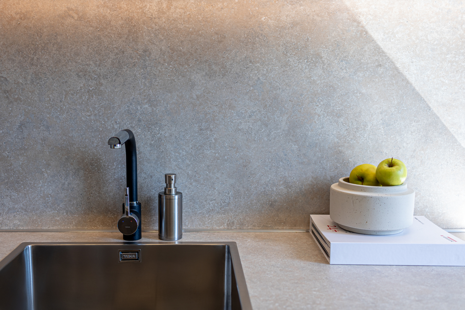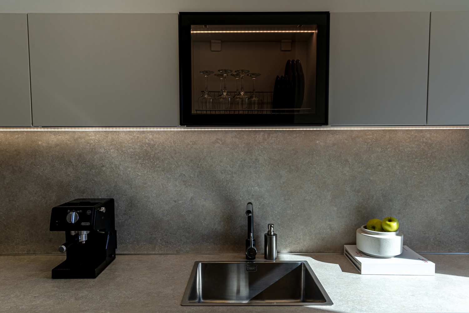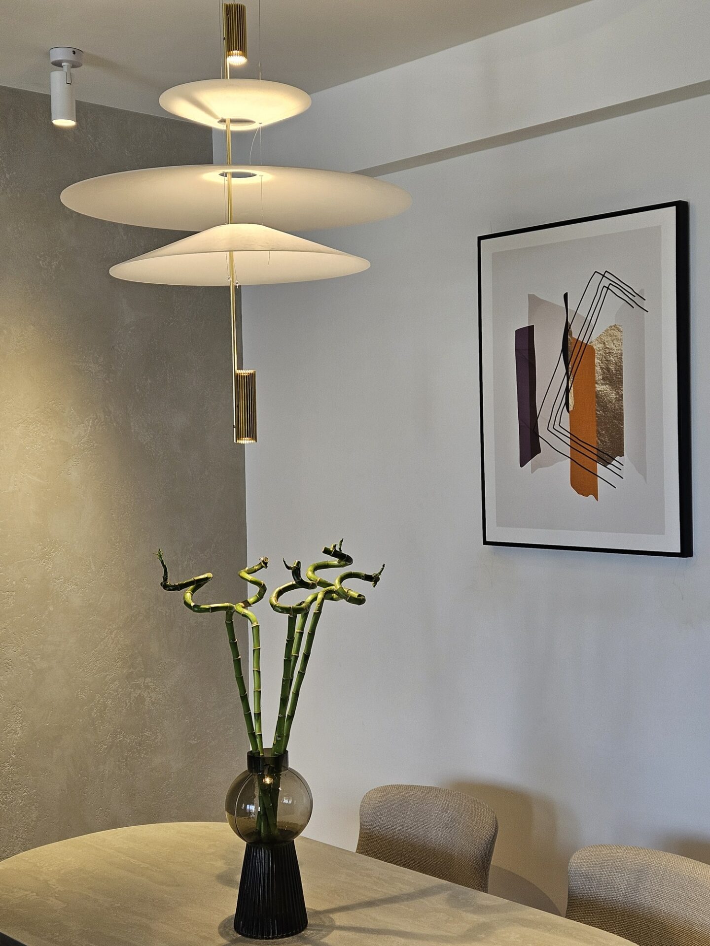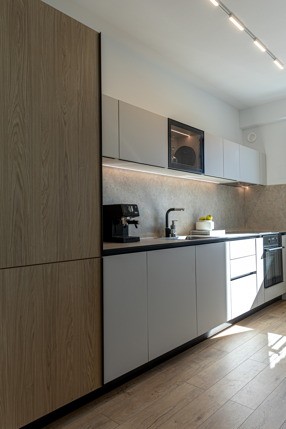 S-a dorit un look modern, elegant și minimalist, cu culori deschise și o atmosferă cât mai caldă. Pentru a îndeplini aceste cerințe, am optat pentru alternarea a cât mai multe texturi, precum textura de piele cu textura de marmorino antico, texturi de catifea cu texturi de stofă. Am ales o canapea minimalistă cu spătar mobil, jaluzele interioare din lemn, în nuanțe de bej, crem, gri sidef și lemn deschis, adăugând un strop de negru pentru a evita monotonia. Designul și producția mobilei au fost realizate la comandă în atelierul nostru (bucătărie, masă, măsuță de cafea, noptiere).