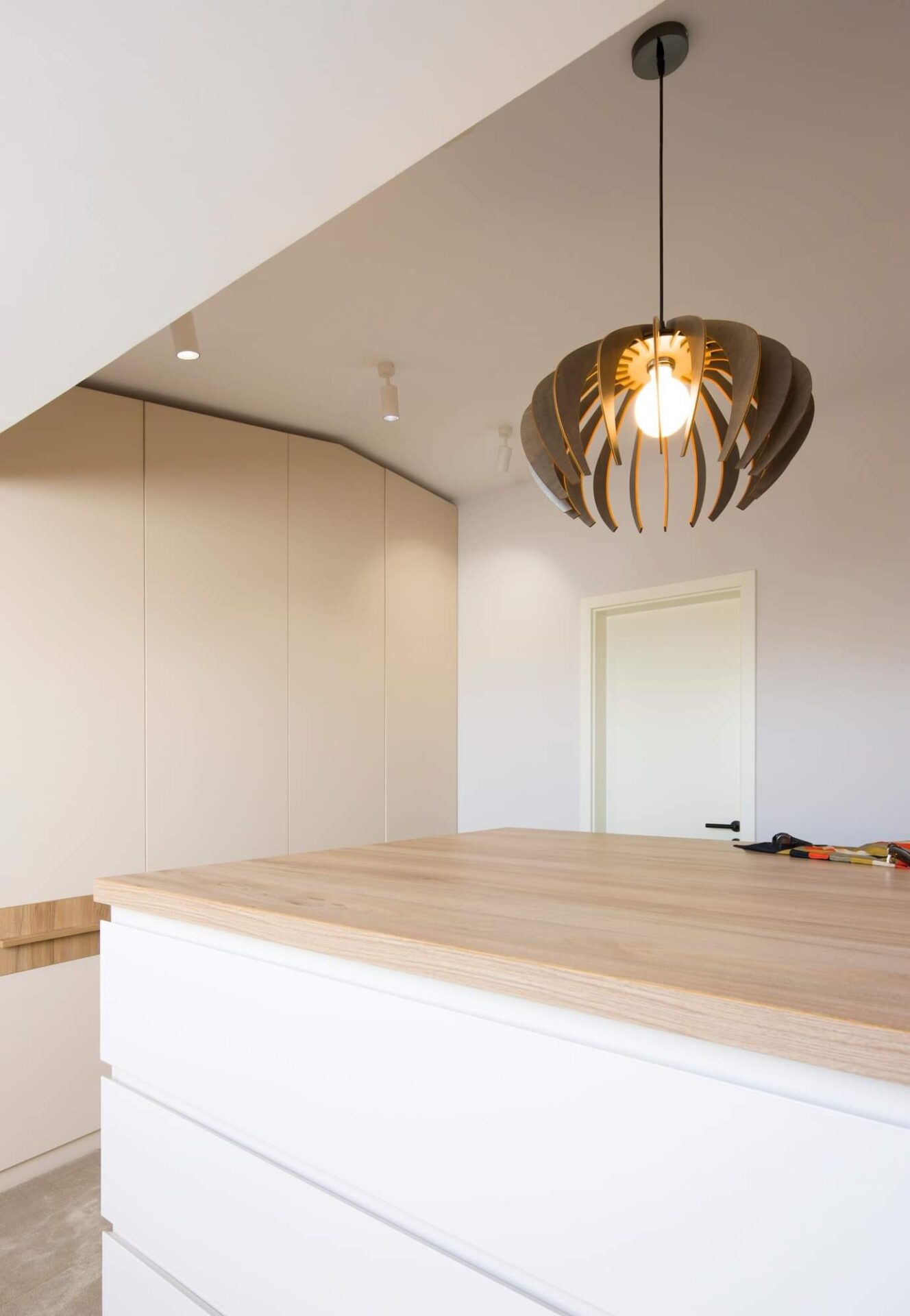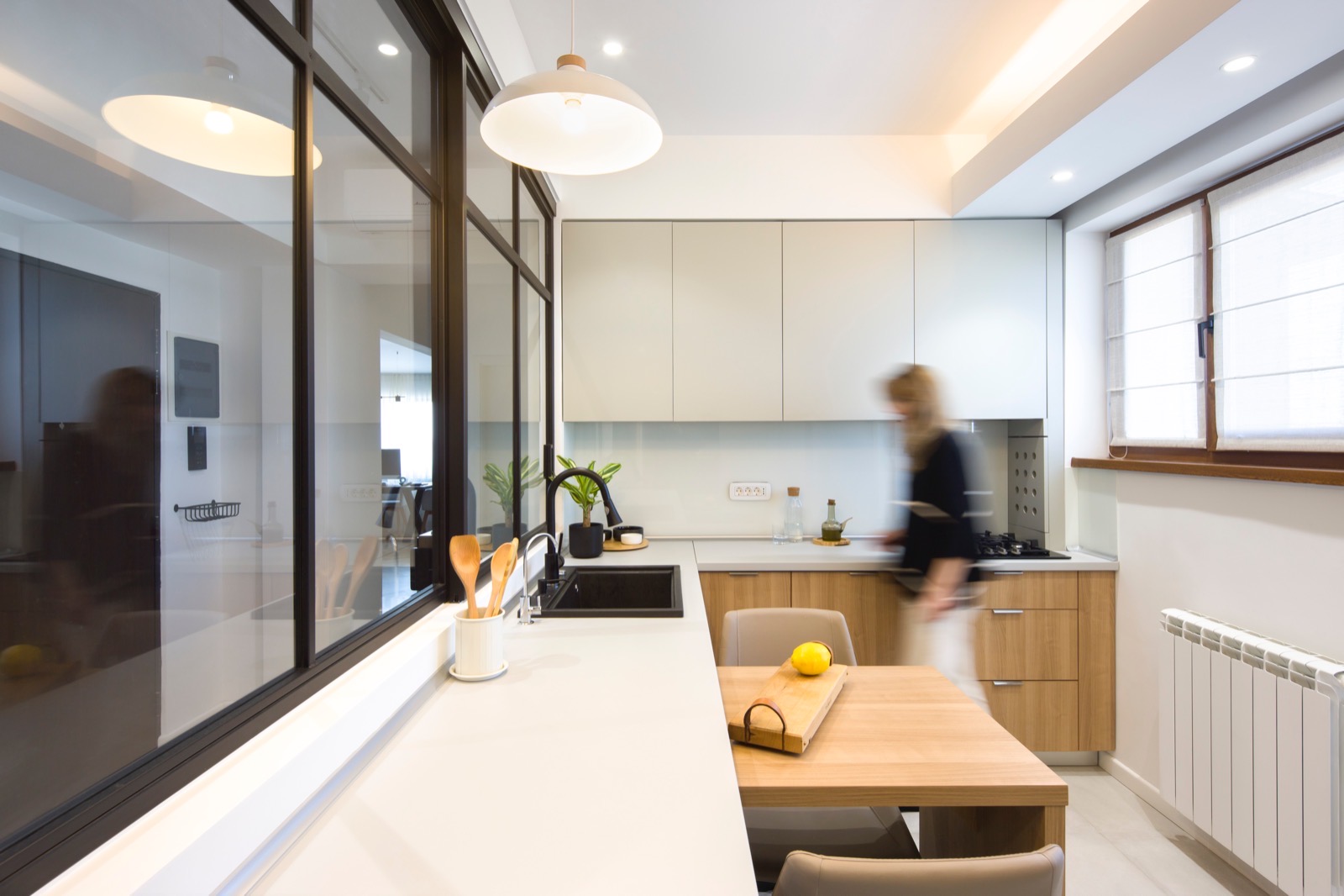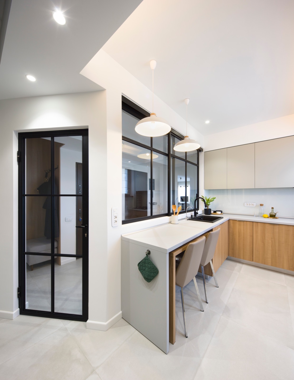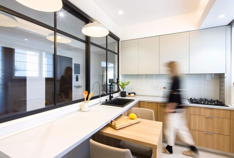 Cu fiecare ajustare, am reușit să aduc armonie într-un spațiu confuz. Unul dintre elementele cheie ale acestei transformări este trecerea subtilă între zonele de zi și de noapte. Spațiul de tranziție între zi și noapte este dressingul, locul unde te pregatești să începi o noua zi. Astfel funcțiunile apartamentului devin clare, nu se suprapun și au un flux firesc. Un alt element care a redefinit apartamentul este fereastra masivă care conectează bucătăria cu holul de intrare și aduce în interior lumina naturală. Astfel, granițele devin mai puțin evidente, iar spațiile devin parte a unei întregi unități armonioase. Ceea ce m-a impresionat cel mai mult în acest proiect este modul în care fiecare element contribuie la creația unei conexiuni fluide între spații. Casa nu mai este împărțită în compartimente separate, ci funcționează ca o singură entitate bine definită, în care fiecare detaliu are rolul său în povestea mai mare.