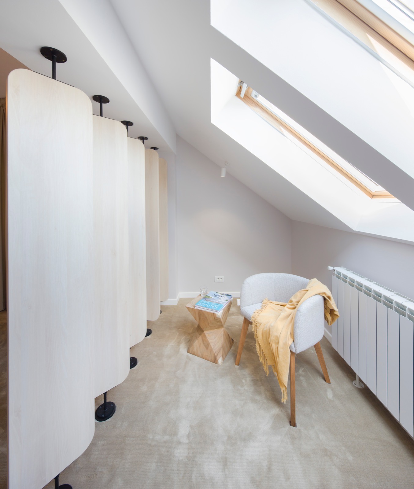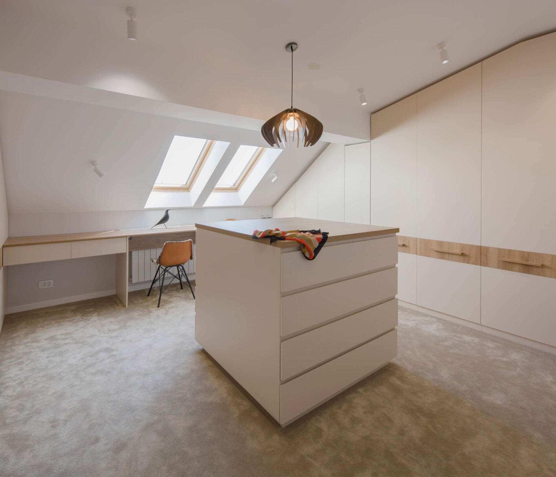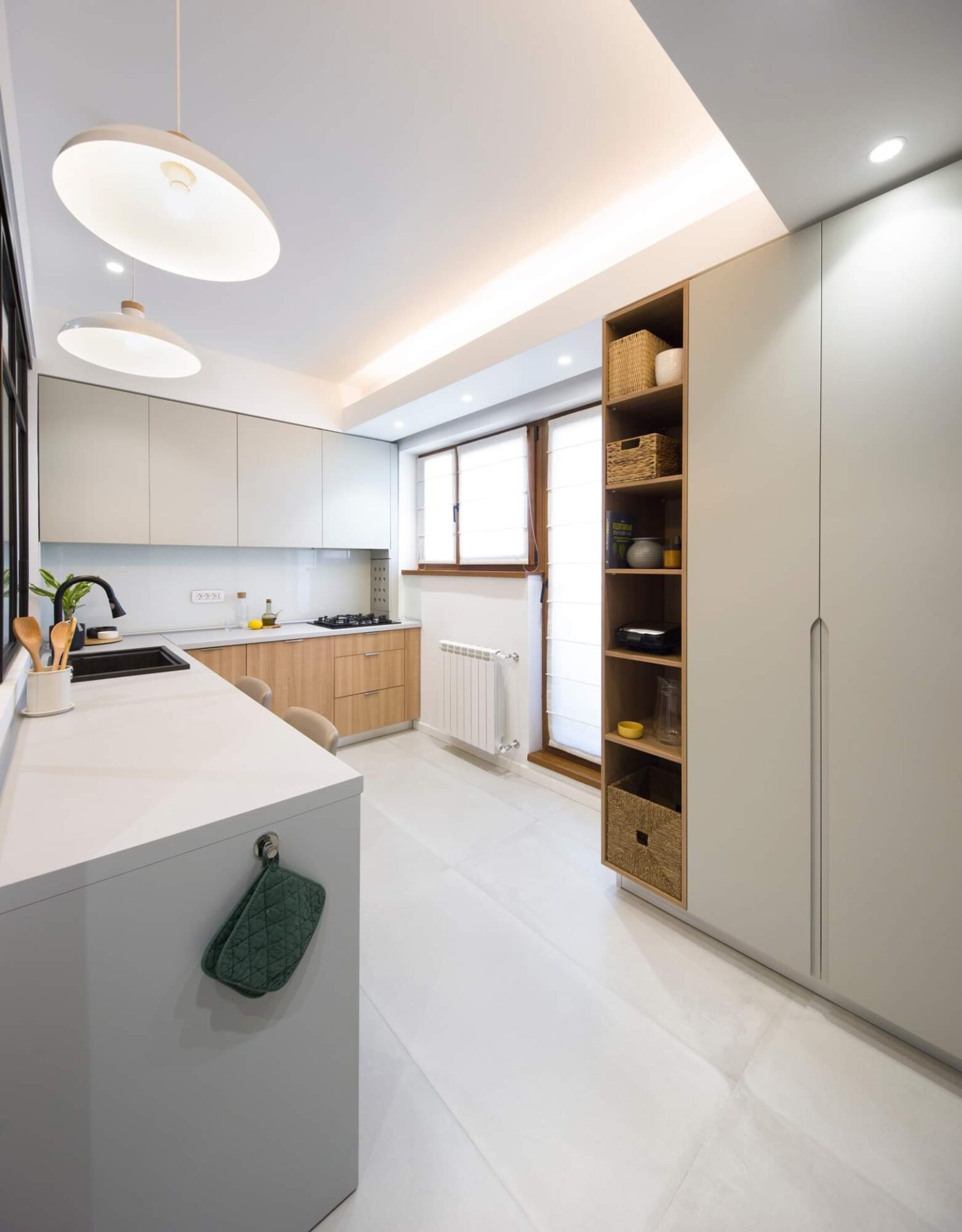 Cu fiecare ajustare, am reușit să aduc armonie într-un spațiu confuz. Unul dintre elementele cheie ale acestei transformări este trecerea subtilă între zonele de zi și de noapte. Spațiul de tranziție între zi și noapte este dressingul, locul unde te pregatești să începi o noua zi. Astfel funcțiunile apartamentului devin clare, nu se suprapun și au un flux firesc. Un alt element care a redefinit apartamentul este fereastra masivă care conectează bucătăria cu holul de intrare și aduce în interior lumina naturală. Astfel, granițele devin mai puțin evidente, iar spațiile devin parte a unei întregi unități armonioase. Ceea ce m-a impresionat cel mai mult în acest proiect este modul în care fiecare element contribuie la creația unei conexiuni fluide între spații. Casa nu mai este împărțită în compartimente separate, ci funcționează ca o singură entitate bine definită, în care fiecare detaliu are rolul său în povestea mai mare.
