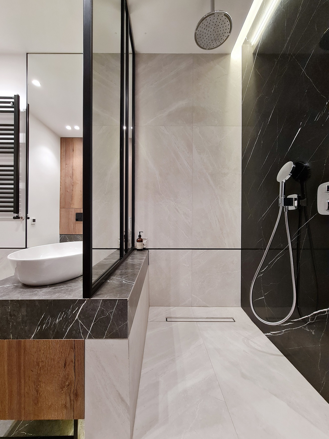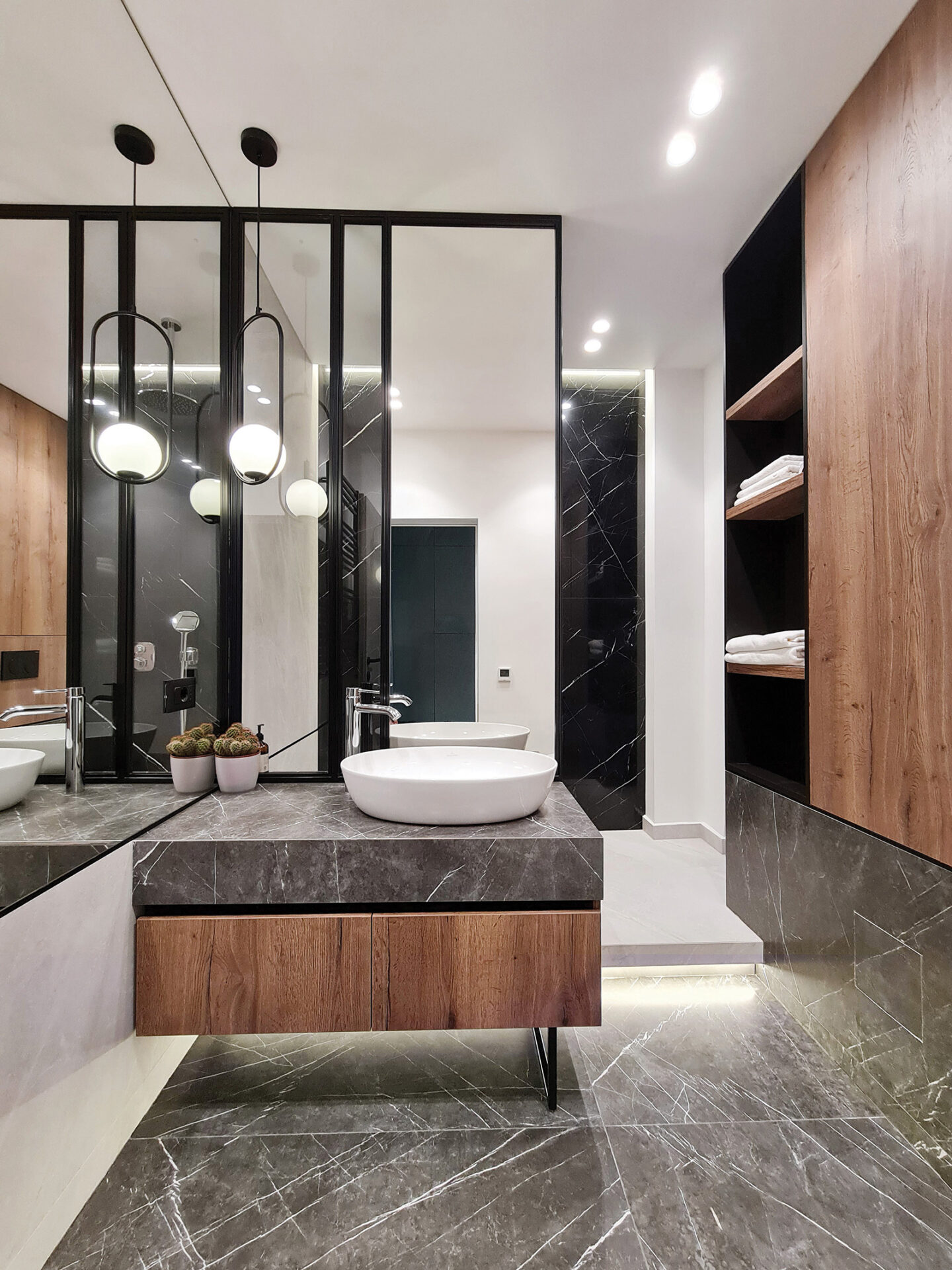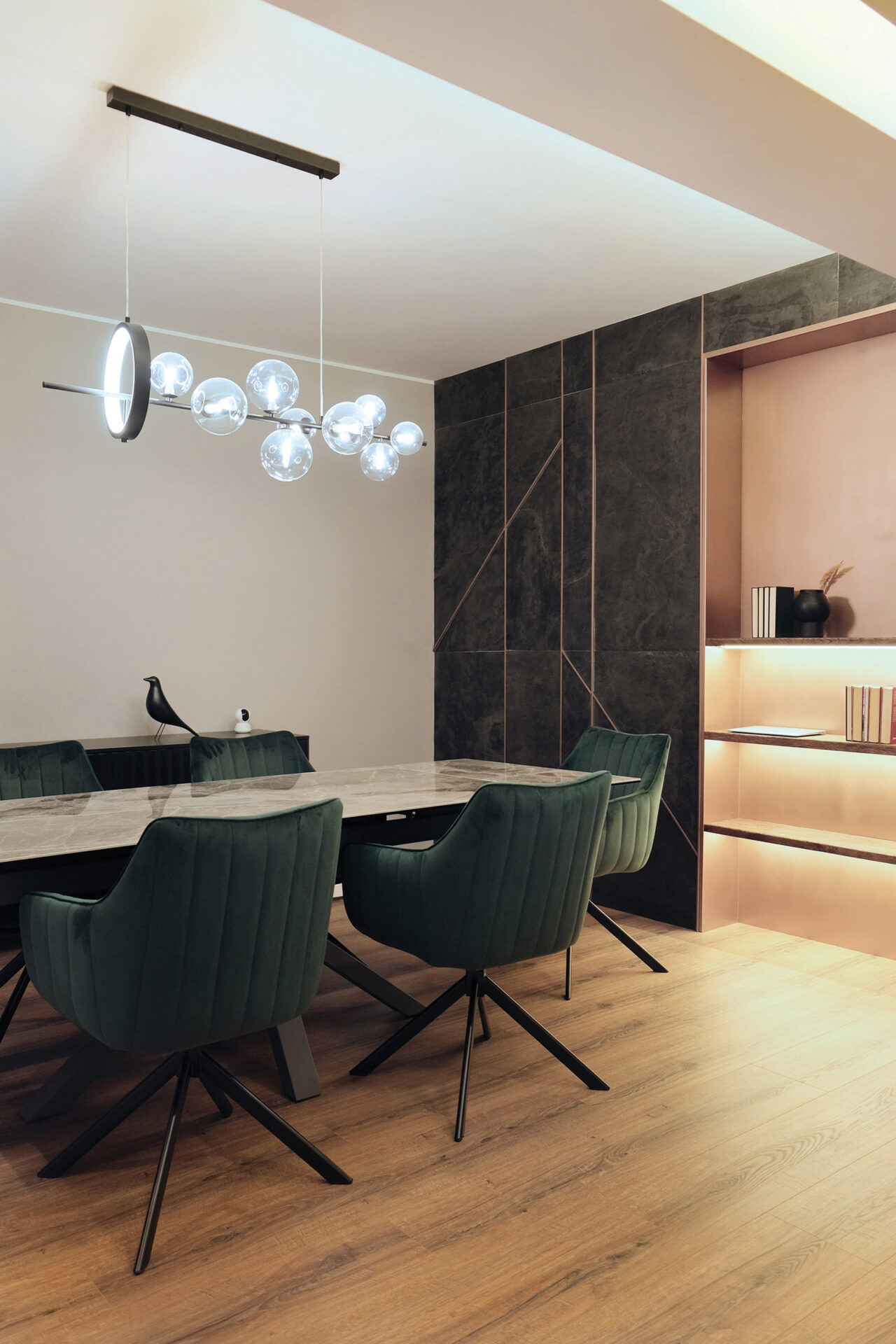 Beneficiarii și-au dorit un design de interior modern în culori nobile, punând accentul pe elemente de piatră naturală și lemn. Este o amenajare de la zero, vechiul spațiu fiind transformat complet prin reorganizarea compartimentărilor și înlocuirea tuturor finisajelor. Planul apartamentului a fost gândit cu o diferențiere clară între cele două zone, cea de zi și cea de noapte, fluid conectate printr-un hol generos, ce permite ample zone de depozitare. Zona de zi este formată dintr-un open-space cu living și dining conectat la spațiul bucătăriei. Zona de noapte este formată din două dormitoare, fiecare deservit de câte o baie. Considerând importantă conexiunea între bucătărie și restul elementelor din zona de zi – un nucleu care ține aproape membrii familiei – am deschis bucătăria printr-un glasvand larg către canapeaua generoasă. În vechea organizare locul de luat masa, deseori nefolosit, era interpus între bucătărie și living, căruia îi era alocat un spațiu restrâns și retras, creându-se astfel un blocaj în fluiditatea spațiului. Prin acest sistem de uși culisante de sticlă cu ramă metalică, bucătăria se poate conectata și deconecta subtil de zona de zi. Amenajarea este într-un stil contemporan smart luxury cu finisaje nobile și o cromatică îndrăzneață, combinând o varietate de elemente de piatră naturală în culori închise sau negru, lemn în nuanțe de brun tabacco, în armonie cu strălucirea delicată a cuprului și notele subtile de verde. Provocarea acestui proiect a fost reorganizarea băii master și crearea unui spațiu elegant, unde diferitele texturi și materiale folosite să îți confere acea stare de relaxare și confort ca într-un hotel. Au fost create multe elemente custom made de mobilier, dar mai ales diverse confecții metalice – placări de cupru, biblioteca inserată în mobilierul de depozitare din hol, cele două uși culisante care separă bucătăria de spațiul de zi, iar în cele două băi, elemente decor cu oglindă. Părerea beneficiarului „Ne-am dorit ca amenajarea apartamentului să reflecte gustul nostru – ne plac foarte mult culorile și materialele naturale puternic texturate. Așa că rezultatul arhitecților a fost exact cum ne-am așteptat, fiind creată o atmosferă elegantă, caldă, învăluită de multă lumină naturală pe timpul zilei și un spectacol deosebit din iluminarea artificială seara.” Sfatul arhitectului Un lucru esențial în amenajarea unei locuințe este relația de încredere dintre arhitect și beneficiar, bazată pe o comunicare permanentă, astfel încât la final rezultatul să fie conform așteptărilor.