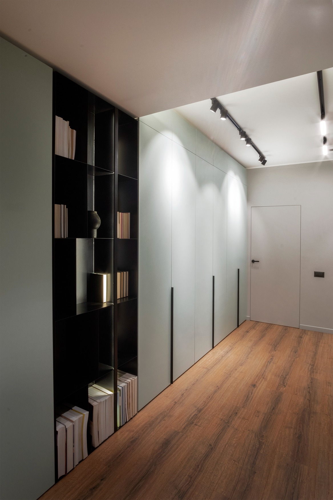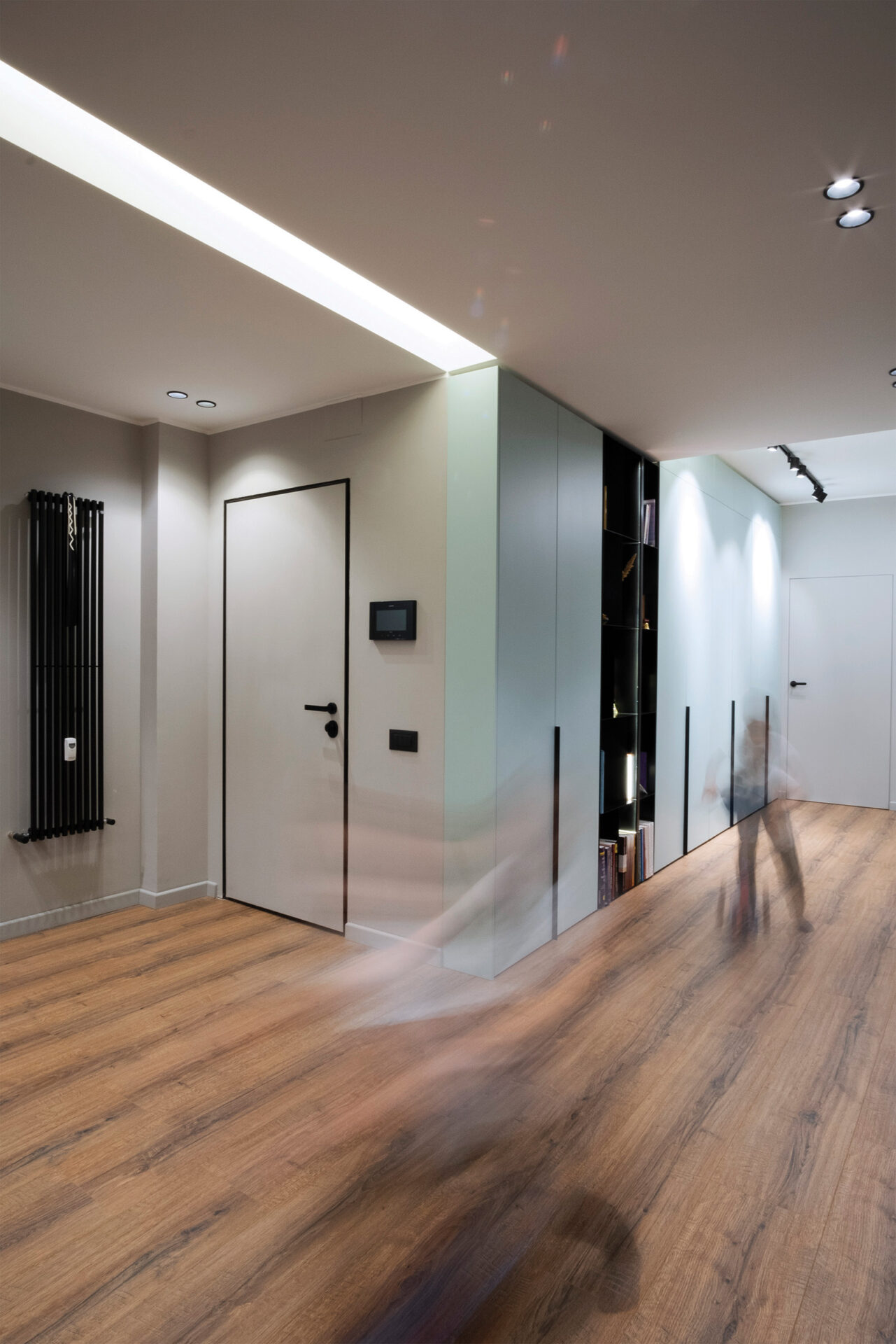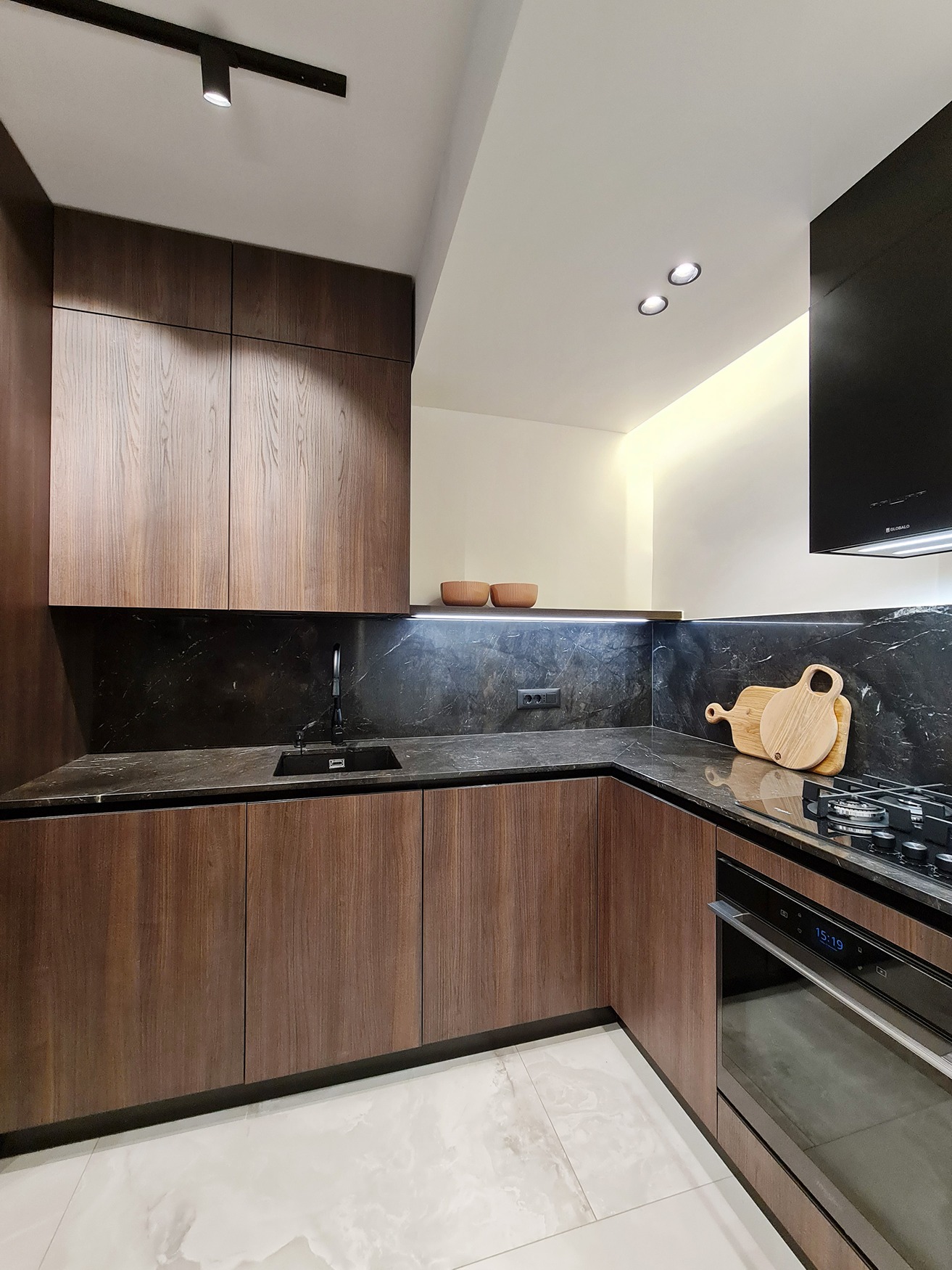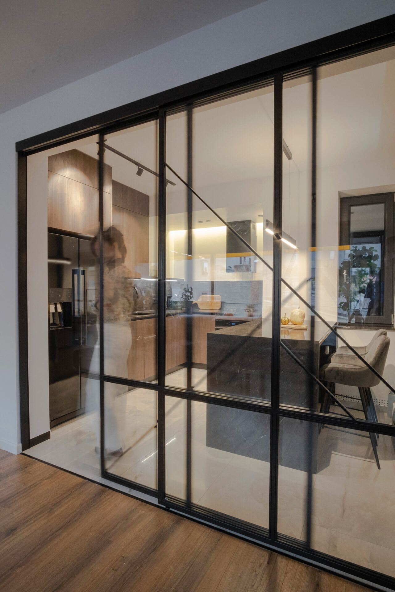 Beneficiarii și-au dorit un design de interior modern în culori nobile, punând accentul pe elemente de piatră naturală și lemn. Este o amenajare de la zero, vechiul spațiu fiind transformat complet prin reorganizarea compartimentărilor și înlocuirea tuturor finisajelor. Planul apartamentului a fost gândit cu o diferențiere clară între cele două zone, cea de zi și cea de noapte, fluid conectate printr-un hol generos, ce permite ample zone de depozitare. Zona de zi este formată dintr-un open-space cu living și dining conectat la spațiul bucătăriei. Zona de noapte este formată din două dormitoare, fiecare deservit de câte o baie. Considerând importantă conexiunea între bucătărie și restul elementelor din zona de zi – un nucleu care ține aproape membrii familiei – am deschis bucătăria printr-un glasvand larg către canapeaua generoasă. În vechea organizare locul de luat masa, deseori nefolosit, era interpus între bucătărie și living, căruia îi era alocat un spațiu restrâns și retras, creându-se astfel un blocaj în fluiditatea spațiului. Prin acest sistem de uși culisante de sticlă cu ramă metalică, bucătăria se poate conectata și deconecta subtil de zona de zi. Amenajarea este într-un stil contemporan smart luxury cu finisaje nobile și o cromatică îndrăzneață, combinând o varietate de elemente de piatră naturală în culori închise sau negru, lemn în nuanțe de brun tabacco, în armonie cu strălucirea delicată a cuprului și notele subtile de verde. Provocarea acestui proiect a fost reorganizarea băii master și crearea unui spațiu elegant, unde diferitele texturi și materiale folosite să îți confere acea stare de relaxare și confort ca într-un hotel. Au fost create multe elemente custom made de mobilier, dar mai ales diverse confecții metalice – placări de cupru, biblioteca inserată în mobilierul de depozitare din hol, cele două uși culisante care separă bucătăria de spațiul de zi, iar în cele două băi, elemente decor cu oglindă. Părerea beneficiarului „Ne-am dorit ca amenajarea apartamentului să reflecte gustul nostru – ne plac foarte mult culorile și materialele naturale puternic texturate. Așa că rezultatul arhitecților a fost exact cum ne-am așteptat, fiind creată o atmosferă elegantă, caldă, învăluită de multă lumină naturală pe timpul zilei și un spectacol deosebit din iluminarea artificială seara.” Sfatul arhitectului Un lucru esențial în amenajarea unei locuințe este relația de încredere dintre arhitect și beneficiar, bazată pe o comunicare permanentă, astfel încât la final rezultatul să fie conform așteptărilor.