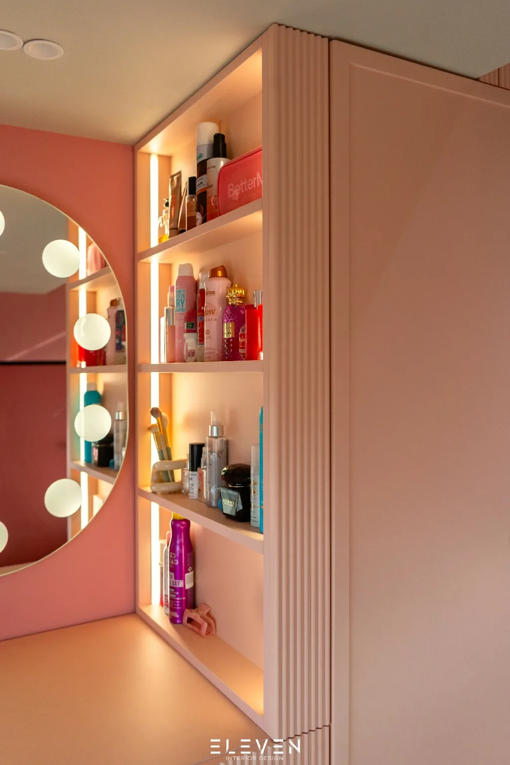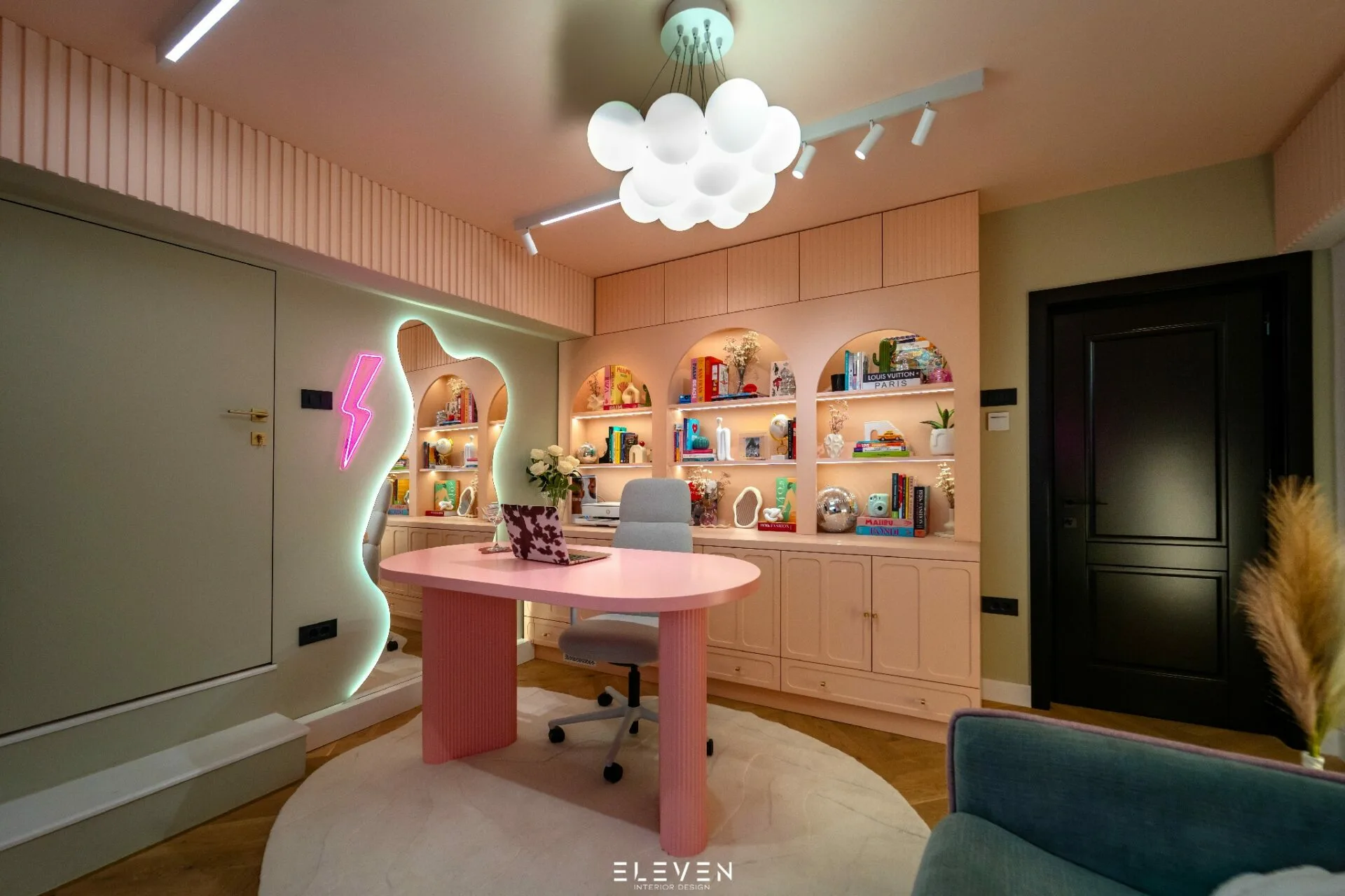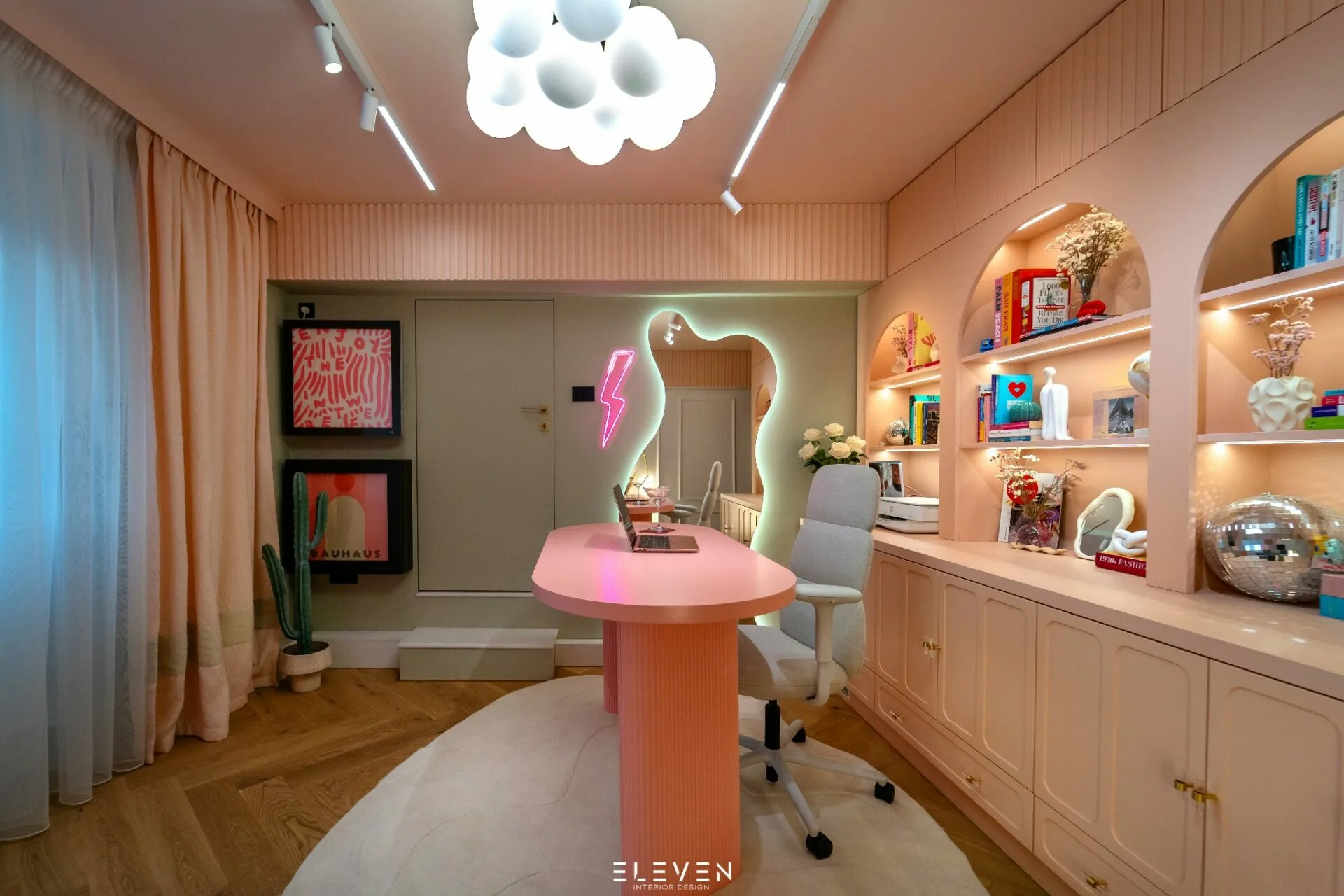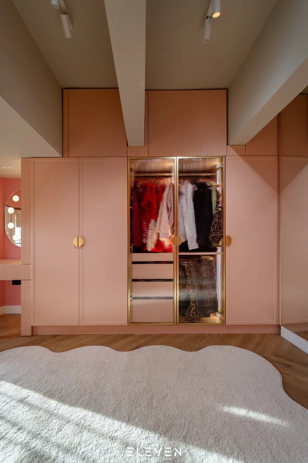 Proiectul Apartament C19 realizat de Eleven Interiors explorează relația dintre forme fluide, cromatică pastel și funcționalitate atent calibrată, construind un parcurs spațial coerent și echilibrat. Fiecare încăpere este gândită ca parte a unui ansamblu unitar, unde volumele nu sunt doar elemente de mobilier, ci componente arhitecturale care modelează spațiul. Dressingul este tratat ca element arhitectural. Ritmul vertical creat de frezarea verticala a fronturilor, materialele soft și accentele transparente creează profunzime vizuală, menținând în același timp o atmosferă calmă și aerisită. Funcționalitatea este atent integrată în limbajul estetic, fără a fragmenta vizual spațiul. Zona de make-up este integrată discret în ansamblu, cu rafturi iluminate și spații de depozitare ascunse, care păstrează suprafețele curate și ordonate, fără a compromite accesibilitatea.