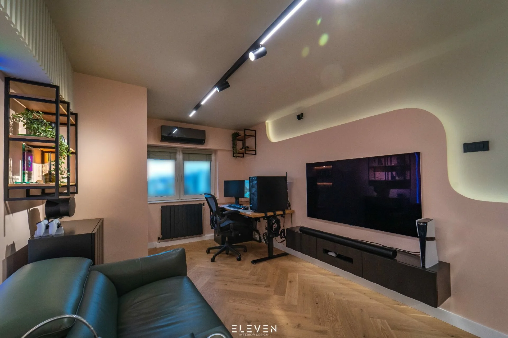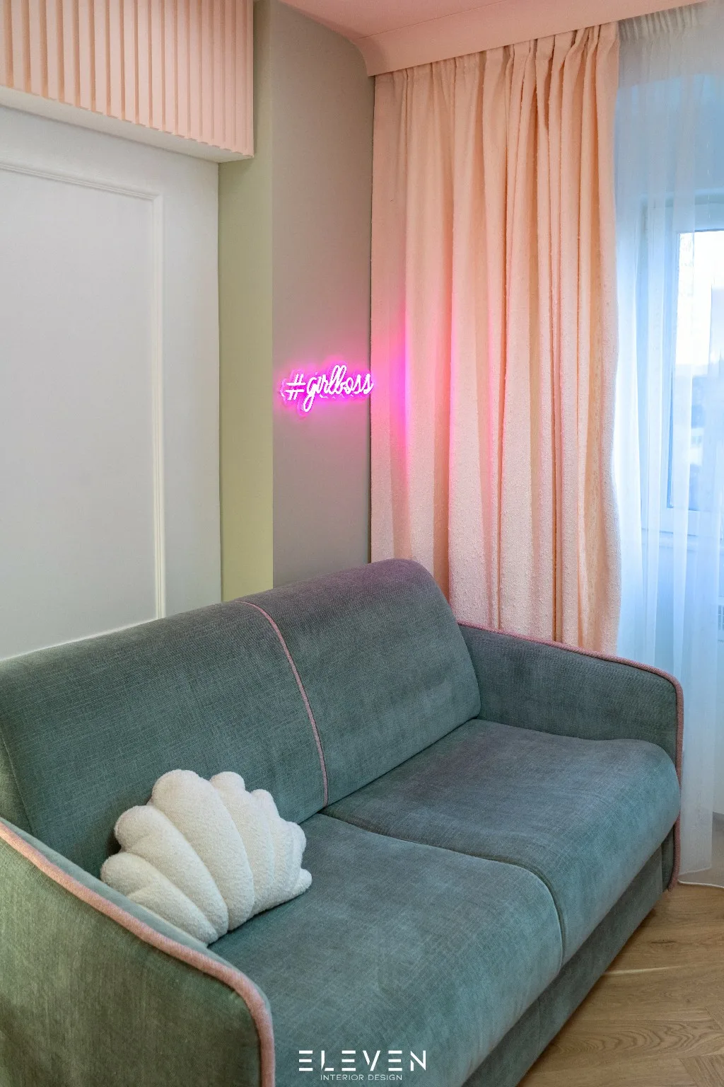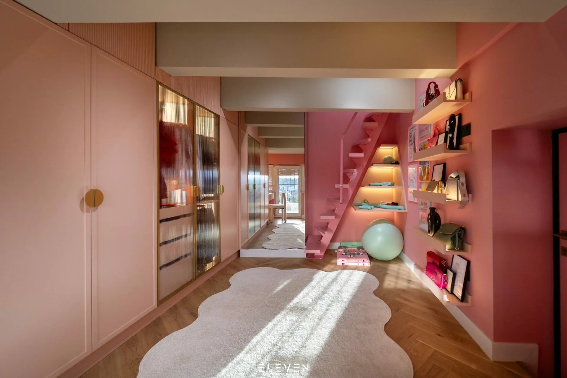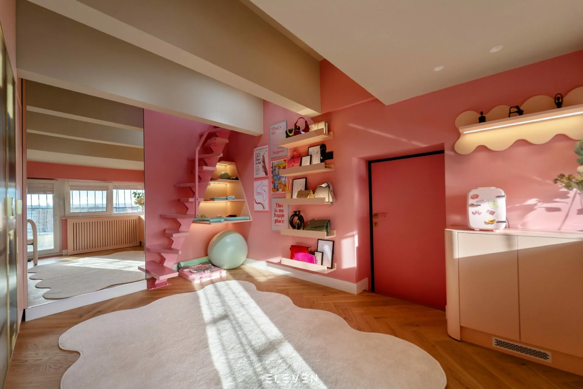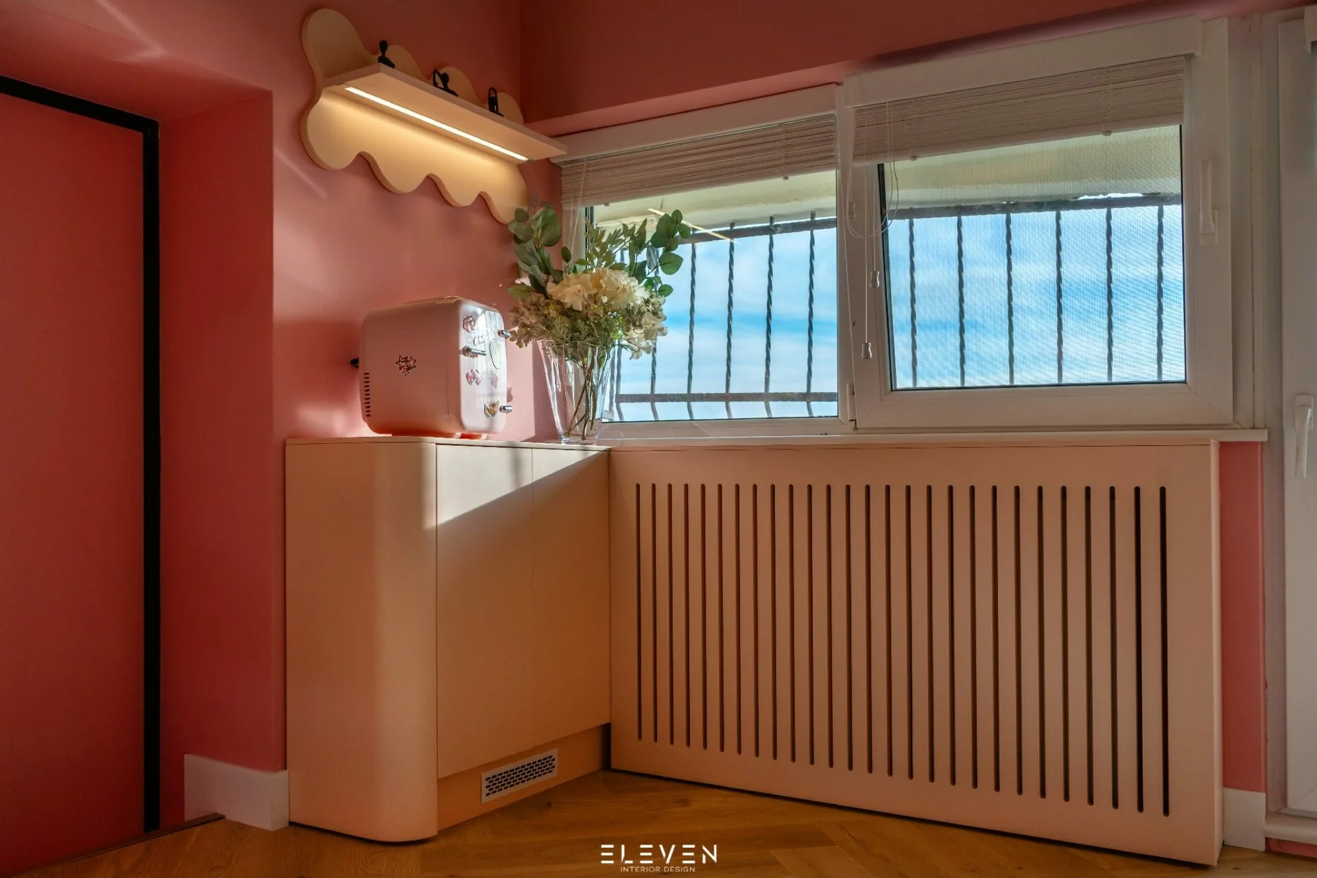 Proiectul Apartament C19 realizat de Eleven Interiors explorează relația dintre forme fluide, cromatică pastel și funcționalitate atent calibrată, construind un parcurs spațial coerent și echilibrat. Fiecare încăpere este gândită ca parte a unui ansamblu unitar, unde volumele nu sunt doar elemente de mobilier, ci componente arhitecturale care modelează spațiul. Dressingul este tratat ca element arhitectural. Ritmul vertical creat de frezarea verticala a fronturilor, materialele soft și accentele transparente creează profunzime vizuală, menținând în același timp o atmosferă calmă și aerisită. Funcționalitatea este atent integrată în limbajul estetic, fără a fragmenta vizual spațiul. Zona de make-up este integrată discret în ansamblu, cu rafturi iluminate și spații de depozitare ascunse, care păstrează suprafețele curate și ordonate, fără a compromite accesibilitatea.