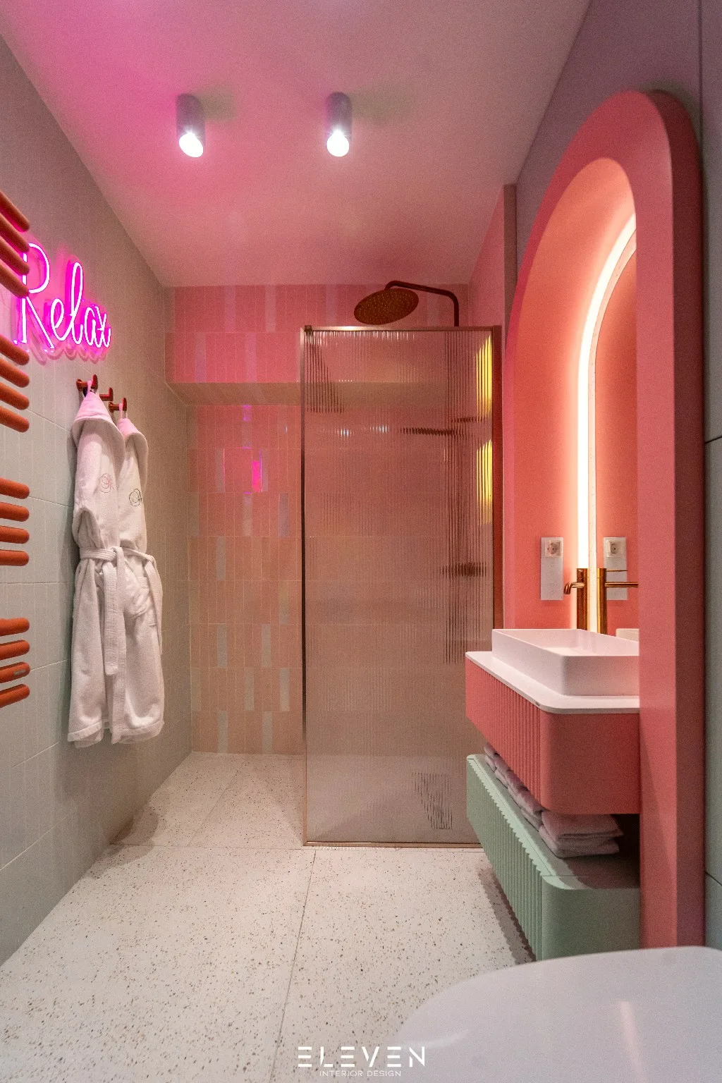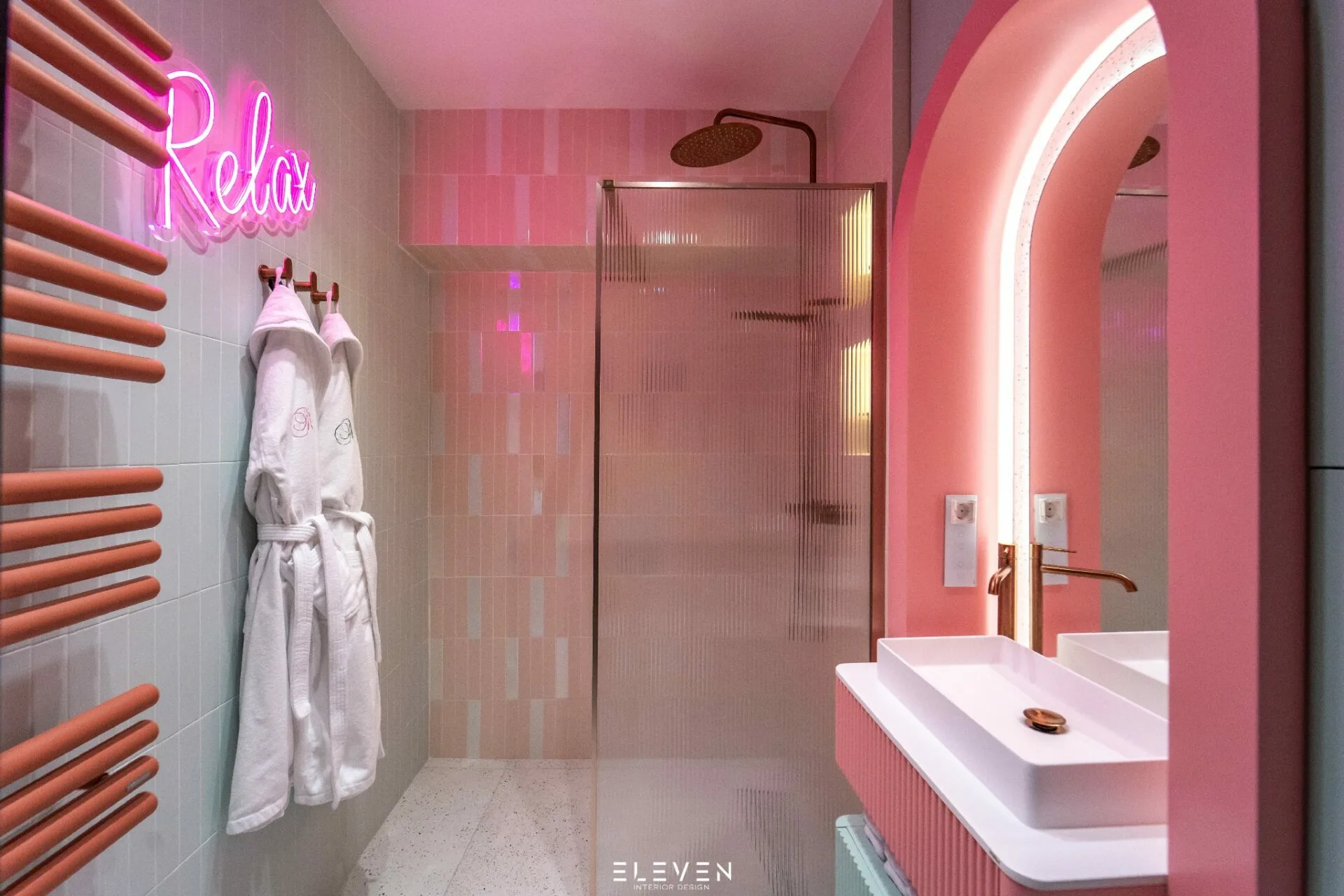 Baia este concepută ca un spațiu contemporan cu identitate puternică, unde contrastul dintre nuanțele pastel și finisajele grafice verticale creează ritm și profunzime vizuală. Placările ceramice dispuse pe verticală accentuează înălțimea încăperii și adaugă dinamism compoziției, în timp ce paleta cromatică caldă menține o atmosferă relaxantă și coerentă cu restul proiectului. Întregul proiect Apartament C19 reflectă o abordare în care estetica și utilizarea zilnică coexistă natural, construind un interior coerent, personalizat și atemporal.