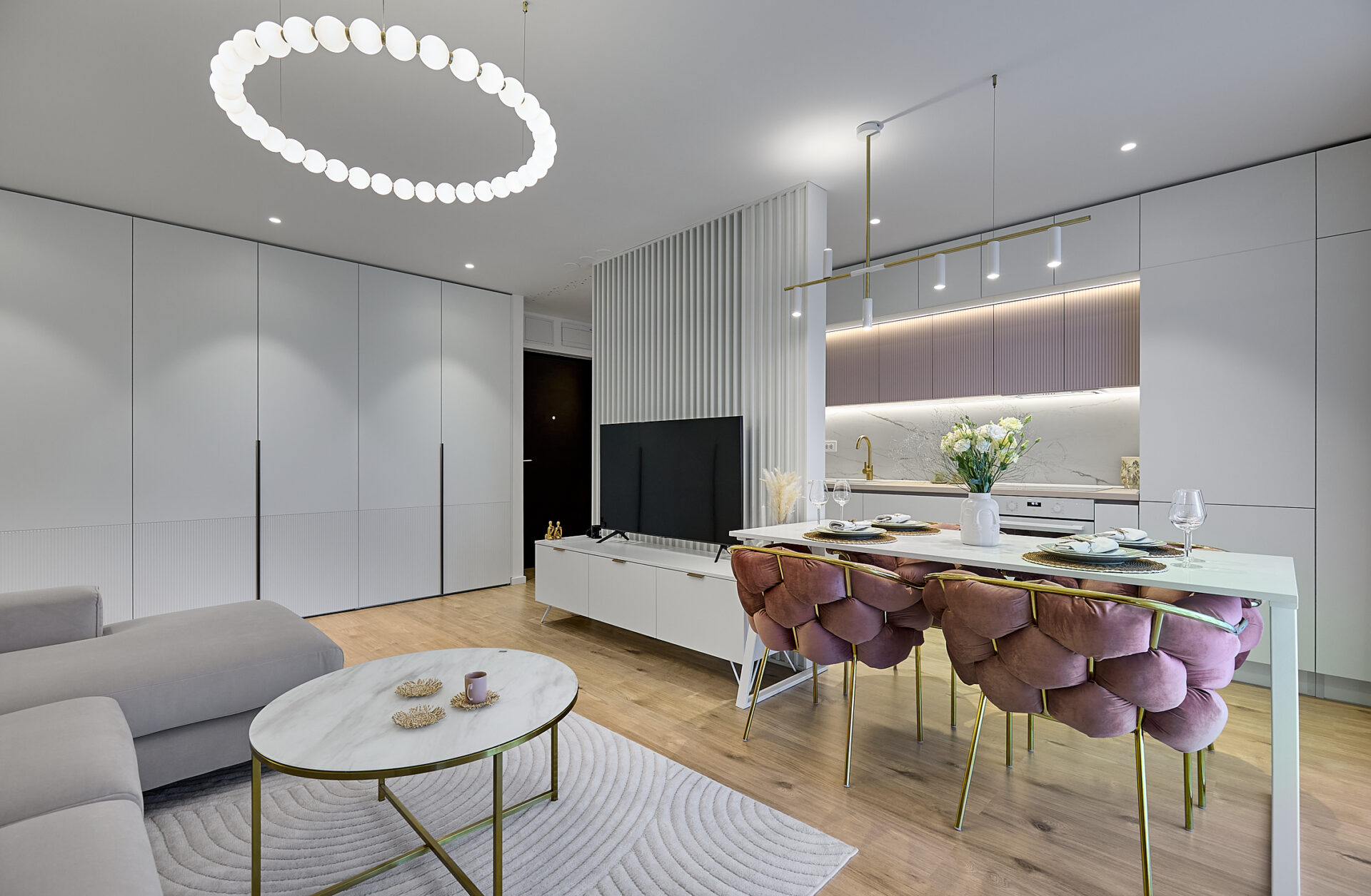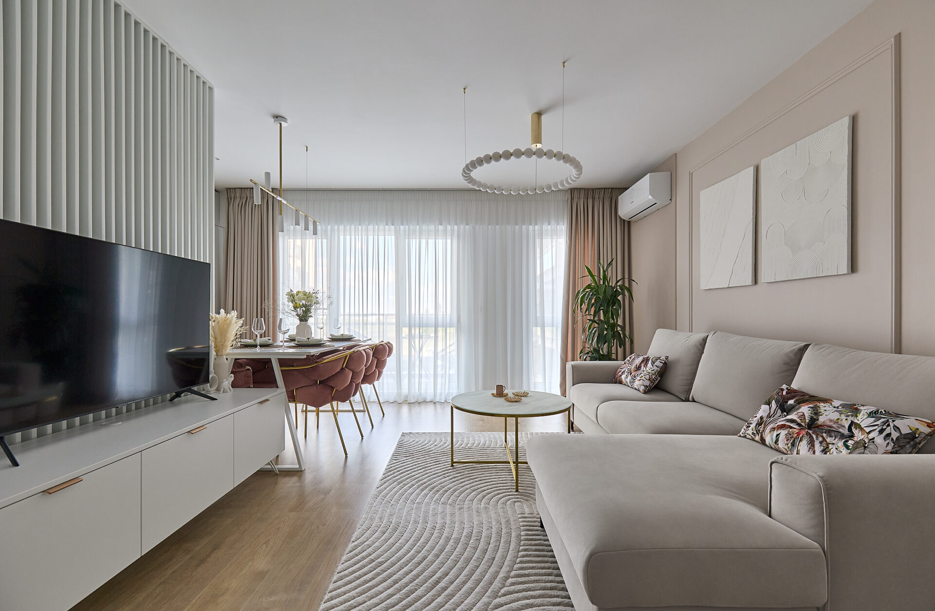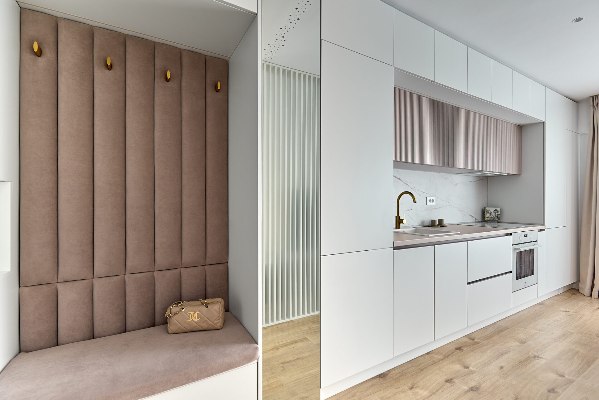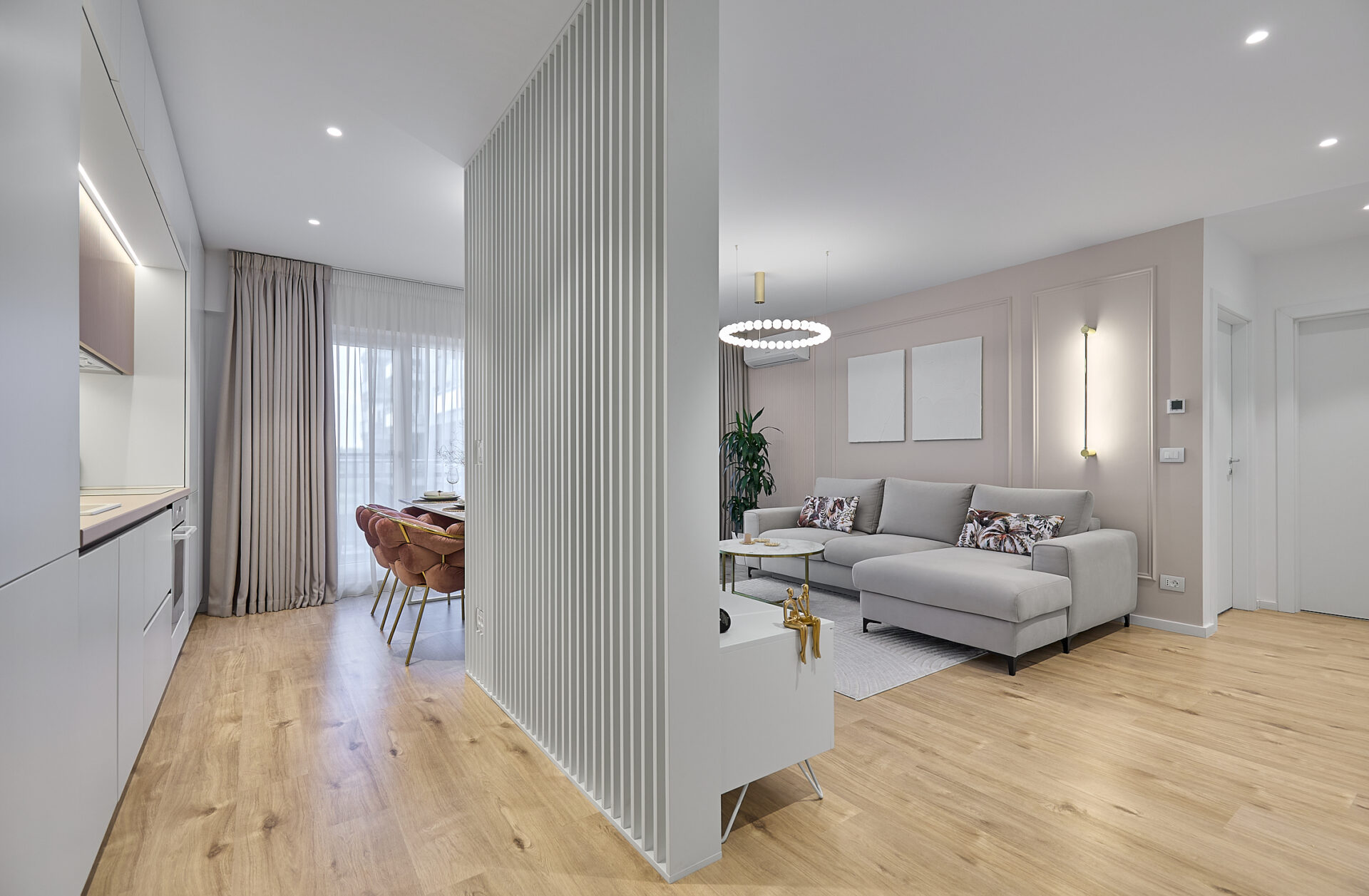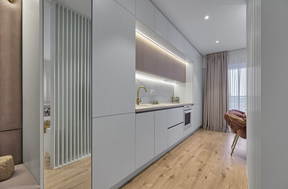 Aflat într-un complex rezidențial nou, apartamentul a fost preluat finisat, însă s-a refăcut complet în urma conceptului de design interior. Astfel, s-au înlocuit vechile finisaje, s-a refăcut instalația electrică în concordanță cu amenajarea propusă, întregul proces durând 4 luni de la proiectare și până la implementarea completă. Tânăra beneficiară și-a dorit un spațiu elegant, luminos, călduros, cu suficiente spații de depozitare și detalii care să iasă în evidență. Astfel, am propus un design modern, cu mici influențe glam pe alocuri, redate prin piesele mici de mobilier și inserțiile aurii regăsite și la corpurile de iluminat. Mobilierul a fost realizat pe comandă, adaptat dimensiunilor spațiului, cu fronturi din MDF vopsit mat. Pentru mai multă eleganță, s-a optat pentru fronturi frezate la bucătărie și dressing. Ca detalii, s-au completat armonios cu mânere de alamă periată, ce aduc un plus de rafinament și feminitate spațiului. Dormitorul se remarcă prin tablia patului, realizată pe comandă custom, conform proiectului. Materialul catifelat al tapițeriei, alături de profilele verticale aurii, conferă un aer cozy și impunător în același timp. Culorile calde, pastelate, alături de mici accente de culoare, precum rozul scaunelor de dining, redau o atmosferă liniștită și luminoasă întregii amenajări.