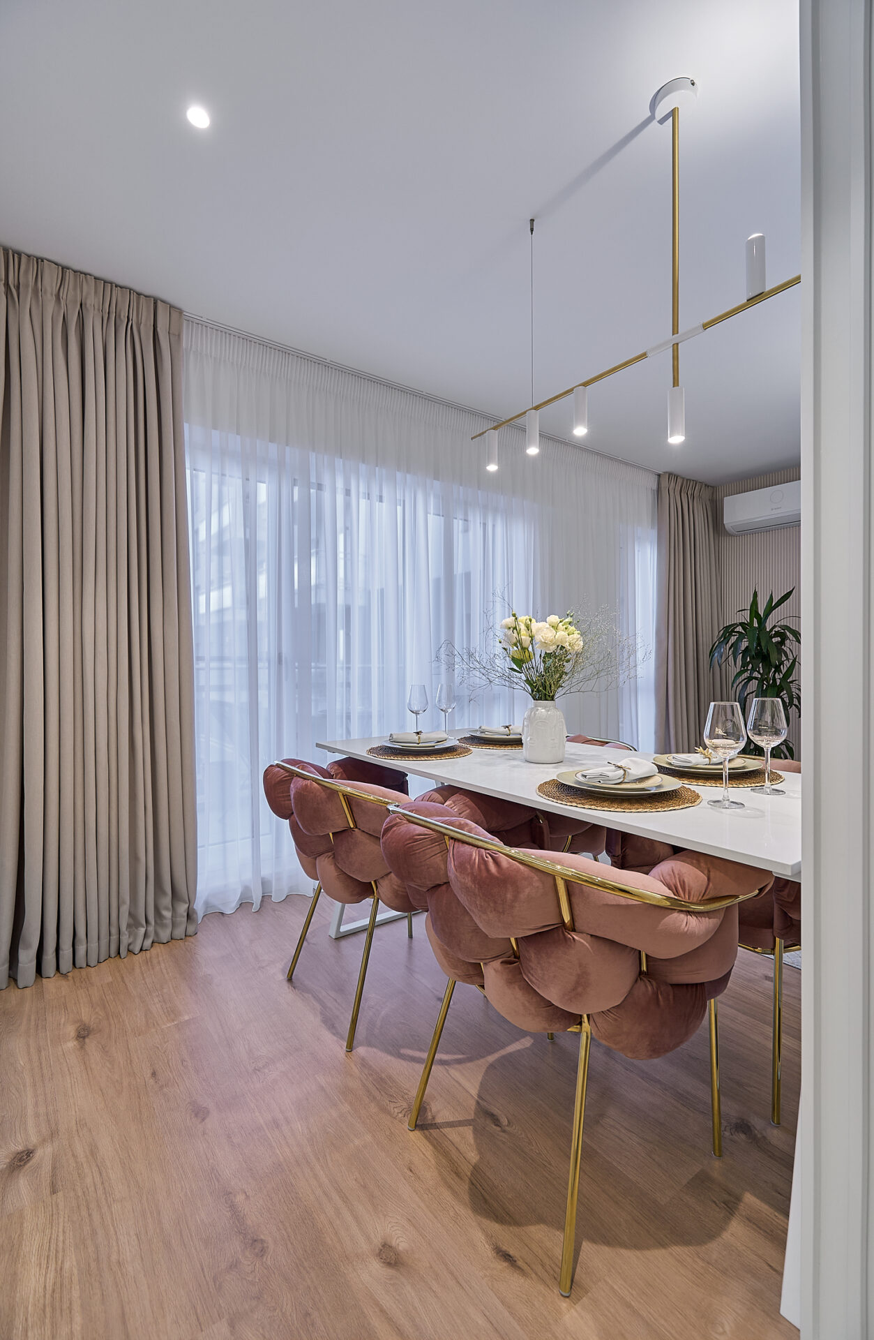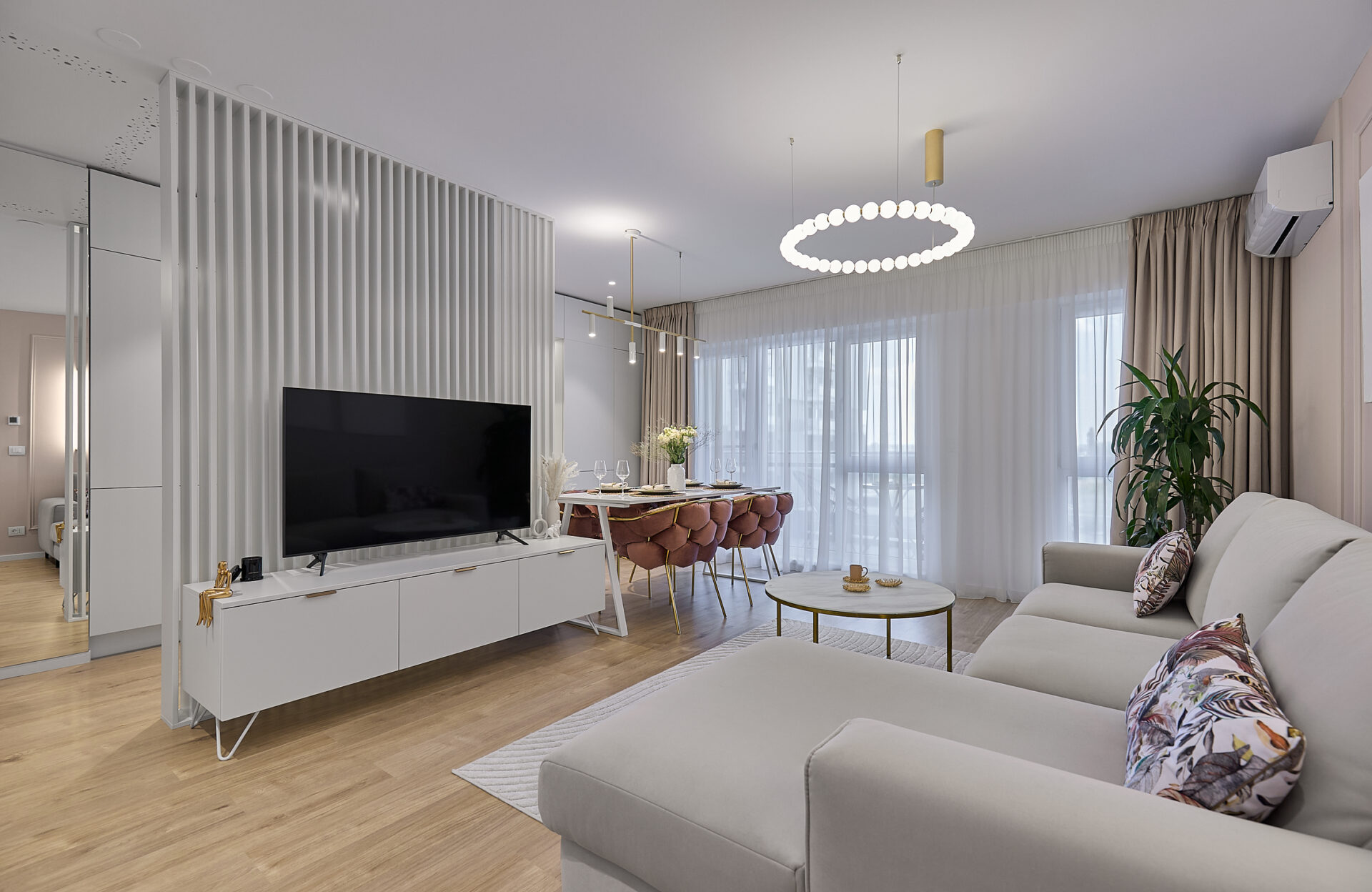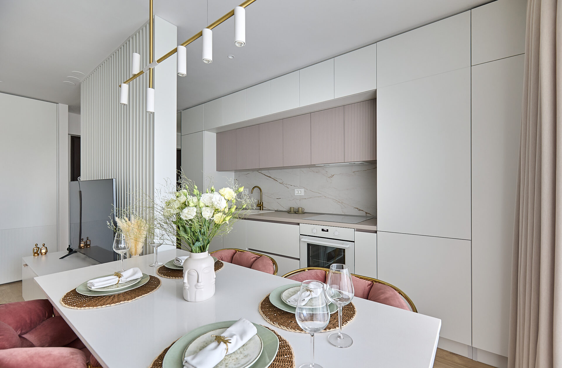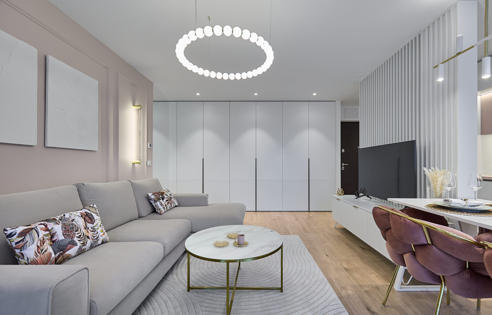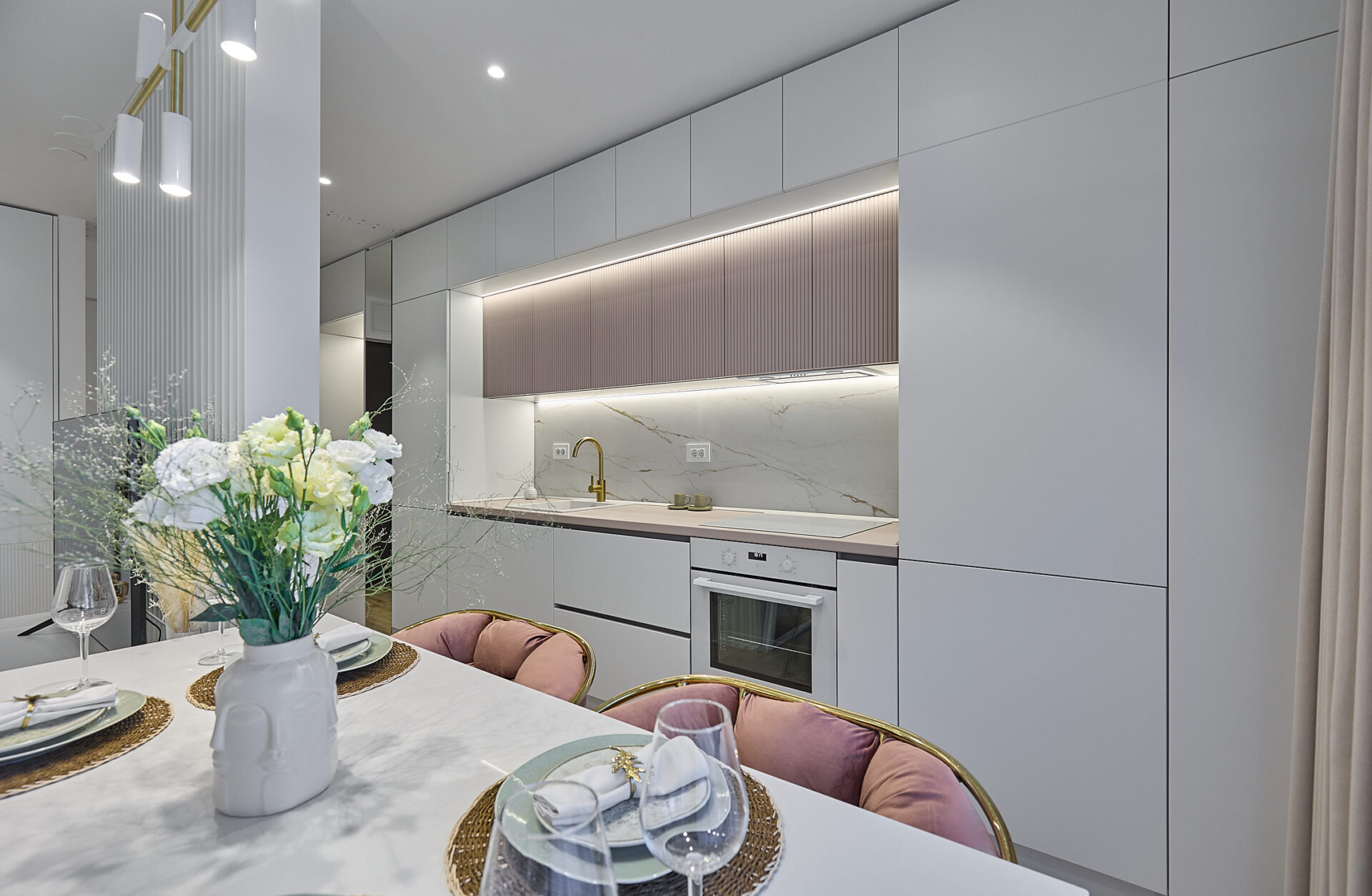 Aflat într-un complex rezidențial nou, apartamentul a fost preluat finisat, însă s-a refăcut complet în urma conceptului de design interior. Astfel, s-au înlocuit vechile finisaje, s-a refăcut instalația electrică în concordanță cu amenajarea propusă, întregul proces durând 4 luni de la proiectare și până la implementarea completă. Tânăra beneficiară și-a dorit un spațiu elegant, luminos, călduros, cu suficiente spații de depozitare și detalii care să iasă în evidență. Astfel, am propus un design modern, cu mici influențe glam pe alocuri, redate prin piesele mici de mobilier și inserțiile aurii regăsite și la corpurile de iluminat. Mobilierul a fost realizat pe comandă, adaptat dimensiunilor spațiului, cu fronturi din MDF vopsit mat. Pentru mai multă eleganță, s-a optat pentru fronturi frezate la bucătărie și dressing. Ca detalii, s-au completat armonios cu mânere de alamă periată, ce aduc un plus de rafinament și feminitate spațiului. Dormitorul se remarcă prin tablia patului, realizată pe comandă custom, conform proiectului. Materialul catifelat al tapițeriei, alături de profilele verticale aurii, conferă un aer cozy și impunător în același timp. Culorile calde, pastelate, alături de mici accente de culoare, precum rozul scaunelor de dining, redau o atmosferă liniștită și luminoasă întregii amenajări.