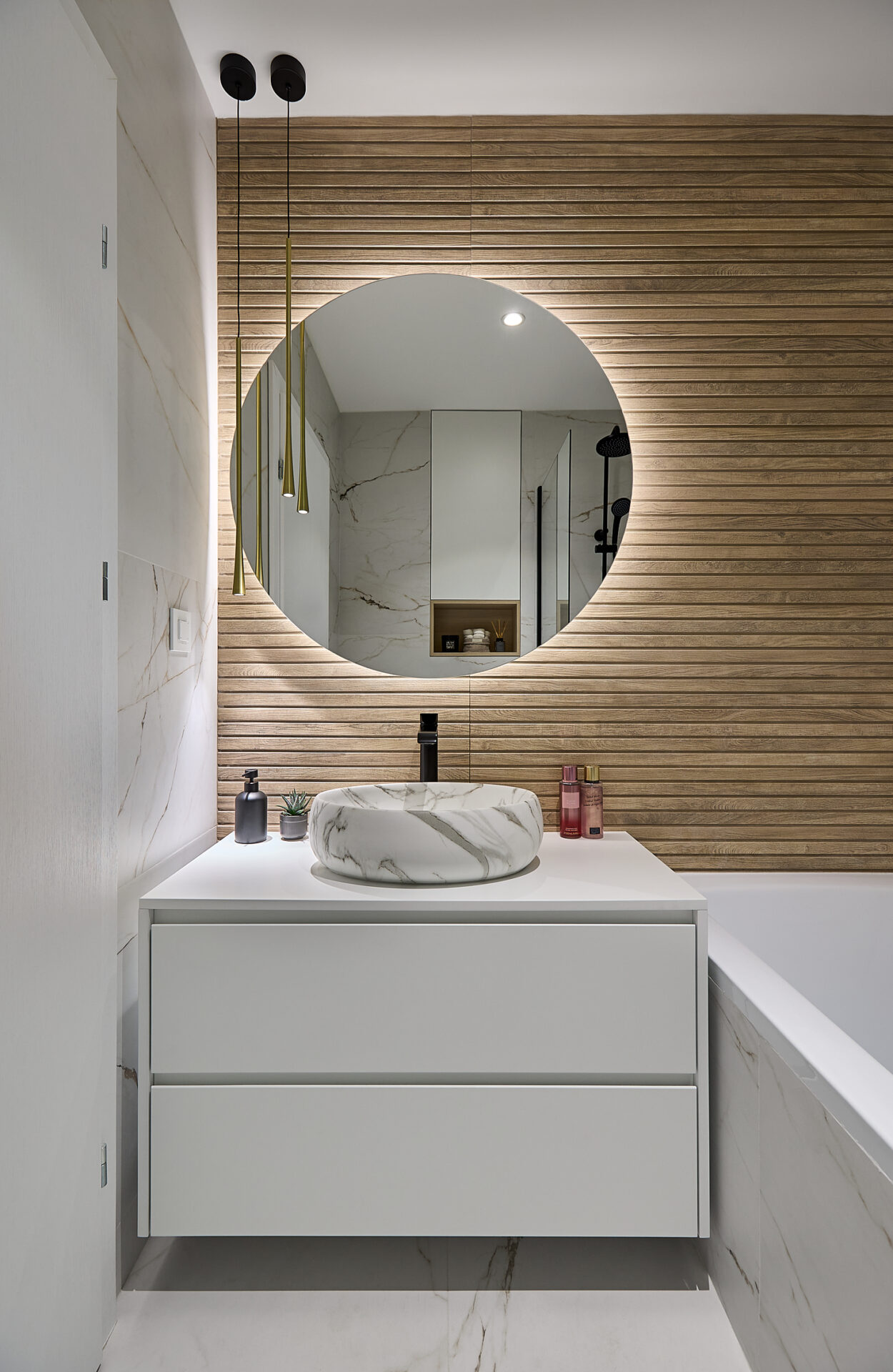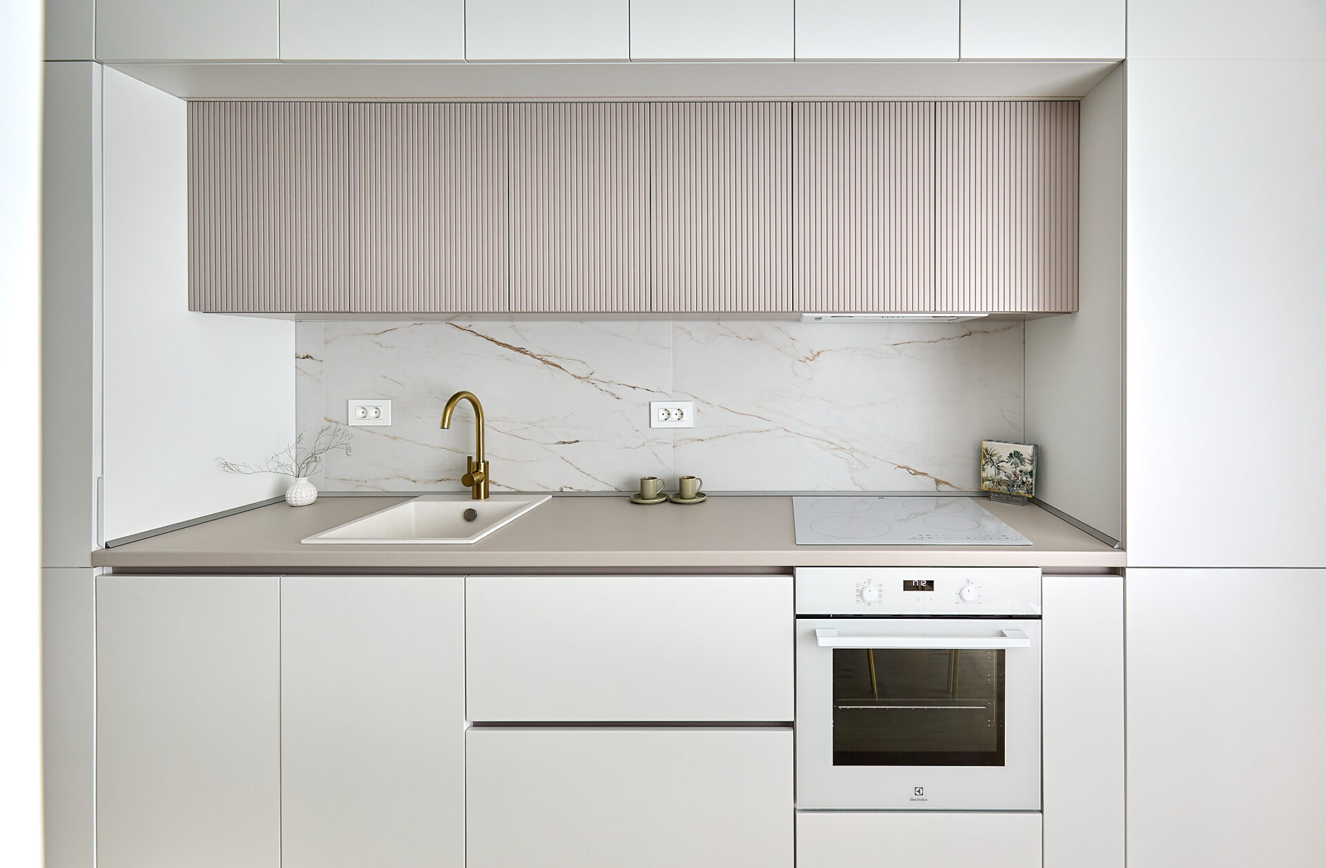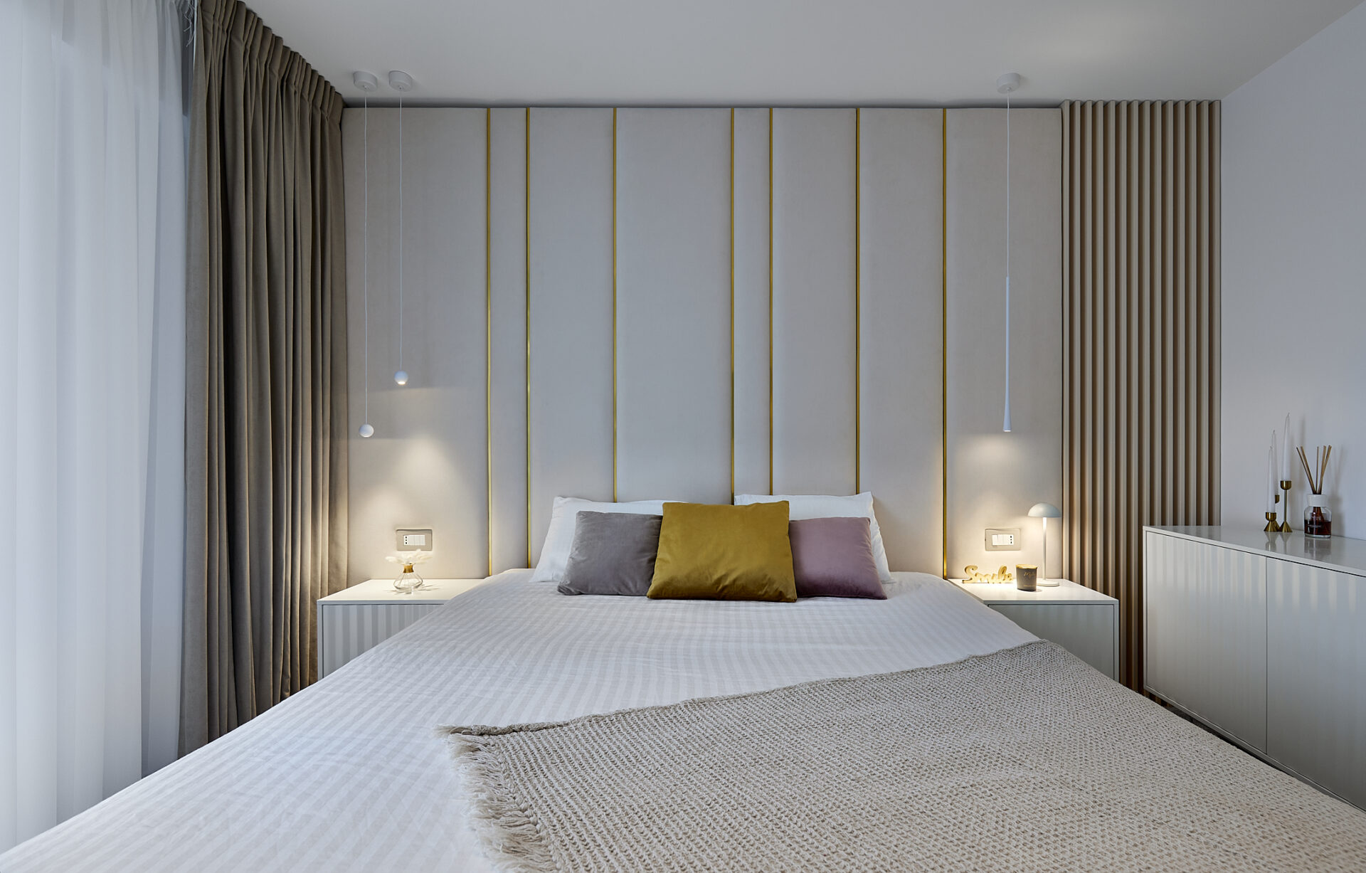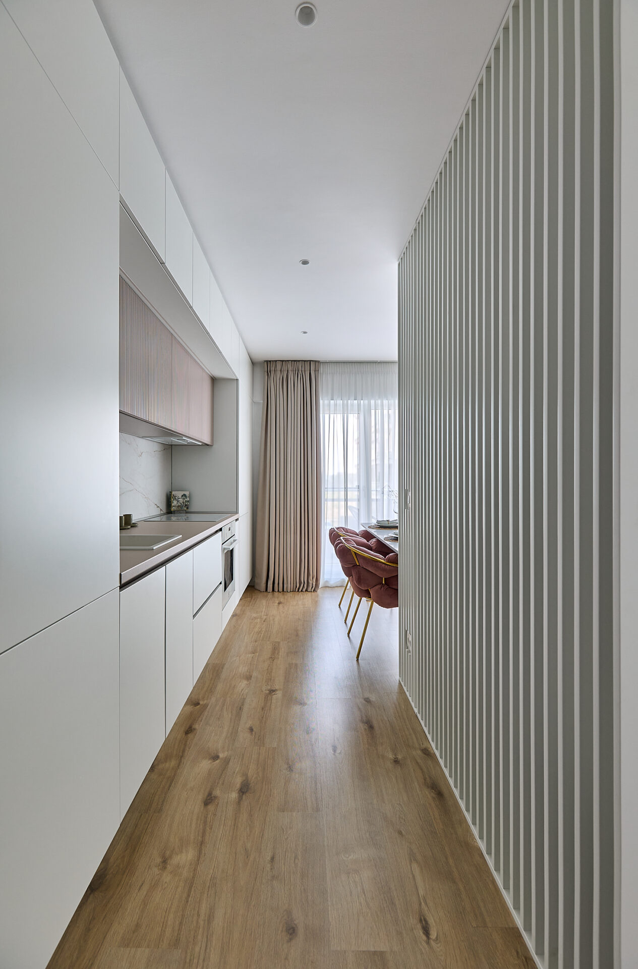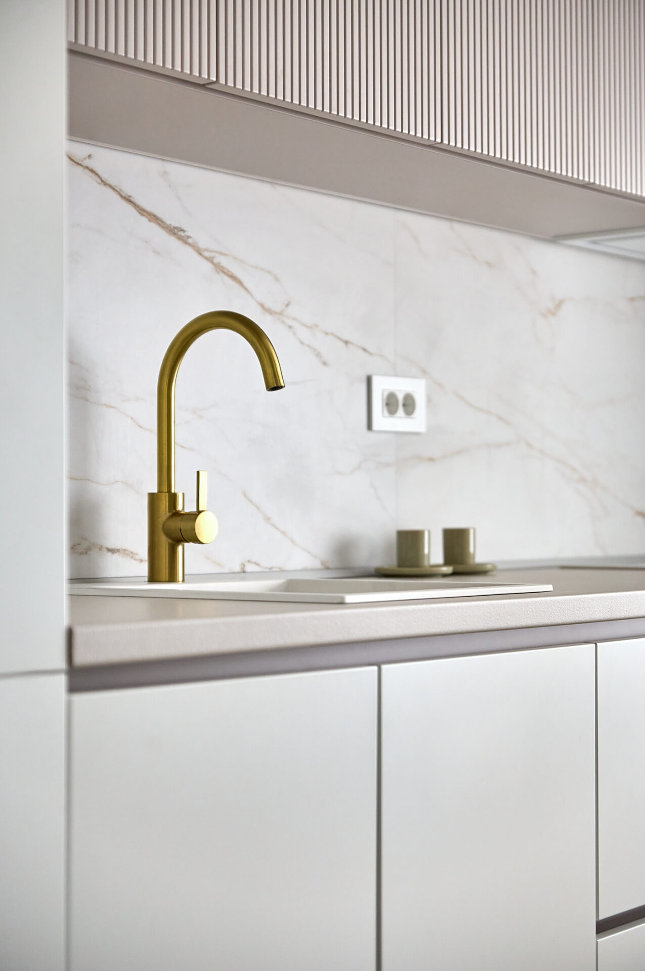 Aflat într-un complex rezidențial nou, apartamentul a fost preluat finisat, însă s-a refăcut complet în urma conceptului de design interior. Astfel, s-au înlocuit vechile finisaje, s-a refăcut instalația electrică în concordanță cu amenajarea propusă, întregul proces durând 4 luni de la proiectare și până la implementarea completă. Tânăra beneficiară și-a dorit un spațiu elegant, luminos, călduros, cu suficiente spații de depozitare și detalii care să iasă în evidență. Astfel, am propus un design modern, cu mici influențe glam pe alocuri, redate prin piesele mici de mobilier și inserțiile aurii regăsite și la corpurile de iluminat. Mobilierul a fost realizat pe comandă, adaptat dimensiunilor spațiului, cu fronturi din MDF vopsit mat. Pentru mai multă eleganță, s-a optat pentru fronturi frezate la bucătărie și dressing. Ca detalii, s-au completat armonios cu mânere de alamă periată, ce aduc un plus de rafinament și feminitate spațiului. Dormitorul se remarcă prin tablia patului, realizată pe comandă custom, conform proiectului. Materialul catifelat al tapițeriei, alături de profilele verticale aurii, conferă un aer cozy și impunător în același timp. Culorile calde, pastelate, alături de mici accente de culoare, precum rozul scaunelor de dining, redau o atmosferă liniștită și luminoasă întregii amenajări.