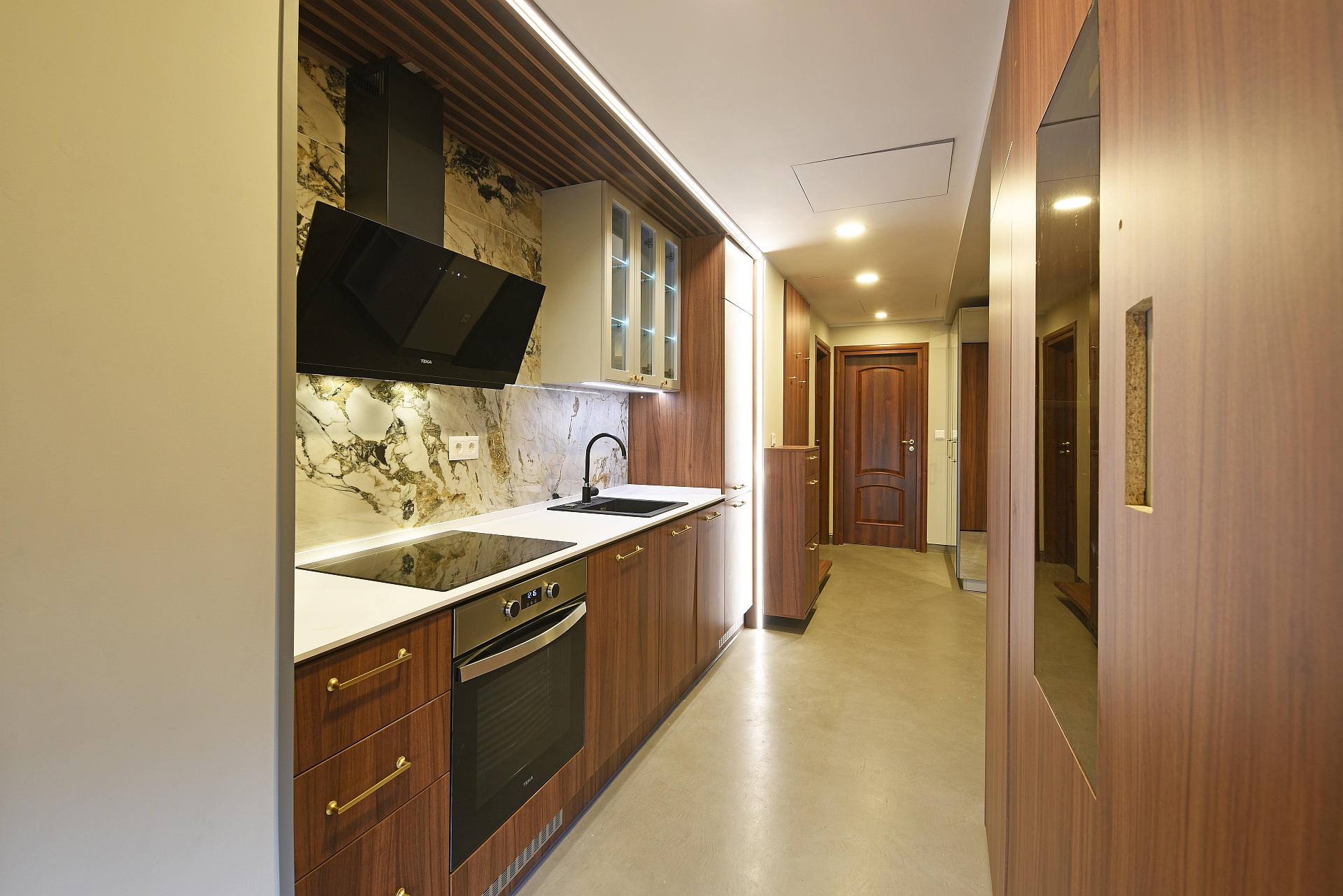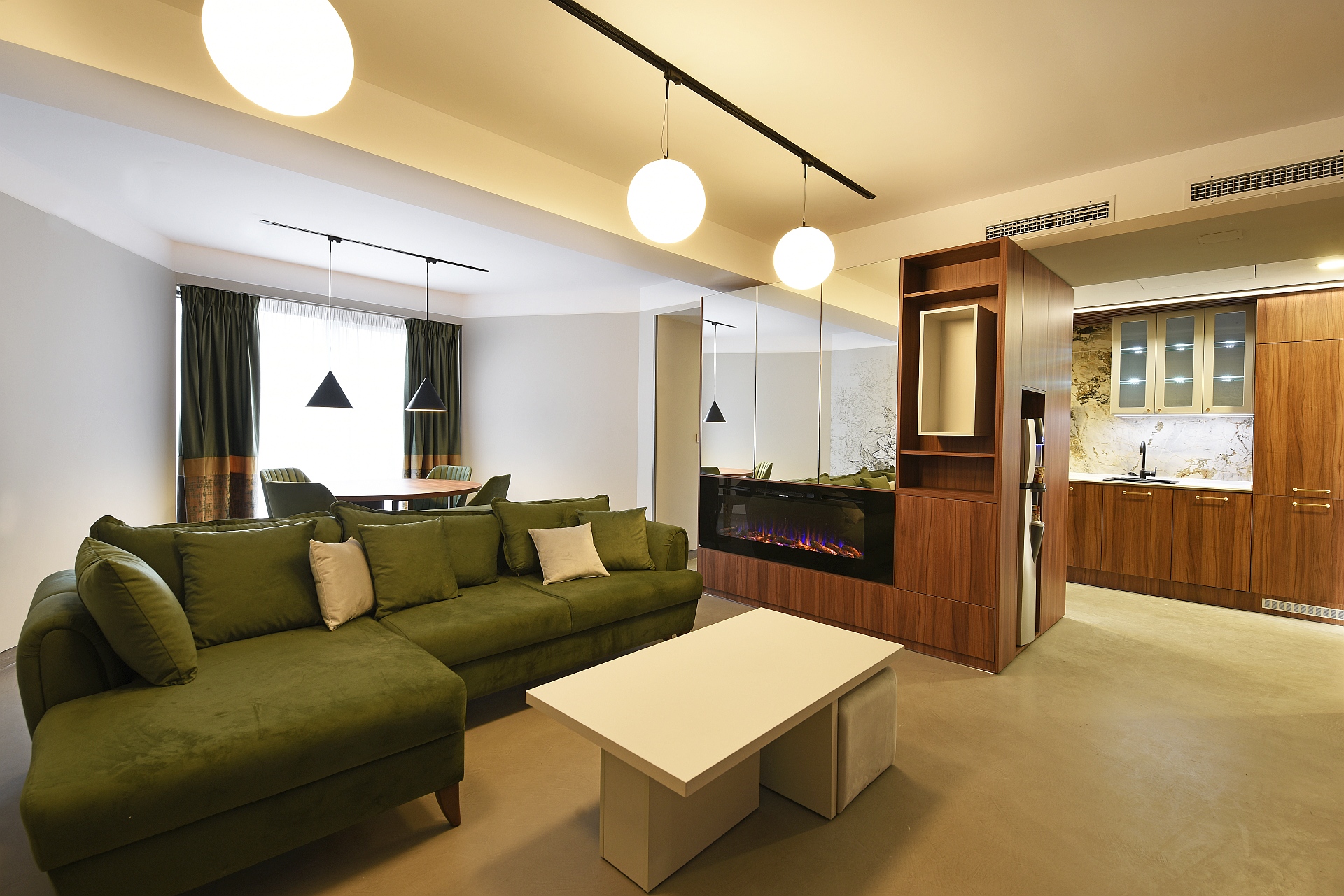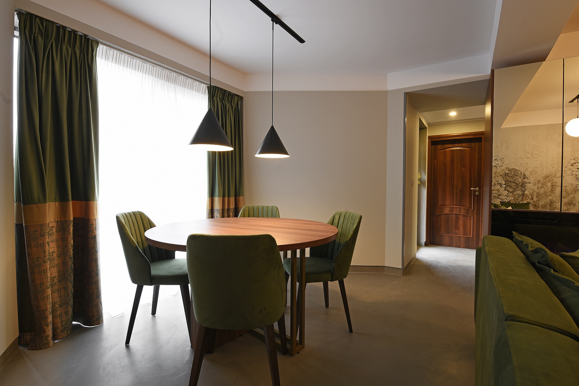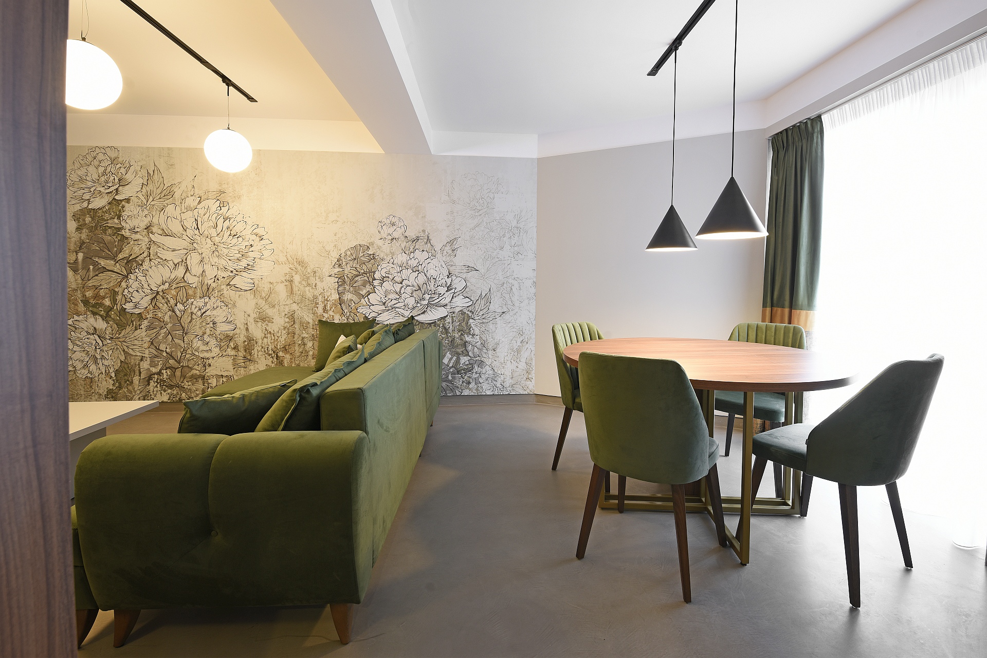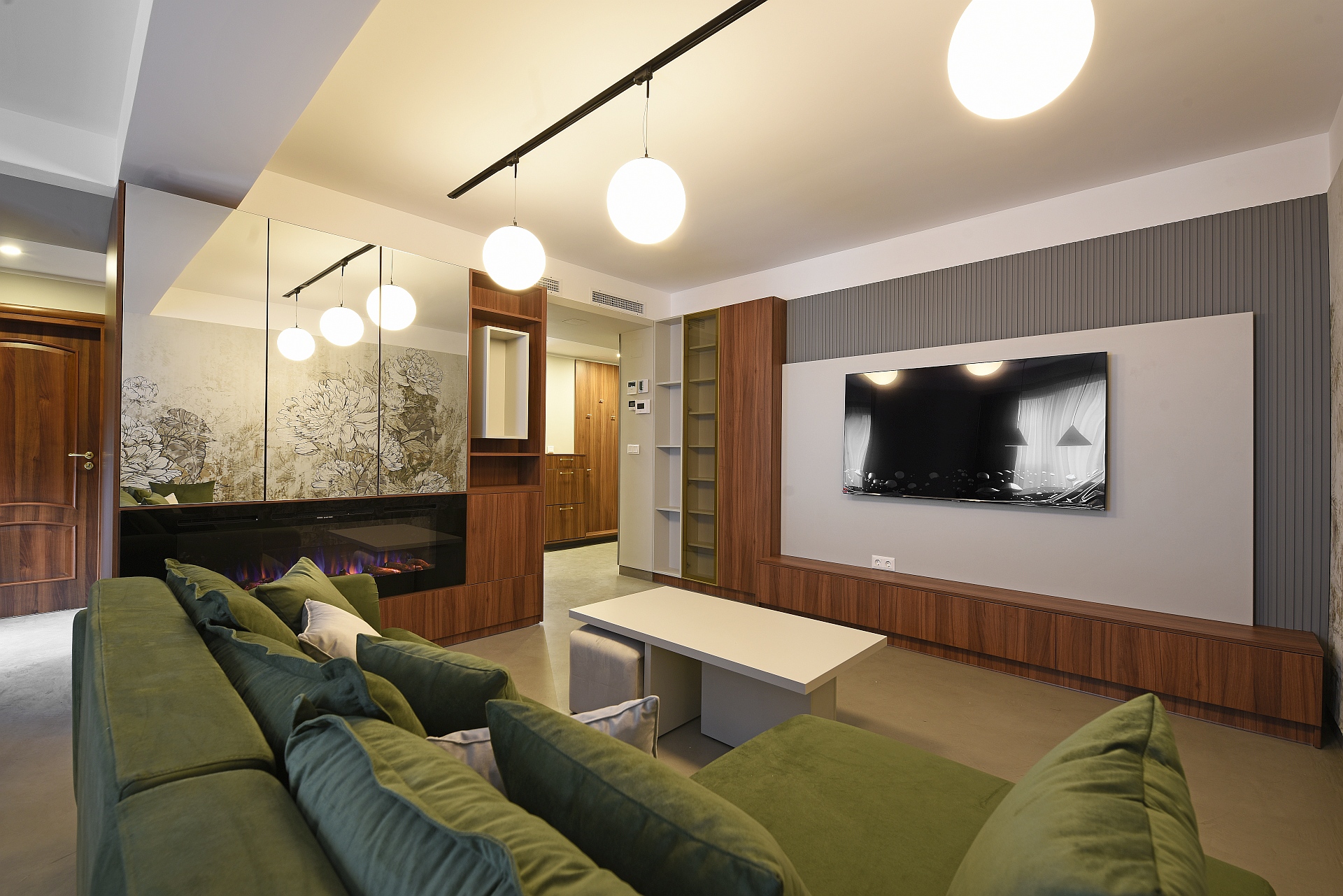 Când privim spre acest apartament GB cu 3 camere, observăm o fuzionare discreta a elementelor clasice și moderne, o armonie a stilurilor care ne înfățișează un spațiu plin de personalitate și rafinament. Catifeaua regală în nuanța sa verde vibrantă se împletește cu marmura prețioasă, decorată cu subtile fire aurii. Acest mix conferă spațiului o senzație nobilă și sofisticată, iar accentele aurii de pe mânere completează perfect atmosfera. Minimalismul inteligent și rafinat joacă și el un rol important în amenajare. Intrăm într-o lume a materialelor moderne, unde jocul de texturi îmbină perfect aspectul clasic cu cel contemporan. Riflajele subtile și fototapetul vintage aduc aminte de trecut, în timp ce se îmbină armonios cu eleganța modernă. Draperiile cu detalii prețioase nu sunt doar elemente decorative, ci și adevărate opere de artă. Prin culorile și modelele lor, acestea se integrează perfect în designul interior, punând în valoare frumusețea ferestrelor și conferind un aer elegant încăperii. Detaliile măiestrite fac ca fiecare colțișor să emane eleganță și rafinament. Colțarul, realizat din aceeași catifea verde ce definește întregul spațiu, se îmbină într-o simfonie cromatică cu nuanțele de lemn rosiatic. Această nuanță caldă și autentică ne amintește de esența lemnului de mahon, o bijuterie prețioasă în lumea designului interior.