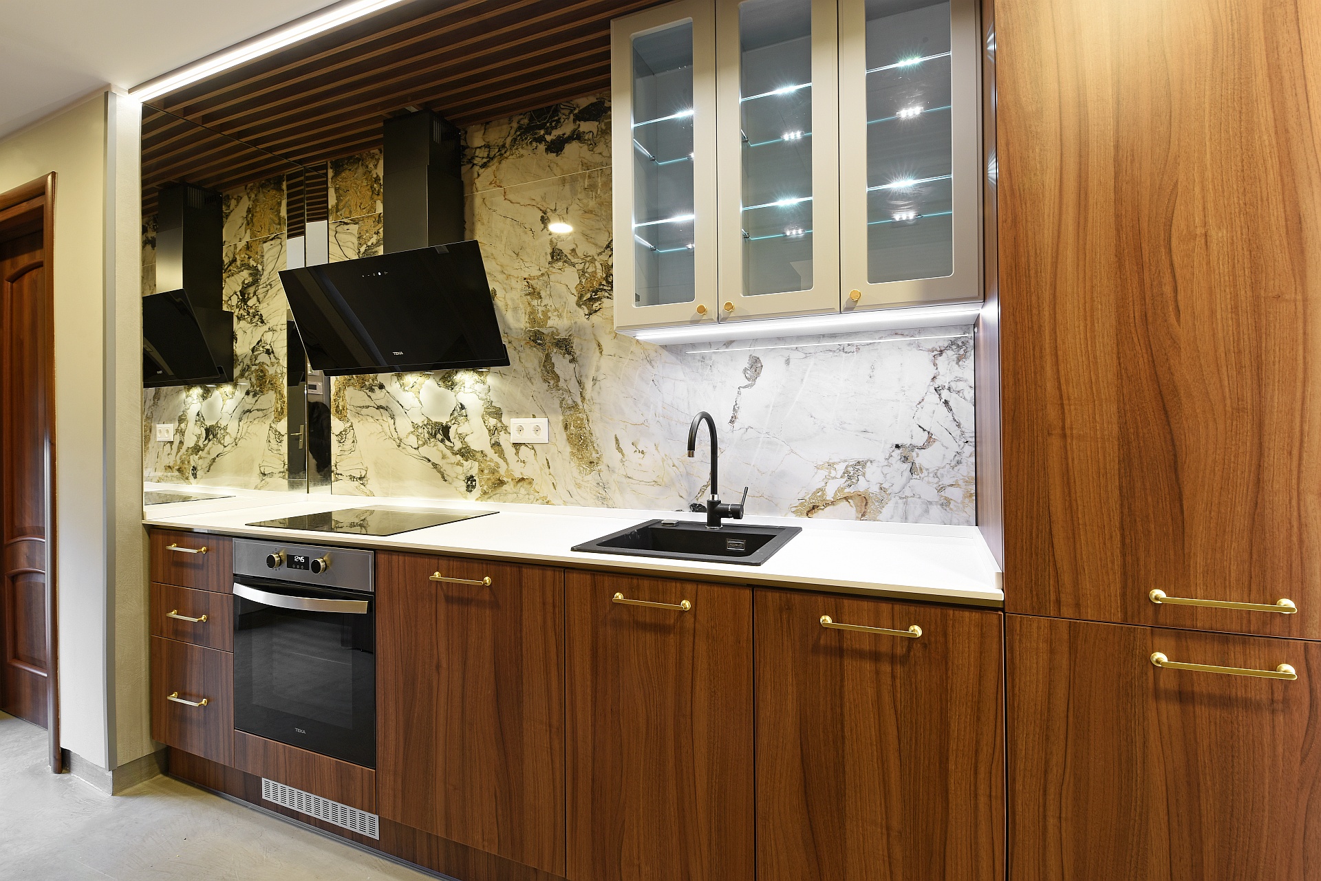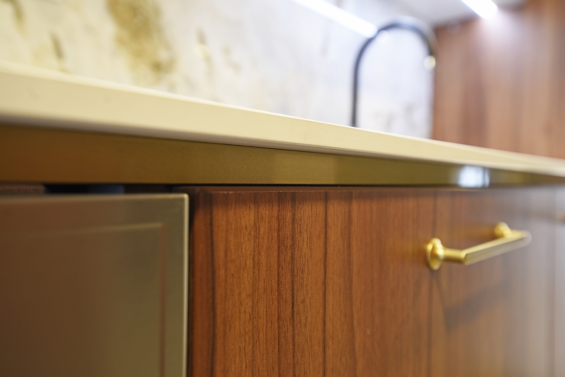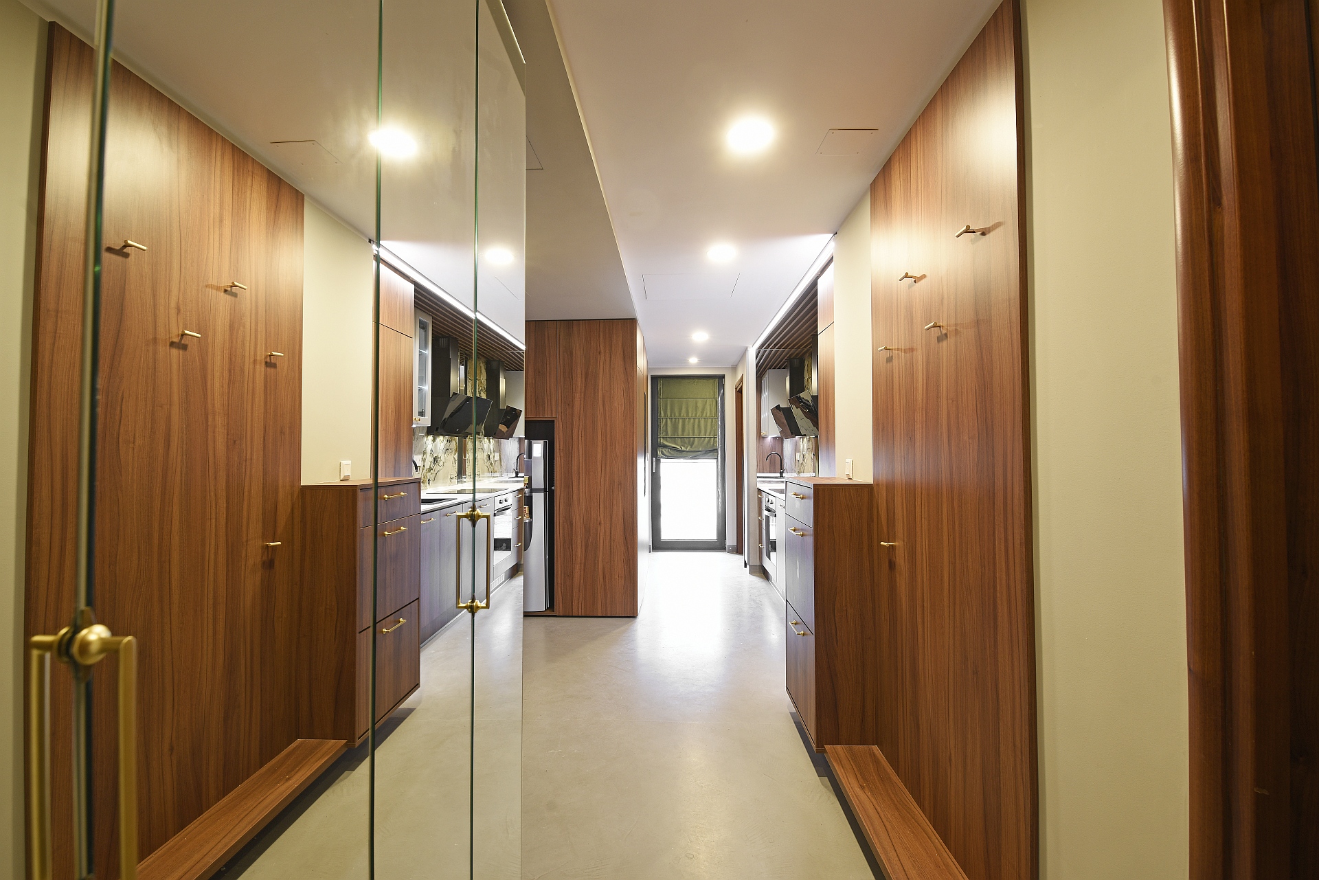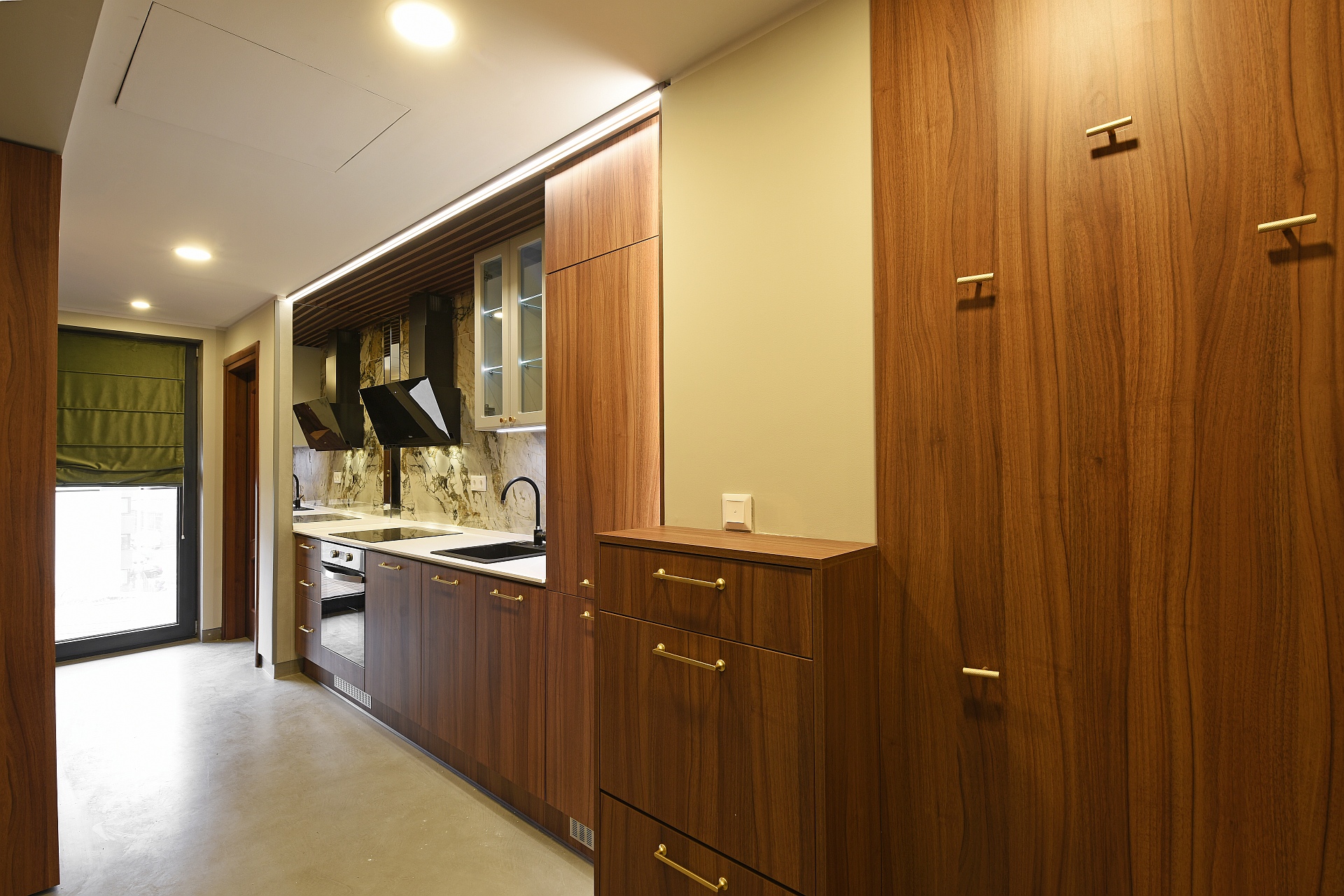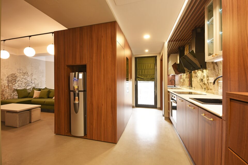 Când privim spre acest apartament GB cu 3 camere, observăm o fuzionare discreta a elementelor clasice și moderne, o armonie a stilurilor care ne înfățișează un spațiu plin de personalitate și rafinament. Catifeaua regală în nuanța sa verde vibrantă se împletește cu marmura prețioasă, decorată cu subtile fire aurii. Acest mix conferă spațiului o senzație nobilă și sofisticată, iar accentele aurii de pe mânere completează perfect atmosfera. Minimalismul inteligent și rafinat joacă și el un rol important în amenajare. Intrăm într-o lume a materialelor moderne, unde jocul de texturi îmbină perfect aspectul clasic cu cel contemporan. Riflajele subtile și fototapetul vintage aduc aminte de trecut, în timp ce se îmbină armonios cu eleganța modernă. Draperiile cu detalii prețioase nu sunt doar elemente decorative, ci și adevărate opere de artă. Prin culorile și modelele lor, acestea se integrează perfect în designul interior, punând în valoare frumusețea ferestrelor și conferind un aer elegant încăperii. Detaliile măiestrite fac ca fiecare colțișor să emane eleganță și rafinament. Colțarul, realizat din aceeași catifea verde ce definește întregul spațiu, se îmbină într-o simfonie cromatică cu nuanțele de lemn rosiatic. Această nuanță caldă și autentică ne amintește de esența lemnului de mahon, o bijuterie prețioasă în lumea designului interior.