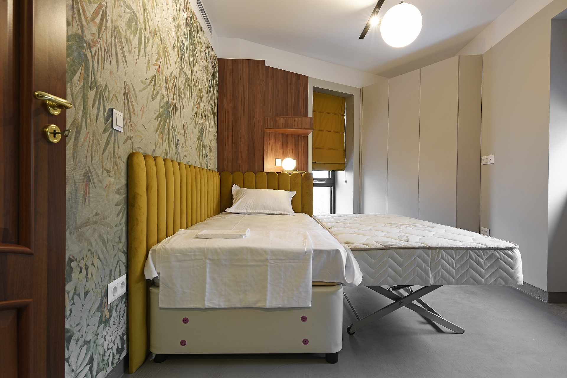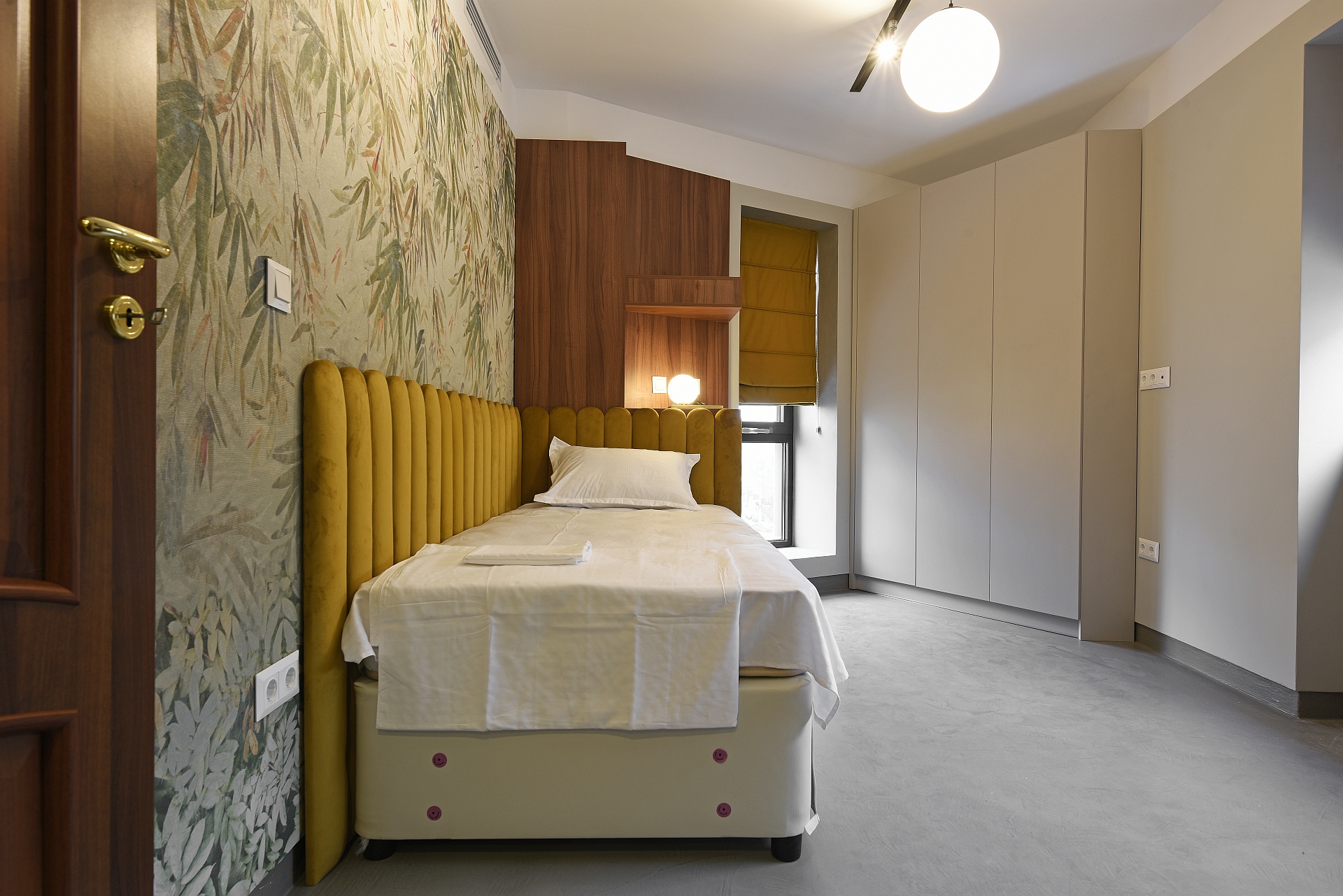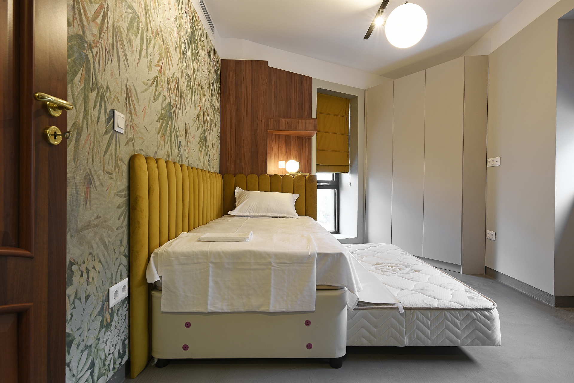 Toate aceste elemente – de la culorile vibrante și texturile îmbietoare, până la detalii fine și elegante – converg spre o creație unică. Acest apartament cu 3 camere devine mai mult decât un simplu spațiu de locuit, se transformă într-un veritabil tablou, într-o poveste de acasă scrisă în fiecare colț și detalii. Cu fiecare atingere, cu fiecare element de design, cu fiecare nuanță și textură, acest apartament devine o operă de artă în sine. În acest spațiu magic, cultura și tradițiile se împletesc într-o armonie perfectă, iar ideea de acasă prinde viață într-un mod cu totul nou și inovator. Dormitorul matrimonial respecta este centrat pe zona patului iar tonurile blande albastru induc relaxare si destindere . Camera numarul 3 este multifunctionala – poate fi oricand o camera pentru un copil sau o camera de oaspeti datorita patului ingenios sau doar o camera birou. Ca in fiecare camera culorile in tonurile casei cu nuante de verde si auriu discret. Încheind această călătorie în lumea designului, putem cu mândrie să spunem că acest apartament cu 3 camere devine o pledoarie pentru diversitate, creativitate și frumusețe în toate limbile. El ne amintește că, indiferent de unde venim sau cine suntem, acasă este cu adevărat acolo unde sufletul nostru se simte în armonie și cu totul special.