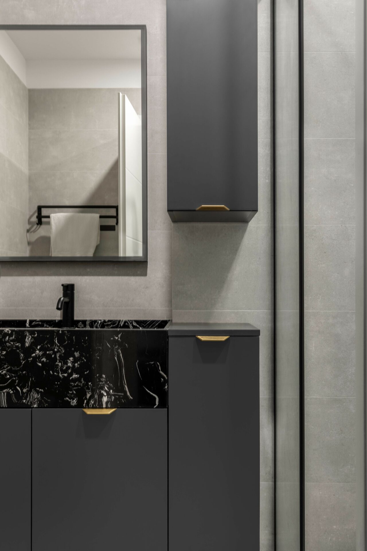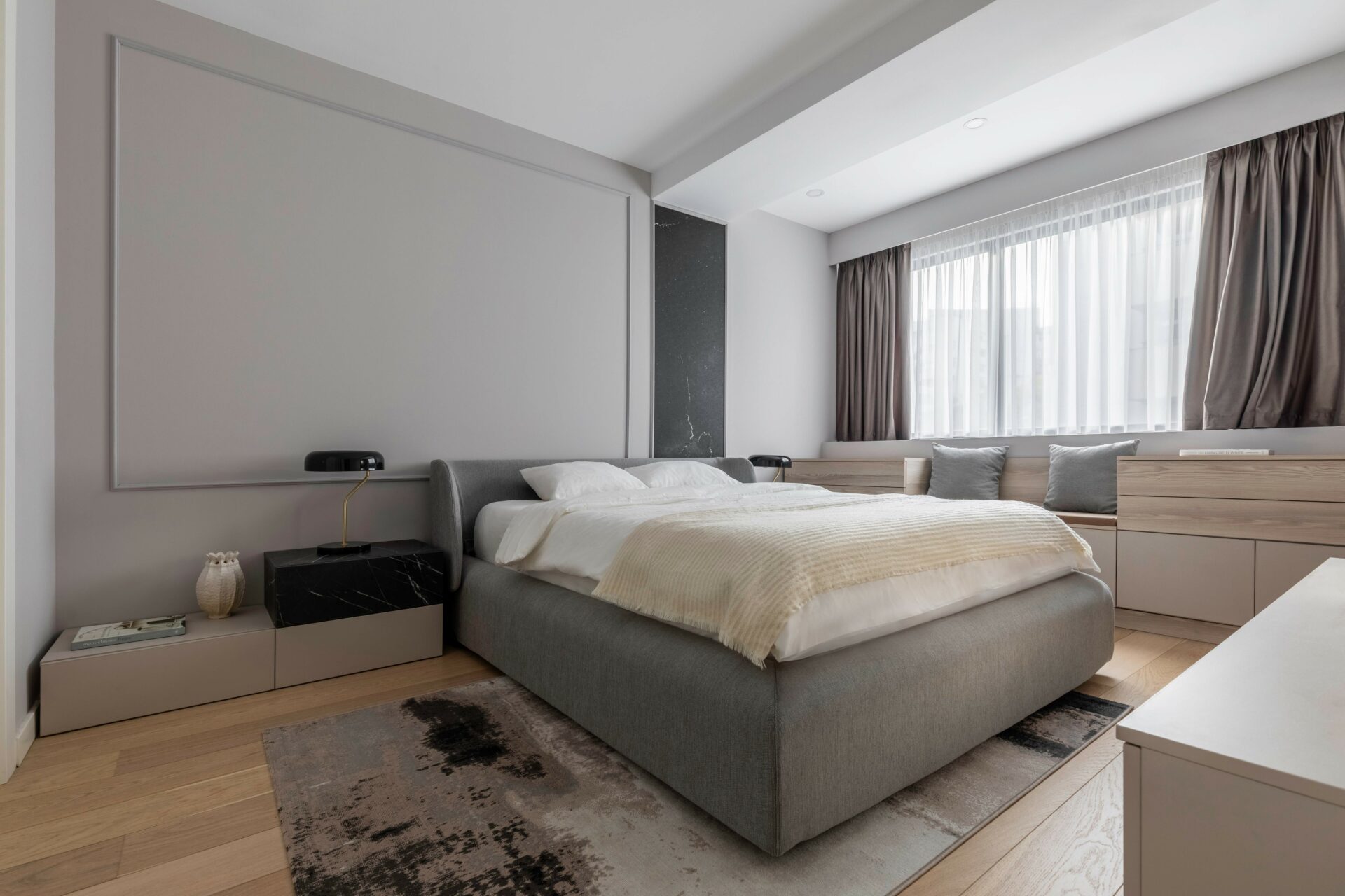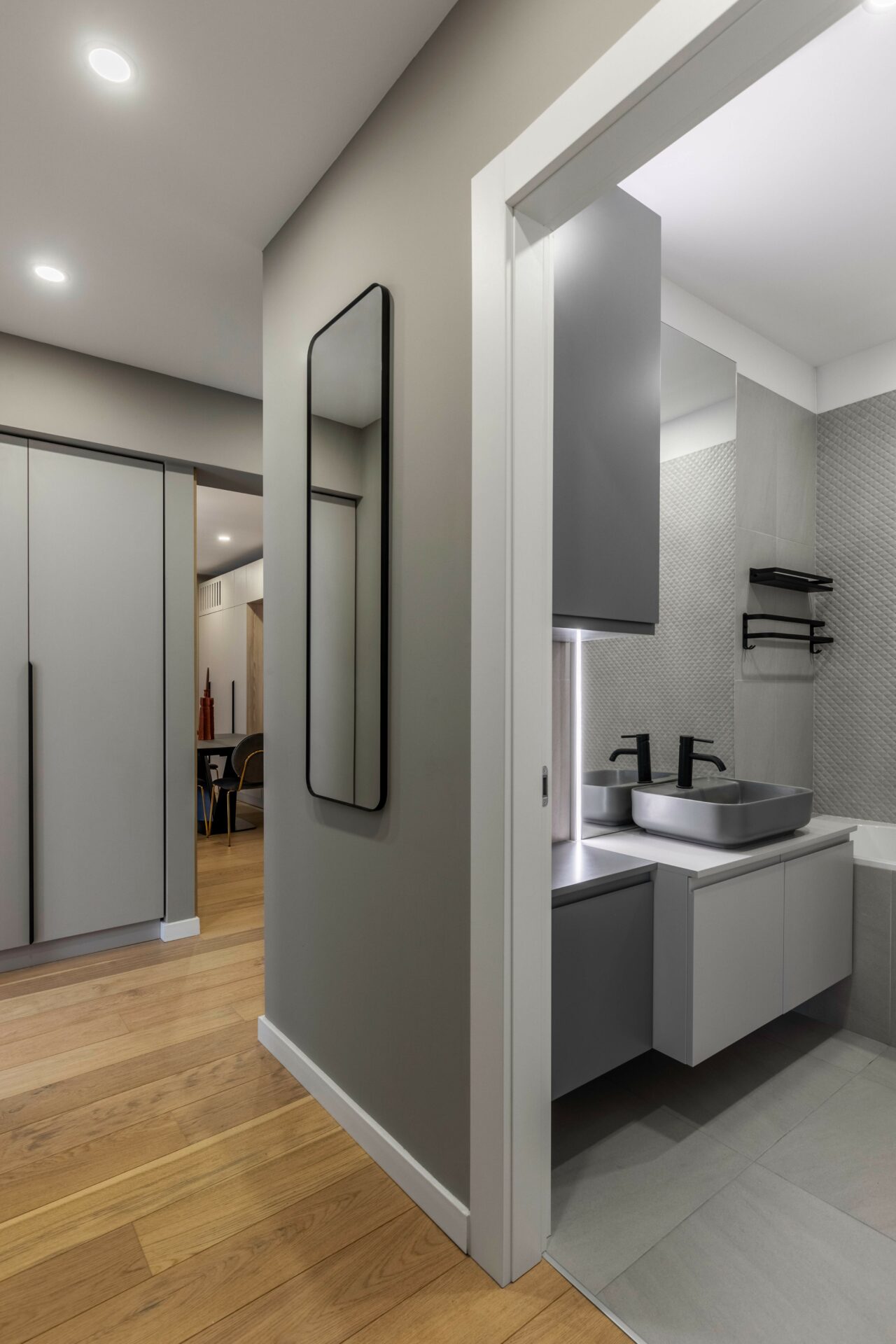 În cadrul acestei amenajări de apartament s-a optat pentru stilul urban-contemporan, rezultând astfel un spațiu care răspunde nevoilor punctuale ale beneficiarului și urmărește să îmbine în mod armonios esteticul și funcționalul. Una dintre provocările proiectului a fost eficientizarea spațiilor de depozitare.