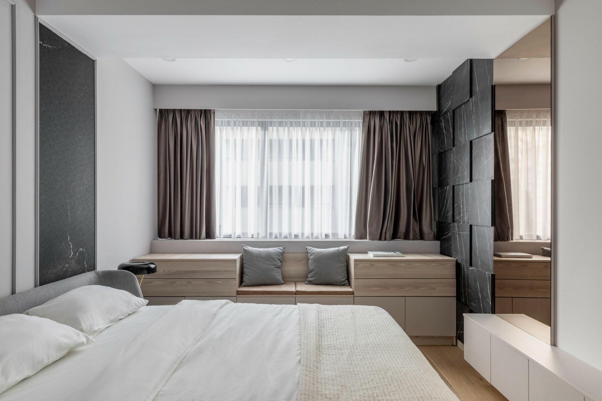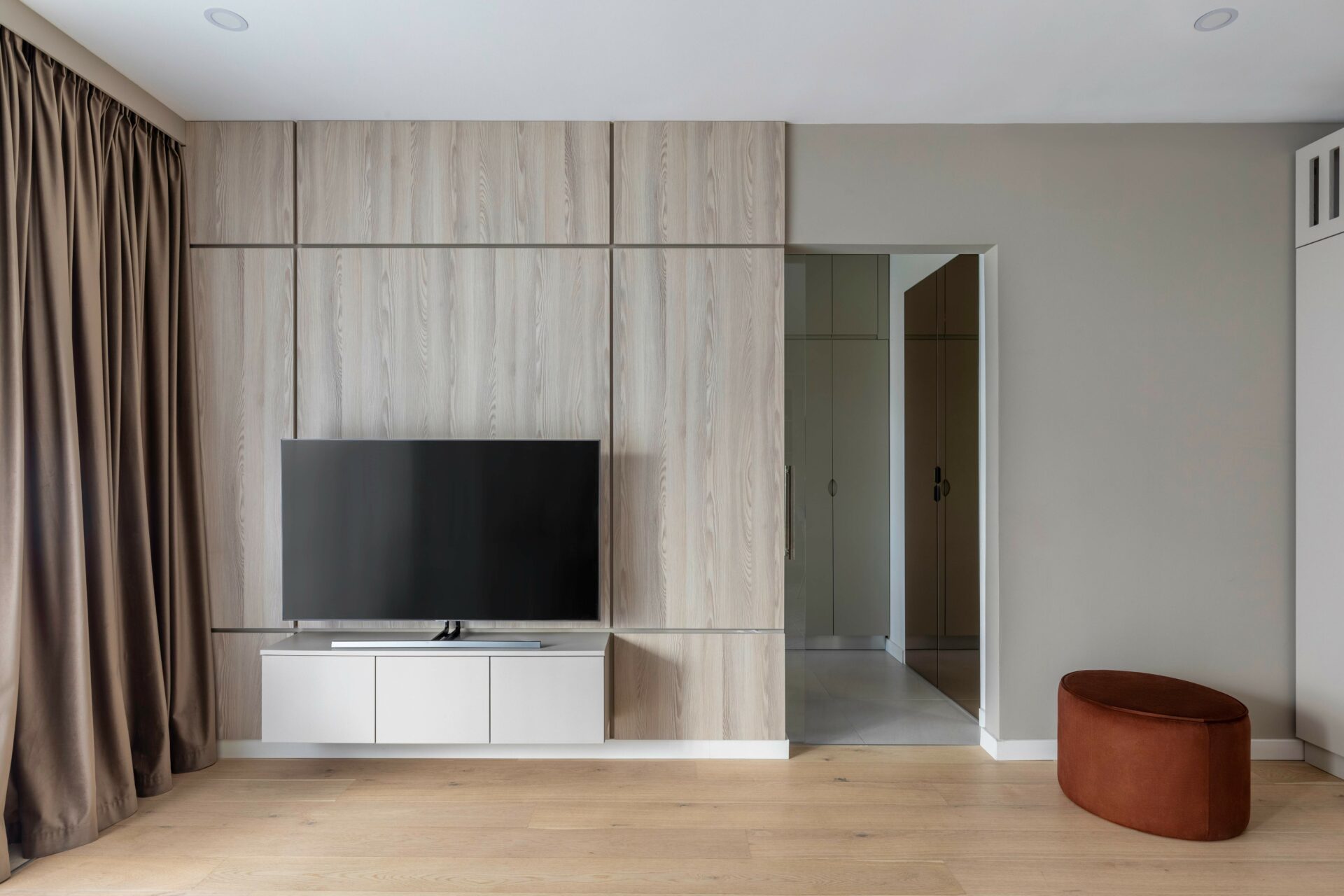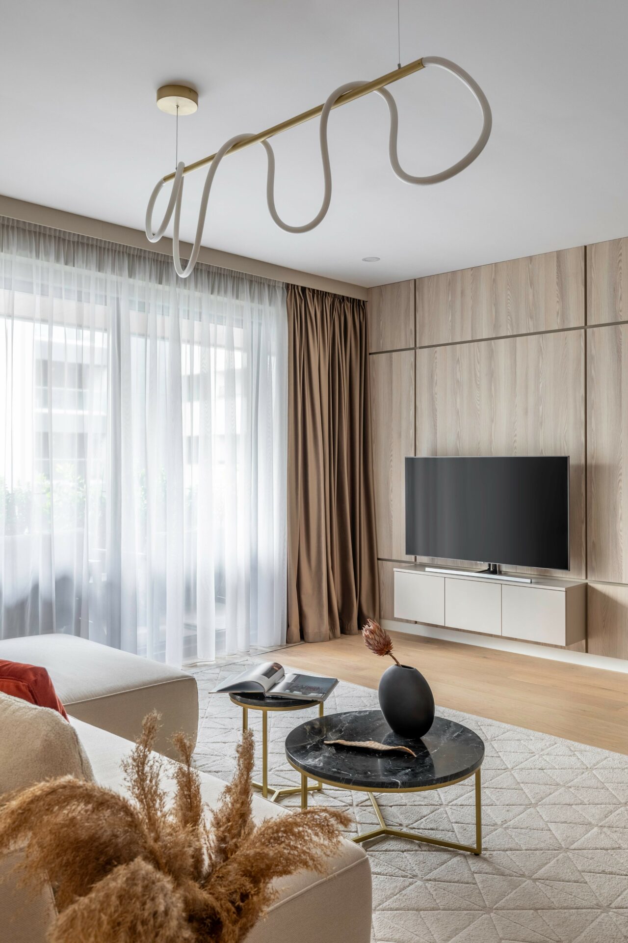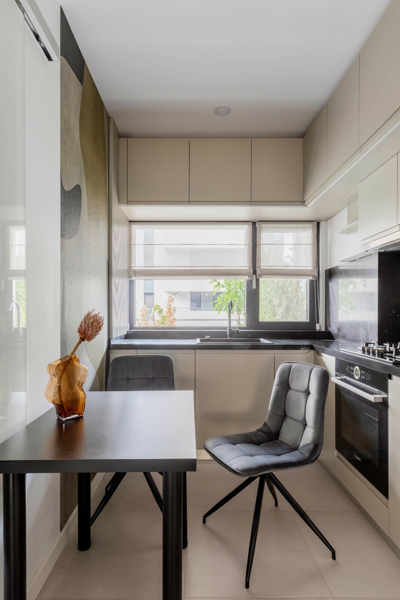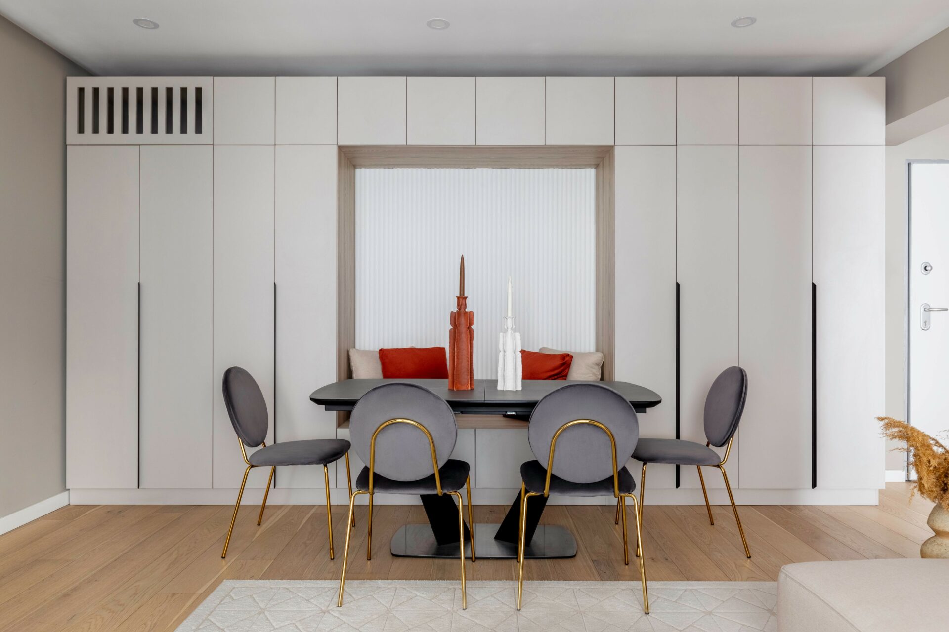 Acest lucru s-a concretizat printr-un mobilier custom ce reușește să îndeplinească în mod simultan diferite utilități practice. În living, dressingul spațios înglobează și zona de dining, iar în dormitor comoda este proiectată astfel încât să includă și o zonă de relaxare. Pentru a oferi senzația de spațiu aerisit, paleta cromatică aleasă a constat în tonuri neutre, asupra cărora s-a intervenit cu mici accente de antracit, auriu și teracotă.