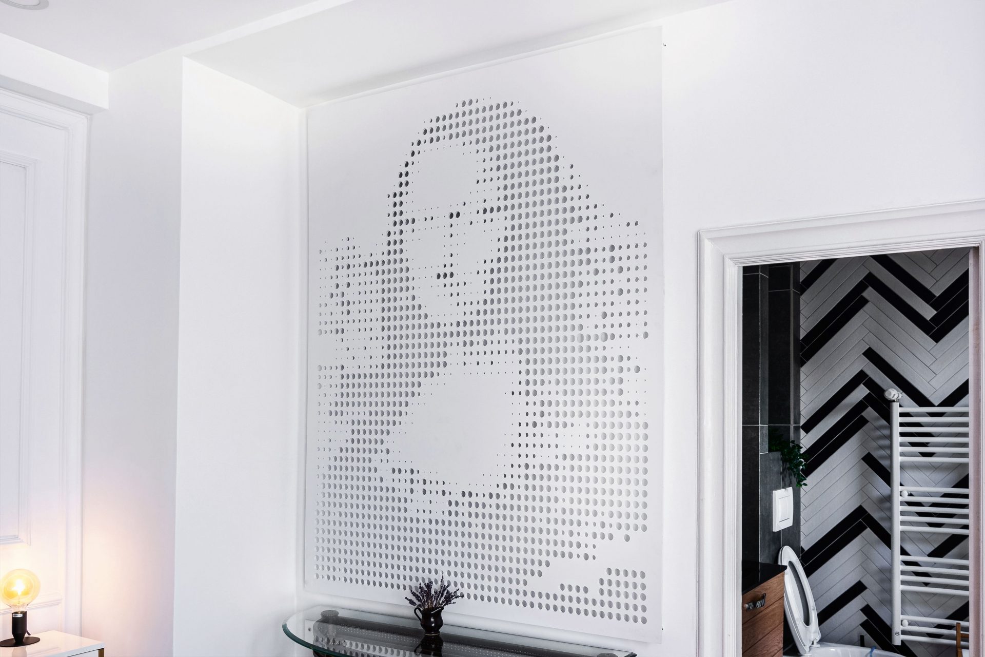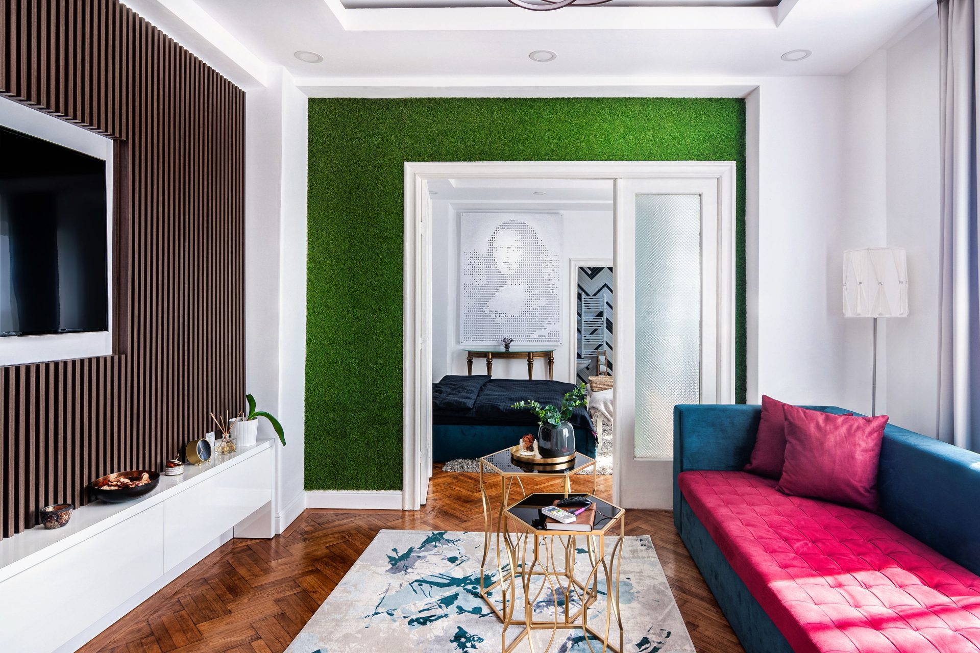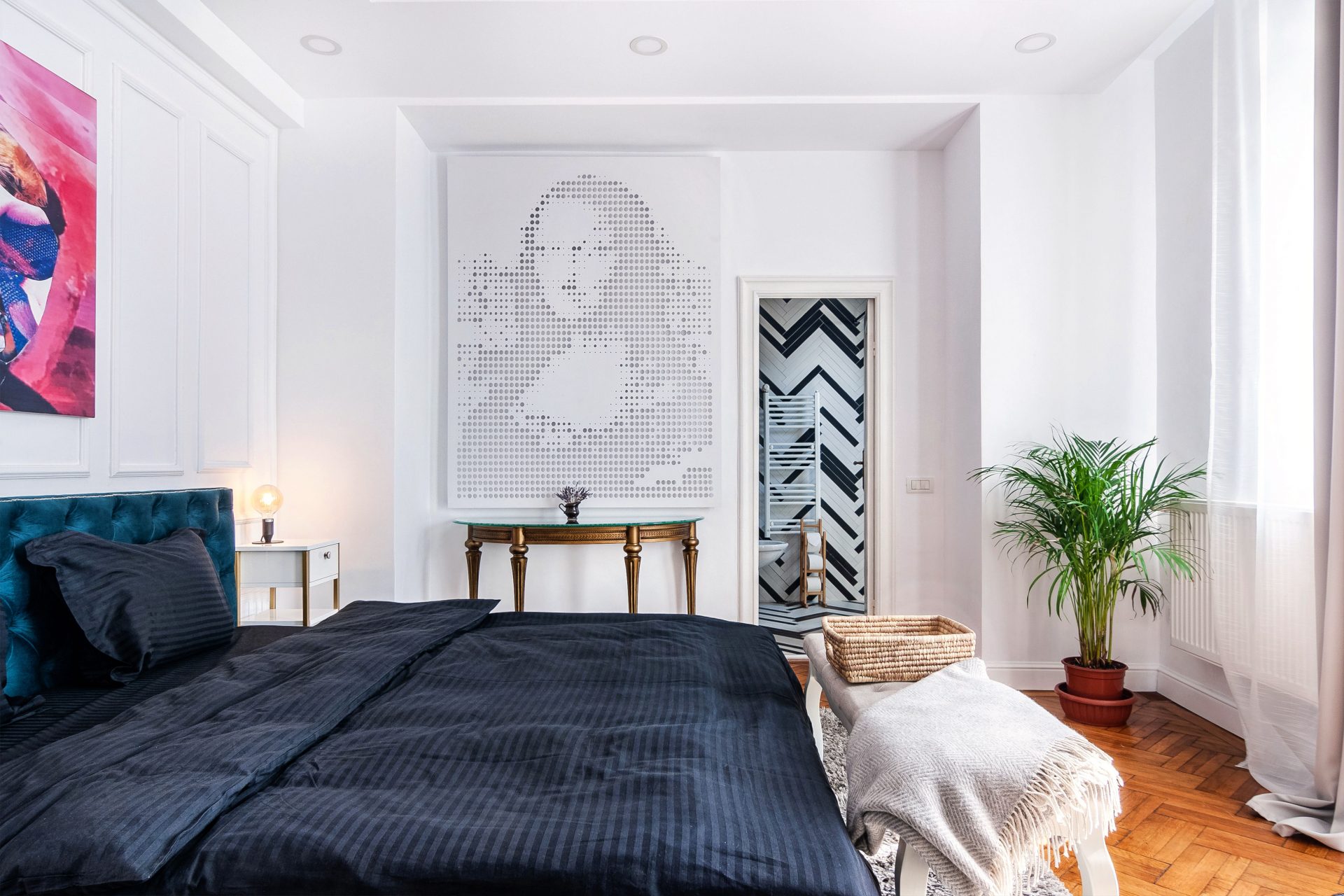 Apartamentul este amenajat intr-un stil eclectic ce inrameaza avangardismul si artisticul prin accente puternice de culori, texturi, nuante de negru si printuri indraznete