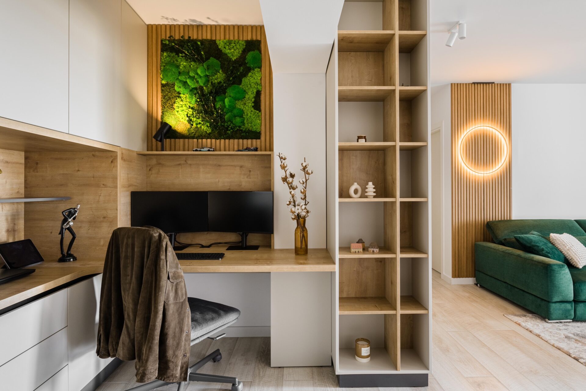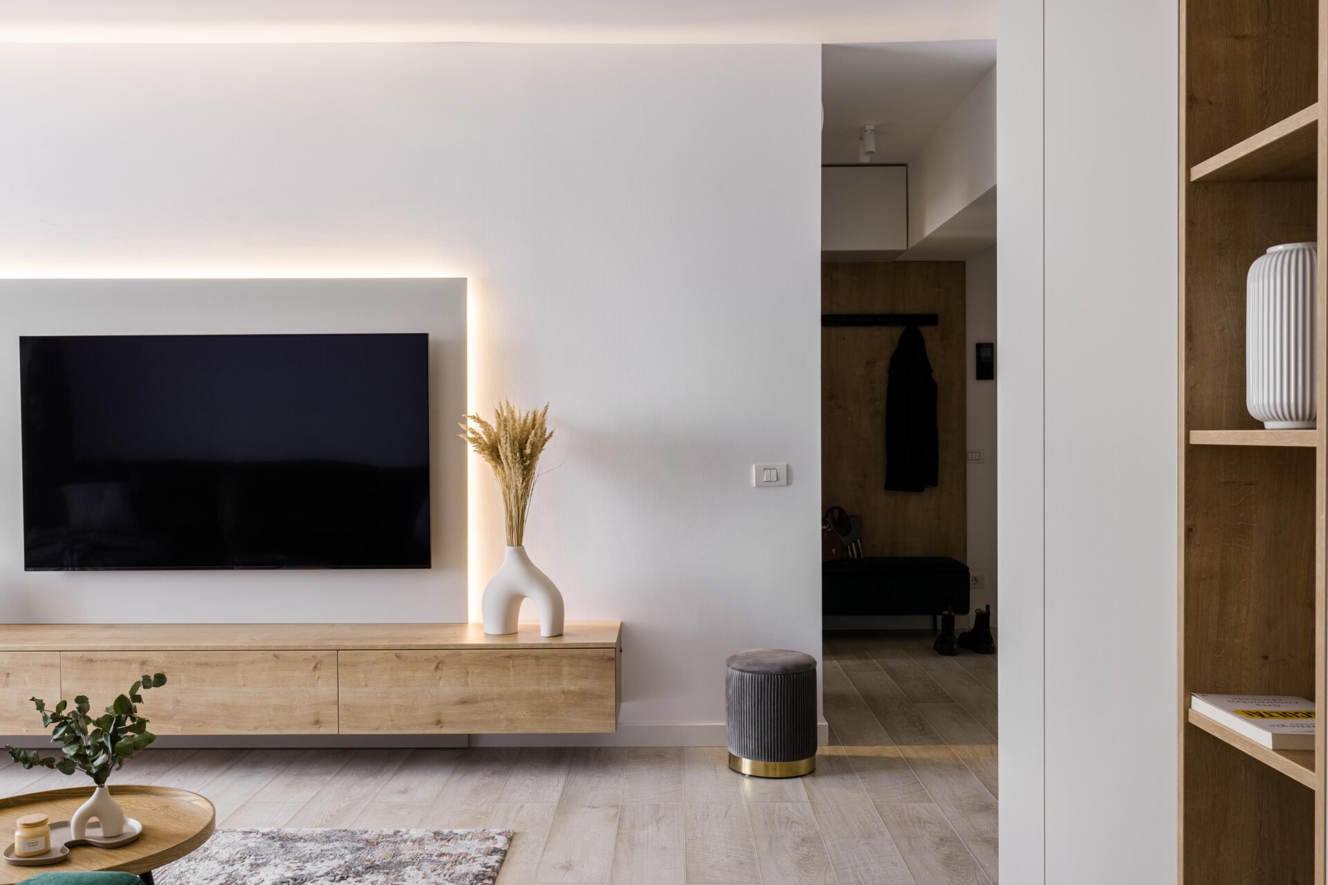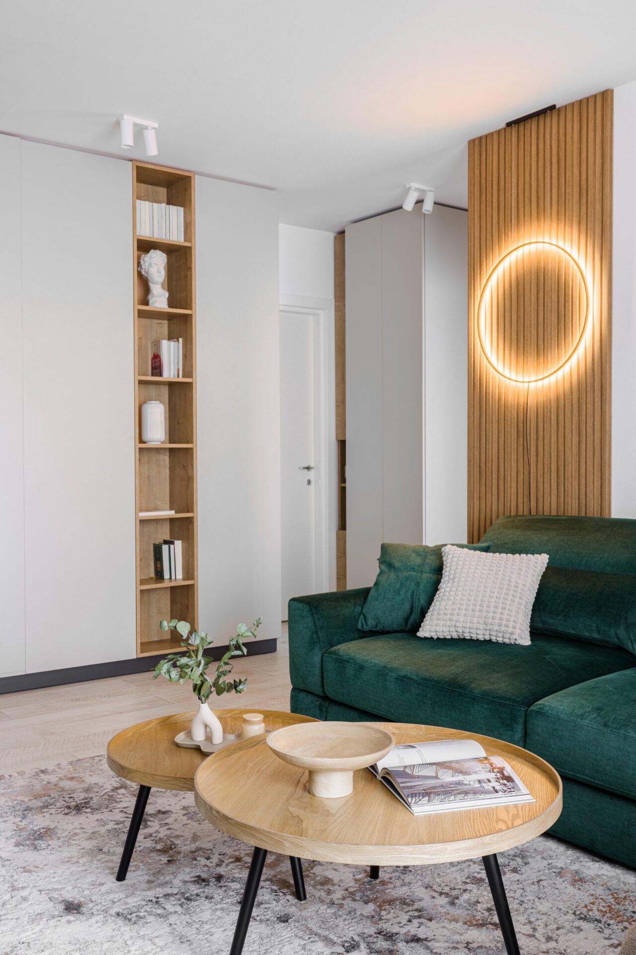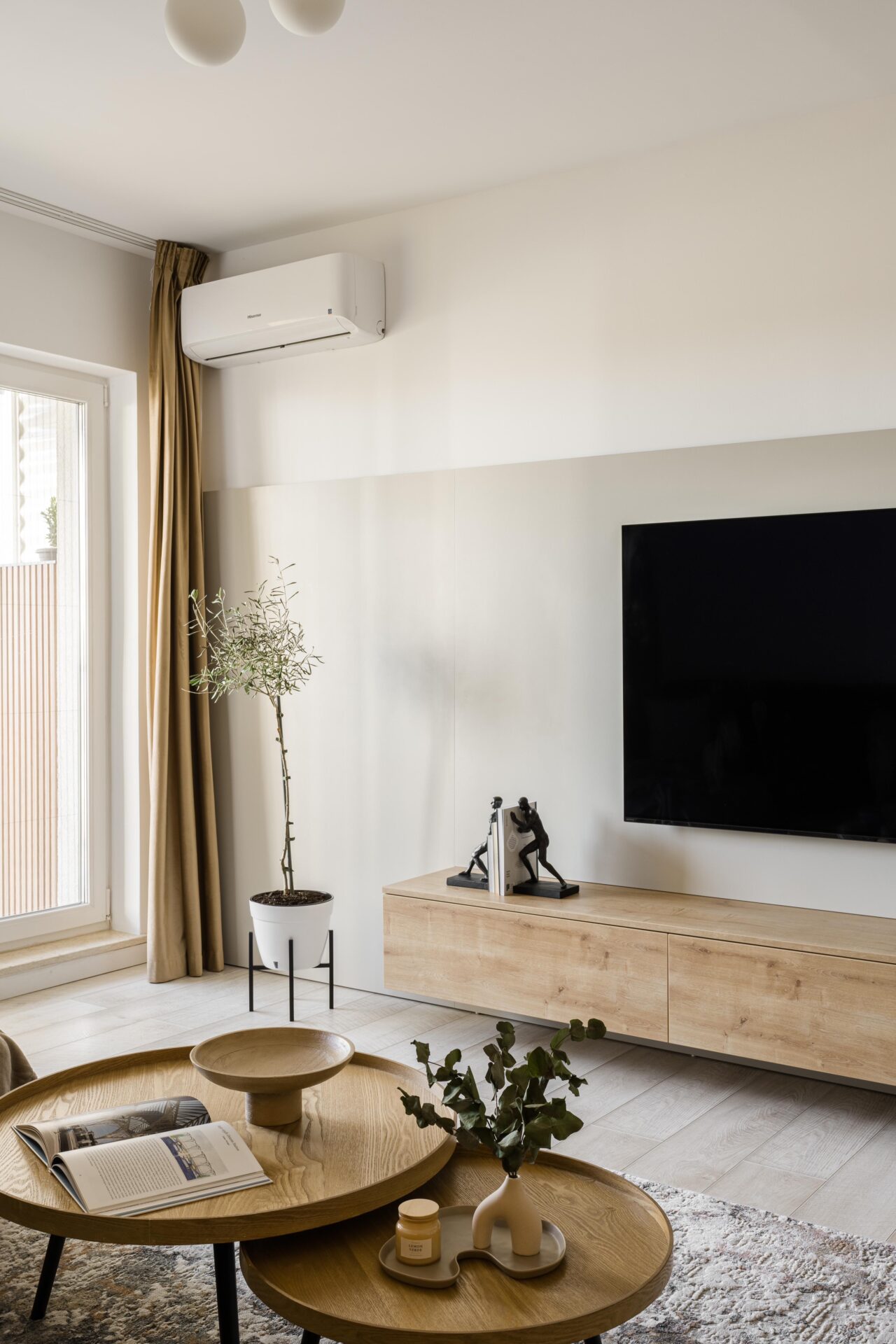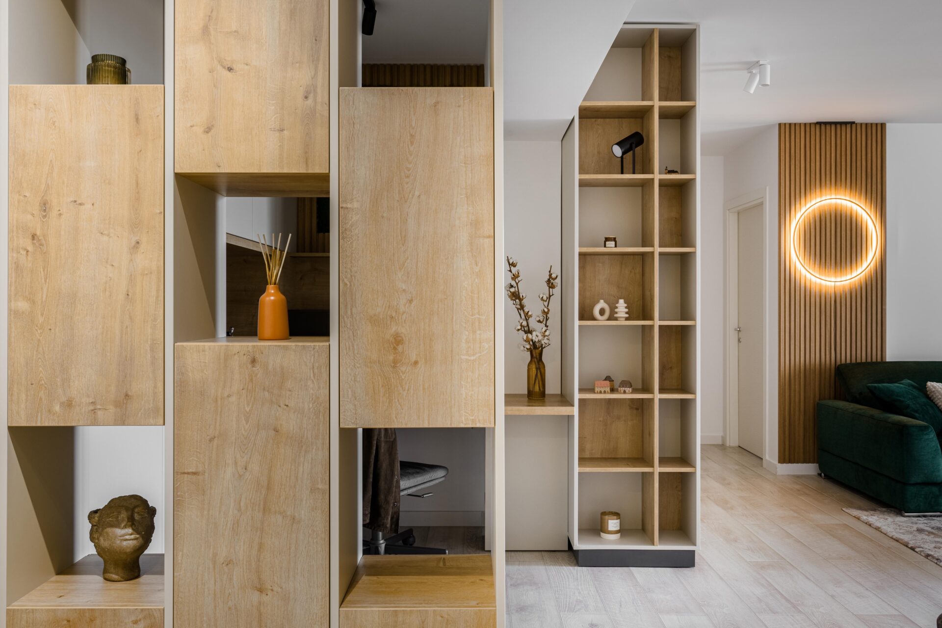 Zona de intrare și spațiul pentru birou sunt separate printr-un perete decorativ, dar totodată și util prin spațiile de depozitare. Am ales să mobilăm astfel încât zona de zi și zona de noapte să rămână cât mai aerisite și scăldate în lumină naturală. Pentru bucătărie, am ales o abordare contemporană astfel încât fiecare centimentru a fost utilizat. Este o bucatarie complet utilată unde am reusit să integrăm toate funcționalitățile necesare. Locul de luat masa este evidențiat printr-un decor riflat și o lumină dedicată. Întregul apartament este configurat in nuanțe neutre cu tonuri calde reprezentate de textura lemnului și accente verzi oferite de culoarea materialelor sau chiar a plantelor naturale.