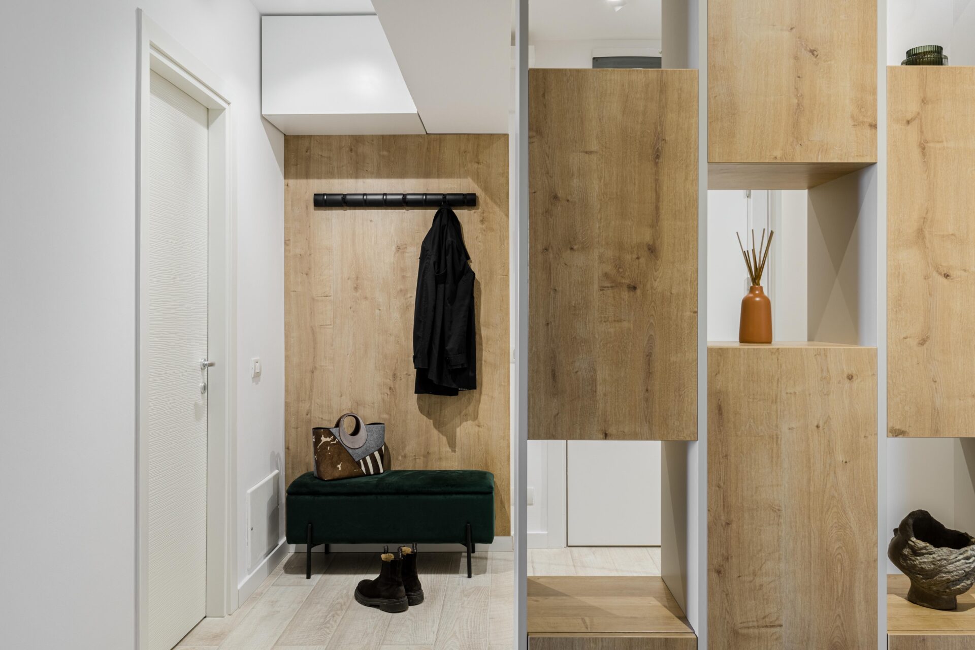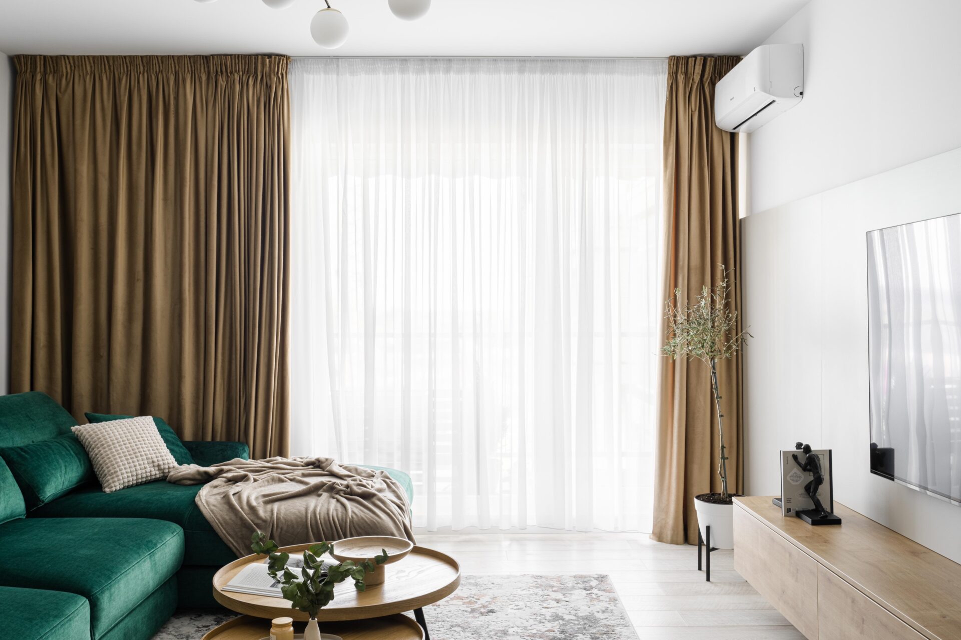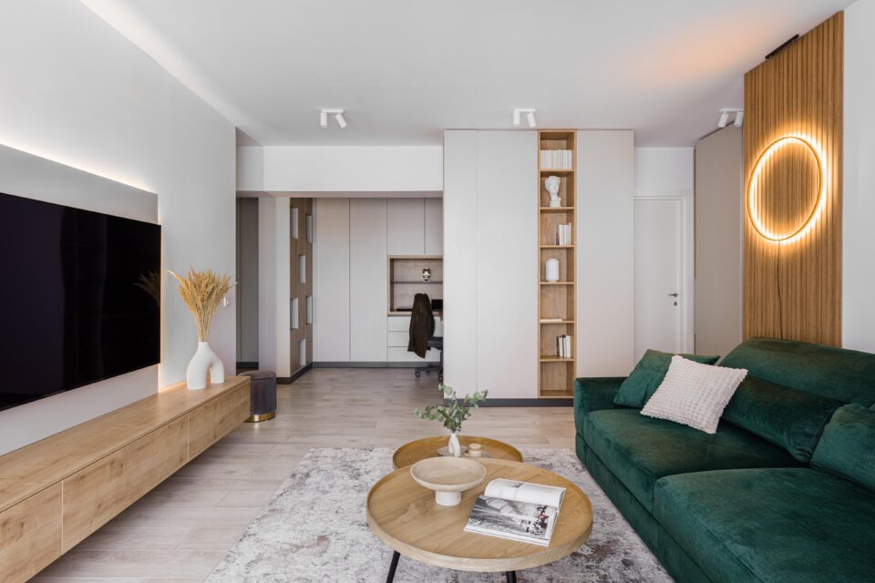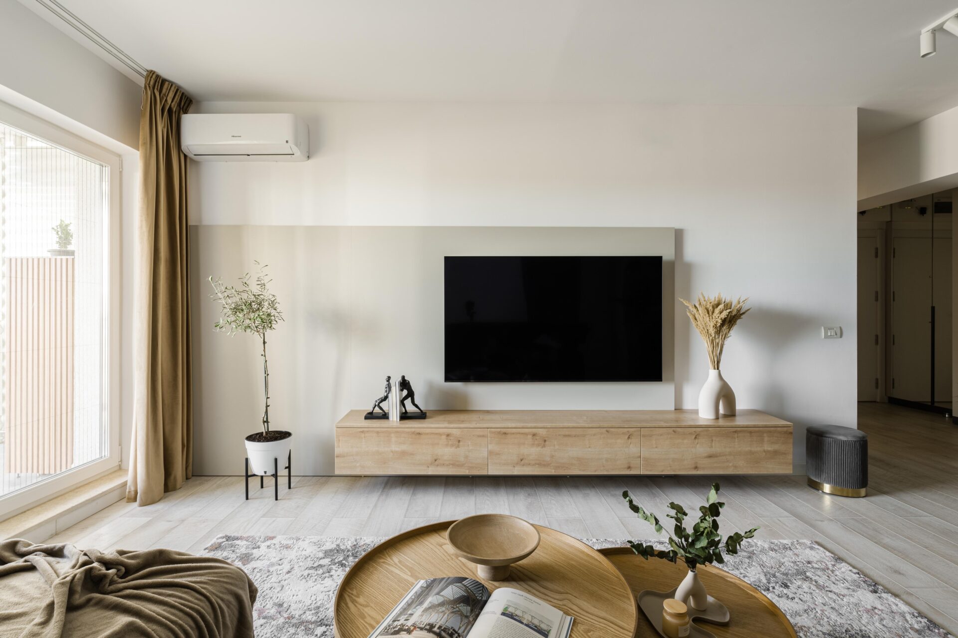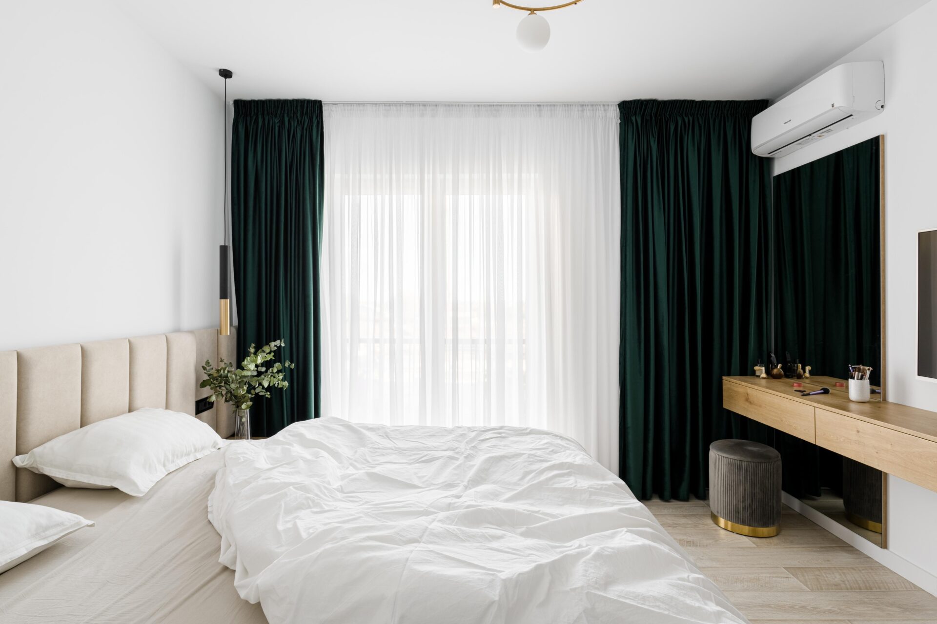 Zona de intrare și spațiul pentru birou sunt separate printr-un perete decorativ, dar totodată și util prin spațiile de depozitare. Am ales să mobilăm astfel încât zona de zi și zona de noapte să rămână cât mai aerisite și scăldate în lumină naturală. Pentru bucătărie, am ales o abordare contemporană astfel încât fiecare centimentru a fost utilizat. Este o bucatarie complet utilată unde am reusit să integrăm toate funcționalitățile necesare. Locul de luat masa este evidențiat printr-un decor riflat și o lumină dedicată. Întregul apartament este configurat in nuanțe neutre cu tonuri calde reprezentate de textura lemnului și accente verzi oferite de culoarea materialelor sau chiar a plantelor naturale.