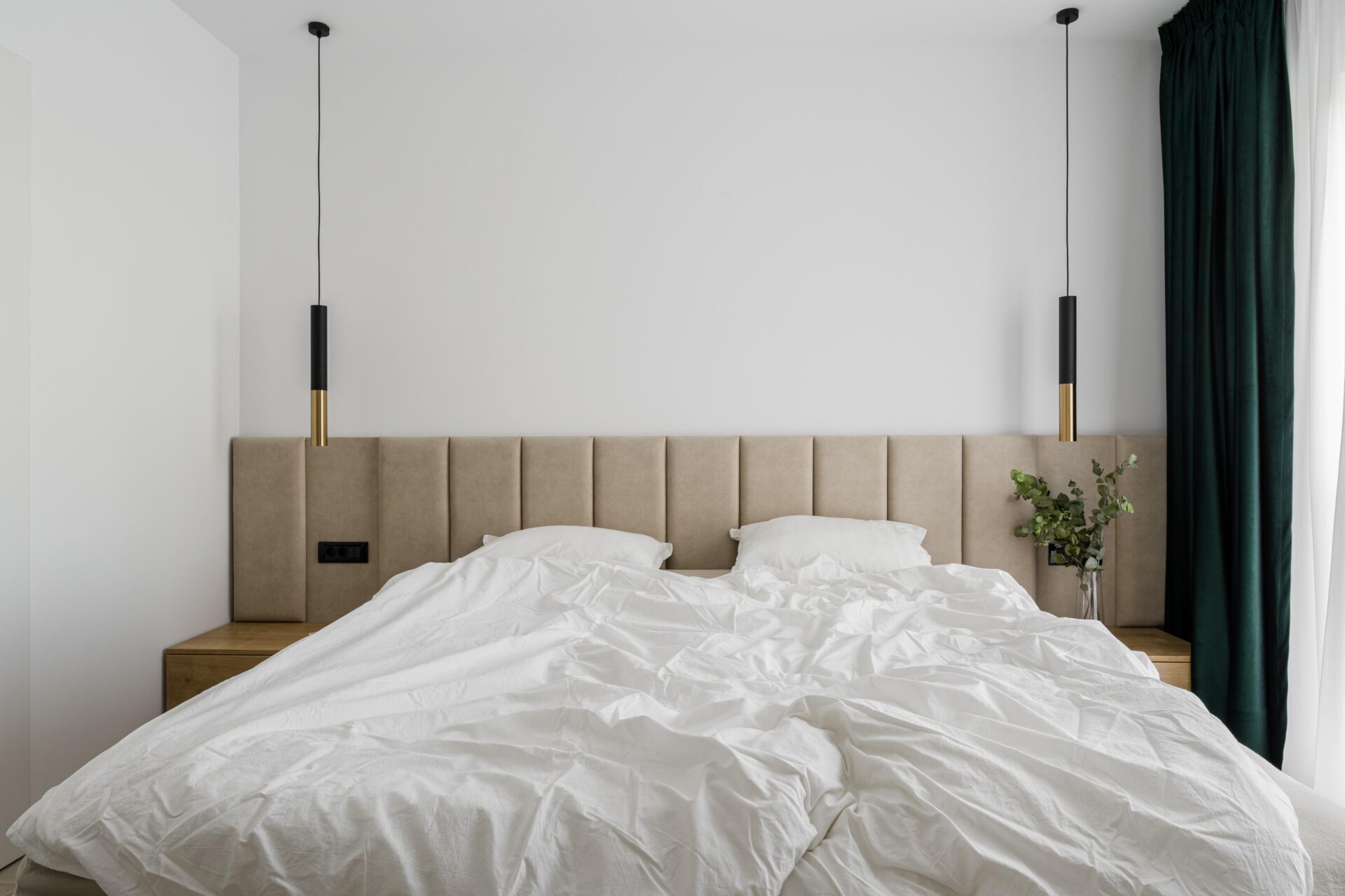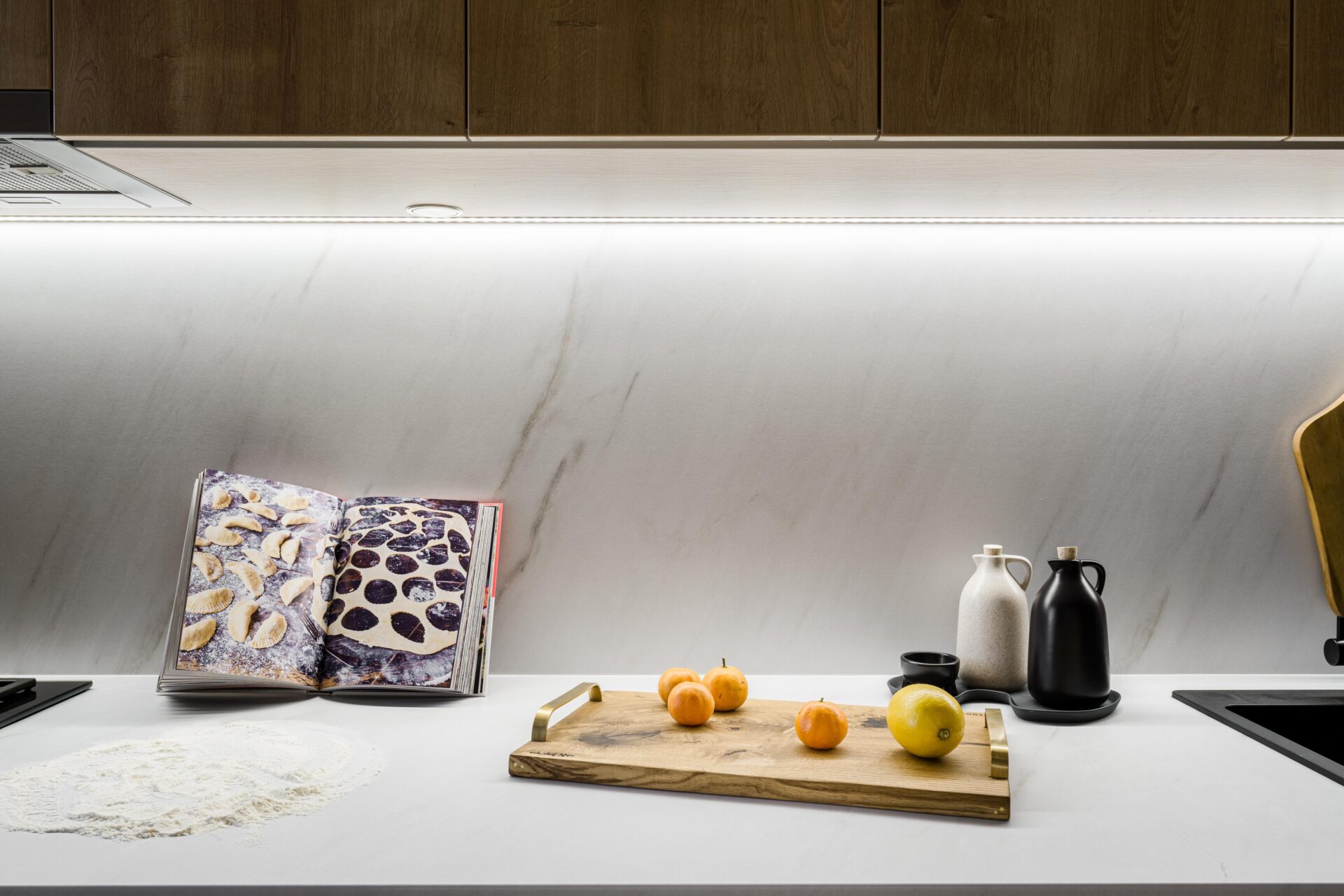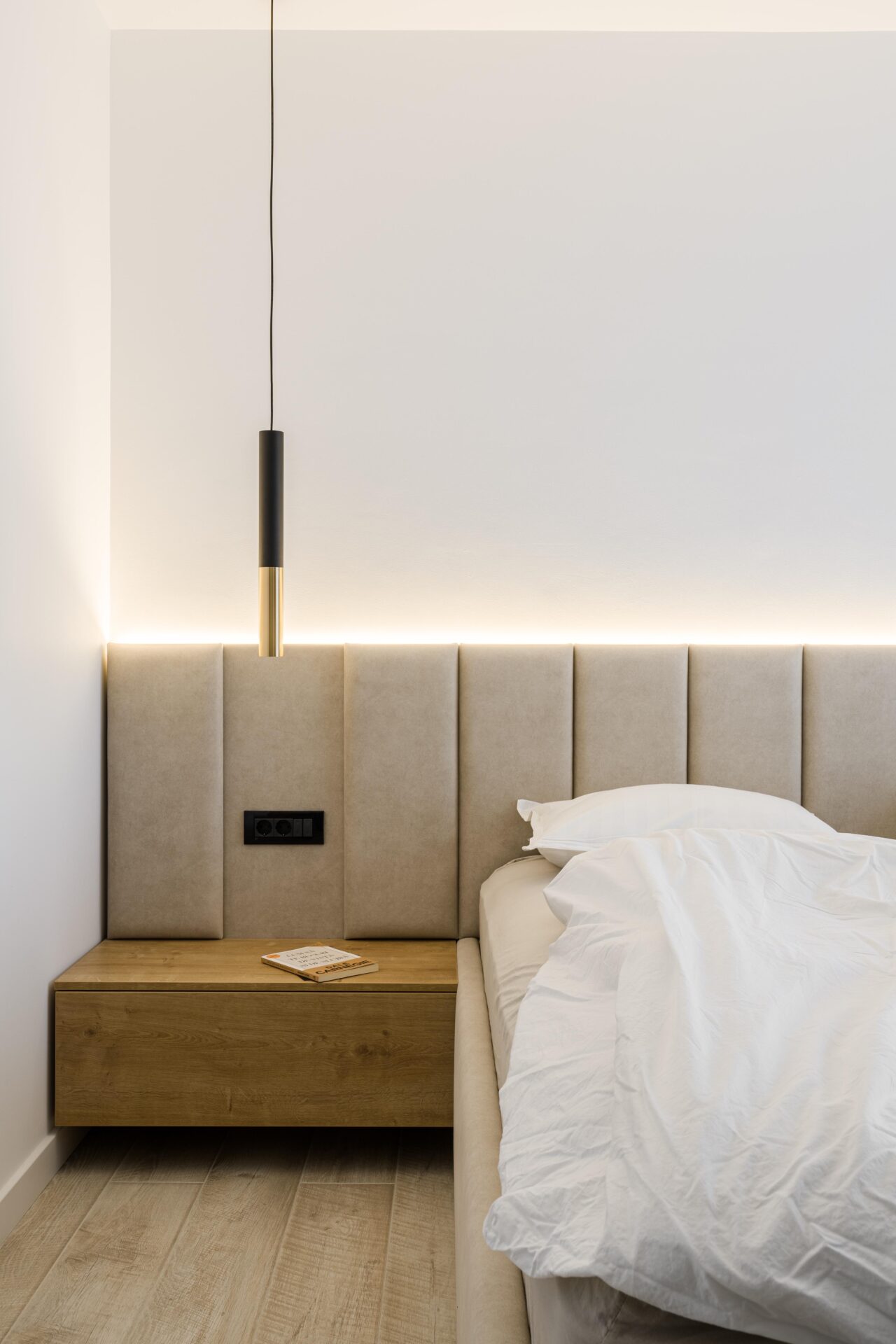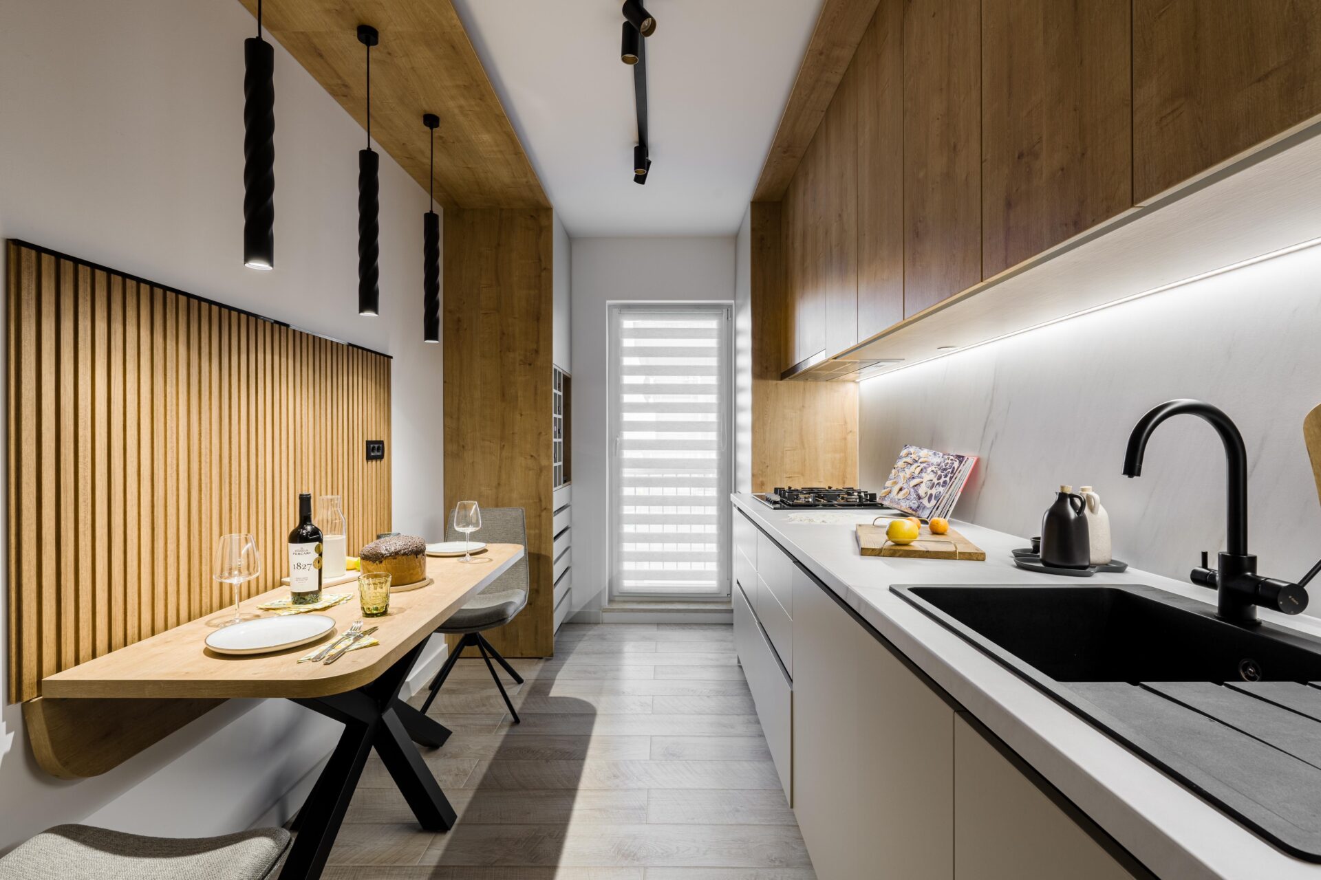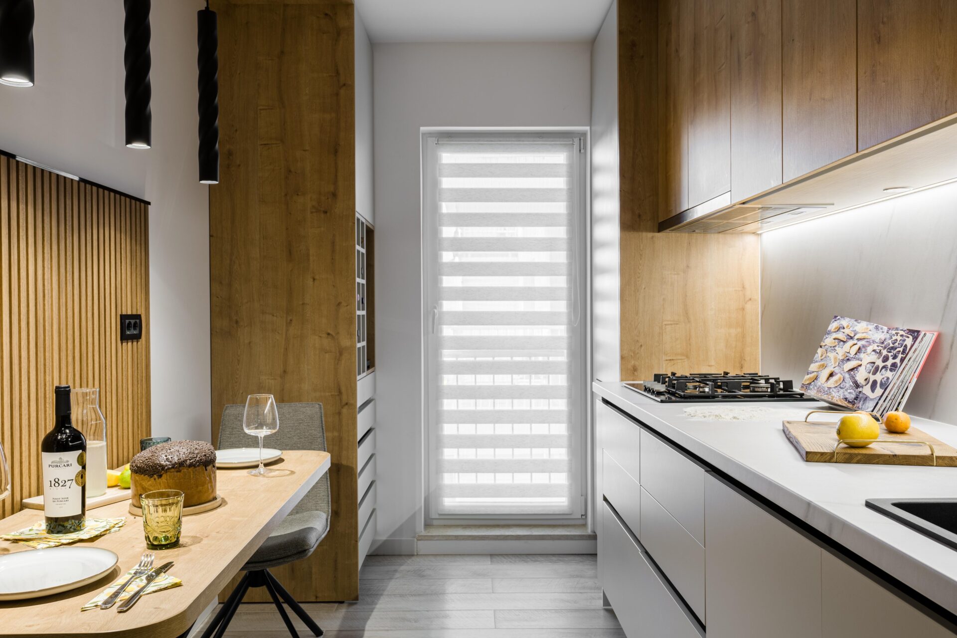Zona de intrare și spațiul pentru birou sunt separate printr-un perete decorativ, dar totodată și util prin spațiile de depozitare. Am ales să mobilăm astfel încât zona de zi și zona de noapte să rămână cât mai aerisite și scăldate în lumină naturală. Pentru bucătărie, am ales o abordare contemporană astfel încât fiecare centimentru a fost utilizat. Este o bucatarie complet utilată unde am reusit să integrăm toate funcționalitățile necesare. Locul de luat masa este evidențiat printr-un decor riflat și o lumină dedicată. Întregul apartament este configurat in nuanțe neutre cu tonuri calde reprezentate de textura lemnului și accente verzi oferite de culoarea materialelor sau chiar a plantelor naturale.