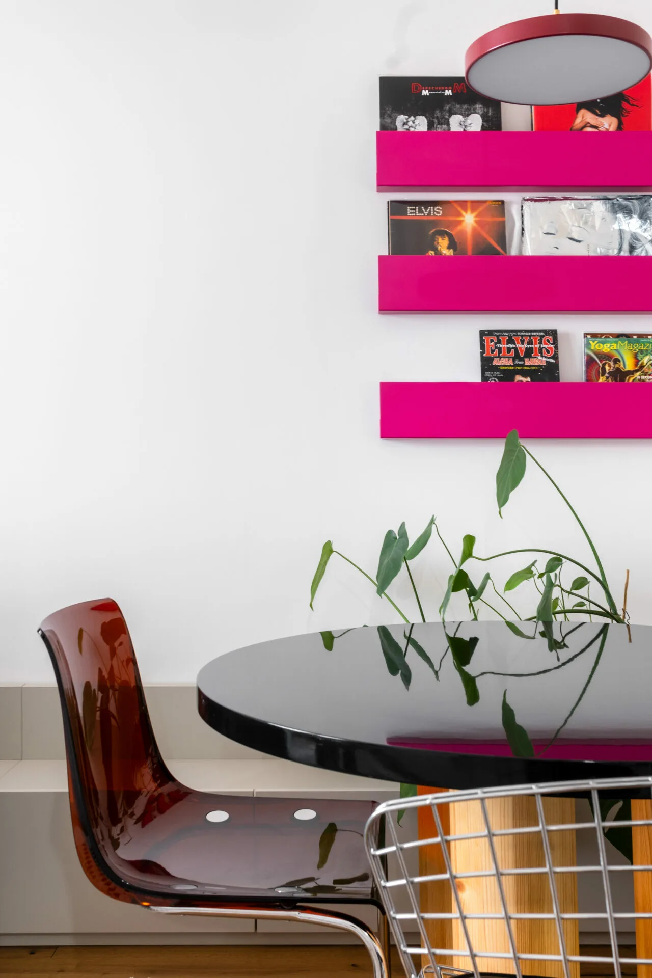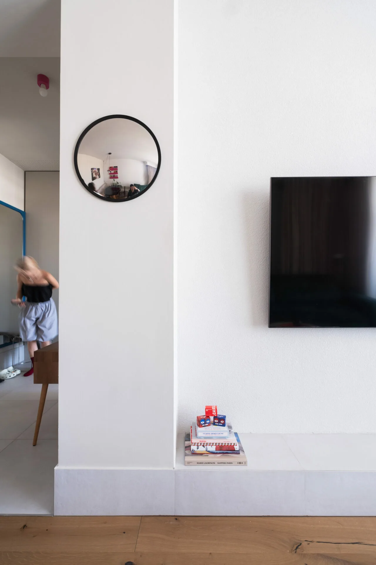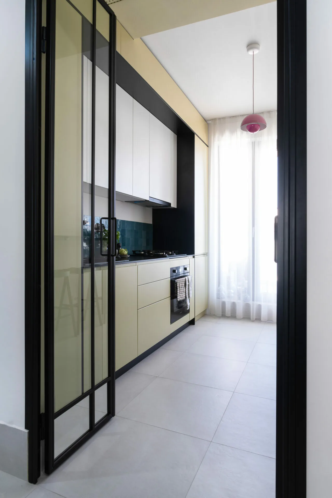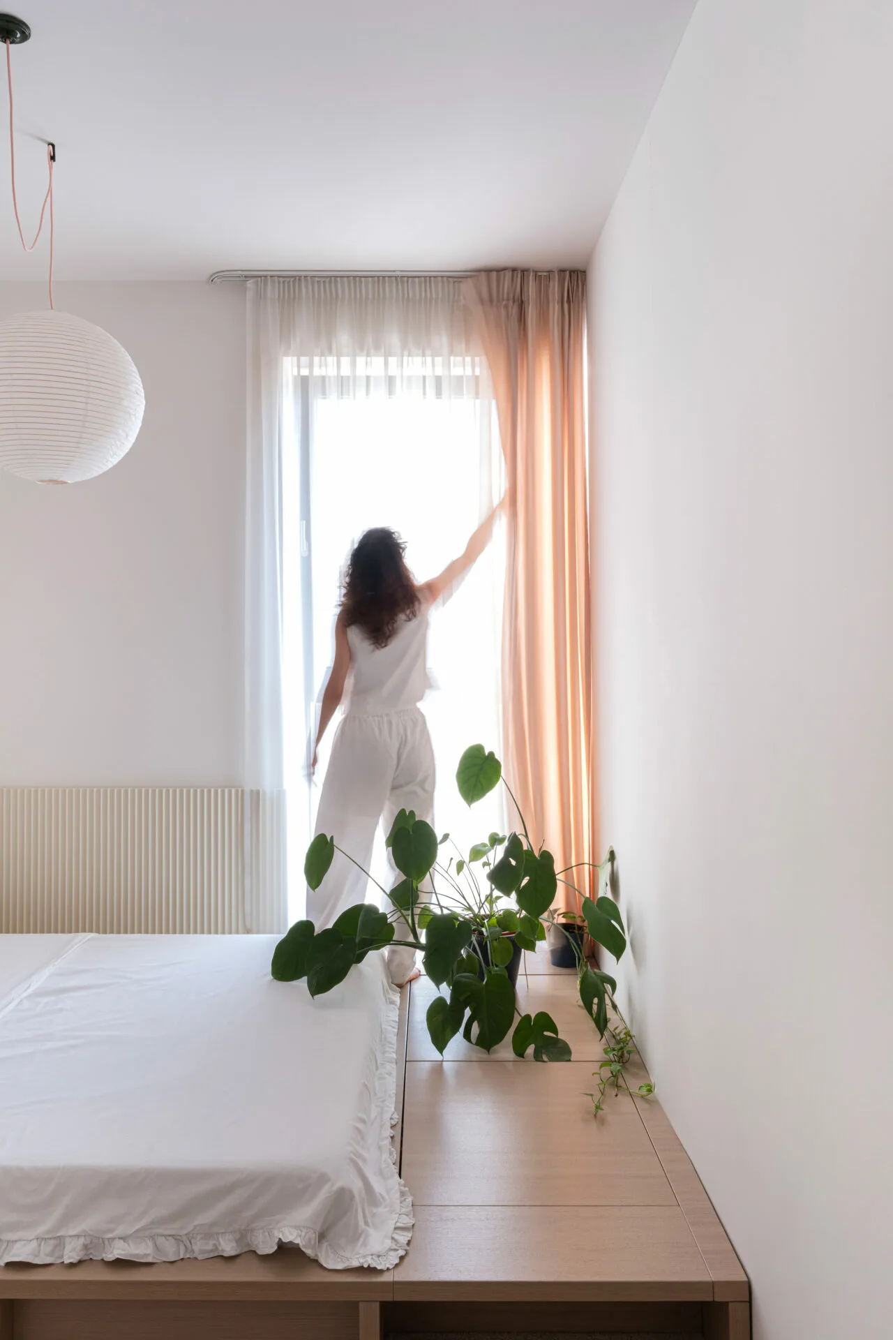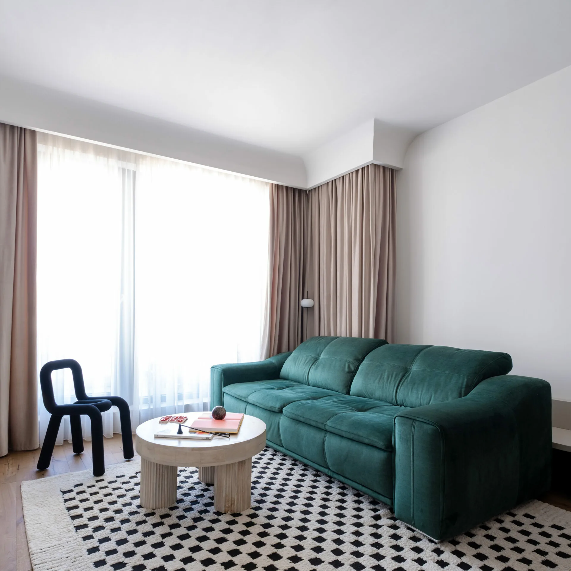 Proiectul Apartamentul F112 este situat la ultimul etaj al unui complex rezidențial relativ nou din București și propune o compartimentare simplă, convențională, adaptată unei locuințe cu două camere. Încă de la prima vizită, soluția principală s-a conturat în jurul unui detaliu specific prezent în spațiu – o treaptă – interiorul fiind situat la o cotă diferită față de exterior. Pornind de la acest „pas”, fiecare rezolvare a proiectului vine în completarea lui, îl aduce în prim-plan, subtil, nu ca element contrastant, ci ca o intenție care prinde formă și se modelează în funcție de fiecare cameră în parte și de rolul său funcțional. În contrast cu această intenție venită din partea biroului – liniaritate, simplitate, continuitate vizuală – beneficiarul, o tânără absolventă cu afinitate pentru artă, propune o alăturare mai puțin convențională de materiale, forme și culori. Astfel, printre altele, se remarcă cu ușurință nuanțele de verde, roz și albastru – pe alocuri. Fiecare dintre ele se etalează, diminuează sau umple, în funcție de locul unde sunt puse în scenă. Încercarea proiectului a fost, întocmai, această calibrare dintre formă și culoare, dintre obiect și spațiu. Revenind la planimetrie, se observă încă de la intrarea în apartament această deschidere către zona de zi a locuinței – un living generos care integrează firesc locul de luat masa – dar și legătura imediată cu bucătăria. Propusă ca o închidere de tip glasvand, trecerea spre zona de gătit a fost mărită intenționat pentru o comunicare cât mai directă și transparentă între camere, cu posibilitatea de a fi și complet deschisă dacă se dorește acest lucru. Mai departe, holul intermediar ne conduce către zona mai privată, a casei – grupul sanitar și dormitorul. Grupul sanitar, definit de un contur destul de compus inițial, ajunge să descrie aceste două nișe special gândite pentru duș și lavoar. Deloc întâmplător întâlnim într-o proporție mare cele două culori puternice ale amenajării: verde și roz – în contradicție cu pereții care au rămas albi. Accesul în zona umedă a băii, în cabina de duș, este delimitată de acest element “portal” care urmărește linia rozului. Dormitorul se regăsește la cealaltă extremă, fiind cel mai liniștit loc al casei. Învăluită într-o nuanță caldă de alb, camera propune o mobilare care să elibereze centrul prin integrarea patului în această platformă din lemn, ca o prelungire a pervazului. Treapta își face simțită prezența în detalii particulare precum: plinta ceramică continuuă – în camera de zi, bucătărie, hol și baie – care incorporează discret și construcția de sub TV, inserția de oglindă din partea de jos a partiției de stică, mobilierul custom in forma de „L” și platforma suport pentru pat. Fiecare poate fi interpretat ca element de conturare și uniformizare a spațiului, marcând limite și profunzimi.