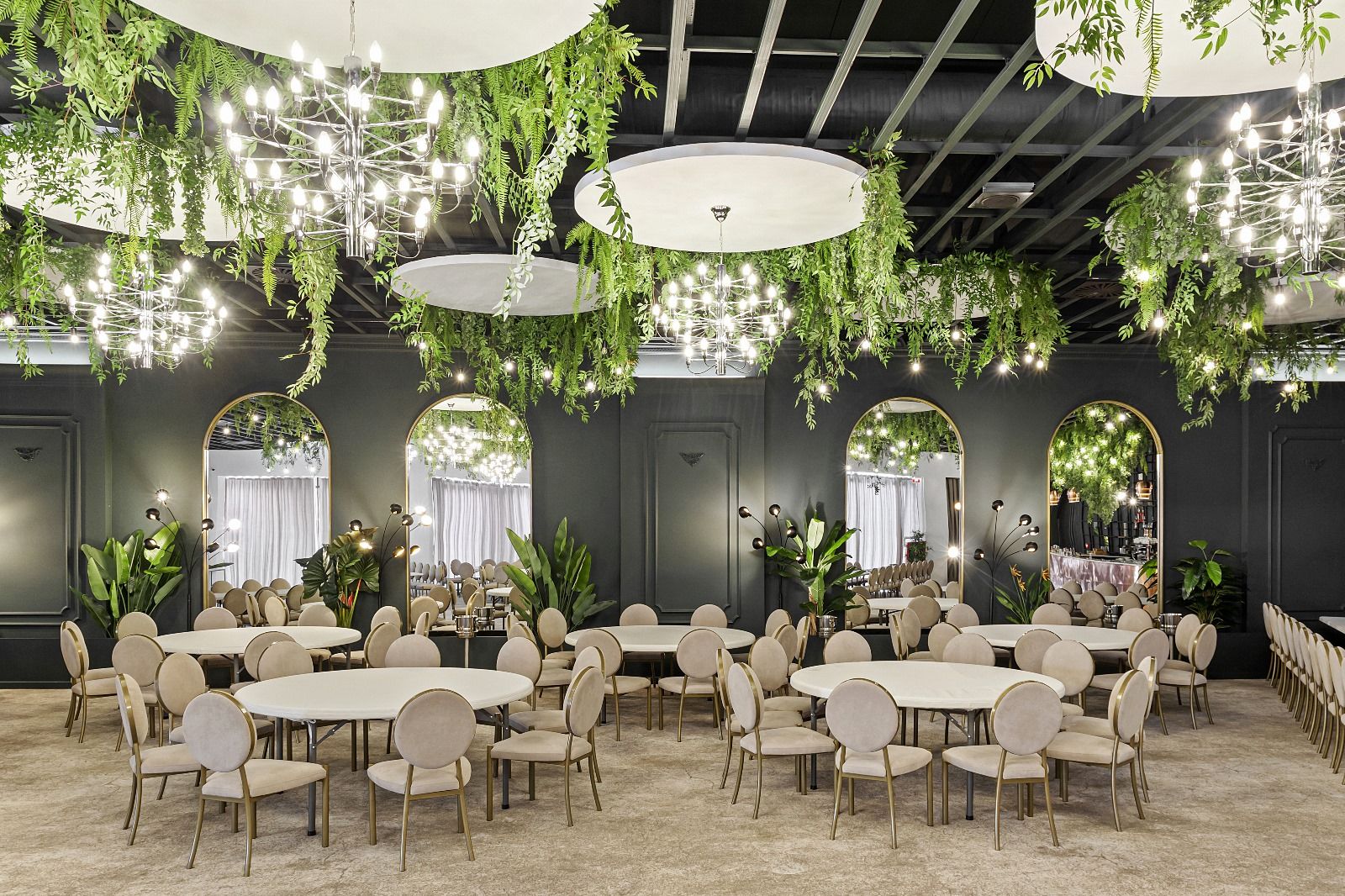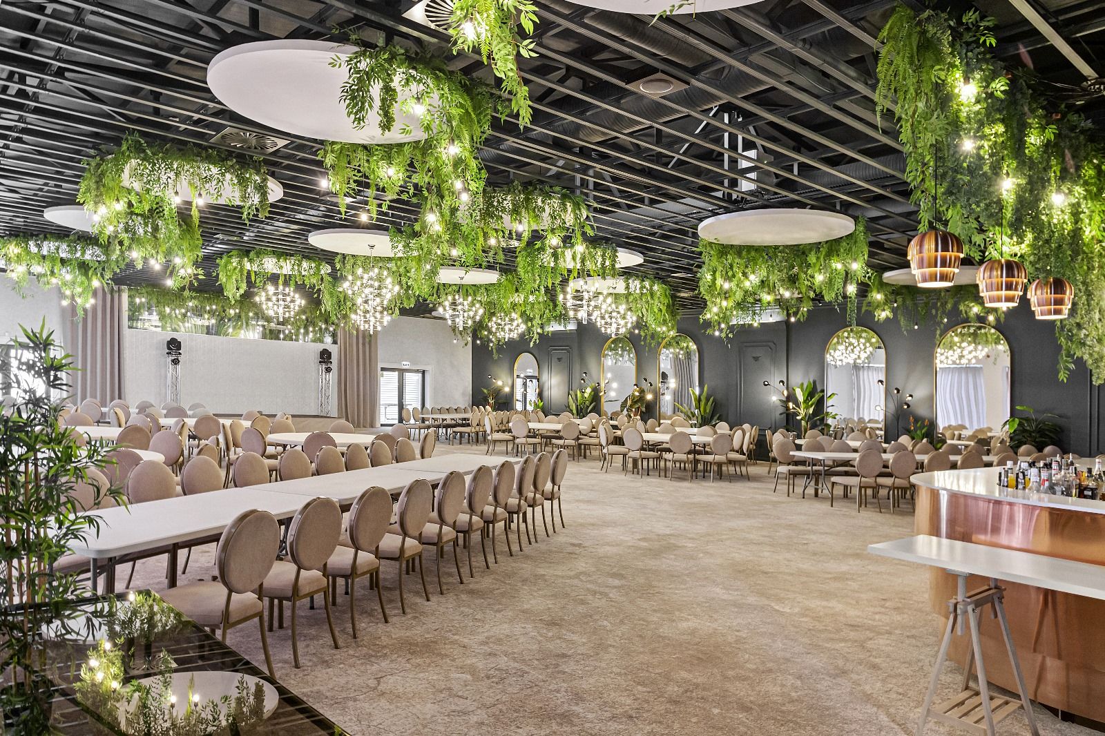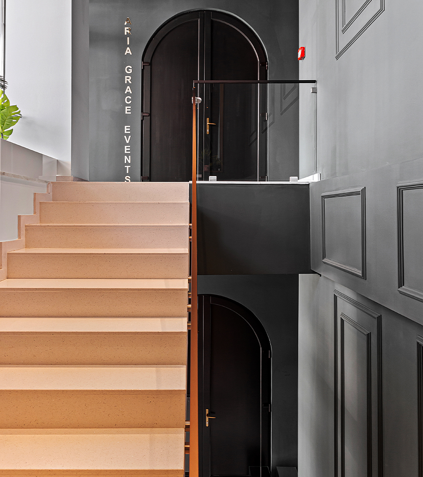 Amenajarea sălii de evenimente Aria Grace Events își propune să îmbine stilul industrial specific Municipiului Pitești cu stilul modern și cu vegetația luxuriantă, astfel încât să rezulte un spațiu care își acceptă cu demnitate originile și în același timp îmbrățișează liniile moderne, actuale. Înălțimea sălii este mică în raport cu nevoile spațiului, astfel că s-a optat pentru menținerea grinzilor aparente, precum și a instalațiilor de ventilație ce au fost vopsite în culoarea negru petrol, în ideea de a păstra ca bază imaginea industrială.
