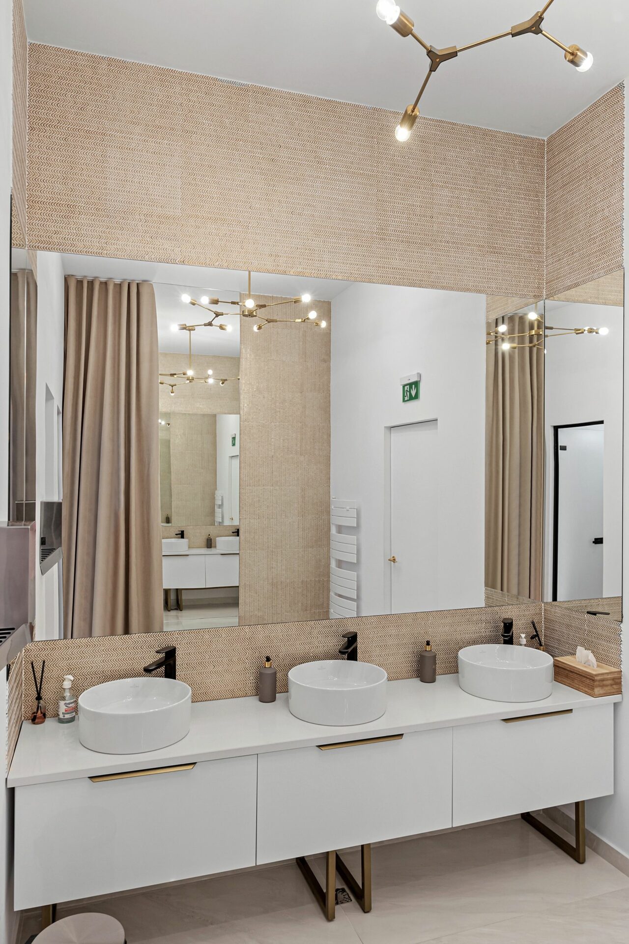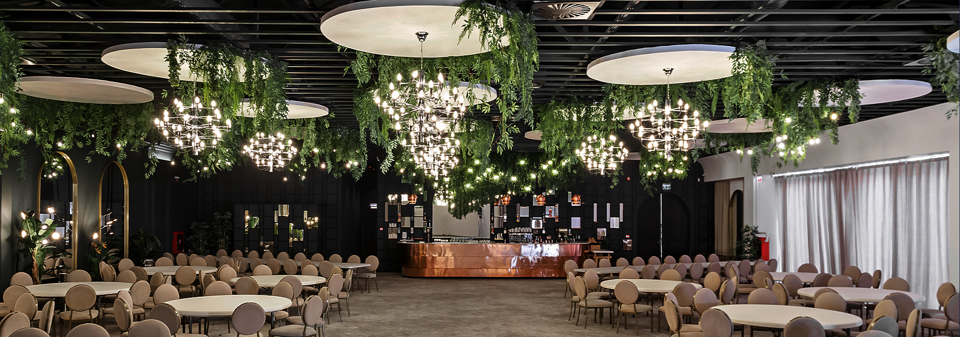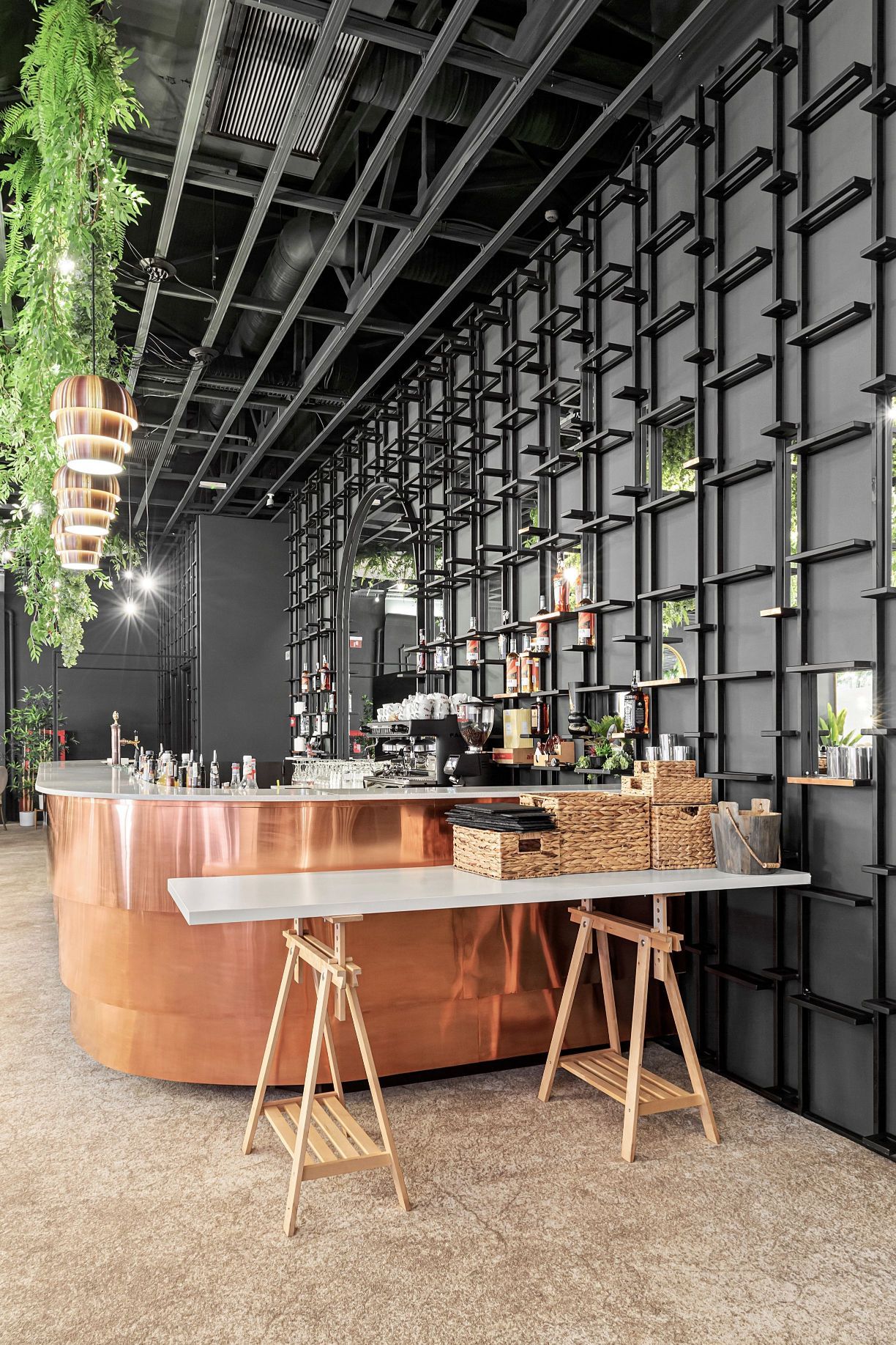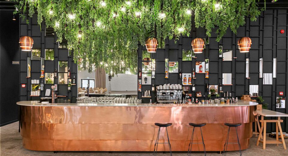 Pentru a atenua culoarea închisă și muchiile dure ale tavanului industrial s-a montat deasupra fiecărei mese câte o „umbrelă”- un tavan fals în formă de cerc din centrul căruia coboară un candelabru elegant; perimetral tavanului fals coboară subtil plante ornamentale cu o coloristică vie (galben-verzui) care aduc viață în spațiul rece, industrial. Oglinzile cu arce în plin cintru amplasate pe pereții perimetrali ai sălii îndulcesc imaginea industrială si oferă profunzime și lumină spațiului, prin reflexie. Zona barului a fost tratată într-o manieră industrială însă în contrast cromatic cu restul sălii prin culoarea și textura cuprului, astfel că a barul a devenit un pol care atrage permanent grupuri de oameni care aleg să socializeze aici. În ansamblu a rezultat un spațiu cald și efervescent în același timp, obținut prin contrastul culorilor și al materialelor și nu în ultimul rând prin aportul luminii naturale și artificiale.