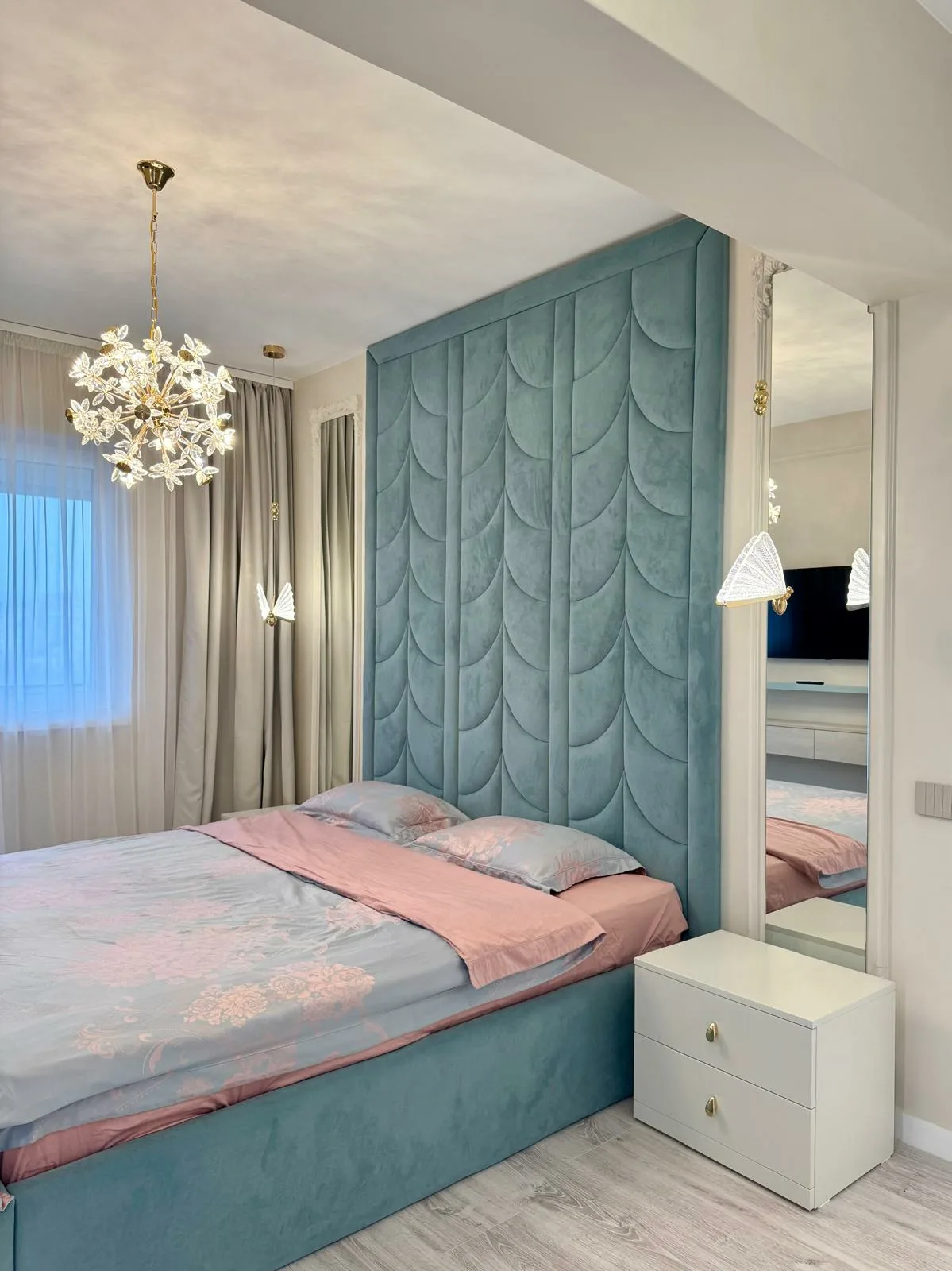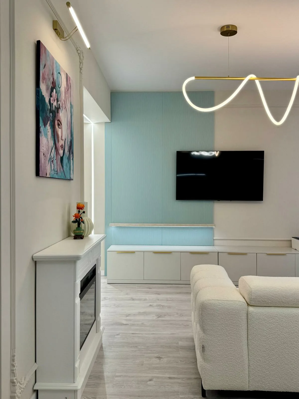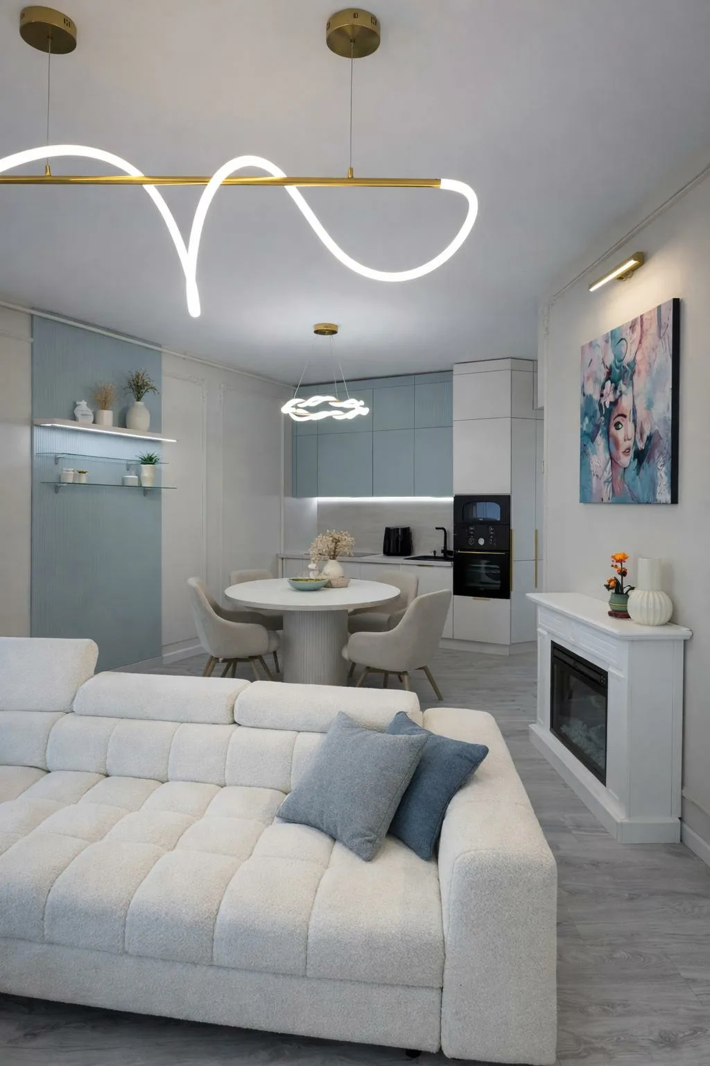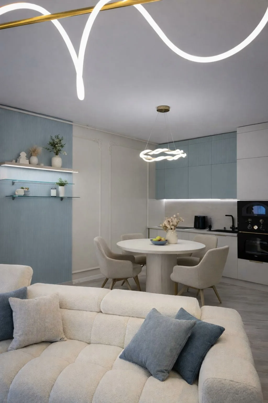 Paleta cromatică este construită în jurul nuanțelor deschise – bejuri calde, griuri luminoase și accente pastelate de albastru – care amplifică senzația de spațiu și lumină naturală. Materialele sunt alese pentru a crea un dialog subtil între suprafețe mate, textile moi și elemente cu finisaj metalic, folosite punctual pentru a adăuga rafinament. Zona de zi este organizată fluid, cu un living generos și o bucătărie deschisă, integrate într-un ansamblu coerent. Corpurile de iluminat devin elemente-cheie de design, cu forme sculpturale ce adaugă dinamism și identitate spațiului. Dormitorul este tratat ca un refugiu vizual, unde texturile textile, panourile tapitate și iluminatul ambiental creează o atmosferă intimă și relaxantă.