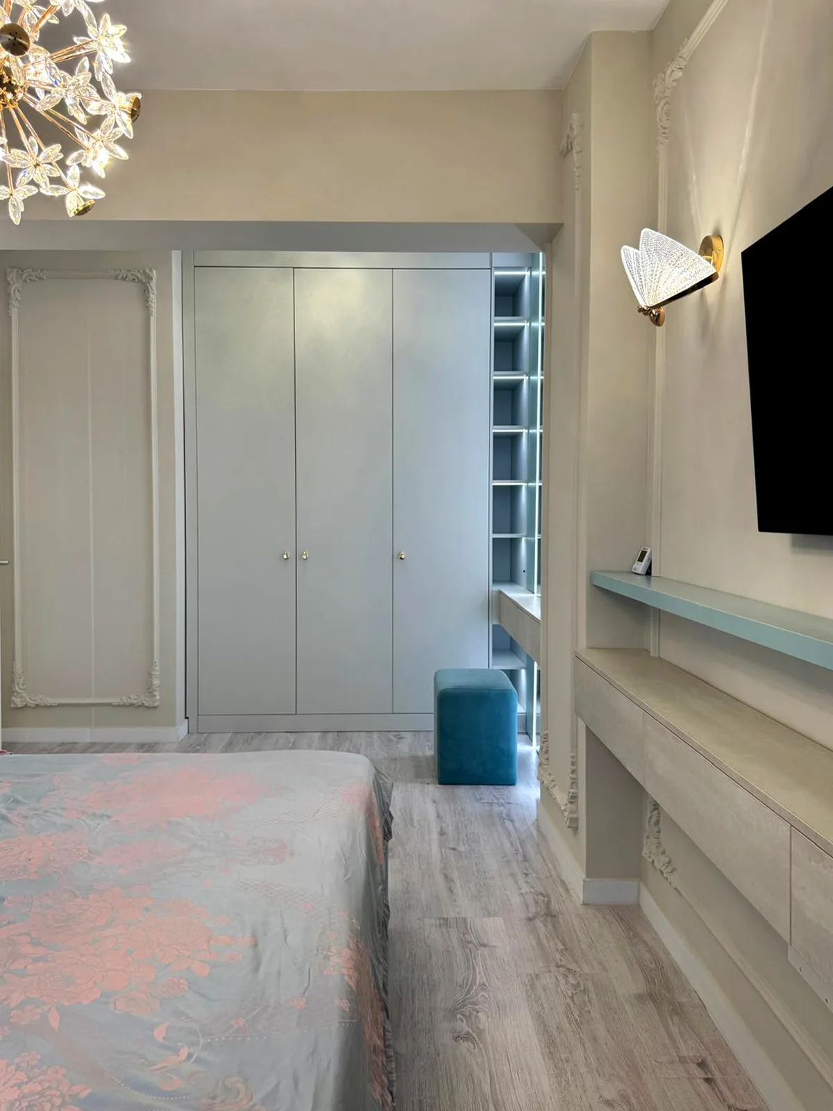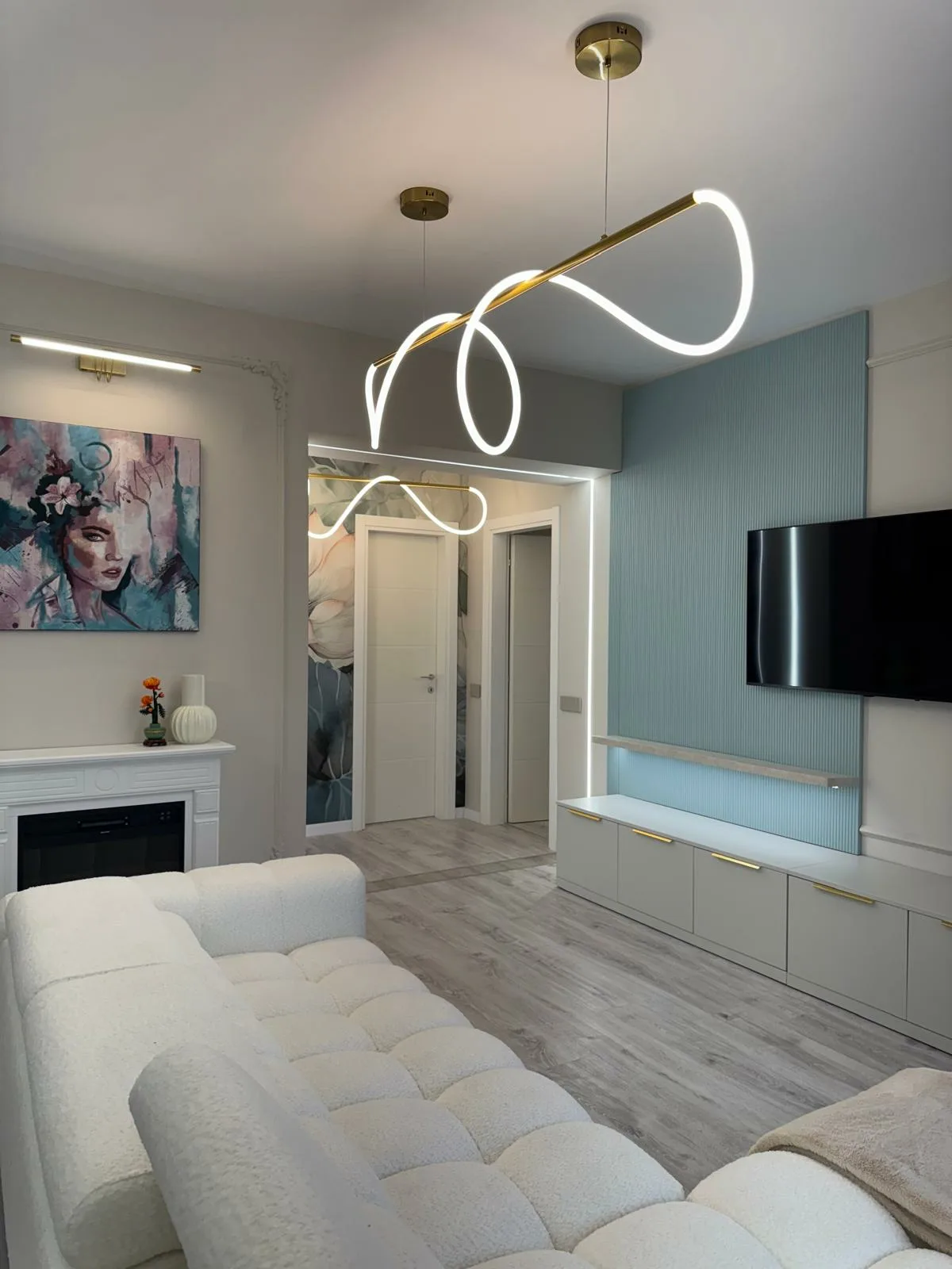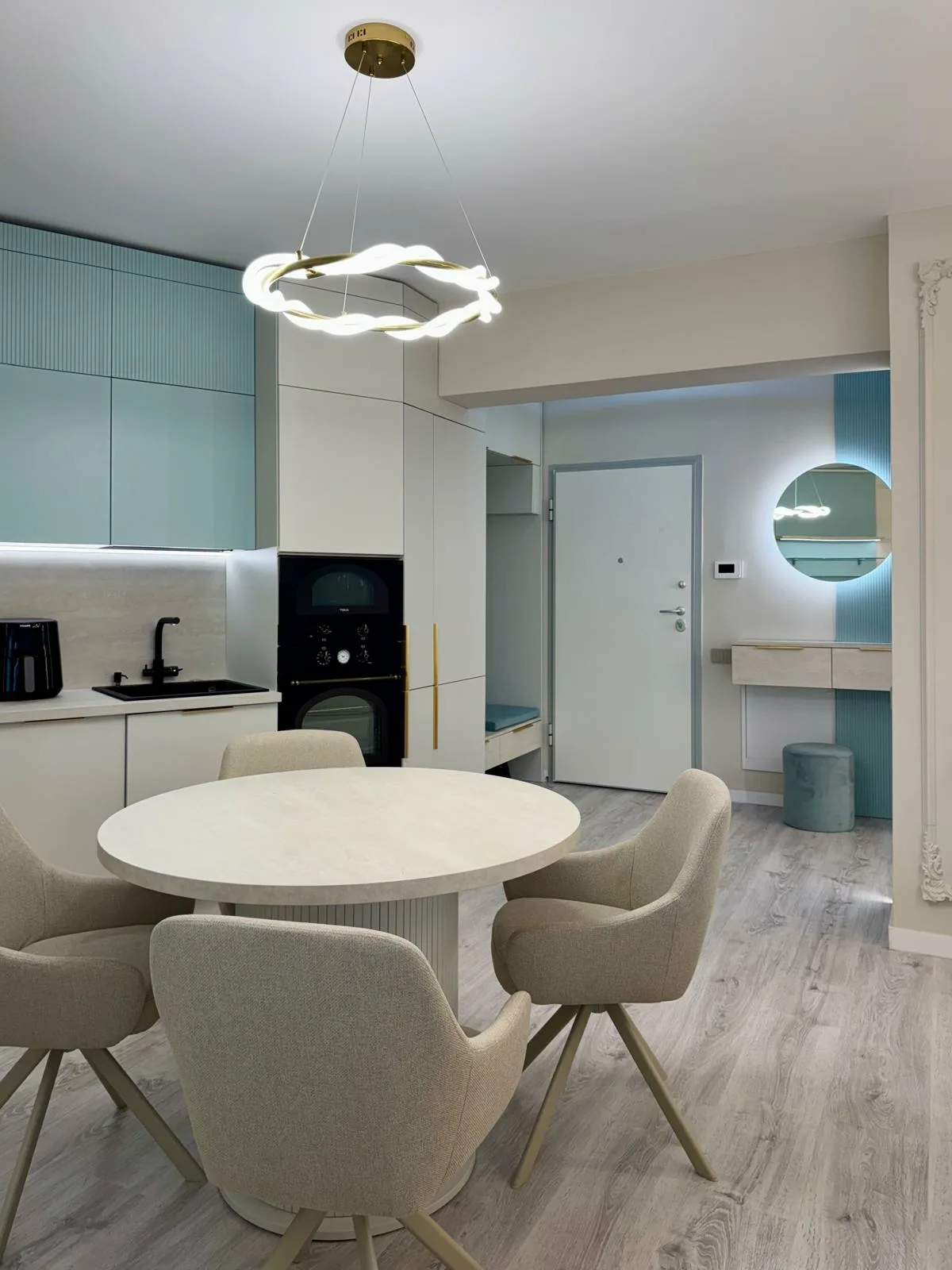 Paleta cromatică este construită în jurul nuanțelor deschise – bejuri calde, griuri luminoase și accente pastelate de albastru – care amplifică senzația de spațiu și lumină naturală. Materialele sunt alese pentru a crea un dialog subtil între suprafețe mate, textile moi și elemente cu finisaj metalic, folosite punctual pentru a adăuga rafinament. Zona de zi este organizată fluid, cu un living generos și o bucătărie deschisă, integrate într-un ansamblu coerent. Corpurile de iluminat devin elemente-cheie de design, cu forme sculpturale ce adaugă dinamism și identitate spațiului. Dormitorul este tratat ca un refugiu vizual, unde texturile textile, panourile tapitate și iluminatul ambiental creează o atmosferă intimă și relaxantă.