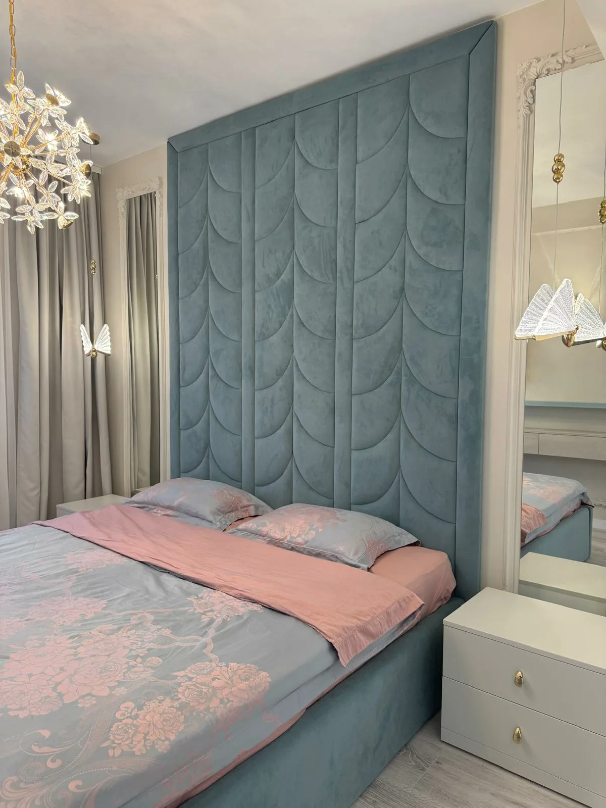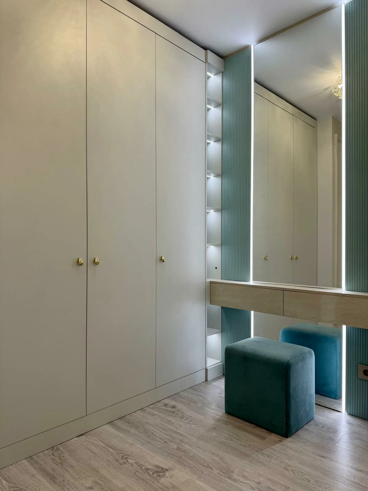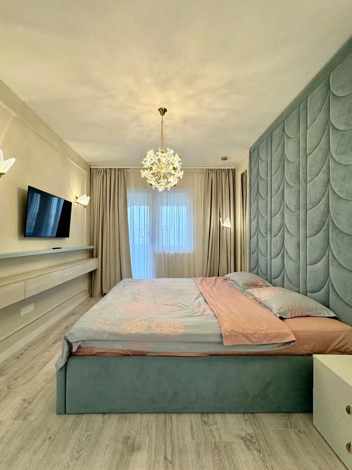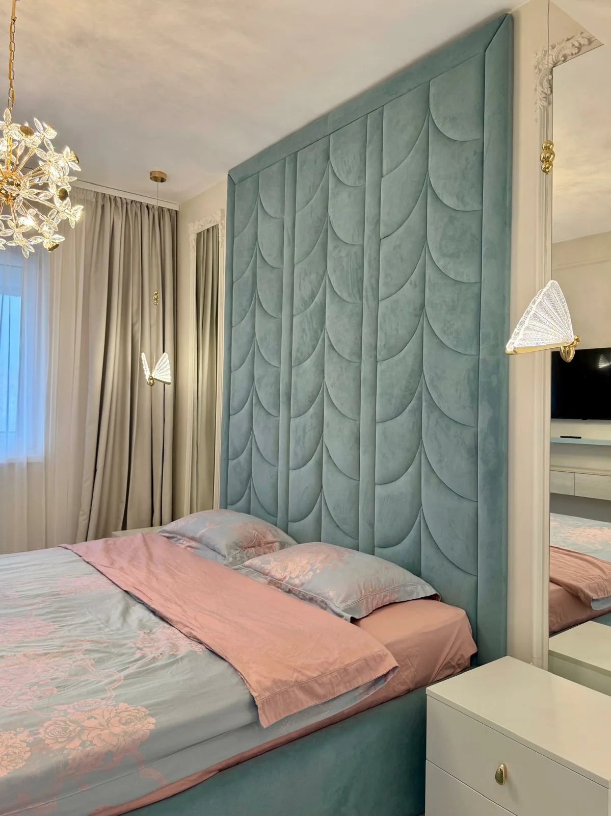 Paleta cromatică este construită în jurul nuanțelor deschise – bejuri calde, griuri luminoase și accente pastelate de albastru – care amplifică senzația de spațiu și lumină naturală. Materialele sunt alese pentru a crea un dialog subtil între suprafețe mate, textile moi și elemente cu finisaj metalic, folosite punctual pentru a adăuga rafinament. Zona de zi este organizată fluid, cu un living generos și o bucătărie deschisă, integrate într-un ansamblu coerent. Corpurile de iluminat devin elemente-cheie de design, cu forme sculpturale ce adaugă dinamism și identitate spațiului. Dormitorul este tratat ca un refugiu vizual, unde texturile textile, panourile tapitate și iluminatul ambiental creează o atmosferă intimă și relaxantă.