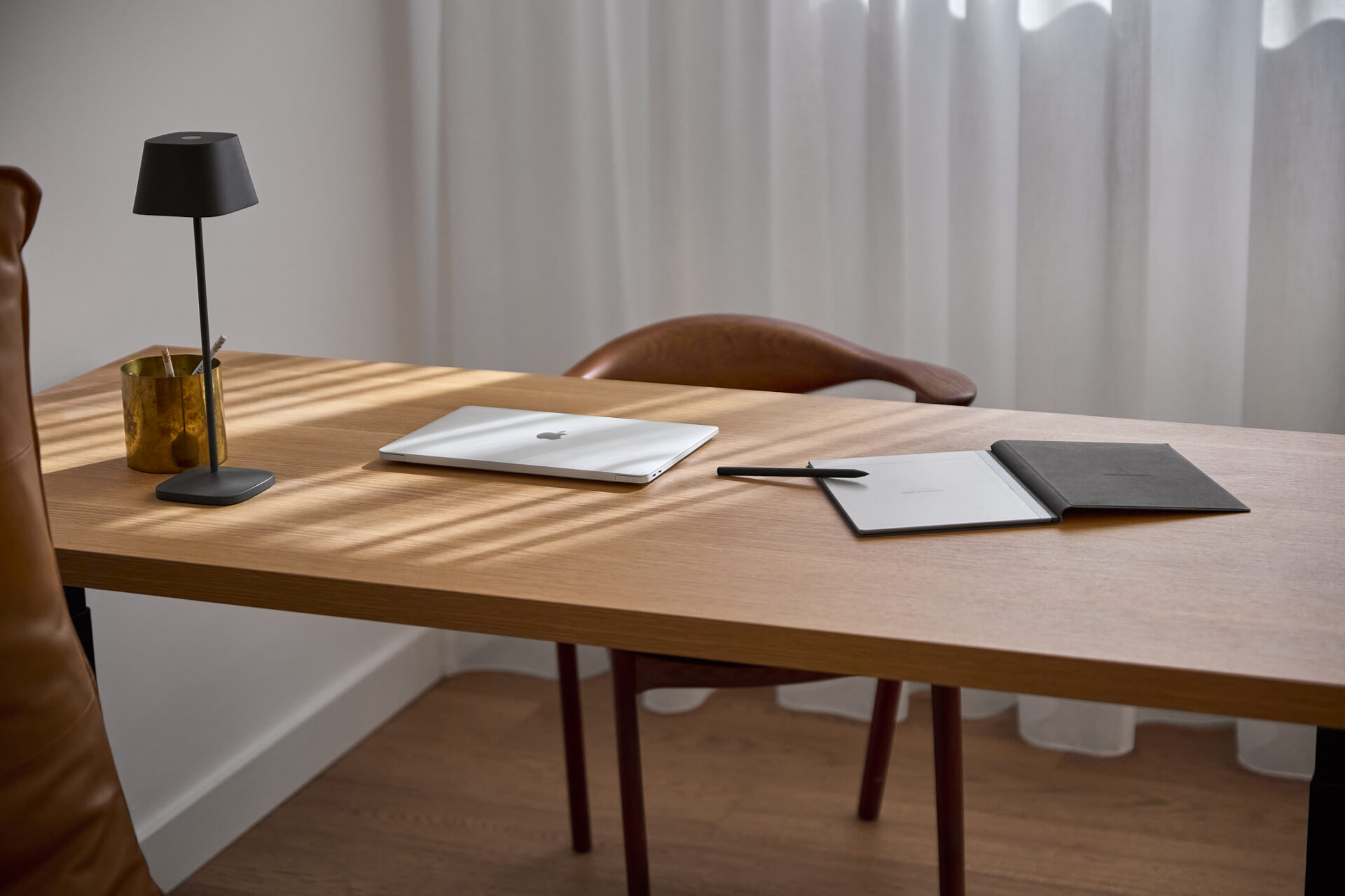 Apoi, al doilea aspect, dar la fel de important ca primul menționat, ar fi acela al creării unei case actuale stilistic, dar cu puternice influențe mid-century, mai ales la nivelul unor piese de mobilier sau iluminat din acei ani, licitate și restaurate cu mult entuziasm și grijă. La nivelul materialelor, nu există variații majore, am folosit 3 mari game: lemnul natural de stejar, terrazzo și tapițerii în nuanțe deschise. Acestea sunt puse în evidență cu ajutorul unor accente metalice negre.