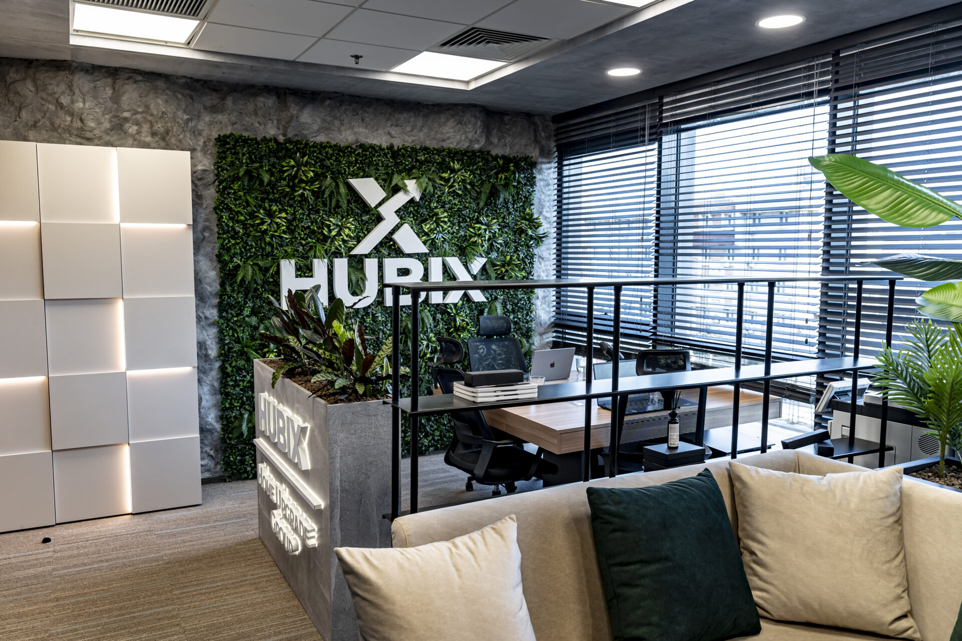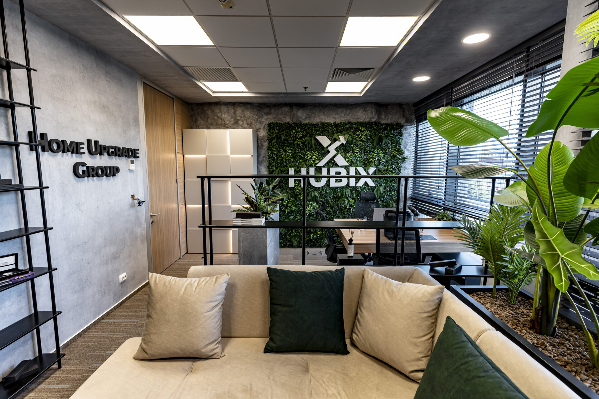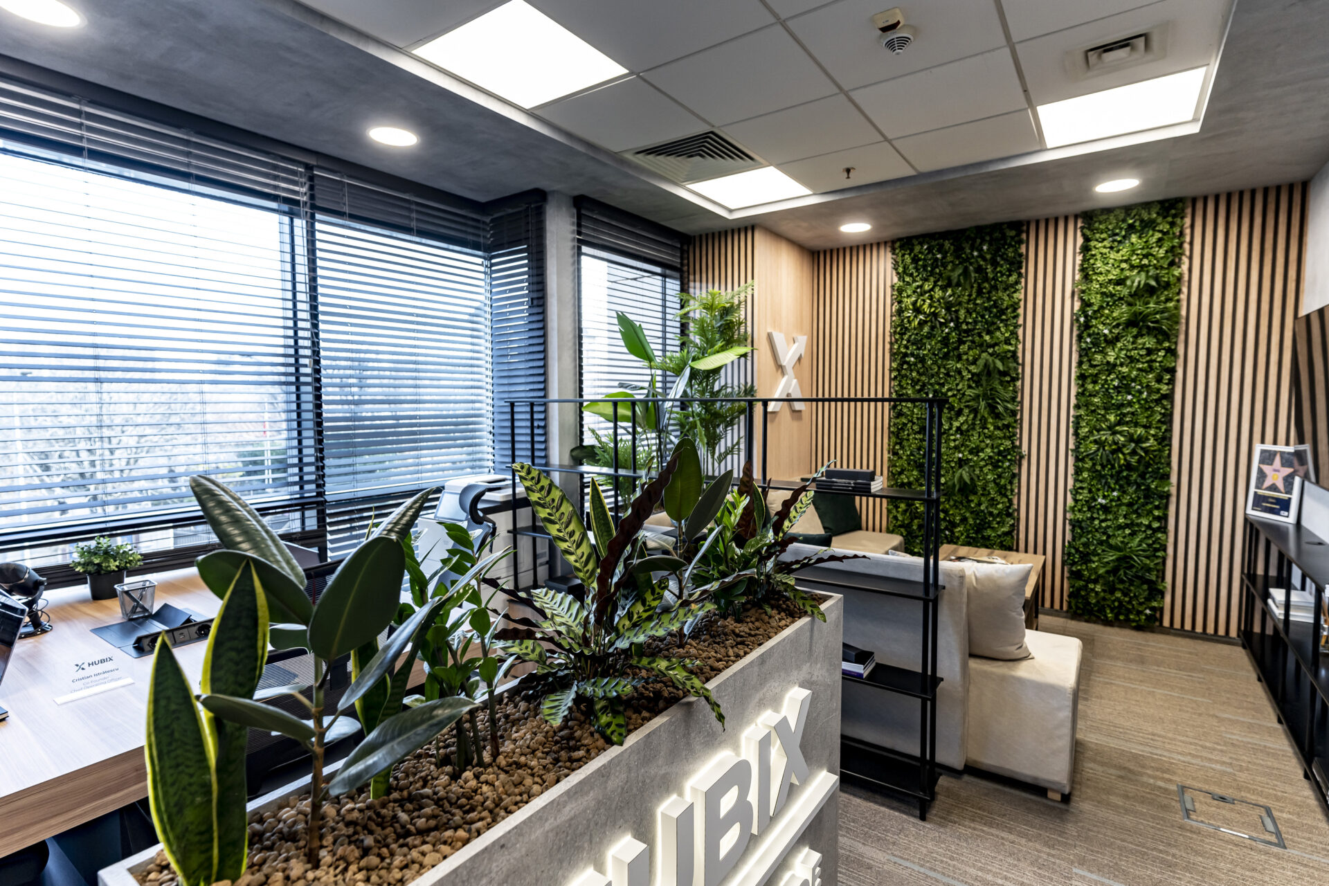 Proiectul de amenajare a biroului Hubix a demonstrat că și într-un spațiu compact de 24 mp se poate crea un mediu de lucru dinamic, inspirator și perfect adaptat nevoilor unui business modern. Împărțirea inteligentă a spațiului a permis crearea unor zone distincte, fiecare cu o funcție specifică. Fiecare piesă de mobilier a fost gândită pentru a maximiza funcționalitatea spațiului și pentru a crea un mediu de lucru organizat. Zona de colaborare creează un ambient informal și primitor pentru întâlniri și brainstorming, delimitată de zona de lucru printr-o bibliotecă realizată din metal. La intrarea în birou am plasat strategic o jardinieră multifuncțională, pentru o delimitare a spațiului și ca suport pentru o prezentare vizuală a parteneriatelor, prin intermediul denumirilor companiilor iluminate.