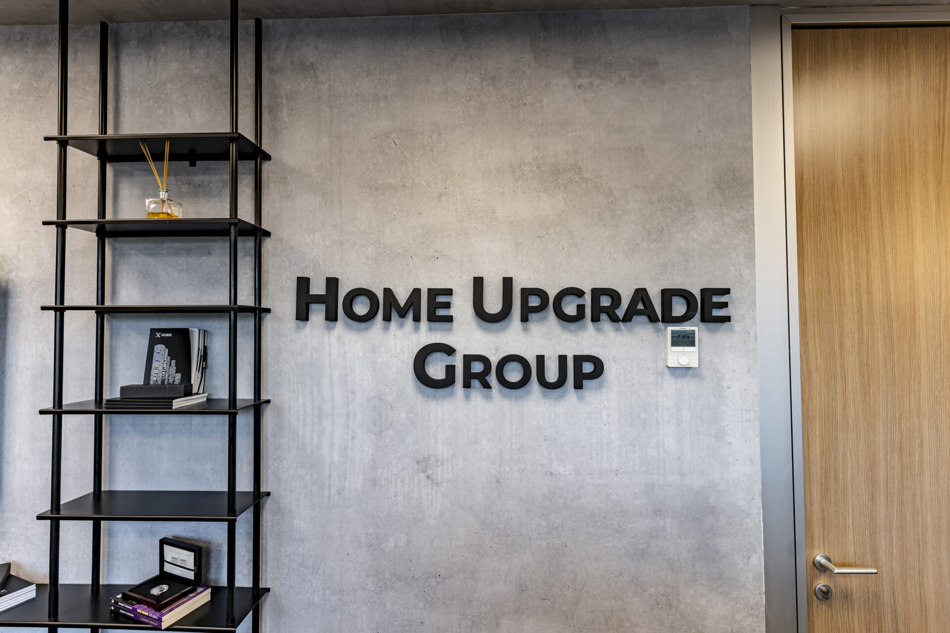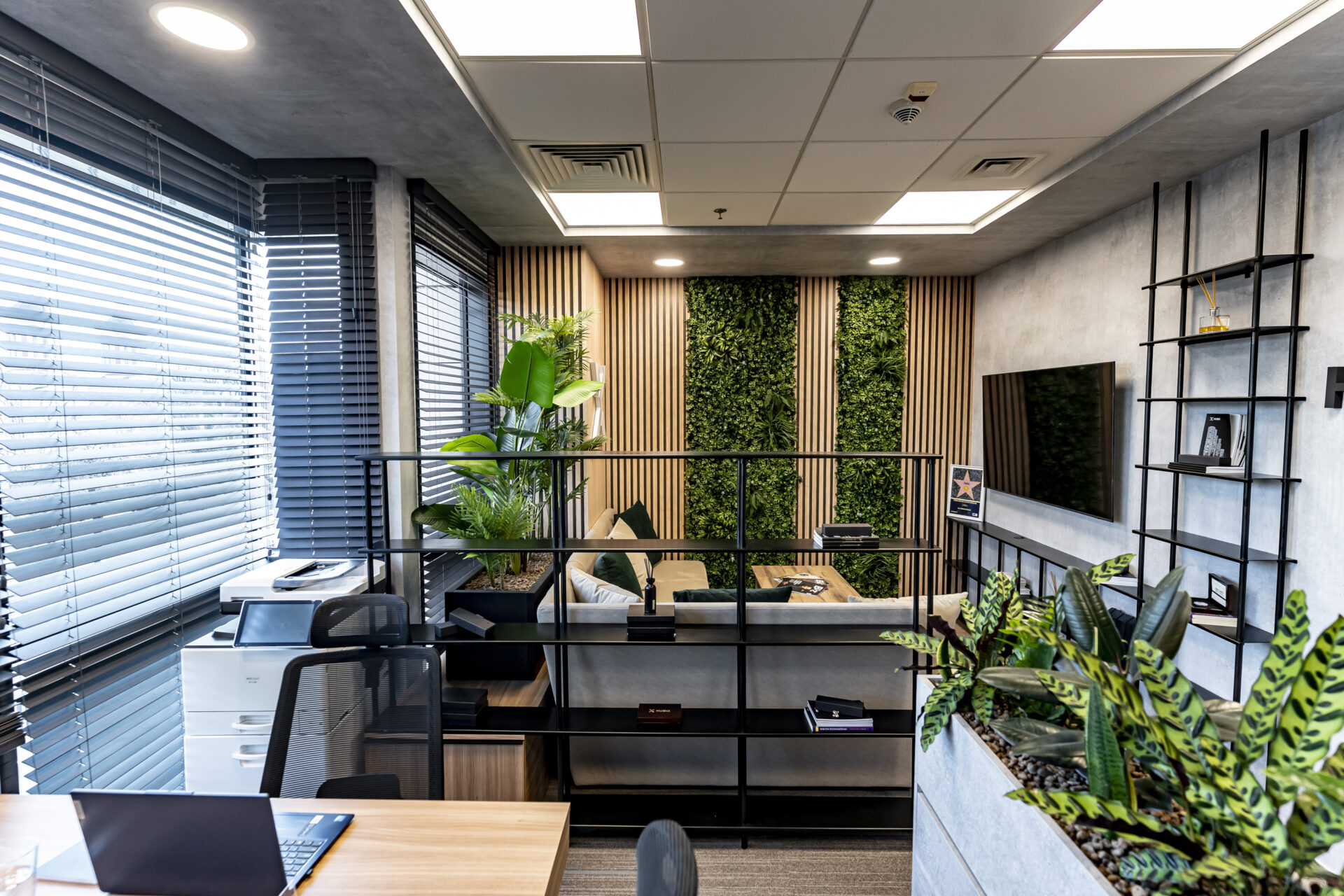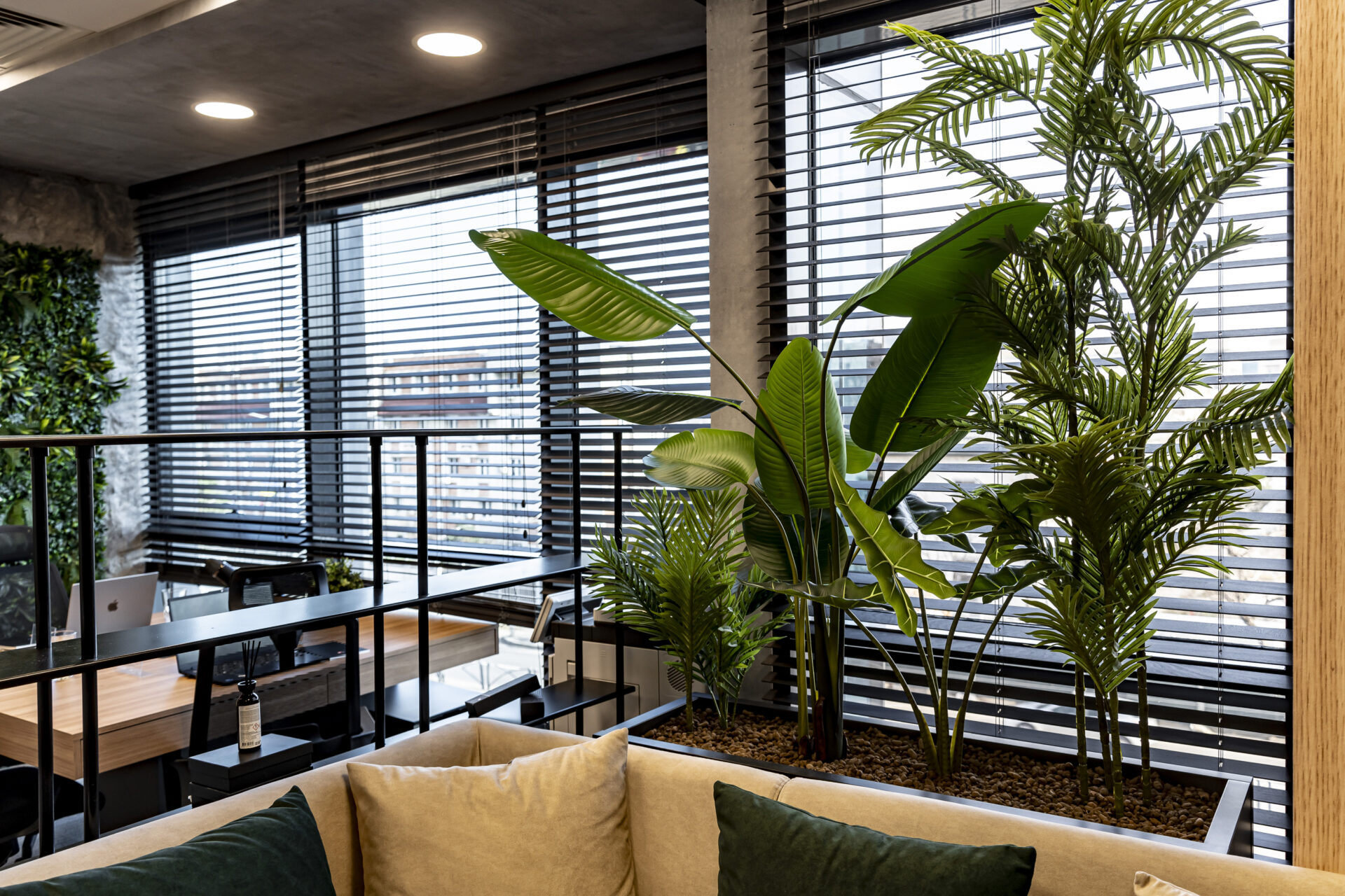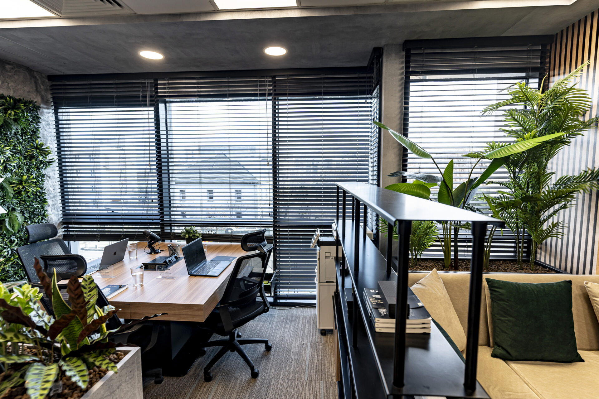 Dulapul cu uși din cuburi iluminate reprezintă un punct focal, adăugând o notă de eleganță și modernitate spațiului. Texturile de ciment și rocă, în contrast cu textura caldă a lemnului, creează o atmosferă autentică și durabilă. Liniile curate și geometria precisă a mobilierului conferă spațiului un aspect ordonat și profesionist. Paleta cromatică, dominată de nuanțe neutre și închise, creează o atmosferă de încredere și stabilitate, perfect aliniată cu identitatea masculină a brandului. Prin intermediul iluminatului, am accentuat detalii arhitecturale și am creat puncte focale care atrag atenția asupra elementelor cheie ale designului. Combinația dintre funcționalitate, design și elemente naturale a dus la crearea unui spațiu care îmbină productivitatea cu confortul, reflectând în același timp identitatea unică a brandului.
