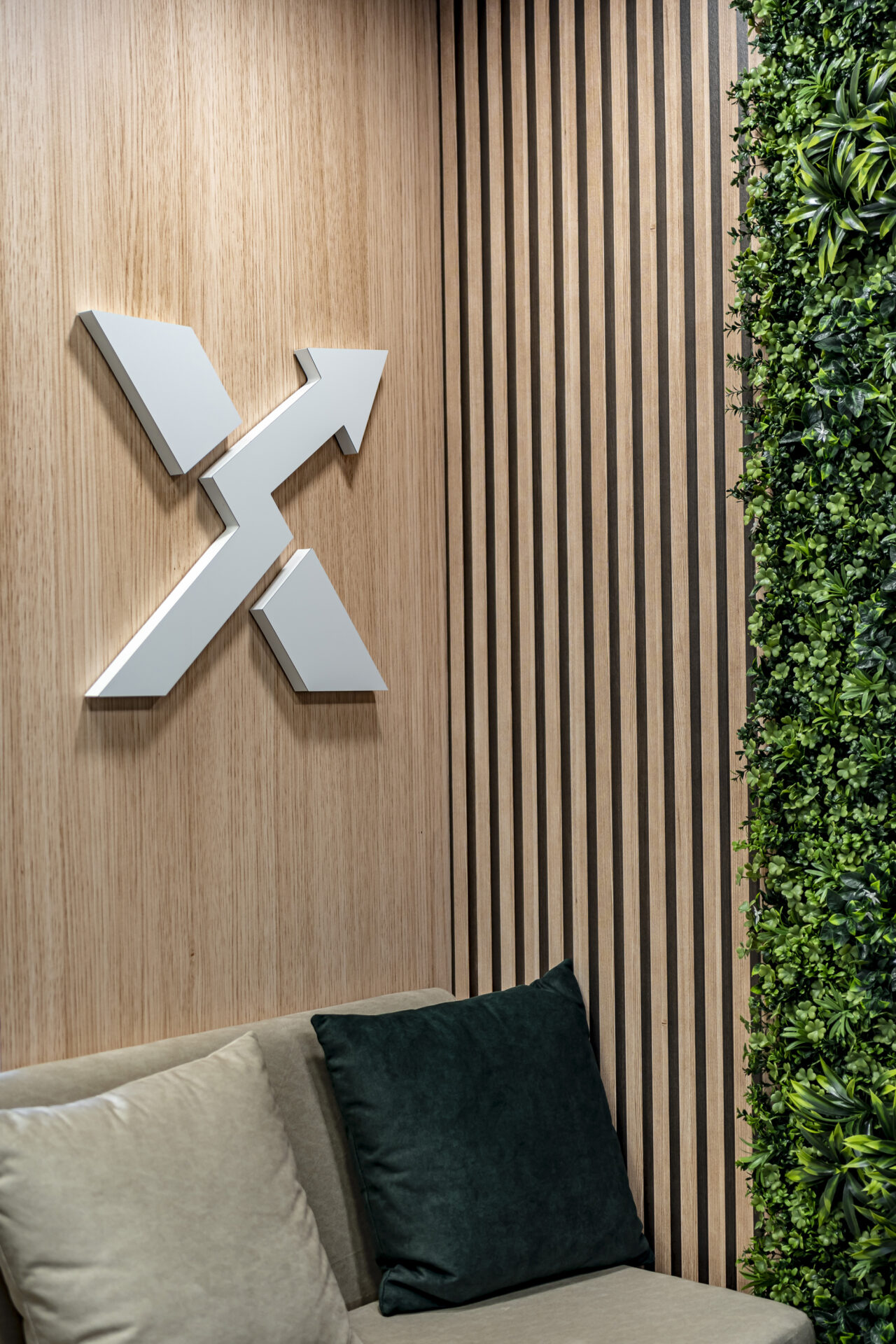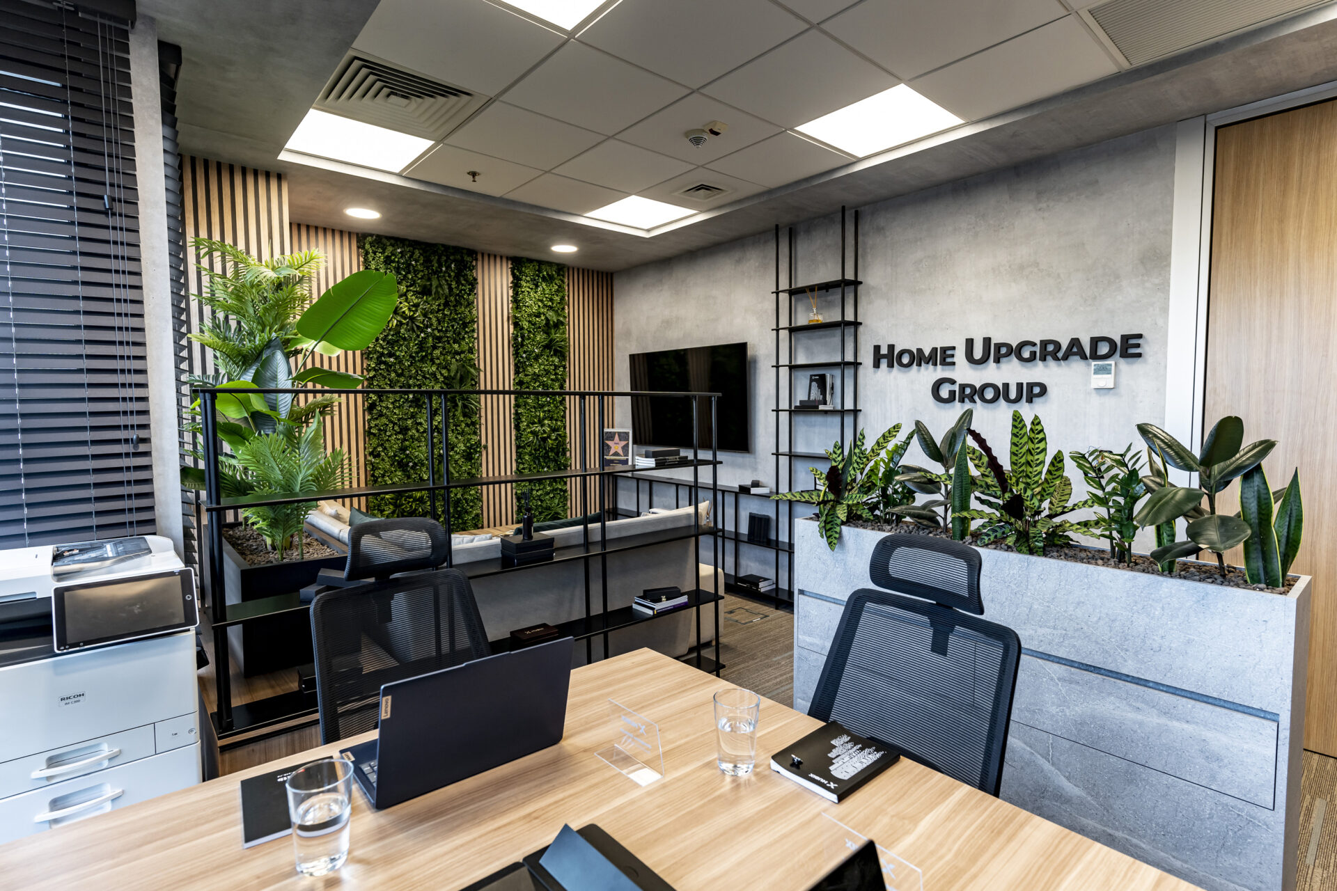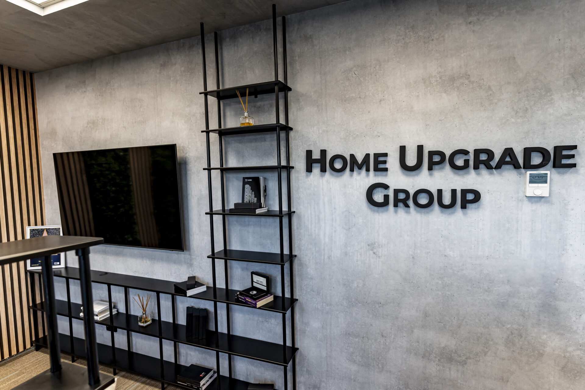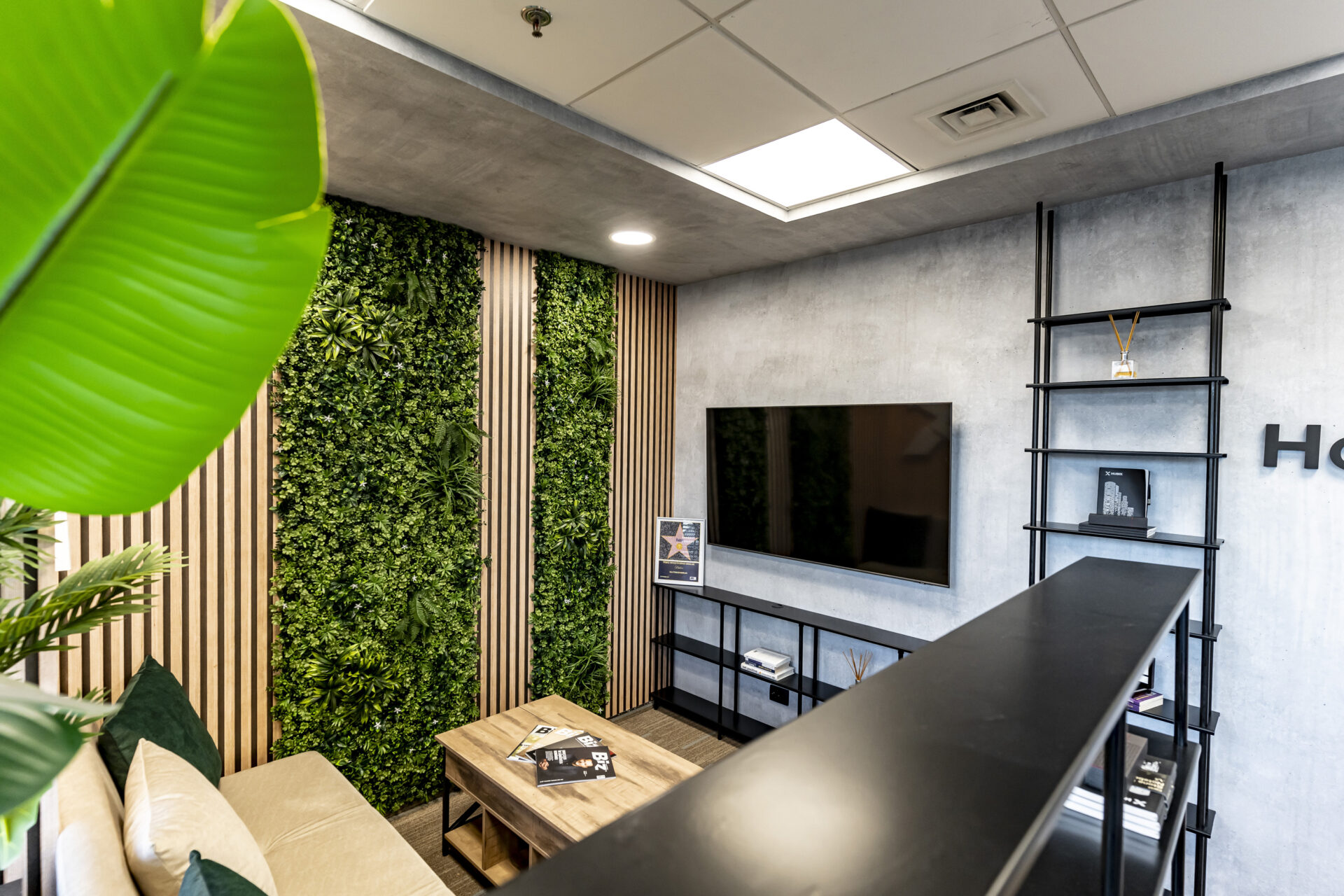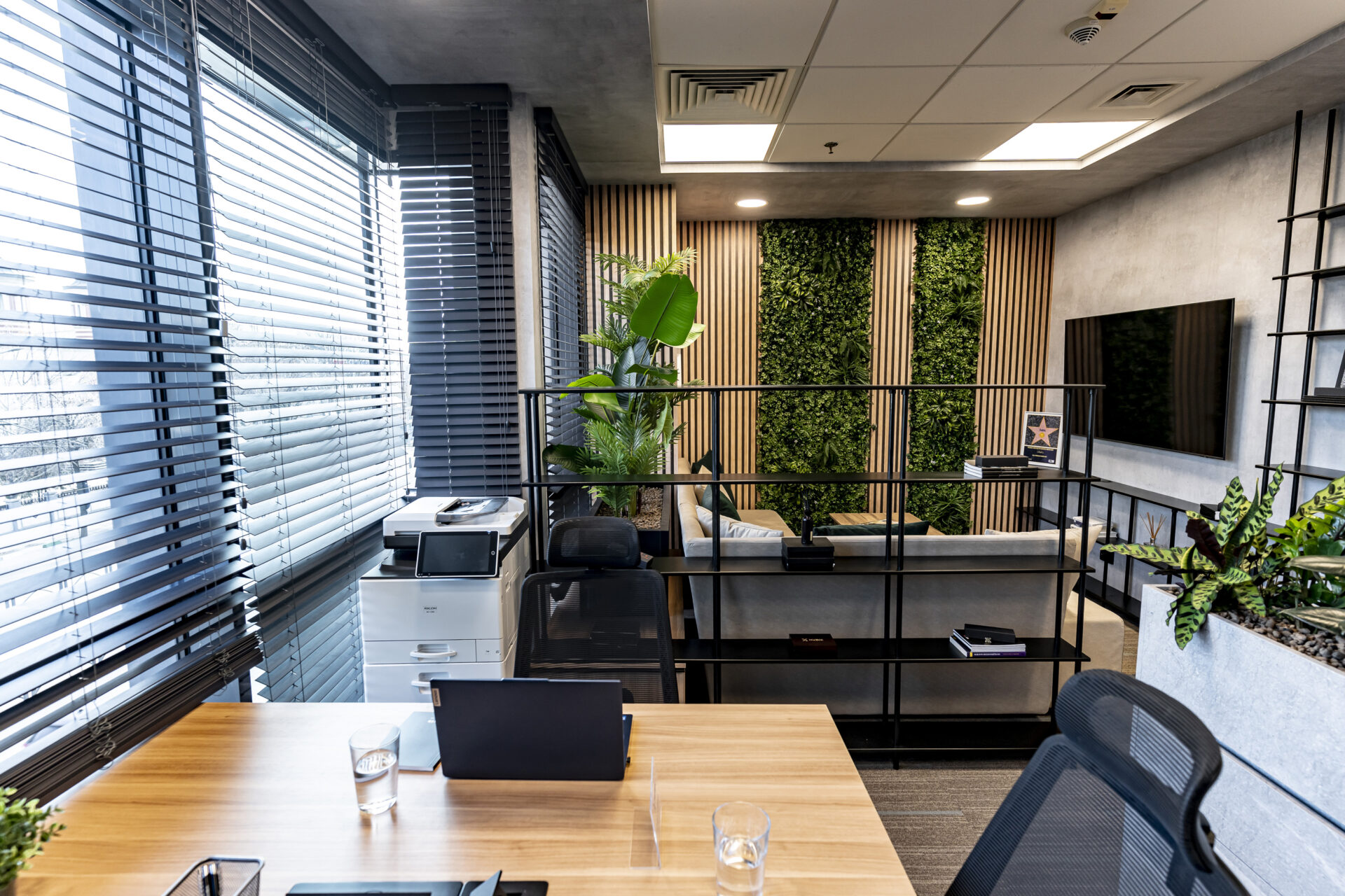 Dulapul cu uși din cuburi iluminate reprezintă un punct focal, adăugând o notă de eleganță și modernitate spațiului. Texturile de ciment și rocă, în contrast cu textura caldă a lemnului, creează o atmosferă autentică și durabilă. Liniile curate și geometria precisă a mobilierului conferă spațiului un aspect ordonat și profesionist. Paleta cromatică, dominată de nuanțe neutre și închise, creează o atmosferă de încredere și stabilitate, perfect aliniată cu identitatea masculină a brandului. Prin intermediul iluminatului, am accentuat detalii arhitecturale și am creat puncte focale care atrag atenția asupra elementelor cheie ale designului. Combinația dintre funcționalitate, design și elemente naturale a dus la crearea unui spațiu care îmbină productivitatea cu confortul, reflectând în același timp identitatea unică a brandului.