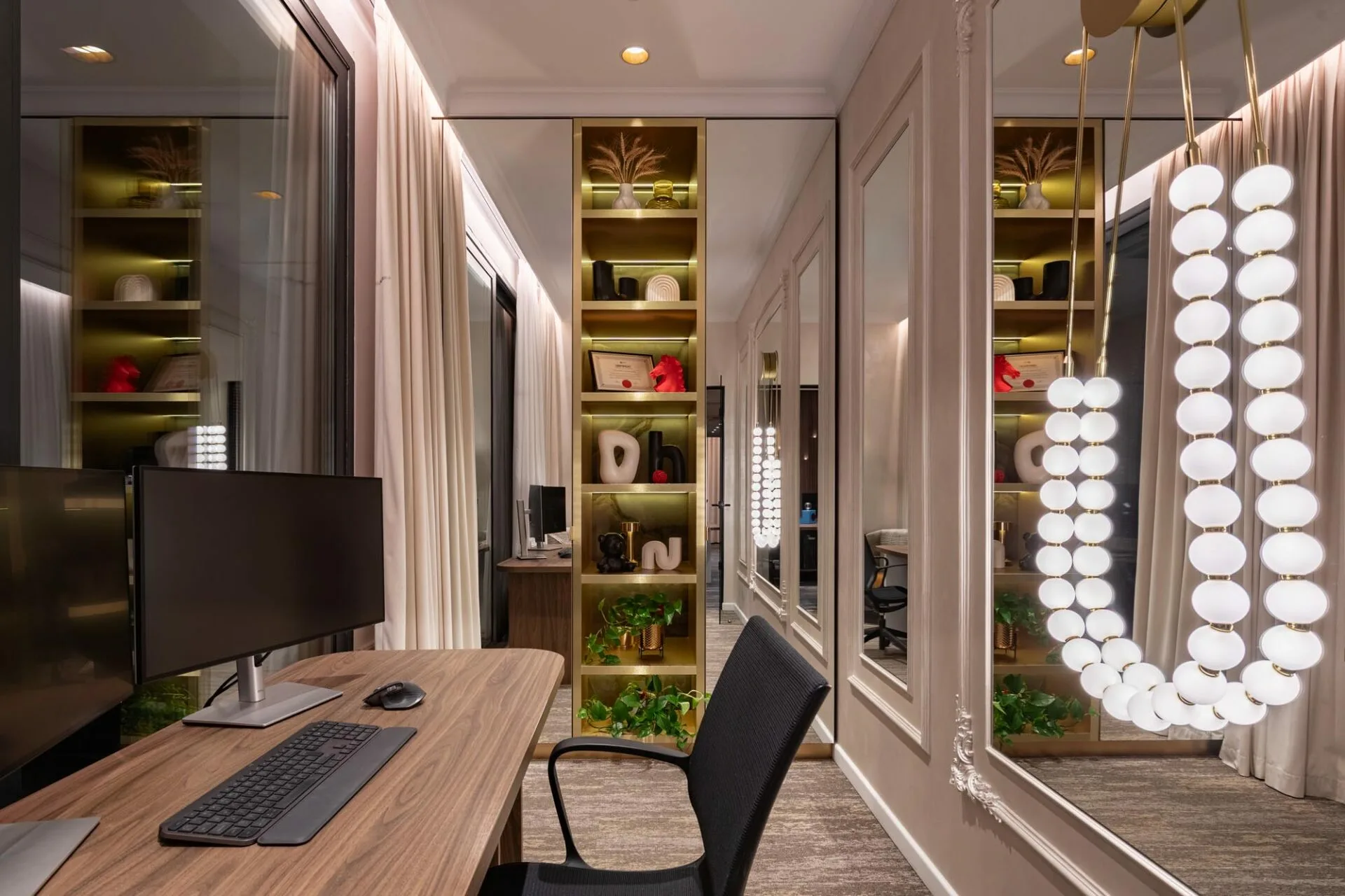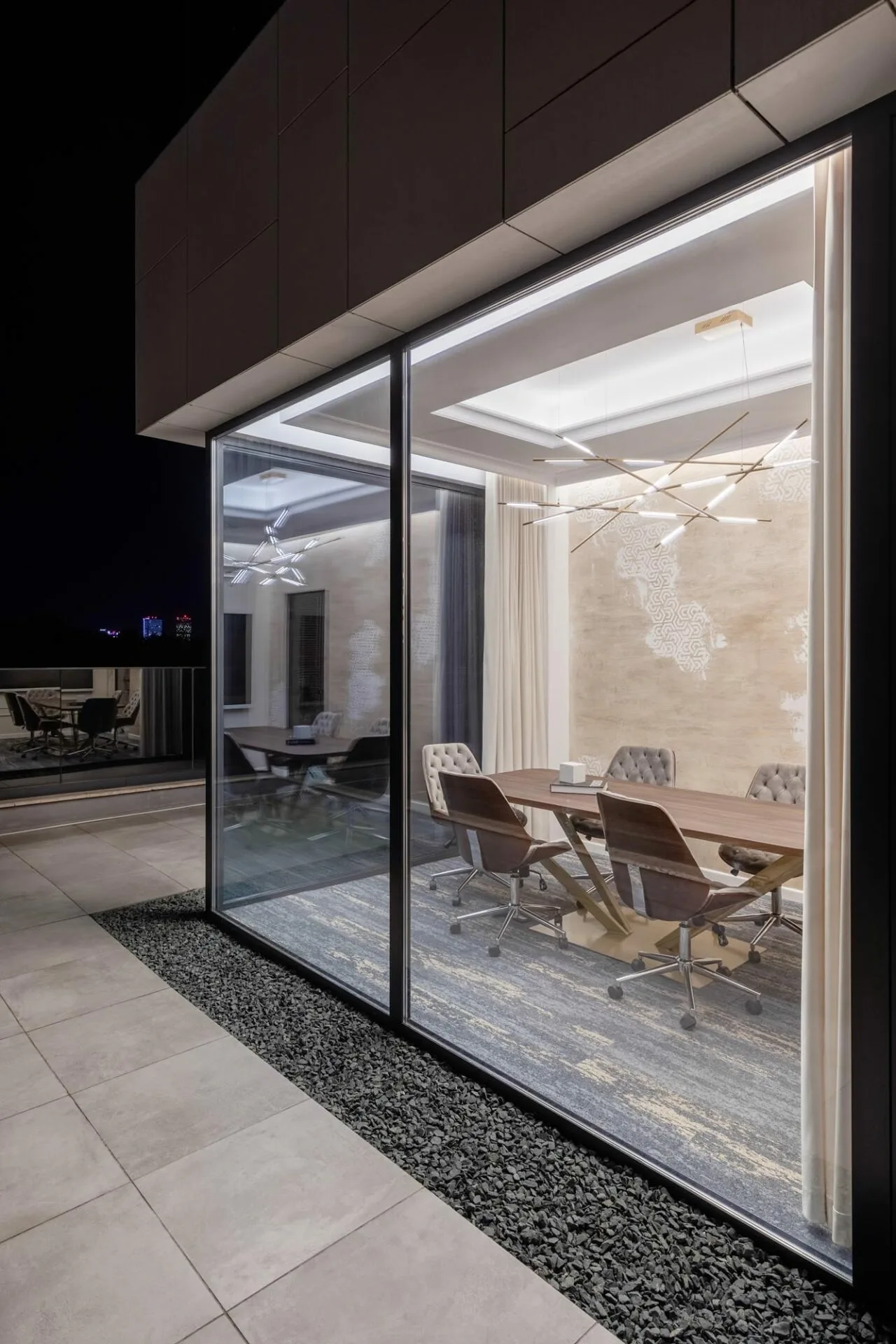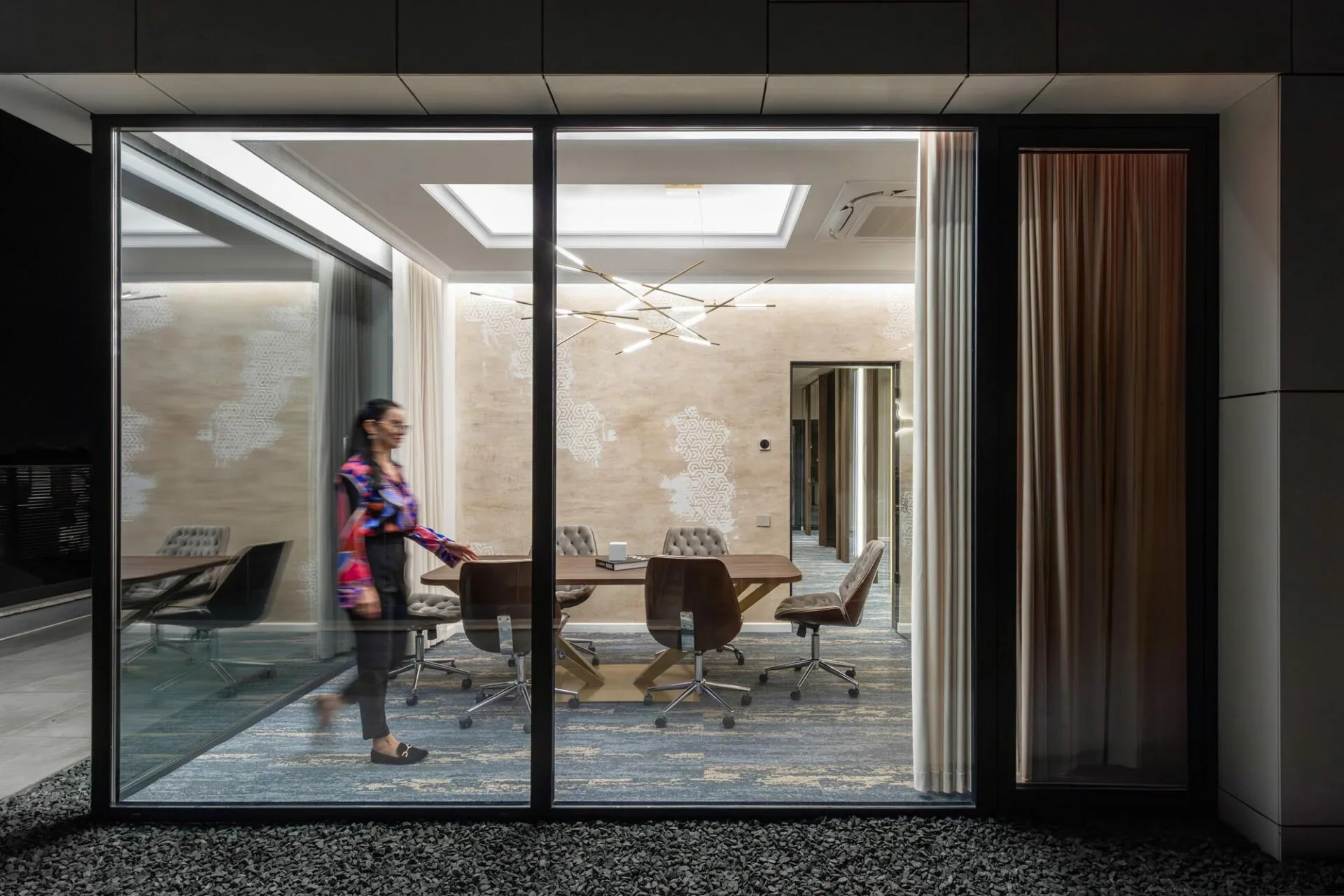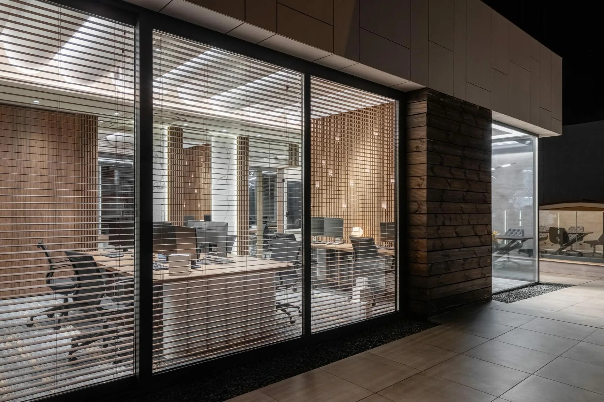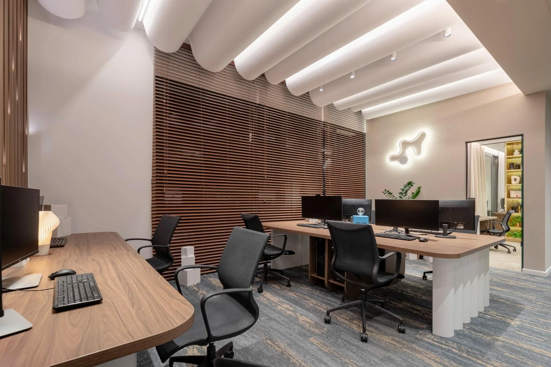 În zona principală de lucru, mesele lungi din lemn și scaunele ergonomice negre definesc un spațiu curat și organizat. Tavanul este accentuat de panouri acustice sculpturale, în formă de val, care oferă atât un impact vizual elegant, cât și o îmbunătățire a confortului fonic. Jaluzelele orizontale din lemn, amplasate pe întreaga suprafață a peretelui vitrat, adaugă intimitate fără a bloca lumina, creând un joc subtil de umbre și transparențe. Organizarea minimalistă a birourilor și spațiile de depozitare mascate contribuie la o atmosferă calmă și neaglomerată, ideală pentru concentrare. Sala de ședințe continuă tema eleganței moderne, având în centru o masă din lemn de nuc cu un picior geometric spectaculos. Draperiile fluide și scaunele tapițate aduc o notă de finețe tactilă, în contrast plăcut cu corpul de iluminat sculptural suspendat. Peretele accent, cu o textură subtilă și detalii grafice discrete, introduce personalitate fără a domina vizual spațiul. Rezultatul este o încăpere intimă și sofisticată, potrivită pentru discuții, întâlniri și prezentări. Privit din exterior, spațiul dezvăluie o compoziție armonioasă, iluminată cald, care pune în valoare materialele naturale și liniile arhitecturale curate.