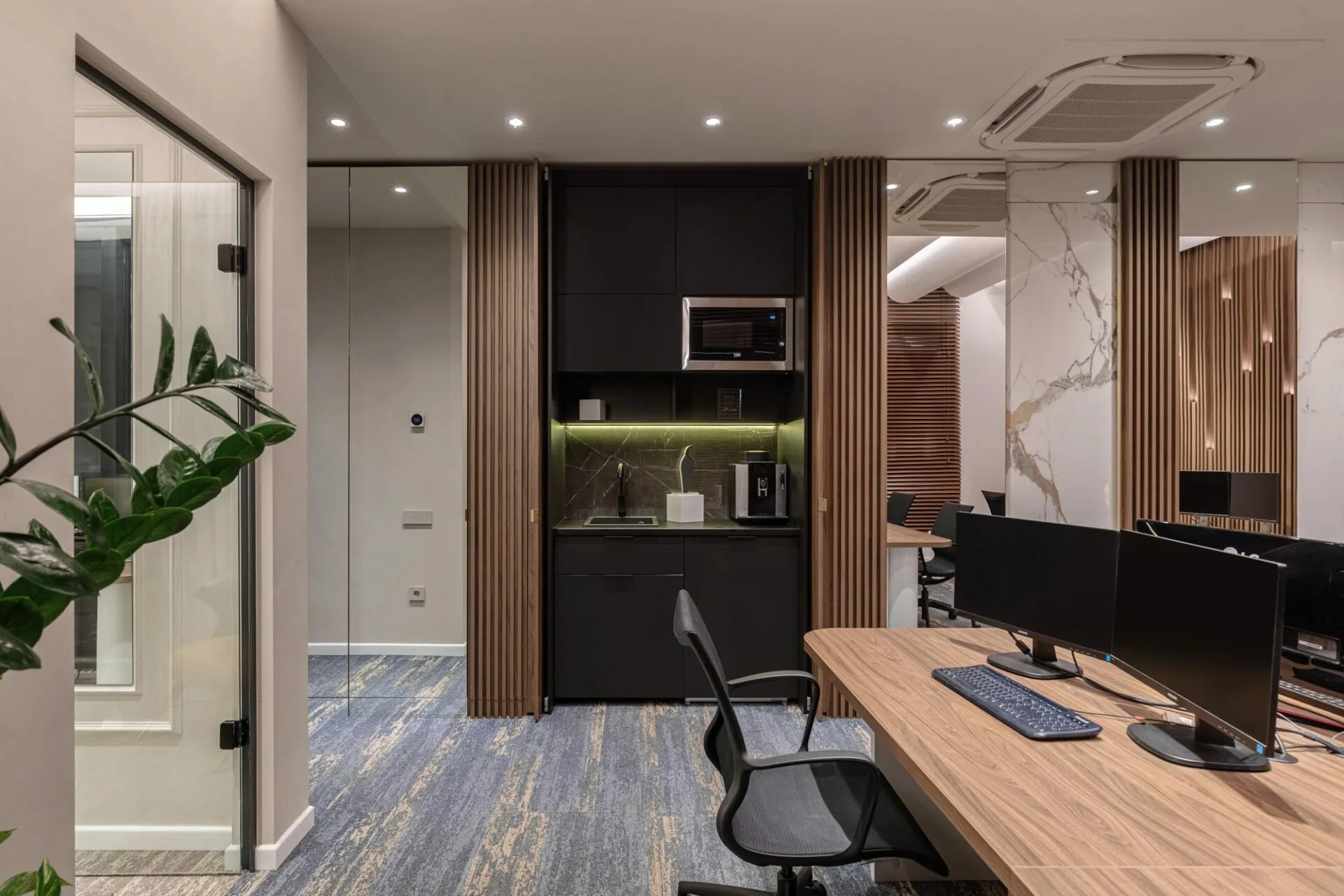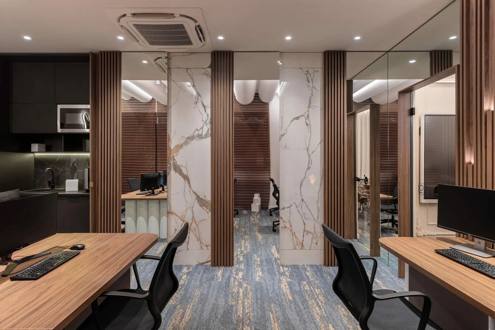 Combinația dintre lemn, finisaje inspirate din piatră și elemente de iluminat contemporane transmite profesionalism și rafinament. În ansamblu, acest proiect de design interior reușește să îmbine estetica modernă cu funcționalitatea atent gândită, creând un spațiu de lucru confortabil, inspirant și stilat.